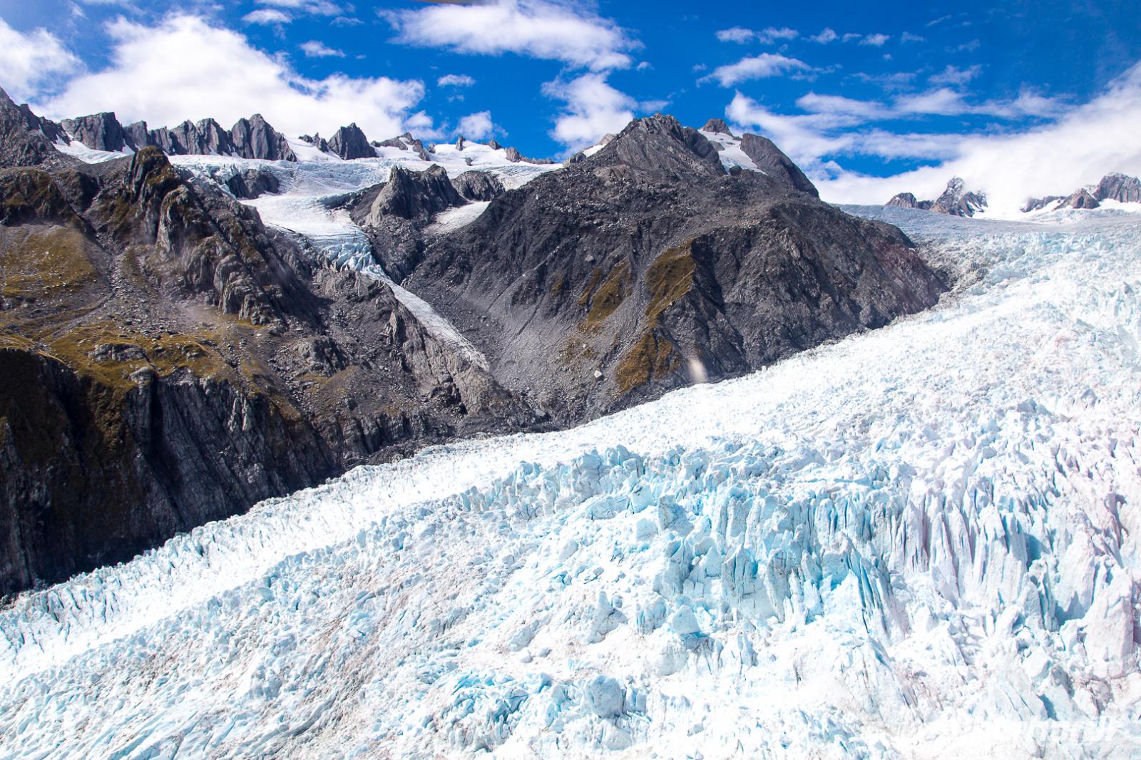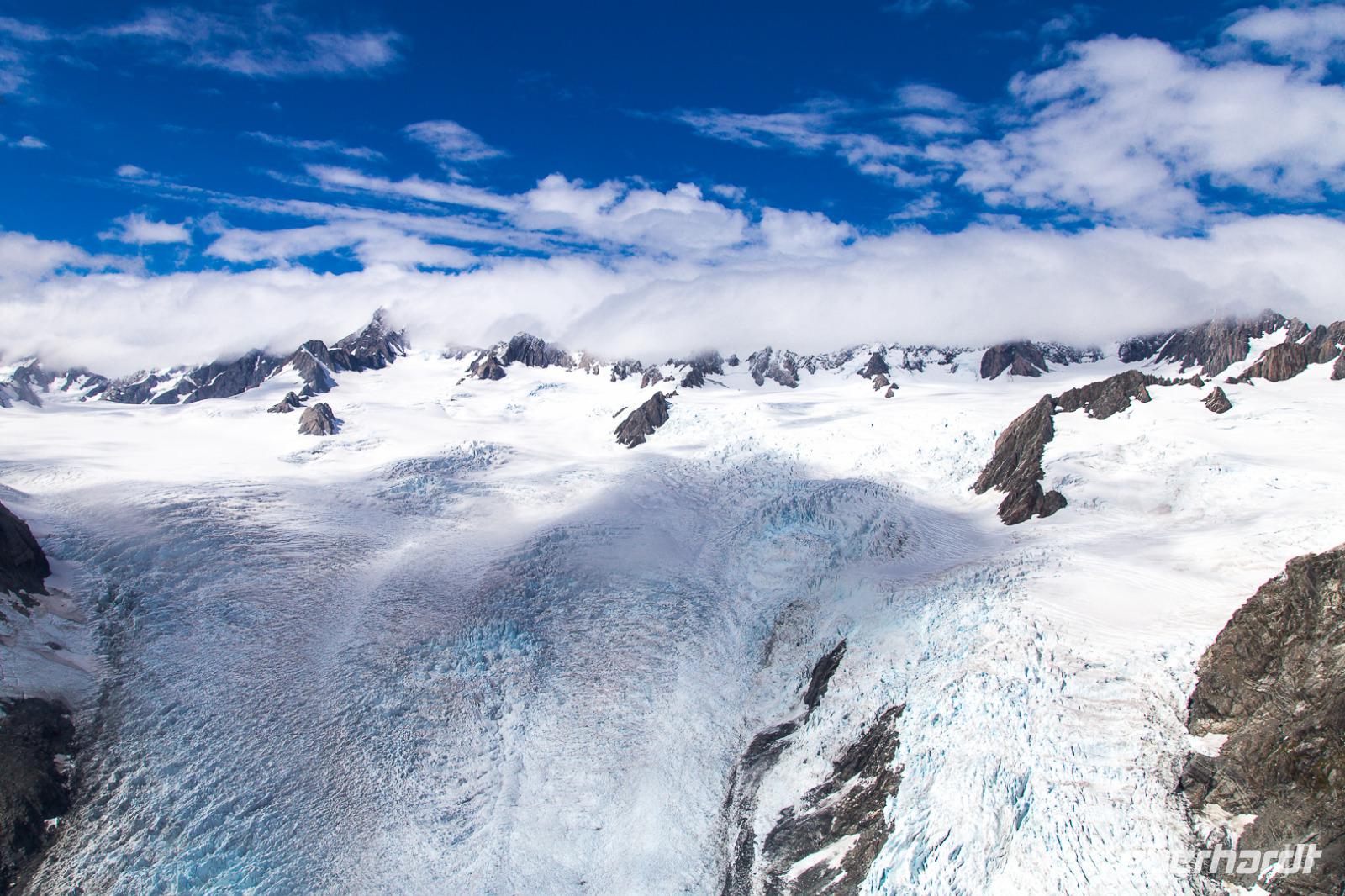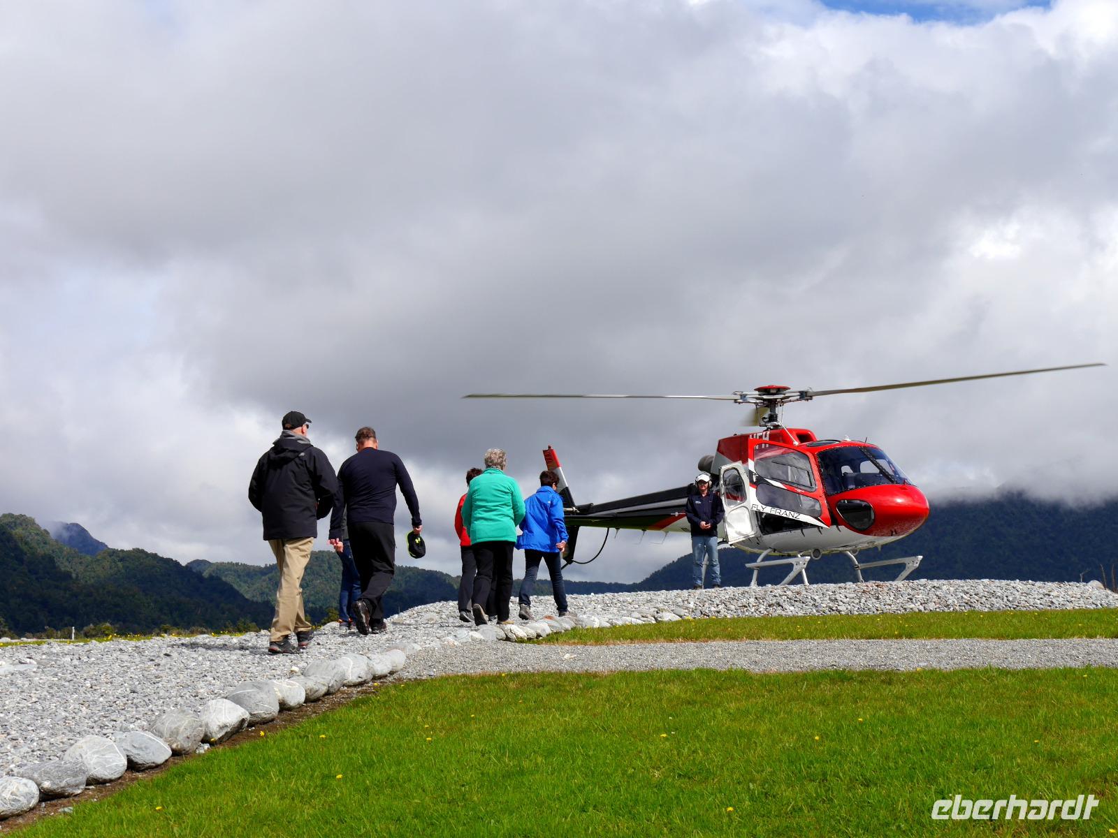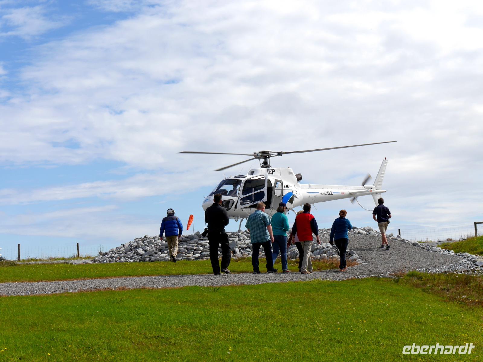 Manchmal scheint sogar die Sonne an der Westküste... und heute ist einer dieser seltenen Tage, wo man in die Region der Gletscher in schönes Wetter reist. Nach einer verregneten Nacht machen wir uns zunächst auf den Weg nach Hokitika. Die Westküste ist bekannt für die neuseeländische Jade, Pounamu. In Hokitika haben wir Gelegenheit, den Künstlern über die Schulter zu schauen und die grünen Schmuckstücke zu erwerben. Schon von hier können wir in der Ferne die Berggipfel erkennen. Von den vielen Gletschern Neuseelands haben sich die beiden Eiszungen von Franz Josef und Fox hier ihren Weg bis fast an die Küste gebahnt. So sehen wir neben dem Gletschereis nicht nur graues Gestein, sondern auch Regenwald! Wo sonst in der Welt gibt es das schon?! Leider ziehen sich auch in Neuseeland die Gletscher rasant zurück, so dass sich die gesamte Pracht der Bergwelt mit Schnee und Eis am besten aus der Luft bewundern lässt. Wir sind uns einig und buchen gemeinsam einen Helikopterflug über die Südalpen. Was für ein Glück, dass wir genau das Zeitfenster erwischen, in dem beste Bedingungen für den Flug herrschen! Vom Örtchen Franz Josef geht es durch die Wolkendecke hindurch, unter uns steile Berghänge mit grünem Regenwald und graue Felsen über die sich eine weiße Schneedecke legt. Ein Highlight ist schließlich die Landung auf dem Gletscher... Schneeballschlacht gefällig?! Oder vielleicht ein Tänzchen auf dem Eis!? Was für ein beeindruckendes Erlebnis über den Wolken! Vor dem Einchecken in unserem Motel in Fox unternehmen wir noch einen Spaziergang durch urwüchsigen Regenwald und am Abend überrascht uns Bernd mit einem leckeren BBQ. Guten Appetit!