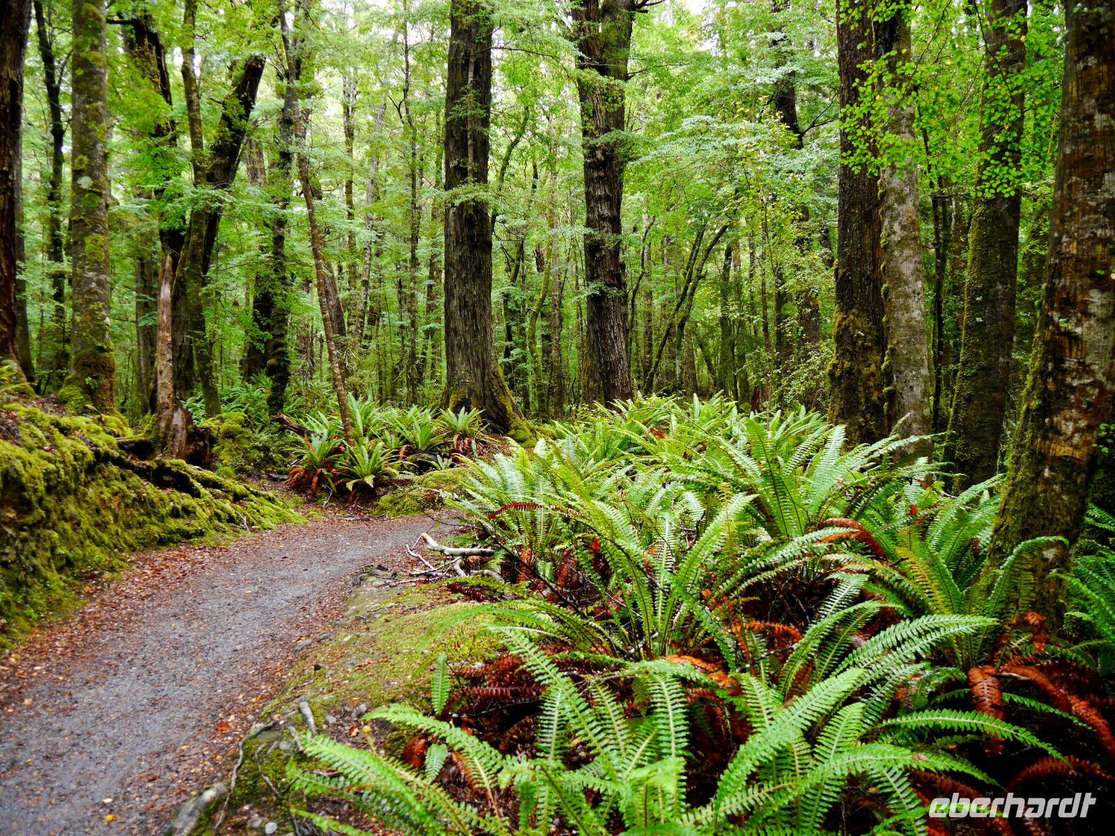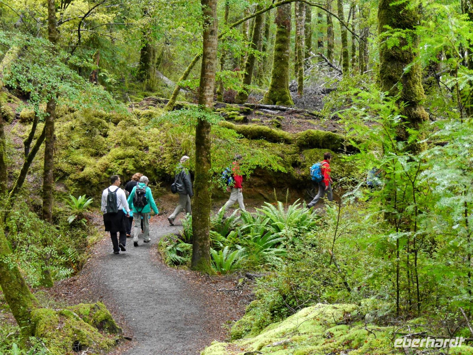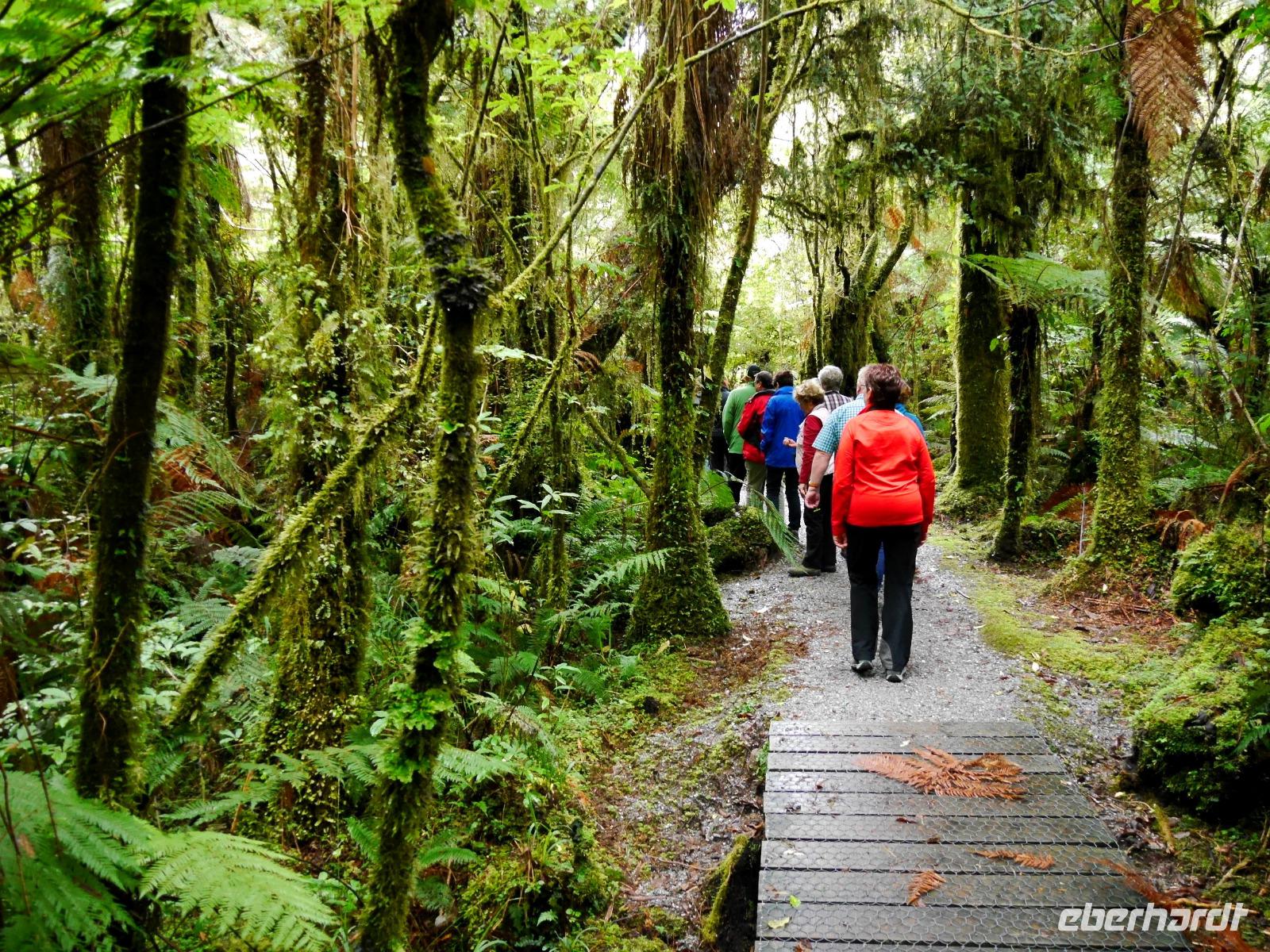 Abschied von Queenstown und Weiterreise nach Te Anau, dem Tor zum Fiordland Nationalpark, dem größten des Landes. Als erstes statten wir den seltenen Takahes einen Besuch im Vogelpark ab. Die Vögel galten bereits als ausgestorben und man zählt heute einen Bestand von etwa 240 Tieren. Entgegen der Wettervorhersage hört pünktlich zu Beginn der Wanderung der Regen auf und wir können die Ruhe des Waldes genießen. Von den Control Gates laufen wir auf einem Teilstück des berühmten Kepler Track am Ufer des Lake Te Anau durch Südbuchenwald und staunen über die unendlichen Schattierungen von Grün. Der Wald wirkt fast märchenhaft mit all den Moosen, Farnen und Flechten. Am Wendepunkt wartet sogar eine kleine, aber sehr feine Überraschung auf uns ! Eine weitere Attraktion von Te Anau sind die Glowworm Caves, die wir am Abend besuchen. Mit dem Boot geht es zum Westufer des Sees, wo wir erst zu Fuß und dann per Boot in das Höhlensystem eintauchen. In völliger Dunkelheit leuchten tausende Lichter wie Sterne über uns. Die Glühwürmchen locken auf diese Art und Weise ihre Beute an und wir können dieses erstaunliche Schauspiel bewundern.