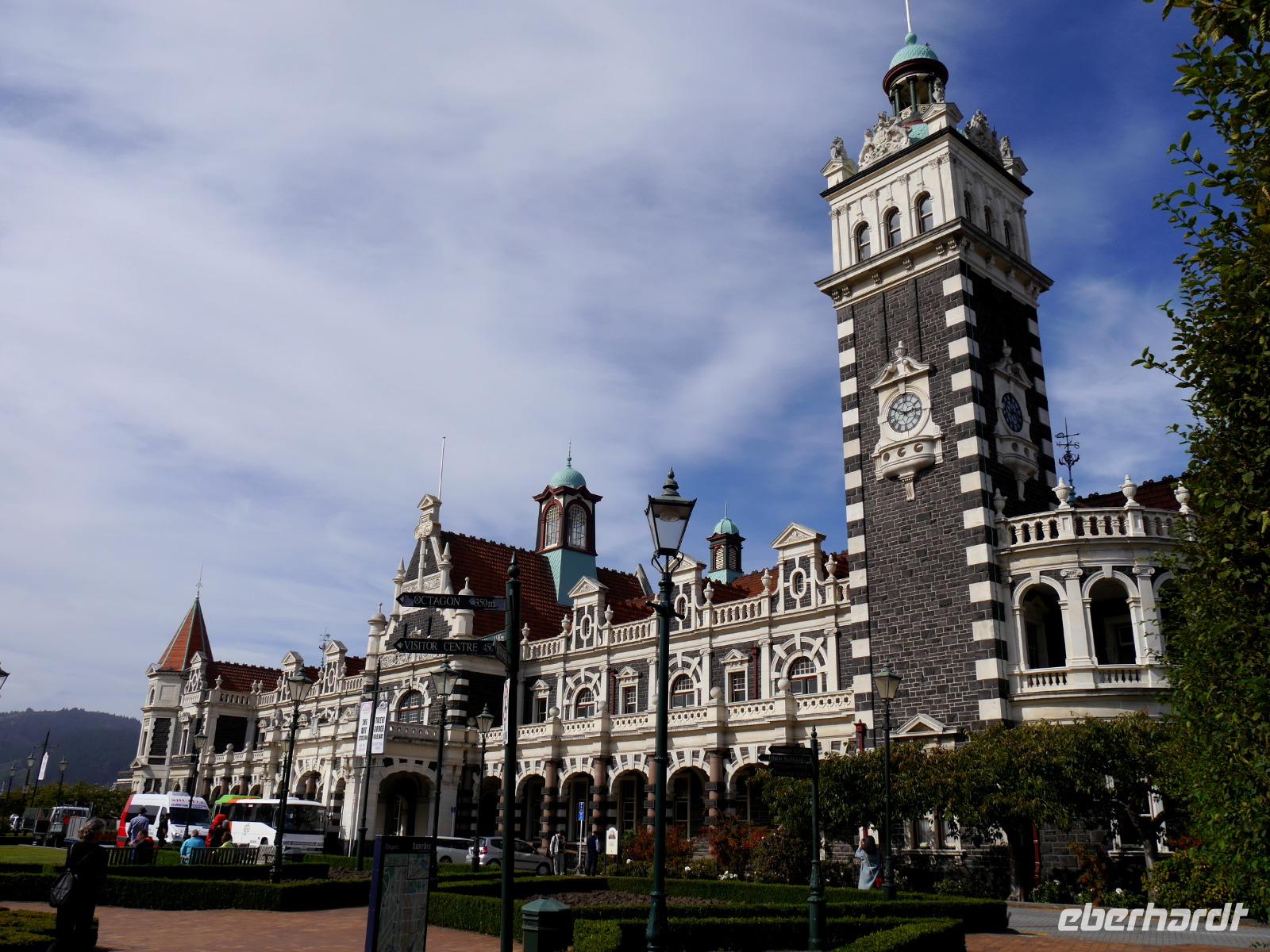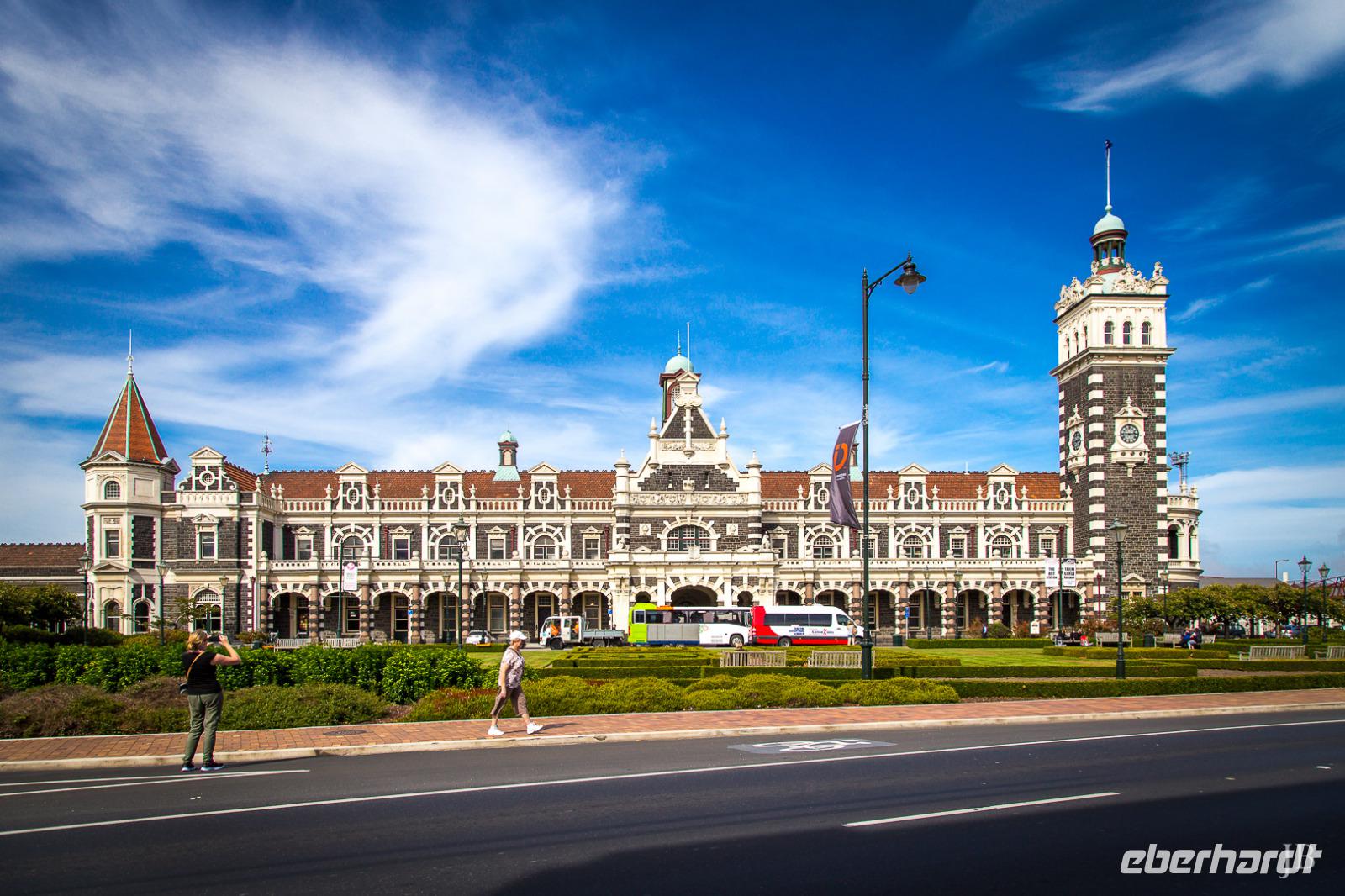Wir verabschieden uns für einen Tag von den Bergen der Südalpen und fahren durch weite Ebenen mit vielen glücklichen Kühen und Schafen bis an die Ostküste der Südinsel. Am Mittag erreichen wir die „Schottenstadt" Dunedin. Das schottische Erbe spiegelt sich in der Architektur wider, woher auch der Bezug zu Edinburgh rührt. Ein besonderes Schmuckstück ist der Bahnhof - von außen mit dem hell-dunklen Gestein und von innen mit den thematischen Mosaiken. Vor den Toren der Studentenstadt erstreckt sich die Otago Halbinsel. Am Ende liegt Taiaroa Head, wo sich die einzige Festland-Kolonie der Königs-Albtrosse befindet. Mit dem Boot unternehmen wir eine einstündige Fahrt um diese Landzunge. Wir haben nicht nur Glück mit wenig Seegang sondern können sogar die majestätischen Vogel fliegen sehen. Mit einer Flügelspanne von bis zu drei Metern können diese Vögel an die 100 km/h schnell fliegen. Darüber hinaus gesellt sich ein Weißkappenalbatross zu unserem Boot und wir können Neuseeländische Pelzrobben und Kormorane beobachten.