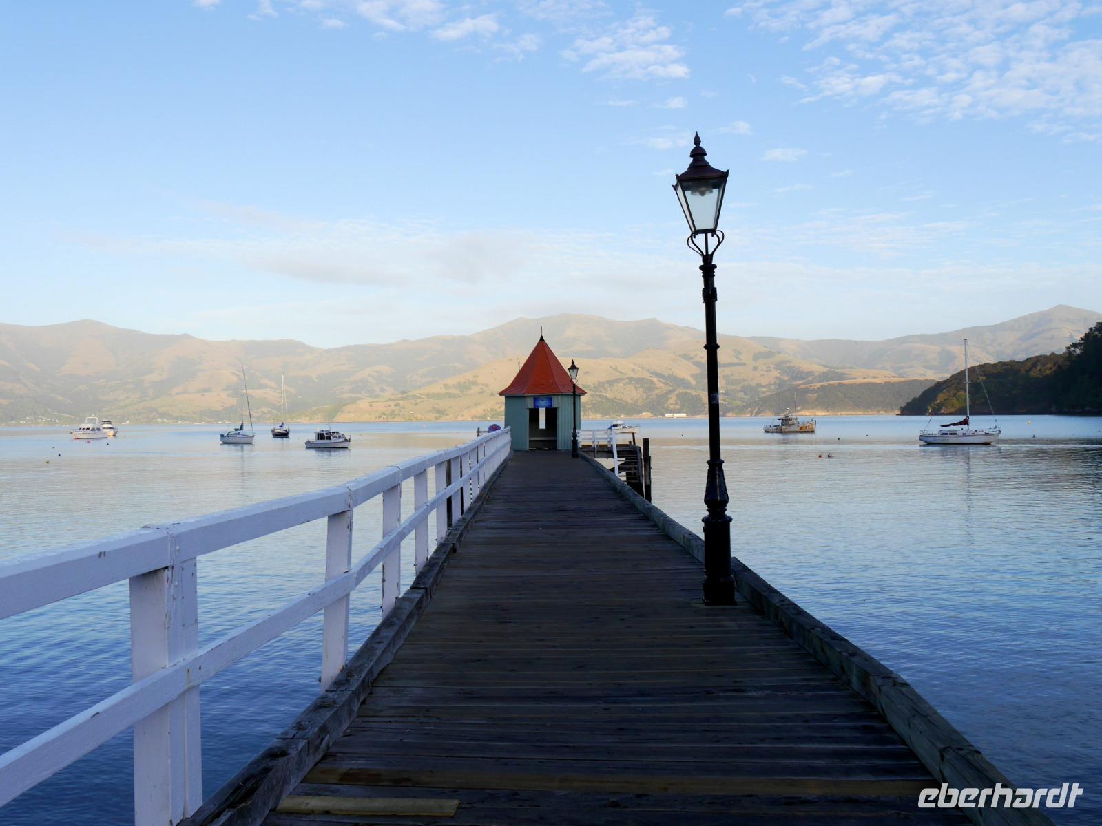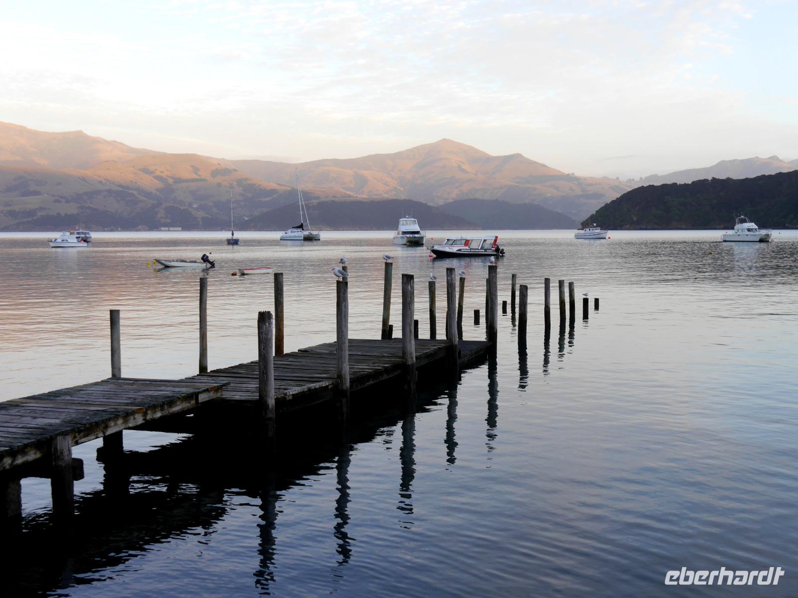 Im Mount Cook Visitor Centre verschaffen wir uns einen Eindruck von den Dimensionen und Besonderheiten des gleichnamigen Nationalparks. Viele haben versucht den höchsten Berg Neuseelands zu bezwingen und nicht wenige haben dabei ihr Leben gelassen. Mit dem Bus fahren wir zurück am Ufer des Lake Pukaki. Der See wird gespeist durch den Tasman-Gletscher und schillert heute Morgen wunderschön milchig-hellblau. Am Lake Tekapo legen wir eine Pause an der Church of the Good Sheperd ein und die letzte Etappe unserer Reise führt uns durch die fruchtbare Ebene der Canterbury Plains und durch die Kleinstadt Geraldine schließlich auf die vulkanische Banks Peninsula. Die kurvenreiche Straße windet sich durch eine hügelige Landschaft und gibt immer wieder den Blick frei auf malerische Buchten. Die charmante, französisch geprägte Siedlung Akaroa verströmt mit den schmucken Holzhäuschen und Gärtchen ein vornehmes Flair. Vom Leuchtturm haben wir einen herrlichen Blick auf den Hafen.