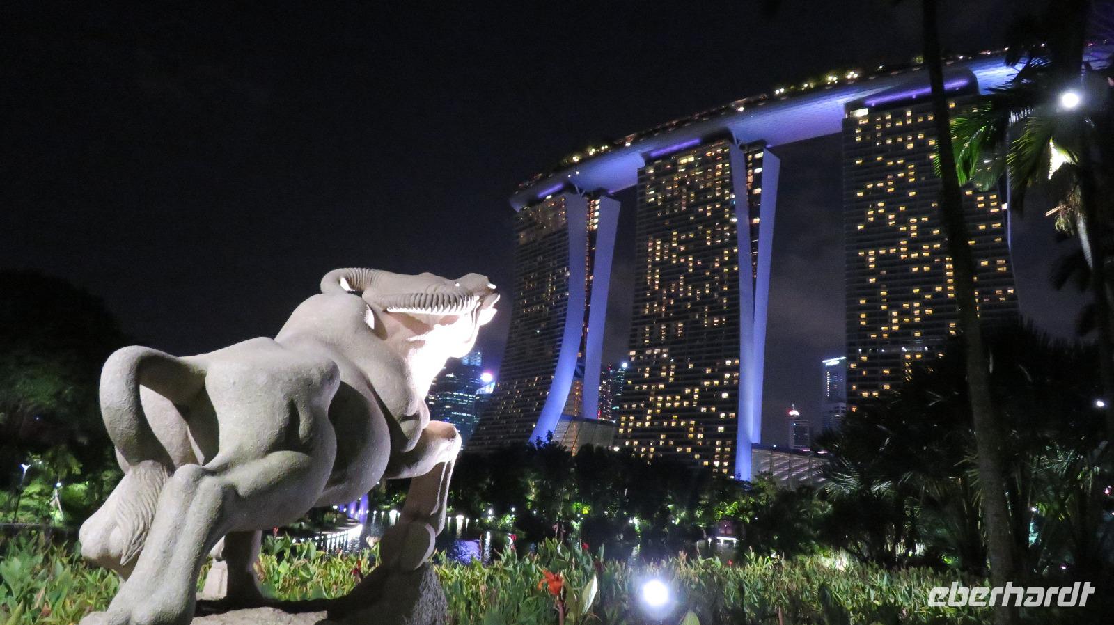 Juhuuu, auf ins Land der Hobbits! Es sollte nicht irgendeine Reise werden sondern DIE Reise ans andere Ende der Welt. Nichts Geringeres als Neuseeland steht auf dem Programm. Da das praktisch aber mit einem Flug noch nicht möglich ist, steht auf unseren Bordkarten zunächst Singapur. Daher Koffer auf's Band und mit dem Flieger ab nach Frankfurt, wo wir auch den letzten Reisenden unserer Gruppe treffen. Unsere Gruppe ist mit nur 6 Reisegästen sehr überschaubar. Der Flug nach Singapur verläuft reibungslos und so landen wir am Abend in Asien. David, unser örtlicher Reiseleiter holt uns vom Flughafen ab und heißt uns herzlich willkommen. Wir freuen uns sehr, fragen uns aber, wer die Heizung hier so hoch gedreht hat. Nach den eher kühlen Temperaturen in Deutschland und auf dem Flug, fühlt es sich hier an wie in der Sauna. Nachdem wir im Hotel unsere Zimmer bezogen haben, gehen wir auf eigene Faust die „Löwenstadt" erkunden. Wir laufen am Fluss in Richtung Marina Bay Sands und holen uns an einem Stand etwas zu essen. Die Bestellung ist eine kleine Wundertüte: da man nicht direkt erkennt, was man bestellt, gibt es recht sonderbare Kombinationen. Der absolute Renner ist das nach Kaffee/Cappuccino schmeckende Schweinefleisch. Im Anschluss geht es durch den Garten am Marina Bay Sands mit den künstlichen, beleuchteten Bäumen, die eine besondere Atmosphäre zaubern. Den Abend lassen wir bei einem Getränk auf der Terrasse des teuersten Gebäudes der Welt ausklingen und erfreuen uns an dem spektakulären Ausblick auf die Skyline von Singapur.