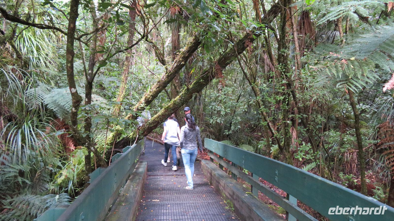 Das Wetter sah an unserer Lodge noch recht mau aus und nun, nachdem wir uns für arktische Verhältnisse gewappnet hatten, finden wir uns in herrlichem Sonnenschein wieder. Uns soll es nur recht sein und so laufen wir der Sonne entgegen. Die Landschaft sieht komplett anders aus, als wie wir sie bisher kennengelernt haben. Hier stehen keine großen Bäume, Farne und Palmen sondern es dominiert eher kleineres Buschwerk. Unser Ziel, der blau schillernde Tama Lake, leuchtet wie in einem Prospekt. Wir haben Glück... oder andere würden sagen: „Wenn Engel reisen!", denn wir können den See perfekt in seinen schillernden Farben fotografieren. Wenige Minuten später zieht sich der Himmel nämlich zu und der Nebel nimmt die Umgebung ein. Dies hält uns aber nicht davon ab, zum höher gelegenen See zu wandern. Ganz nach dem Prinzip, wenn wir schon mal hier sind, dann nehmen wir auch alles mit! Oben angekommen, zieht die Wolkendecke noch einmal auf und wir können noch ein paar tolle Bilder machen. Bevor uns der Wind aber endgültig weg fegt, verlassen wir das Plateau und wandern zu den Taranaki Falls. Von hier aus ist es nur noch ein Katzensprung zum heiß ersehnten Bier oder in meinem Fall, zur Schokolade. Am Abend gibt es für alle Angus Rind und anschließend gehen wir satt und zufrieden ins Bett.
