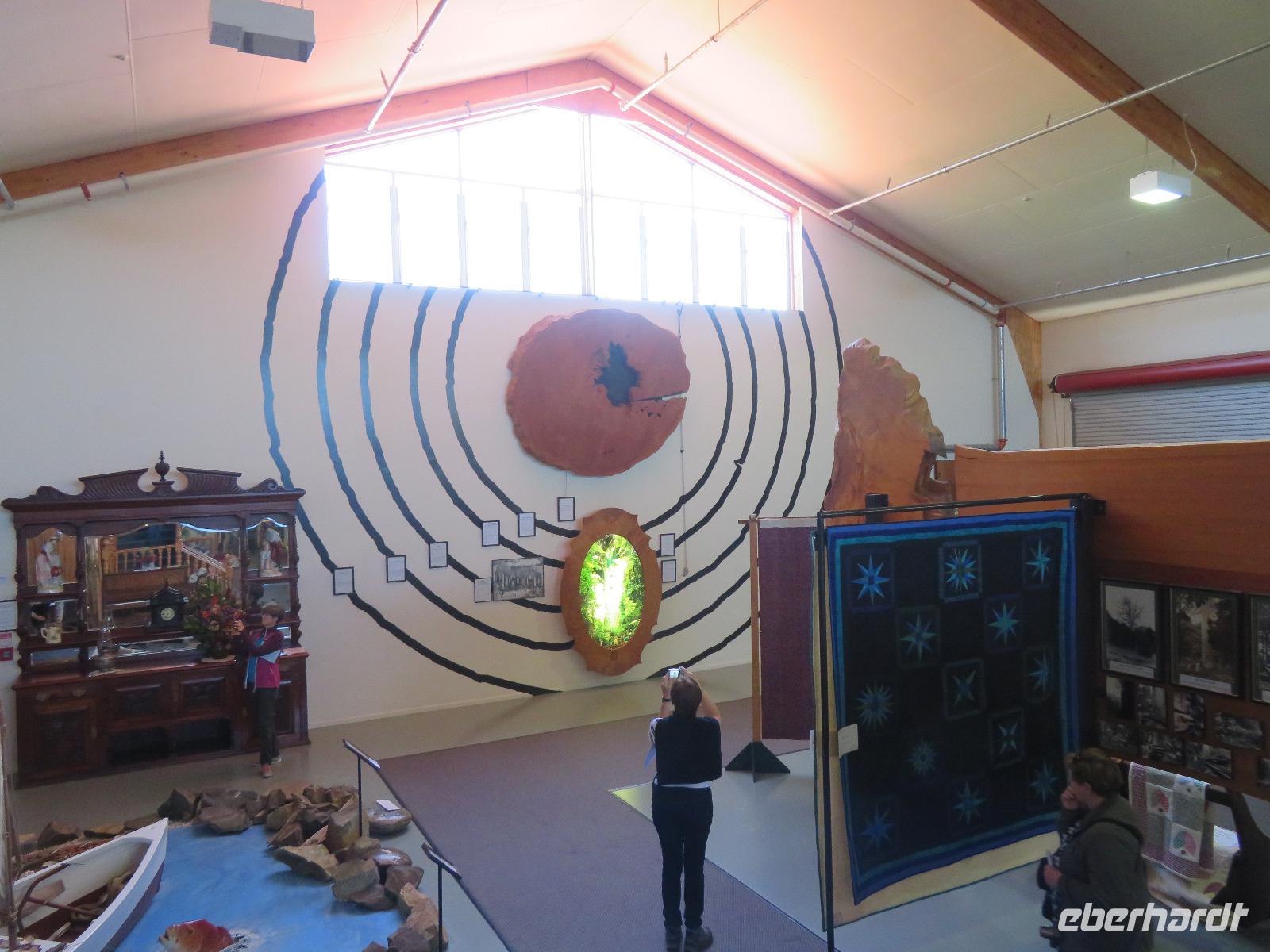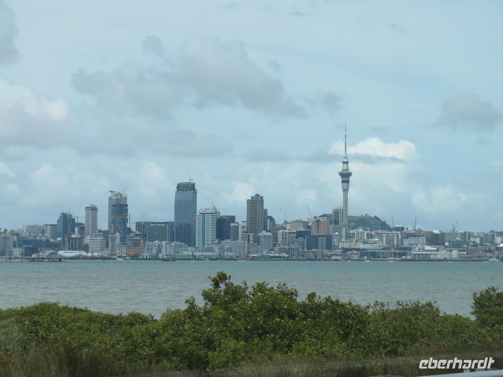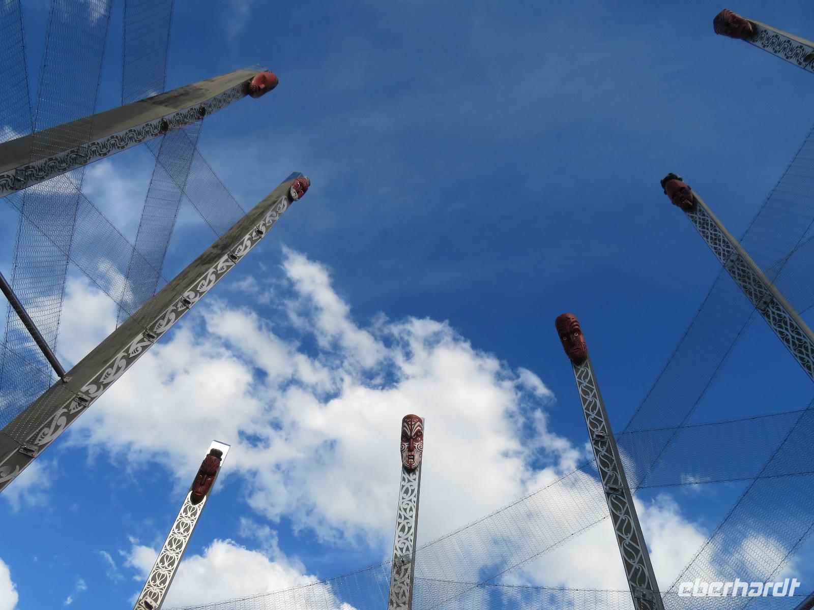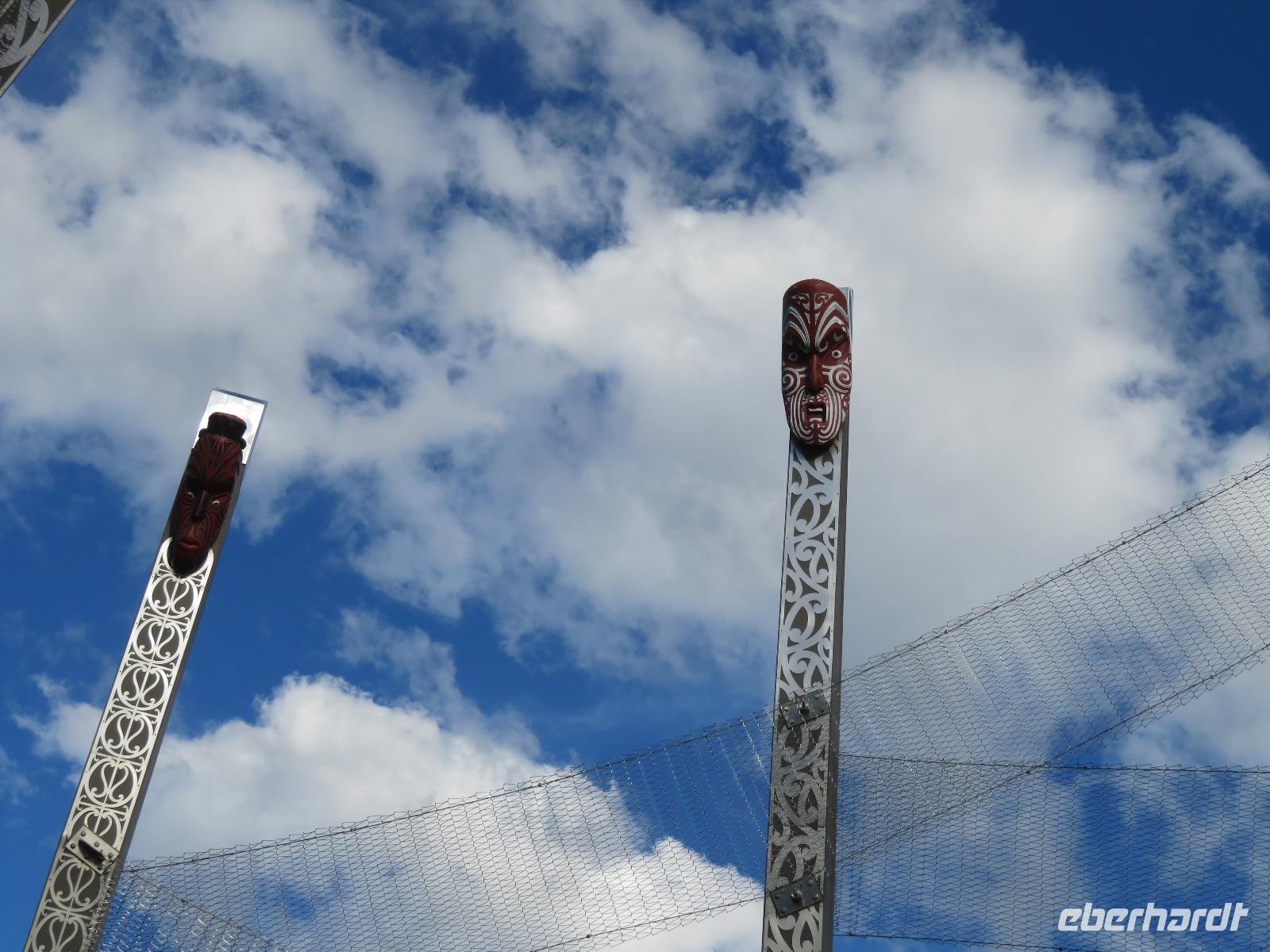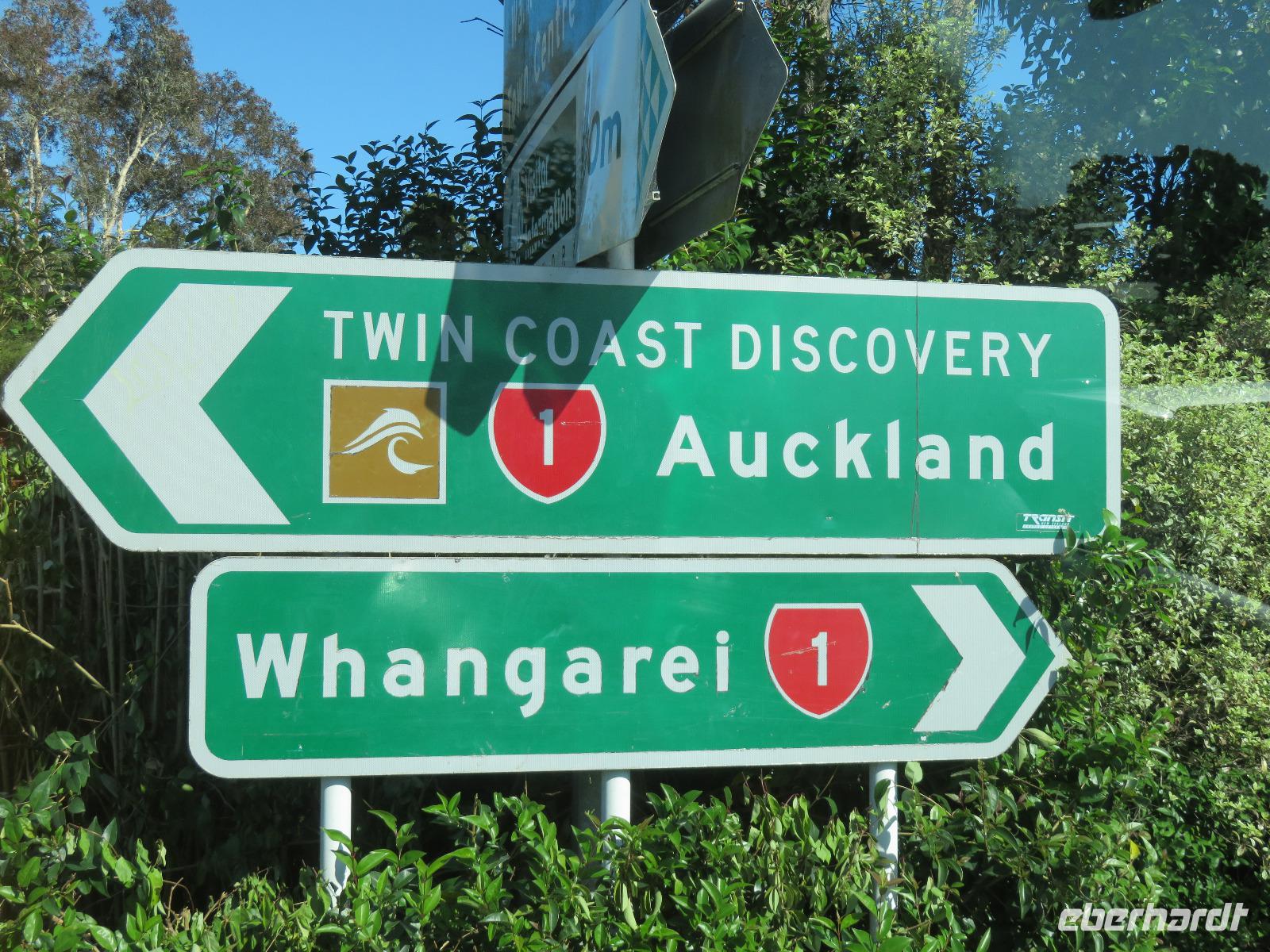 Es ist Sonntag und die Sonne scheint - perfekte Voraussetzung um unsere Reise in den Norden fortzusetzen. Wir statten aber dem Zentrum und dem West Heaven Harbour von Auckland einen Besuch ab, bevor wir in Richtung Norden über die Harbour Bridge die Stadt verlassen. Nicht nur die Skyline wird im Rückspielgel immer kleiner, auch die Ortschaften schrumpfen und es wird immer ländlicher. Über Wellsford und Dargaville gelangen wir schließlich nach Matakohe, unserem ersten längeren Stopp heute. Wir besuchen hier das Kauri Museum und lernen Dank Bernd und seinem phänomenalen Wissen über diese Giganten jede Menge interessante Dinge dazu. Zum Glück hat die Regierung vor einigen Jahren entschieden, dass keine Kauris mehr kommerziell gefällt werden dürfen. Die stehen mittlerweile unter Schutz und das ist auch mehr als notwendig. Wir wollen nun die Baumriesen auch einmal in natura sehen und fahren weiter in den Nationalpark hinein, laut Bernd, erkennt man einen Kauri schon von weitem. Die jungen Bäume sehen aus wie kleine Raketen, die sich ihren Weg aus dem Unterholz zum Licht erkämpfen um später die Schirmherrschaft zu haben. Und tatsächlich, sobald das Auge weiß, worauf es zu achten hat, sieht man sie schon von weitem. Besonders beeindruckend ist es dann, wenn man die einzelnen Stadien, vom Baby zum Teeny zum Erwachsenen Baum sieht - und wer wäre besser als Erwachsenes Beispiel gedacht, als der Herr des Waldes? Tane Mahuta - der größte noch lebende Kauri. Leider sind diese wundervollen Bäume von einer Krankheit bedroht, für die es bisher leider noch keine Heilung gibt. Das Department of Conservation (DOC) ist bemüht die Krankheit so isoliert wie möglich zu halten und so unterziehen wir unseren Schuhsolen nur zu gern die eine oder andere Extrawäsche, bevor wie die Baumriesen bewundern. Weiter geht die Reise die Westküste entlang bis wir auf Opononi stoßen. Bernd erklärt uns, dass das hier oben tatsächlich komplett Maori-Land ist, nur in Paihia und Whangarei auf der Ostseite der Provinz Northland haben es sich auch die Pakeha, die Weißen bequem gemacht. Paihia soll dann auch nach ein paar weiteren Serpentinen unser Tagesziel sein. Noch einen kurzen Stopp am Pier, für die morgigen Ausflüge, am Supermarkt und Geldautomaten und schließlich einchecken im Hotel. Am Abend treffen sich die hungrigen Bäuche wieder um gemeinsam nach Waitangi ins Resort zu fahren, wo ein vielseitiges und leckeres Buffet auf uns wartet.