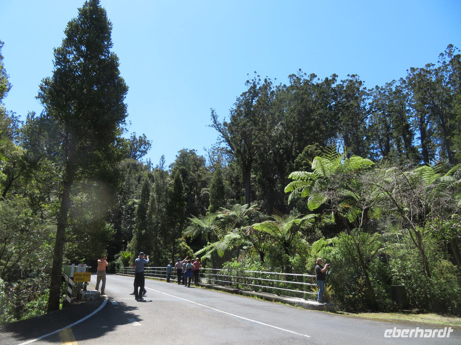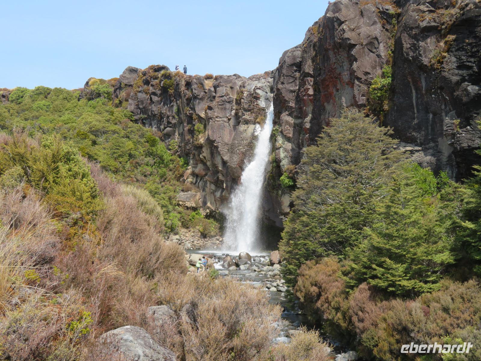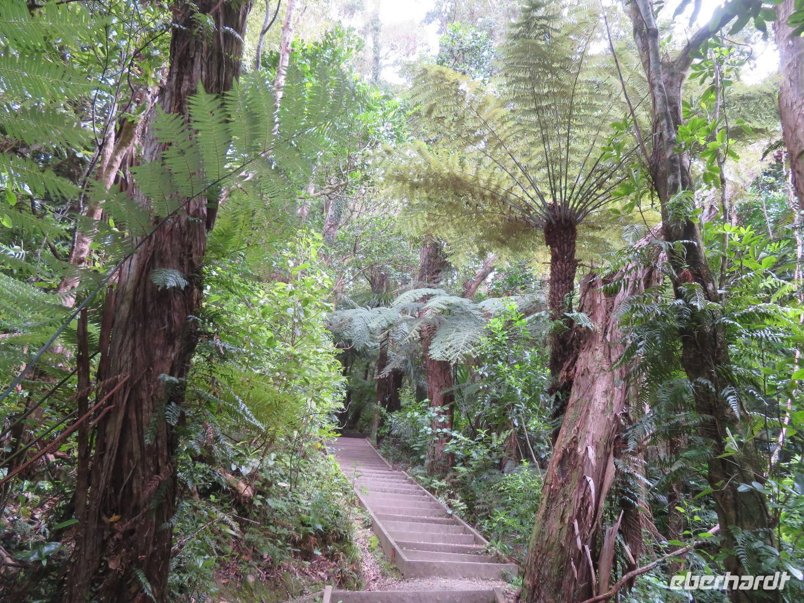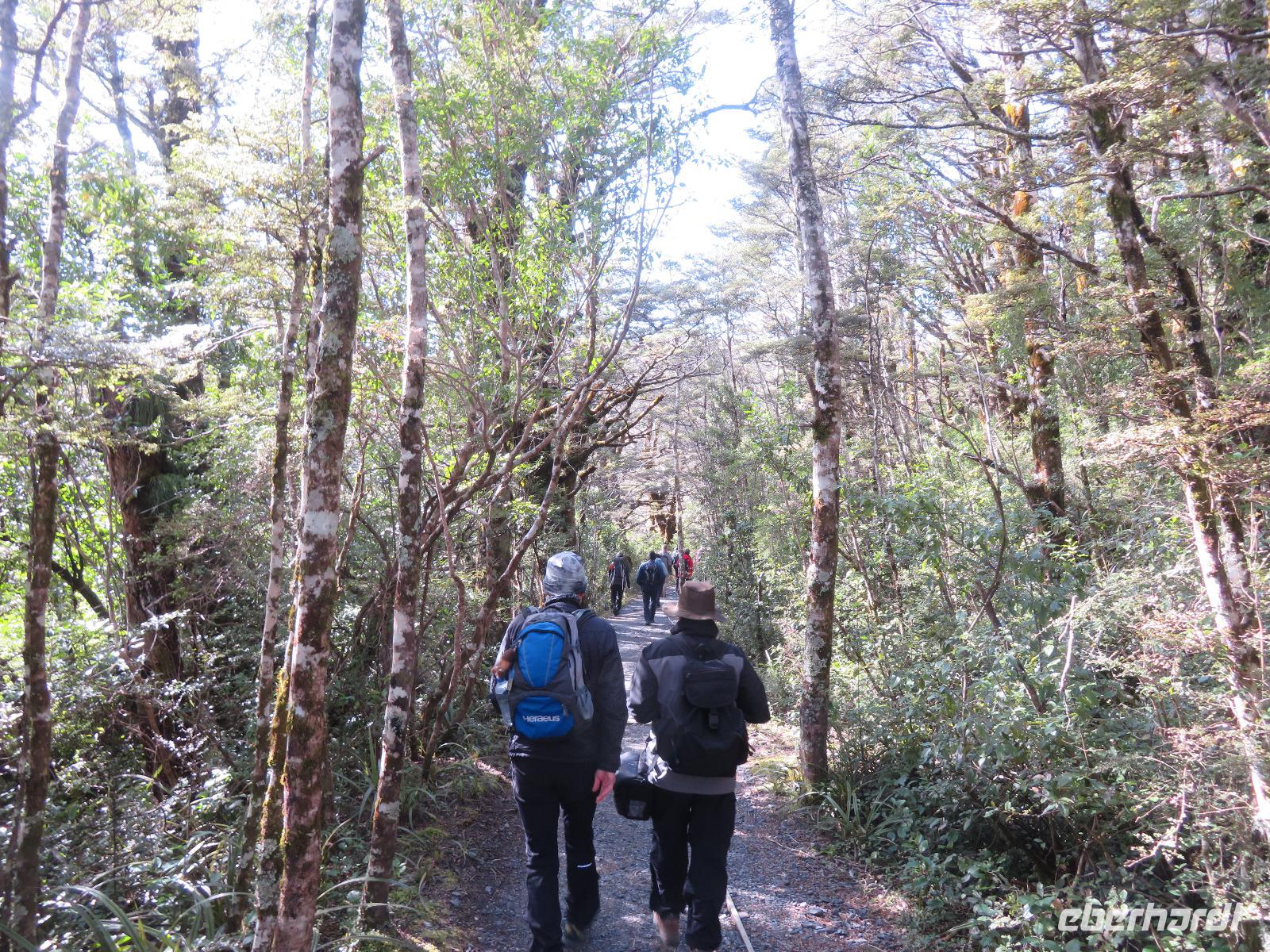 Als hätten wir etwas zu viel Jagdwurst gegessen sind wir schnell wieder an der Weggabelung angekommen, an der wir uns von der Gruppe getrennt haben. Über viele Stufen gelangen wir die die steile Felswand hinunter und blicken auf den hübschen Taranaki-Wasserfall. Der Weg führt uns schließlich durch den Wald mit einer etwas abwechslungsreicheren Vegetation - Nach insgesamt 15 Kilometern und fünfeinhalb Stunden Laufzeit erreichen unsere platten Füße das Hotel wieder. Den Weg zum Dinner und an die Bar finden wir zum Glück auch ohne jede weitere Anstrengung!