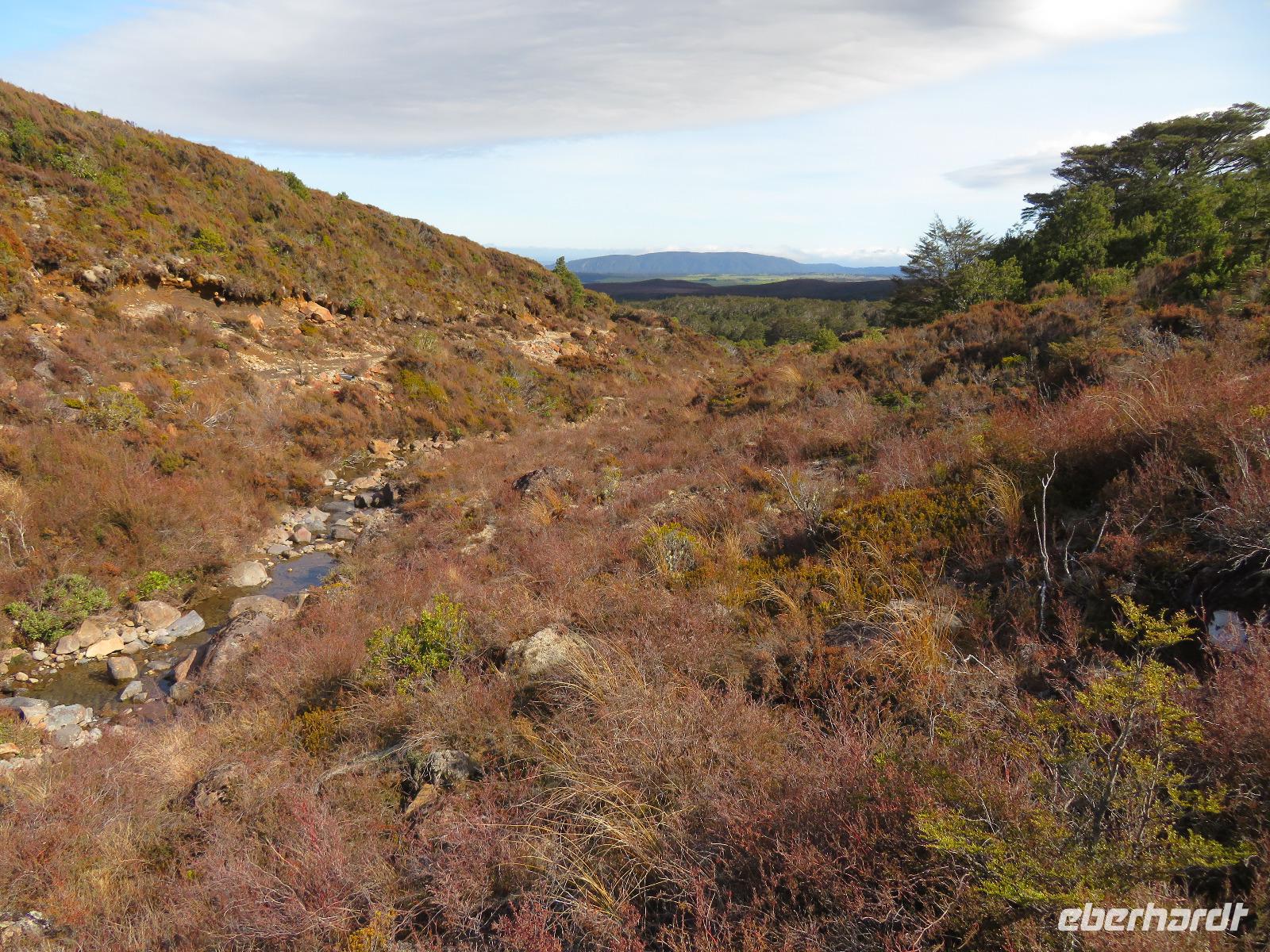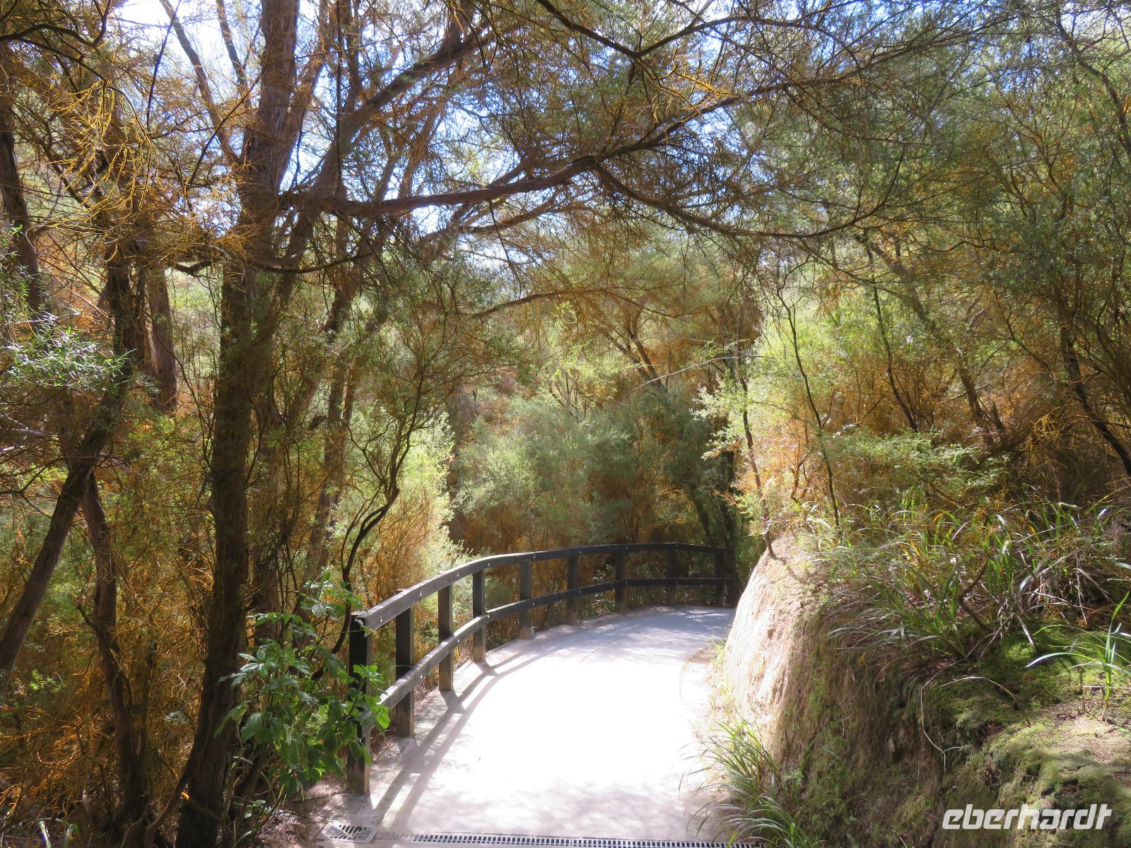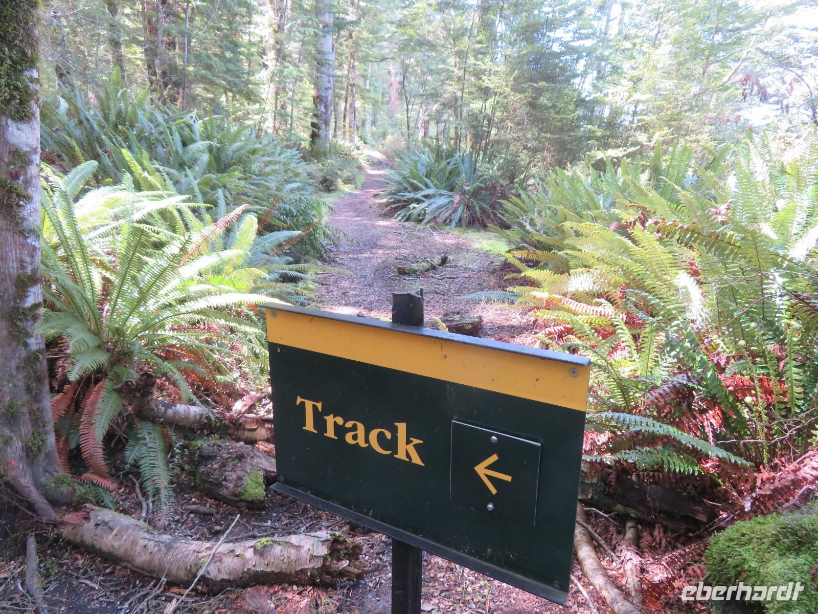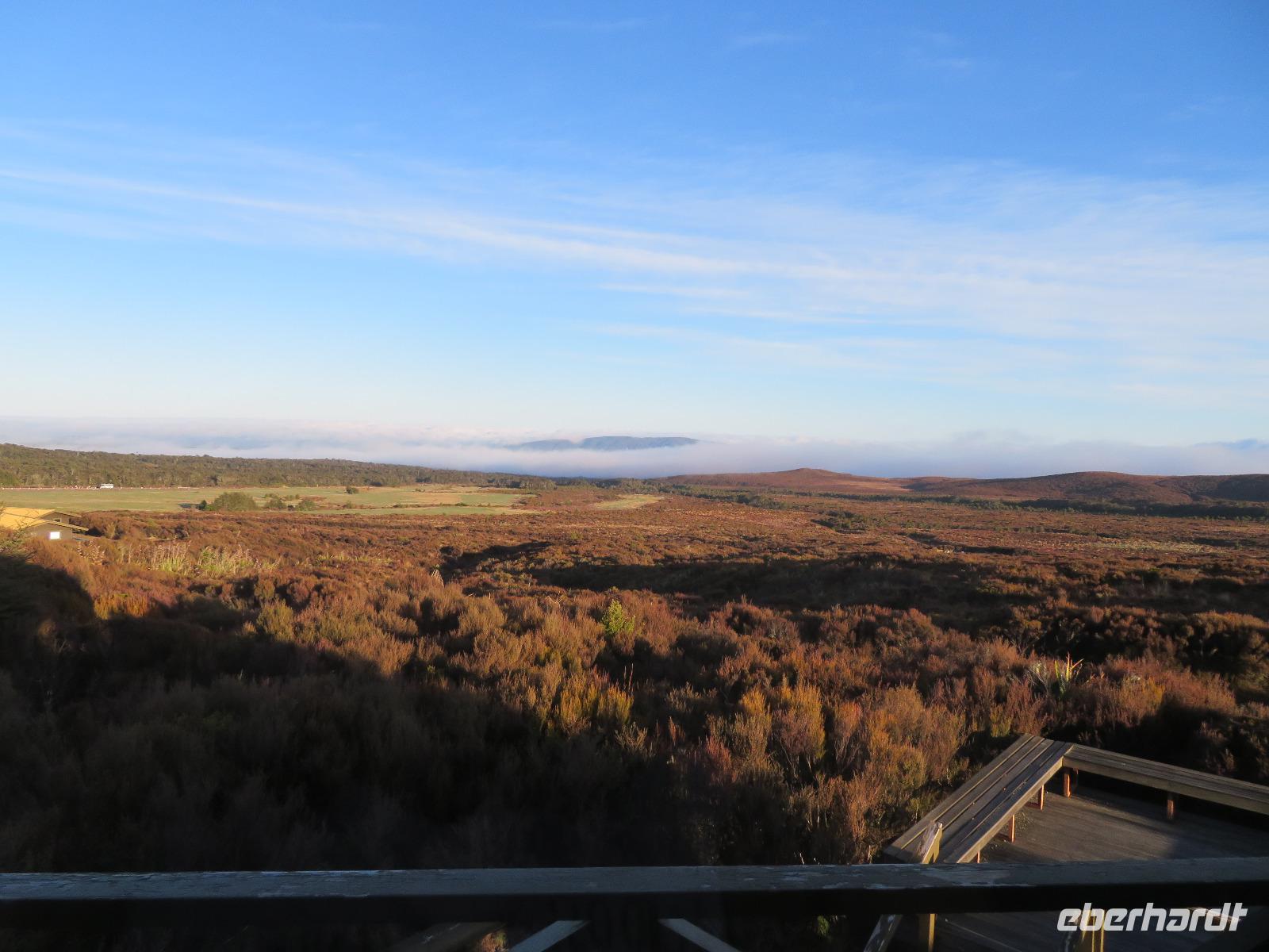 Als hätten wir etwas zu viel Jagdwurst gegessen sind wir schnell wieder an der Weggabelung angekommen, an der wir uns von der Gruppe getrennt haben. Über viele Stufen gelangen wir die die steile Felswand hinunter und blicken auf den hübschen Taranaki-Wasserfall. Der Weg führt uns schließlich durch den Wald mit einer etwas abwechslungsreicheren Vegetation - Nach insgesamt 15 Kilometern und fünfeinhalb Stunden Laufzeit erreichen unsere platten Füße das Hotel wieder. Den Weg zum Dinner und an die Bar finden wir zum Glück auch ohne jede weitere Anstrengung!