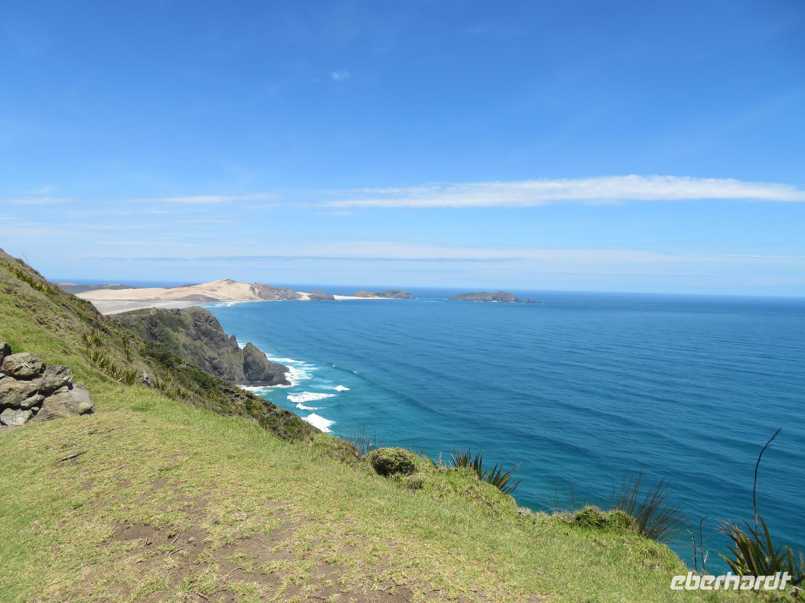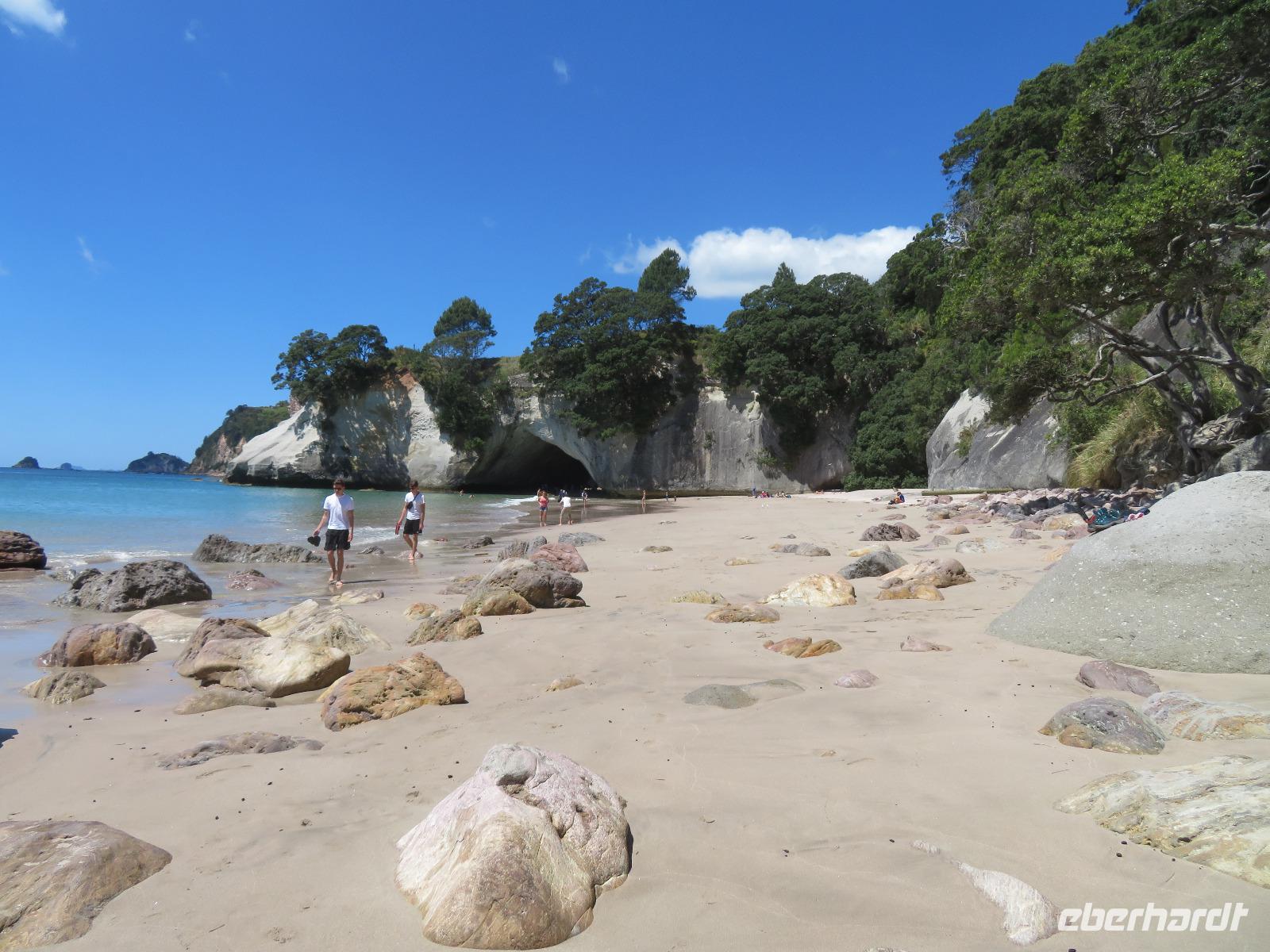 Von Hahei ist es nicht mehr weit bis zum Startpunkt für unseren Spaziergang. Der Weg führt uns durch den Busch, bestehend aus Babykauris, riesigen Baum- und Silberfarnen und Manukabüschen. Alles ist noch saftig grün, dazu der strahlend blaue Himmel und immer wieder ergibt sich ein Blick zum Meer hinaus. Nach etwa einer Stunde erreichen wir die kleine Bucht der Cathedral Cove. Die Küste selbst besteht aus sehr hellem und weichem Kalksandstein. Die Cathedral Cove ist eine Höhle die eine kathedralenähnliche, spitz zulaufende Decke aufweist. Wir lassen uns hier genügend Zeit um die Landschaft auch wirklich zu genießen und auch dann bei etwas Ebbe auf die andere Seite, also durch die Höhle durchzugehen. Zurück geht es dann auf selben Weg und bis Hahei. Zeit für eine kleine Mittagspause, sodass wir gestärkt an die harte Arbeit am Hot Water Beach gehen können. Es ist dort kaum übersehbar, wo sich der ganze Spaß abspielt. Immer den anderen hinterher und da wo es dichter wird, da sind wir richtig. Auf die Plätze, fertig, LOS! Buddelns was das Zeug hält und dann wird's plötzlich heiß - Autsch! Wir helfen uns Gegenseitig, suchen sogar am Strand noch nach weiteren heißen Stellen mit praktischer Abkühlung durch die Wellen - nun fehlt eigentlich nur noch eine nette Bar, ach das Leben könnte so schön sein ??