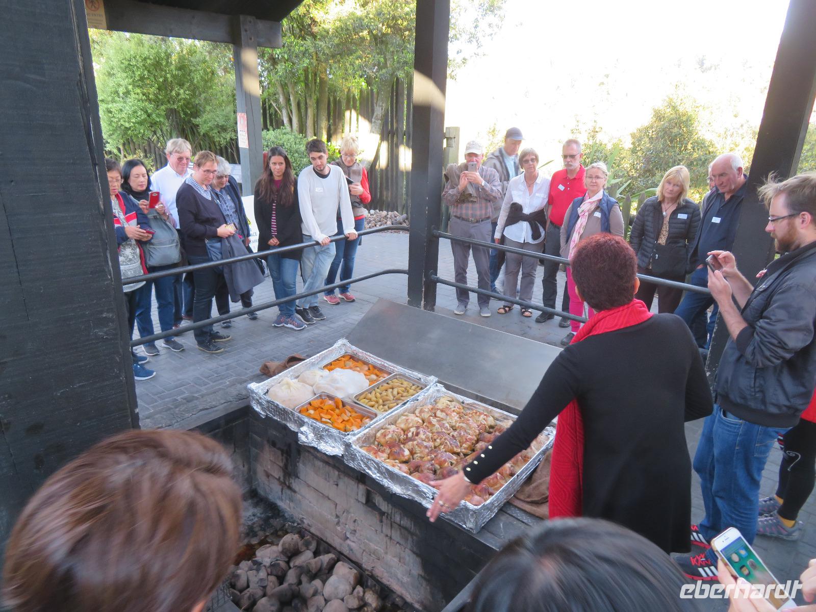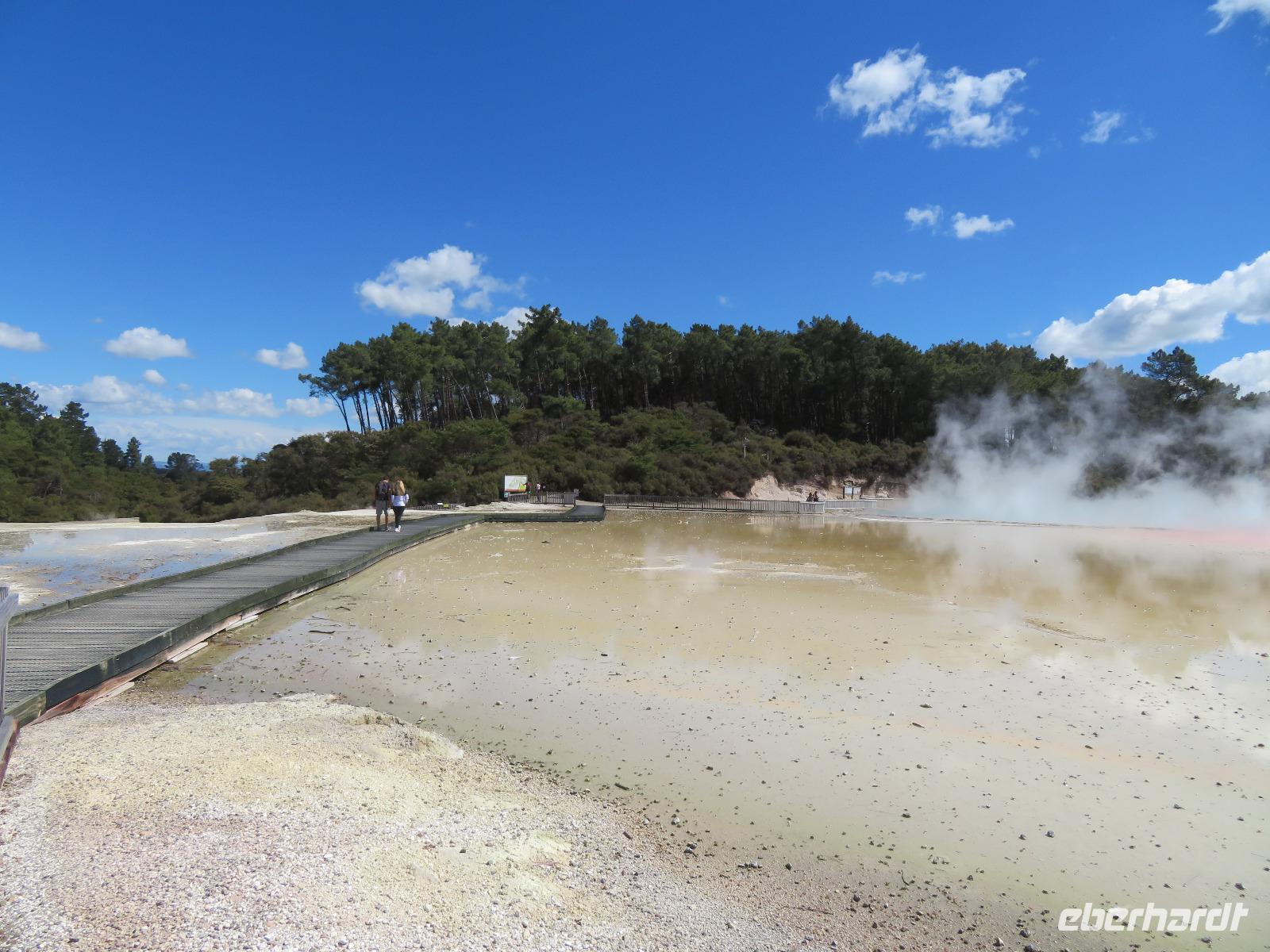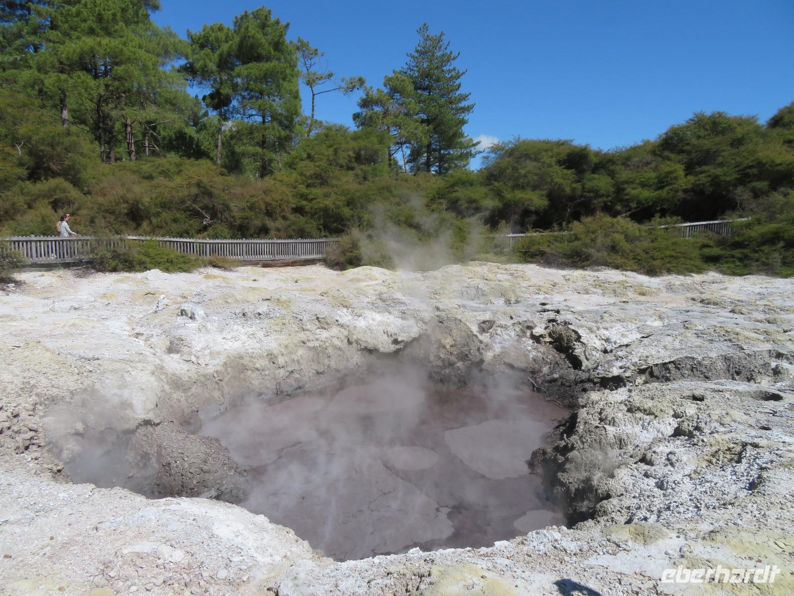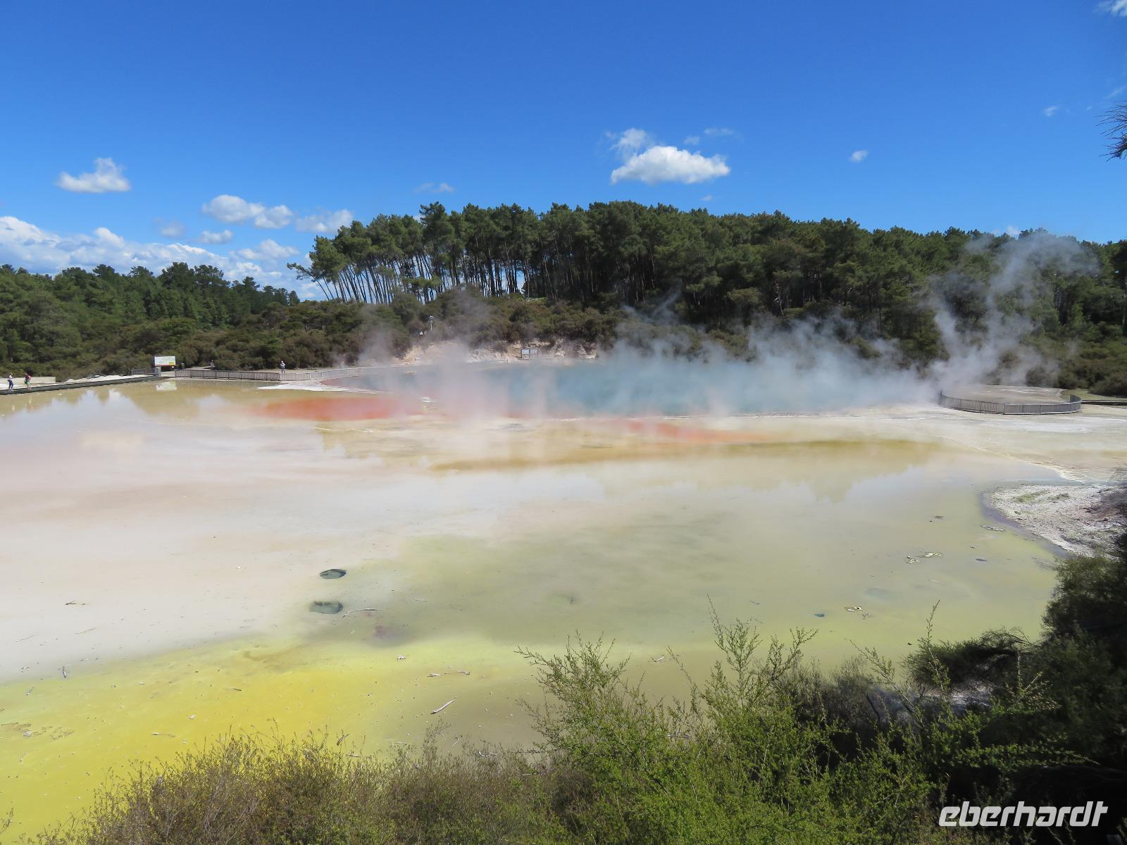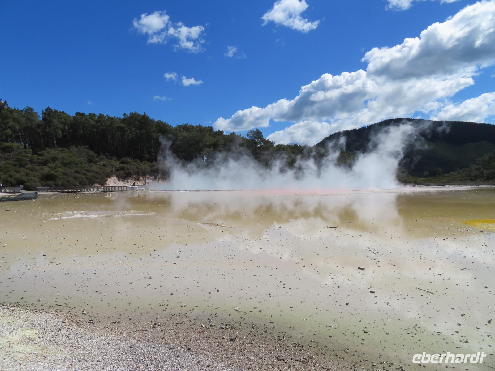 Leider müssen wir uns heute schon wieder von unserem „Urlaub am Strand" verabschieden und setzen die Reise weiter in die Inselmitte fort. Auf Weg passieren wir einige kleine Ortschaften wie Waihi, einer weiteren Goldgräberstadt. Hier ist das Thema aber noch brandaktuell und wir sehen eine riesige Mine, eingezäunt und der letzte Erdrutsch noch gut sichtbar. Unsere Mittagspause legen wir im Auenland ein, in der Kleinstadt Matamata. Hier kommen wir Peter Jacksons Trilogie „Der Herr der Ringe" und „Der Hobbit" etwas näher - stilecht ist auch das Besucherzentrum. Wir nähern uns schließlich unserem Tagesziel Rotorua, besuchen vorher jedoch das Geothermalgebiet Wai-O-Tapu. Spätestens hier steigt uns auch der markante Schwefelgeruch in die Nase. Bei einem ausgiebigen Rundgang bewundern wir die farbenfrohen Pools, heißen Quellen und bizarren Krater. Zurück in Rotorua steht der Abend ganz im Zeichen der Maori-Kultur, denn diese Region gilt auch als das Zentrum der Maori. Wir drehen eine kleine Runde durch die Anlage von Te Puia, sehen ein traditionelles Waka, den etwas modernisierten Erdofen, in dem unser Abendessen zubereitet wird. Nach der Willkommenszeremonie durch den Chief und seine Krieger, erhalten wir mit Tänzen und Gesang einen Eindruck der polynesischen Kultur. Schließlich können wir am Buffet reichlich schlemmen. Zum Abschluss soll der Pohutu-Geysir noch eine eindrucksvolle Wassersäule in den nächtlichen Himmel spucken, aber scheinbar ist das Abendessen auch bei ihm heute etwas ausgiebiger ausgefallen...