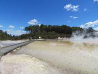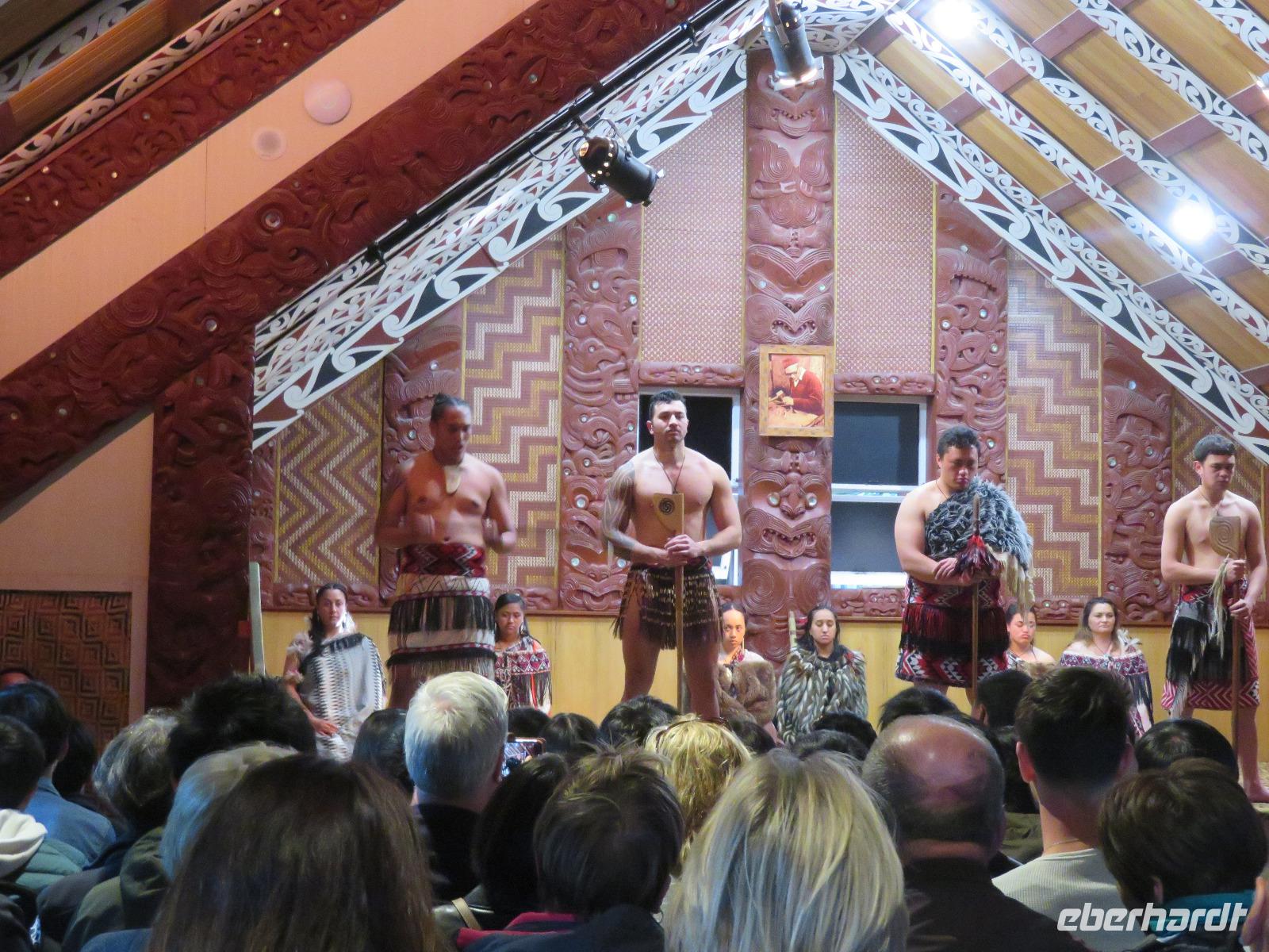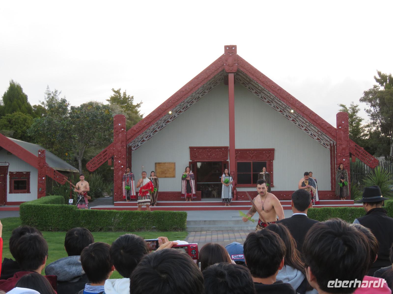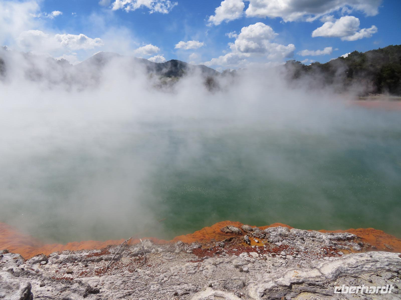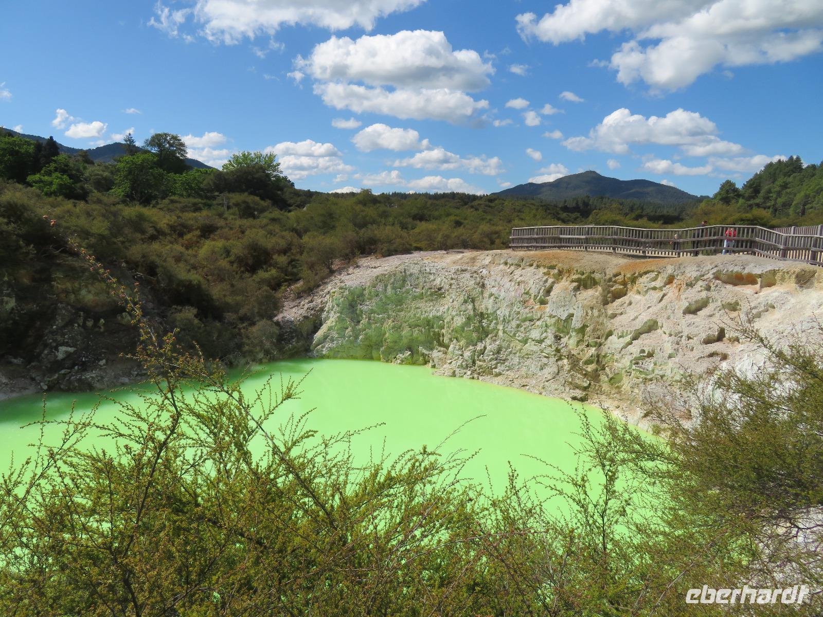 Leider müssen wir uns heute schon wieder von unserem „Urlaub am Strand" verabschieden und setzen die Reise weiter in die Inselmitte fort. Auf Weg passieren wir einige kleine Ortschaften wie Waihi, einer weiteren Goldgräberstadt. Hier ist das Thema aber noch brandaktuell und wir sehen eine riesige Mine, eingezäunt und der letzte Erdrutsch noch gut sichtbar. Unsere Mittagspause legen wir im Auenland ein, in der Kleinstadt Matamata. Hier kommen wir Peter Jacksons Trilogie „Der Herr der Ringe" und „Der Hobbit" etwas näher - stilecht ist auch das Besucherzentrum. Wir nähern uns schließlich unserem Tagesziel Rotorua, besuchen vorher jedoch das Geothermalgebiet Wai-O-Tapu. Spätestens hier steigt uns auch der markante Schwefelgeruch in die Nase. Bei einem ausgiebigen Rundgang bewundern wir die farbenfrohen Pools, heißen Quellen und bizarren Krater. Zurück in Rotorua steht der Abend ganz im Zeichen der Maori-Kultur, denn diese Region gilt auch als das Zentrum der Maori. Wir drehen eine kleine Runde durch die Anlage von Te Puia, sehen ein traditionelles Waka, den etwas modernisierten Erdofen, in dem unser Abendessen zubereitet wird. Nach der Willkommenszeremonie durch den Chief und seine Krieger, erhalten wir mit Tänzen und Gesang einen Eindruck der polynesischen Kultur. Schließlich können wir am Buffet reichlich schlemmen. Zum Abschluss soll der Pohutu-Geysir noch eine eindrucksvolle Wassersäule in den nächtlichen Himmel spucken, aber scheinbar ist das Abendessen auch bei ihm heute etwas ausgiebiger ausgefallen...