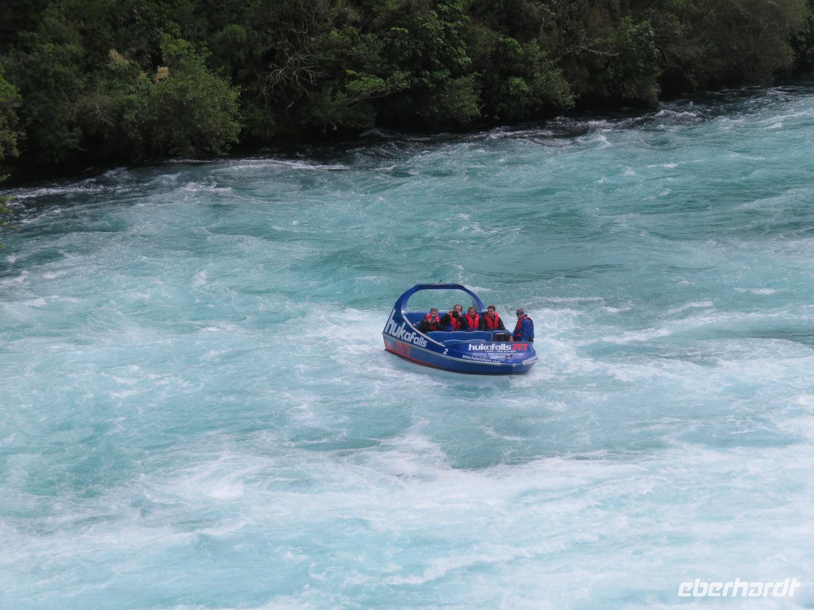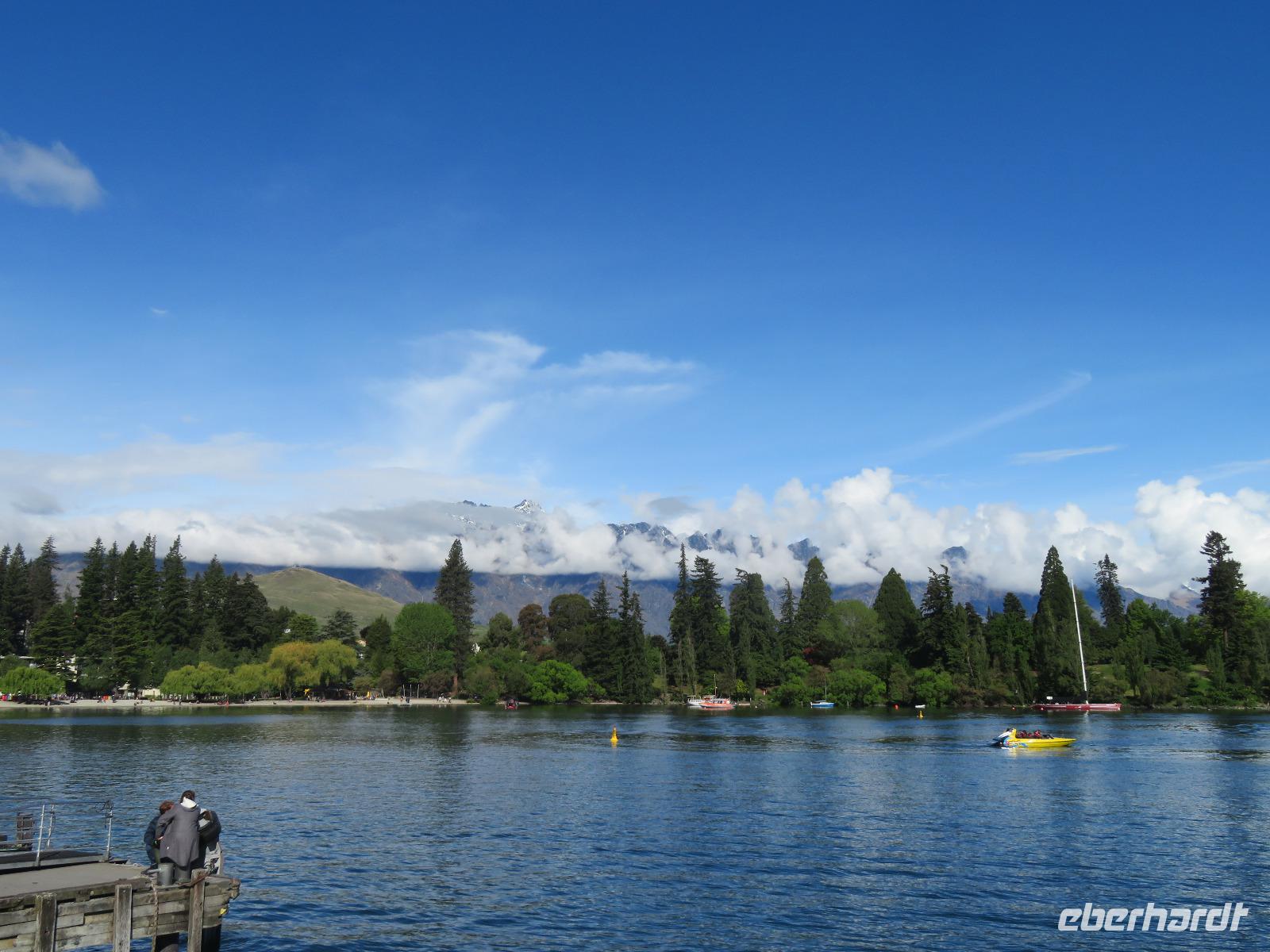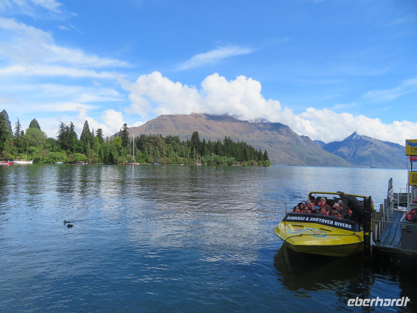Queenstown ist bekannt für außergewöhnliche Aktivitäten in und um die Stadt herum. Gestern haben wir schon den Bungee-Springern beim Fallen zugesehen. Besonders beliebt sind auch Tandemsprünge, Paragliding und Jetbootfahren. Letzteres steht bei uns heute auf dem Programm. Der Ausflug beginnt am Mittag, so bleibt noch der Vormittag zur freien Verfügung in der Stadt um auf eigene Faust ein paar Erledigungen zu machen. Los geht's, wir fahren nach Glenorchy, ans nördliche Ende des Sees. Von hier startet unser Abenteuer direkt mit der Jetbootfahrt. Da der See etwas rau ist, steigen wir weiter oben am Flusslauf in die Jetboote ein. Das Jetboot hat keine Schiffsschraube, sondern wird durch einen Wasserstrahlantrieb gelenkt und beschleunigt. Interessant hierbei ist, dass das Boot auch über seichtes Gewässer ohne Probleme fahren kann. Unser Pilot rast mit bis zu 90 km/h den Fluss hinauf und wir gelangen immer tiefer in die traumhafte Bergwelt des Mount Aspiring Nationalparks. Zwischen mit schneebedeckten Bergen, Gletschern und Bachläufen - hier ist die Natur wirklich noch nahezu unberührt. Für ein rundes Ausflugsprogramm sorgt der anschließende Spaziergang durch den Wald, am Rande des Nationalparks. Unser Guide erklärt uns noch einmal vieles über die hier vorkommende Flora und Fauna, da wir aber Streber-Reisegäste sind und Dank Bernd alles schon wissen, konzentrieren wir uns eher aufs Fotografieren und Genießen.