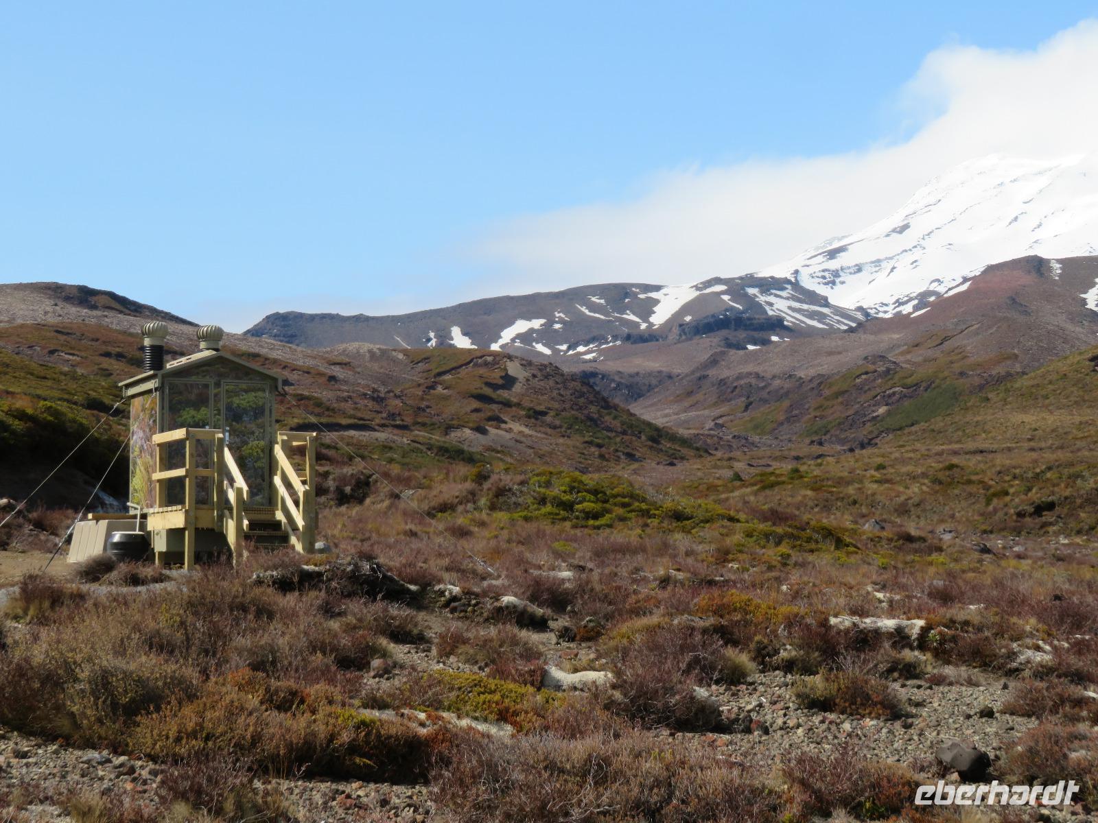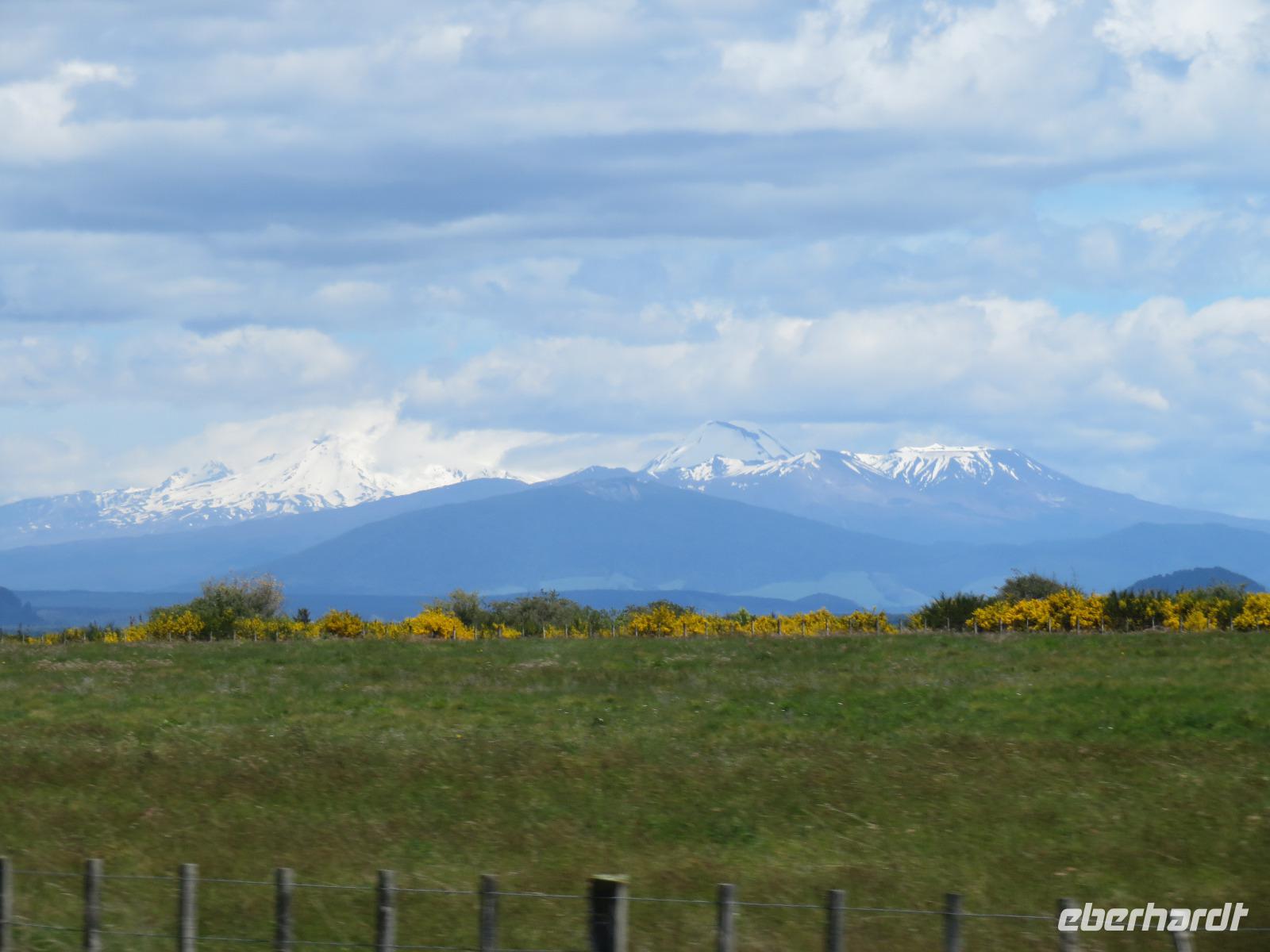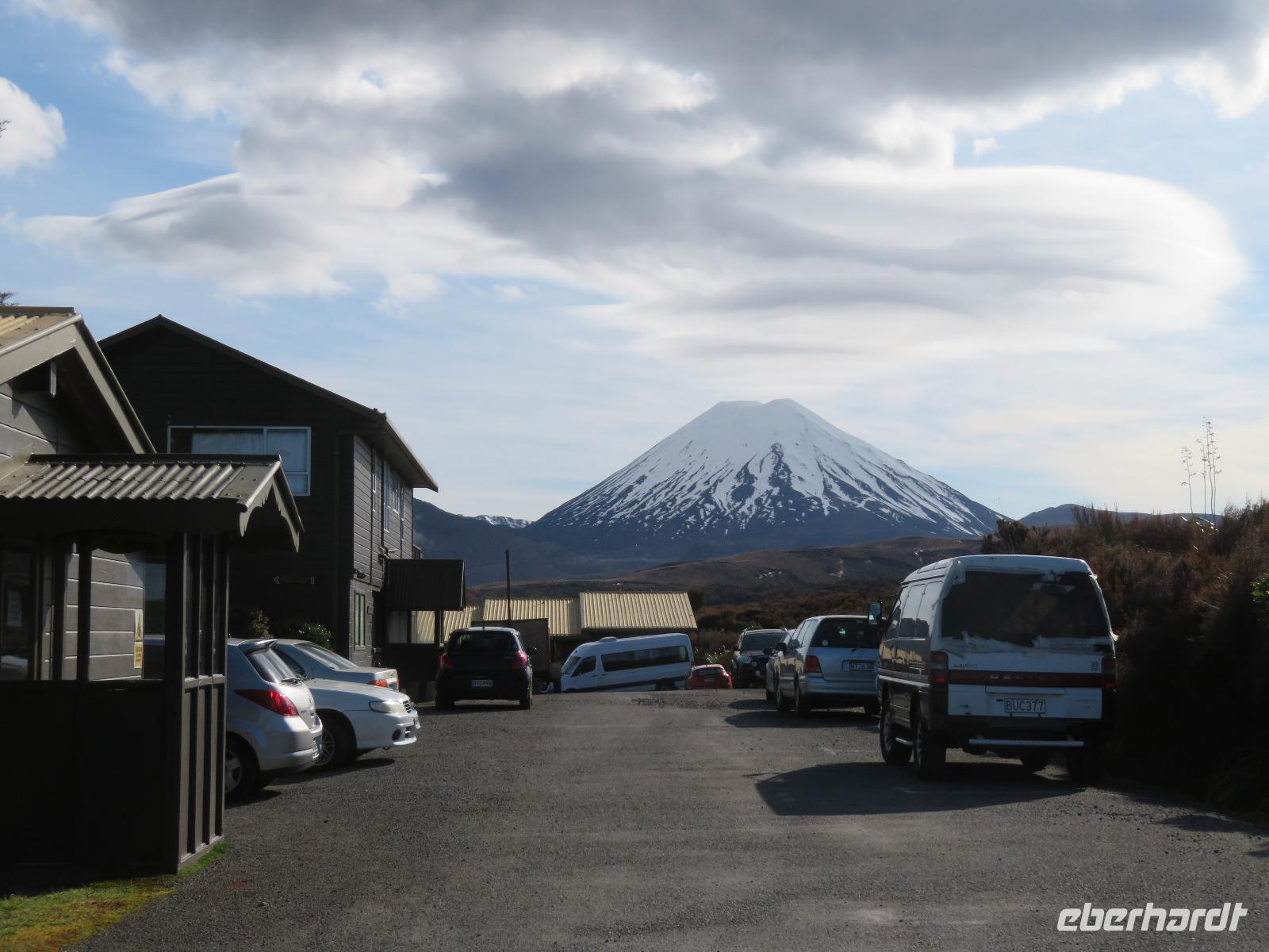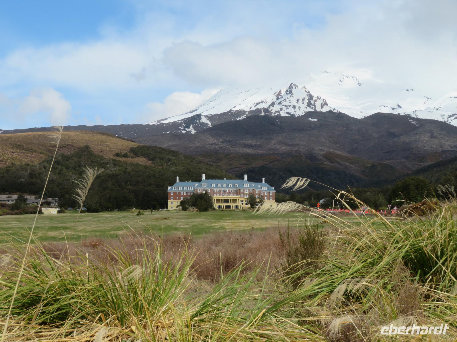 Bevor wir Rotorua verlassen, legen wir noch einen Stopp am alten Badehaus ein. Die Stadt ist schon immer ein beliebtes Ziel für Touristen gewesen, dank der zahlreichen Thermalquellen. Die gepfegten Rasen- und Beetanlagen rund um das alte Tudorhaus laden förmlich zum Wohlfühlen ein. Am Ufer des Sees werden wir dann noch von den berühmten neuseeländischen schwarzen Schwänen und einer jungen Familie von Pukekos mit Küken verabschiedet. Die Gegend um Rotorua ist nicht nur touristischer Anziehungspunkt, sondern ist auch ein wichtiges Zentrum der Milchwirtschaft. Entsprechend viele Weiden sehen wir auf unserer Fahrt Richtung Taupo. Wir legen noch einen Stopp bei den Bienen und den gewaltigen Huka-Falls ein und genießen schließlich eine tolle Aussicht über den größten See Neuseelands. In der Ferne sehen wir sogar schon unser Tagesziel mit schneebedeckten Bergspitzen aufblitzen - die Vulkane des Tongariro Nationalparks. Es ist allerdings noch ein guter Weg vor uns, sodass wir hier in Taupo erst nach einer kleinen Stärkung weiterfahren. Immer entlang des Sees bis Turangi, der wohl letzten größeren Ortschaft nach Taupo, hier füllen wir unsere Proviantlager wieder auf uns fahren frohen Mutes in Richtung Nationalpark - oder auch nicht. Eine kleine Ehrenrunde durch Turangi ist nötig, da es doch noch gute Seelen gibt, die unbemerkt verschwundene Kreditkarten wiederfinden und im Supermarkt abgeben ?? Wir schauen kurz noch im Besucherzentrum und dem Skigebiet von Whakapapa vorbei und beziehen dann schließlich unser Quartier. Das Skotel, Neuseelands höchst gelegenes Hotel auf 1.142 Meter Höhe! Das rustikale Ambiente und der (Dank des Wetters) direkte Blick auf die Vulkane Tongariro und Ngauruhoe - eine fast perfekte Kombination.