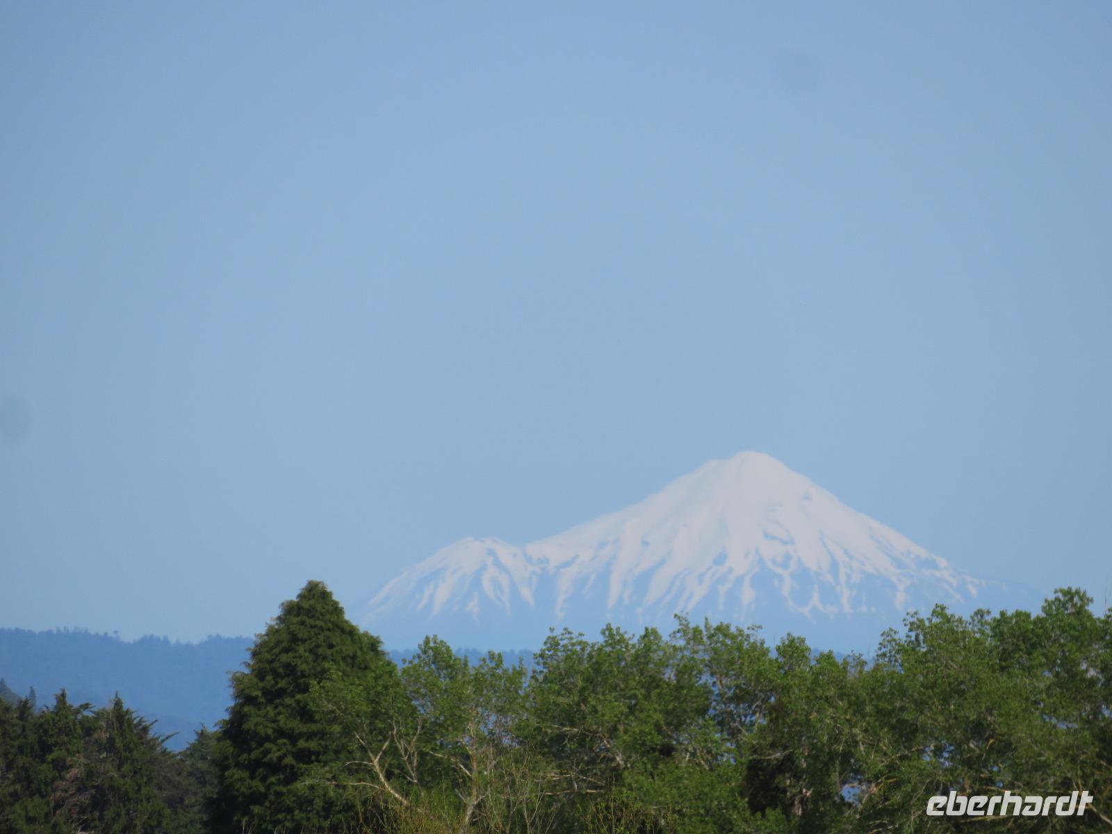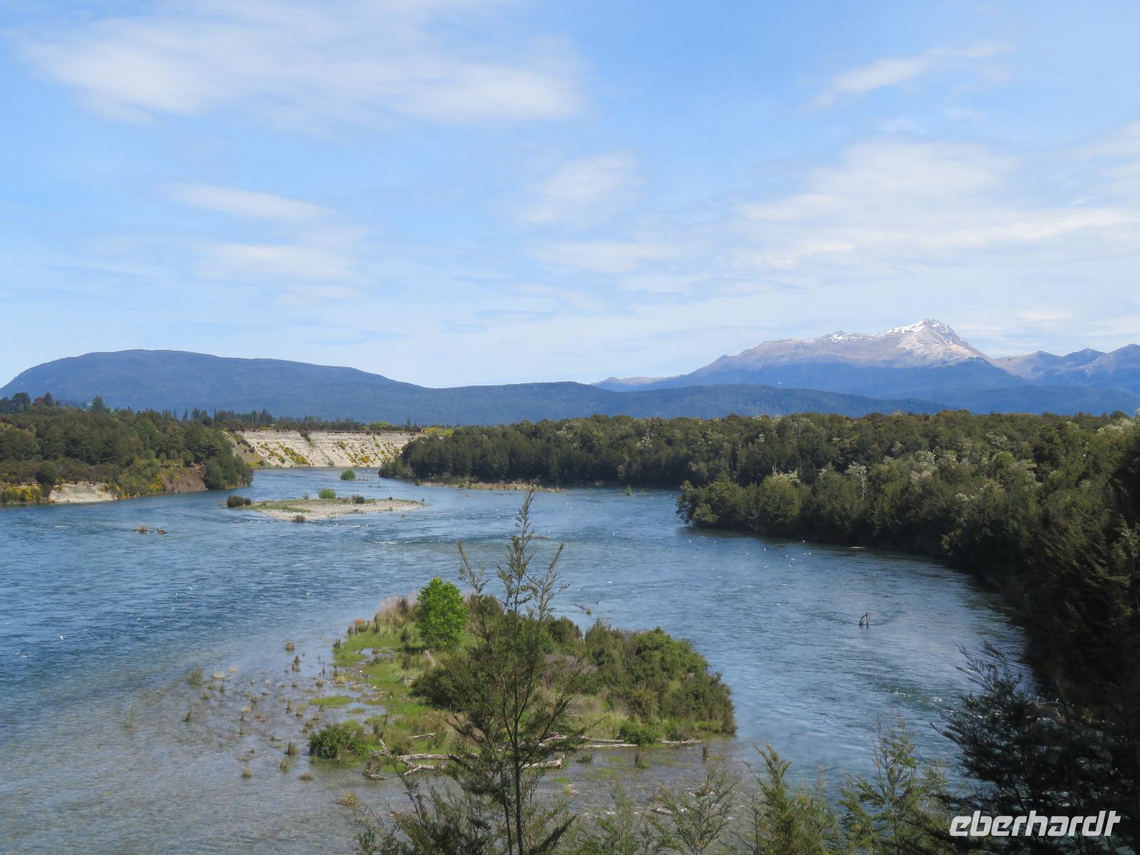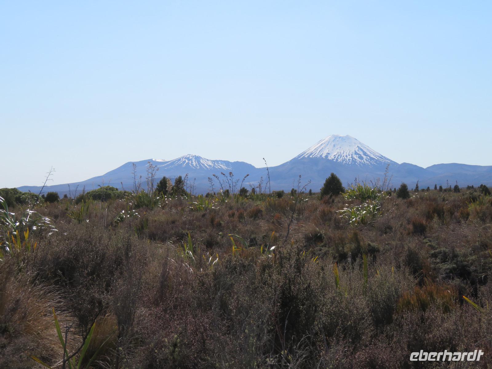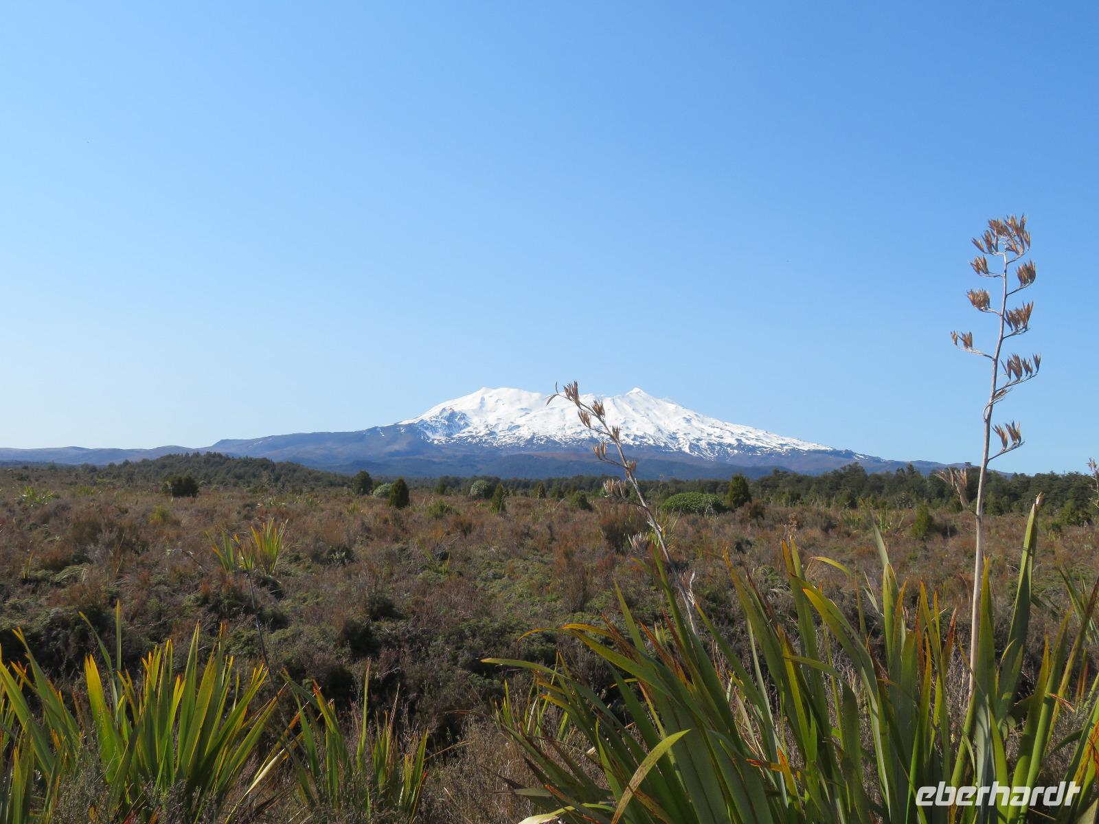 Bevor wir Rotorua verlassen, legen wir noch einen Stopp am alten Badehaus ein. Die Stadt ist schon immer ein beliebtes Ziel für Touristen gewesen, dank der zahlreichen Thermalquellen. Die gepfegten Rasen- und Beetanlagen rund um das alte Tudorhaus laden förmlich zum Wohlfühlen ein. Am Ufer des Sees werden wir dann noch von den berühmten neuseeländischen schwarzen Schwänen und einer jungen Familie von Pukekos mit Küken verabschiedet. Die Gegend um Rotorua ist nicht nur touristischer Anziehungspunkt, sondern ist auch ein wichtiges Zentrum der Milchwirtschaft. Entsprechend viele Weiden sehen wir auf unserer Fahrt Richtung Taupo. Wir legen noch einen Stopp bei den Bienen und den gewaltigen Huka-Falls ein und genießen schließlich eine tolle Aussicht über den größten See Neuseelands. In der Ferne sehen wir sogar schon unser Tagesziel mit schneebedeckten Bergspitzen aufblitzen - die Vulkane des Tongariro Nationalparks. Es ist allerdings noch ein guter Weg vor uns, sodass wir hier in Taupo erst nach einer kleinen Stärkung weiterfahren. Immer entlang des Sees bis Turangi, der wohl letzten größeren Ortschaft nach Taupo, hier füllen wir unsere Proviantlager wieder auf uns fahren frohen Mutes in Richtung Nationalpark - oder auch nicht. Eine kleine Ehrenrunde durch Turangi ist nötig, da es doch noch gute Seelen gibt, die unbemerkt verschwundene Kreditkarten wiederfinden und im Supermarkt abgeben ?? Wir schauen kurz noch im Besucherzentrum und dem Skigebiet von Whakapapa vorbei und beziehen dann schließlich unser Quartier. Das Skotel, Neuseelands höchst gelegenes Hotel auf 1.142 Meter Höhe! Das rustikale Ambiente und der (Dank des Wetters) direkte Blick auf die Vulkane Tongariro und Ngauruhoe - eine fast perfekte Kombination.