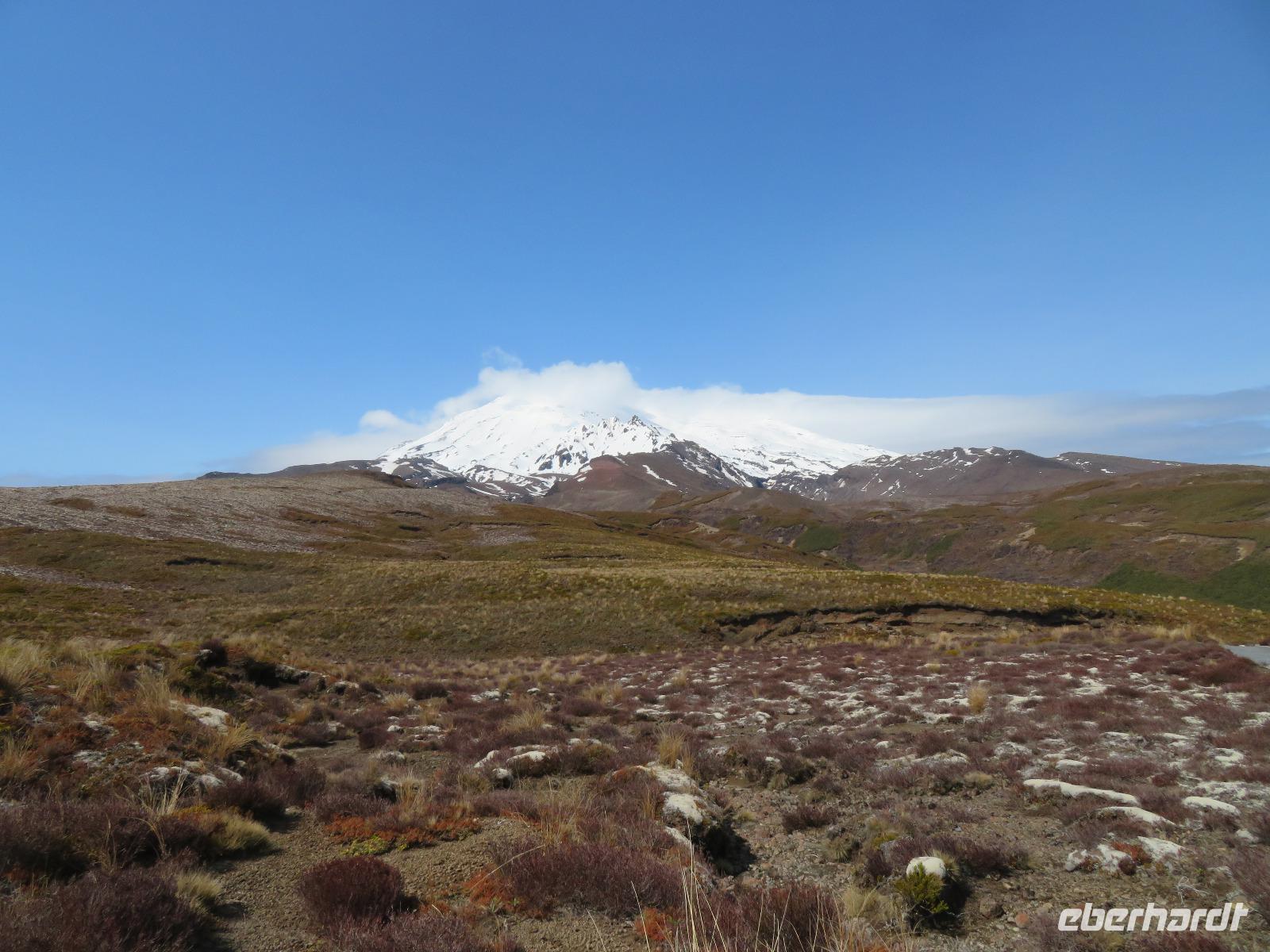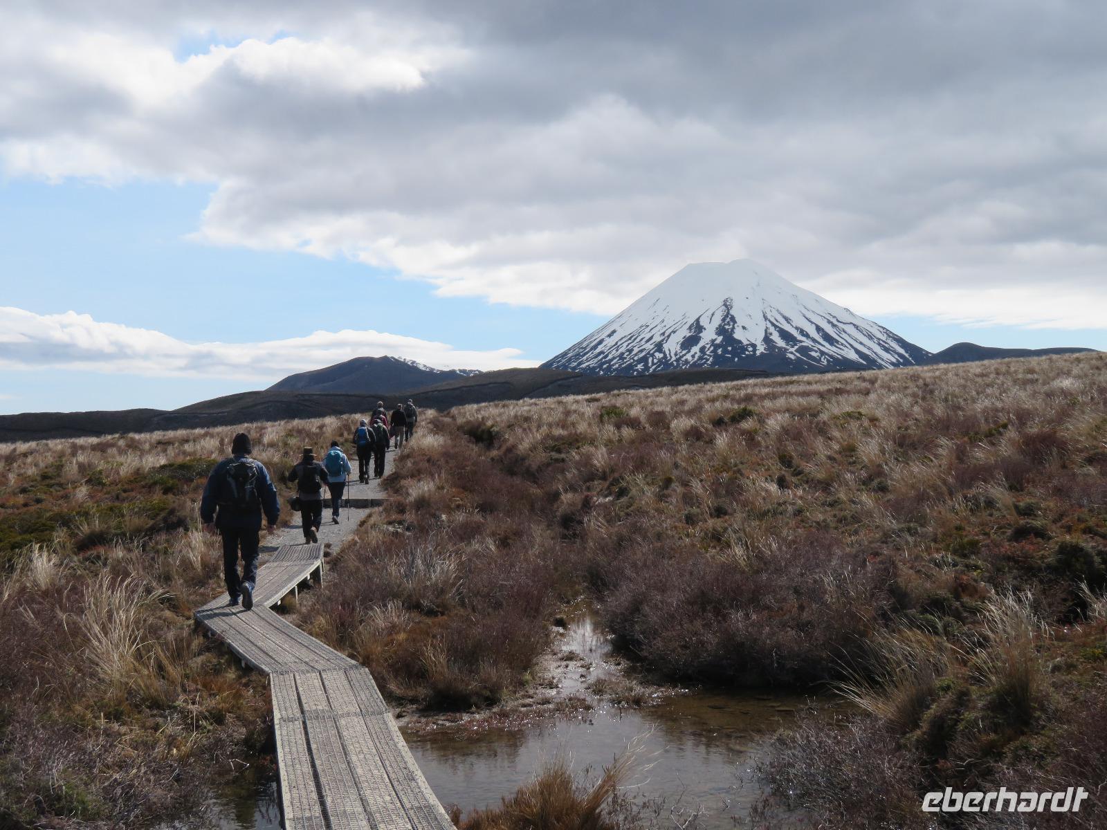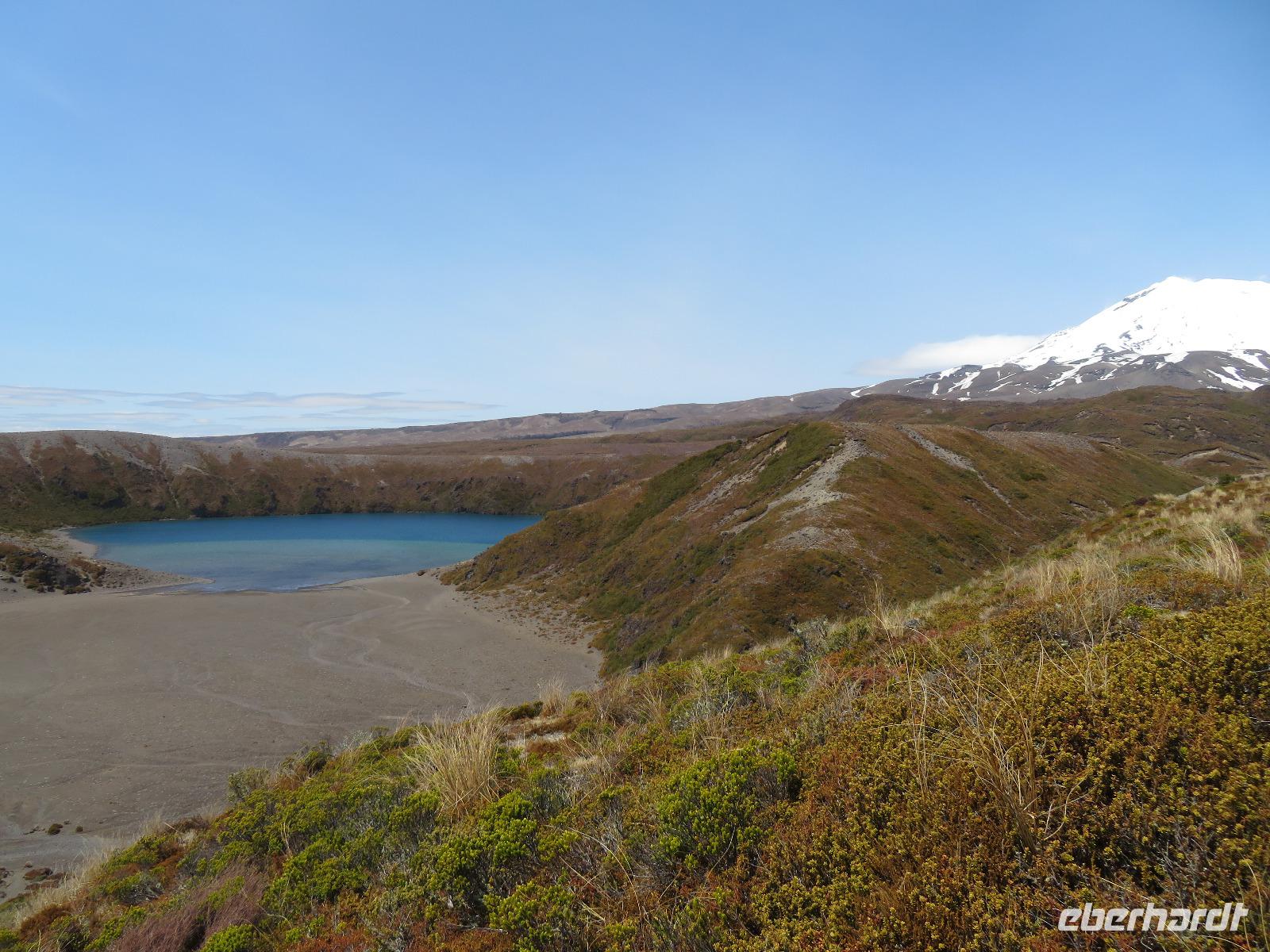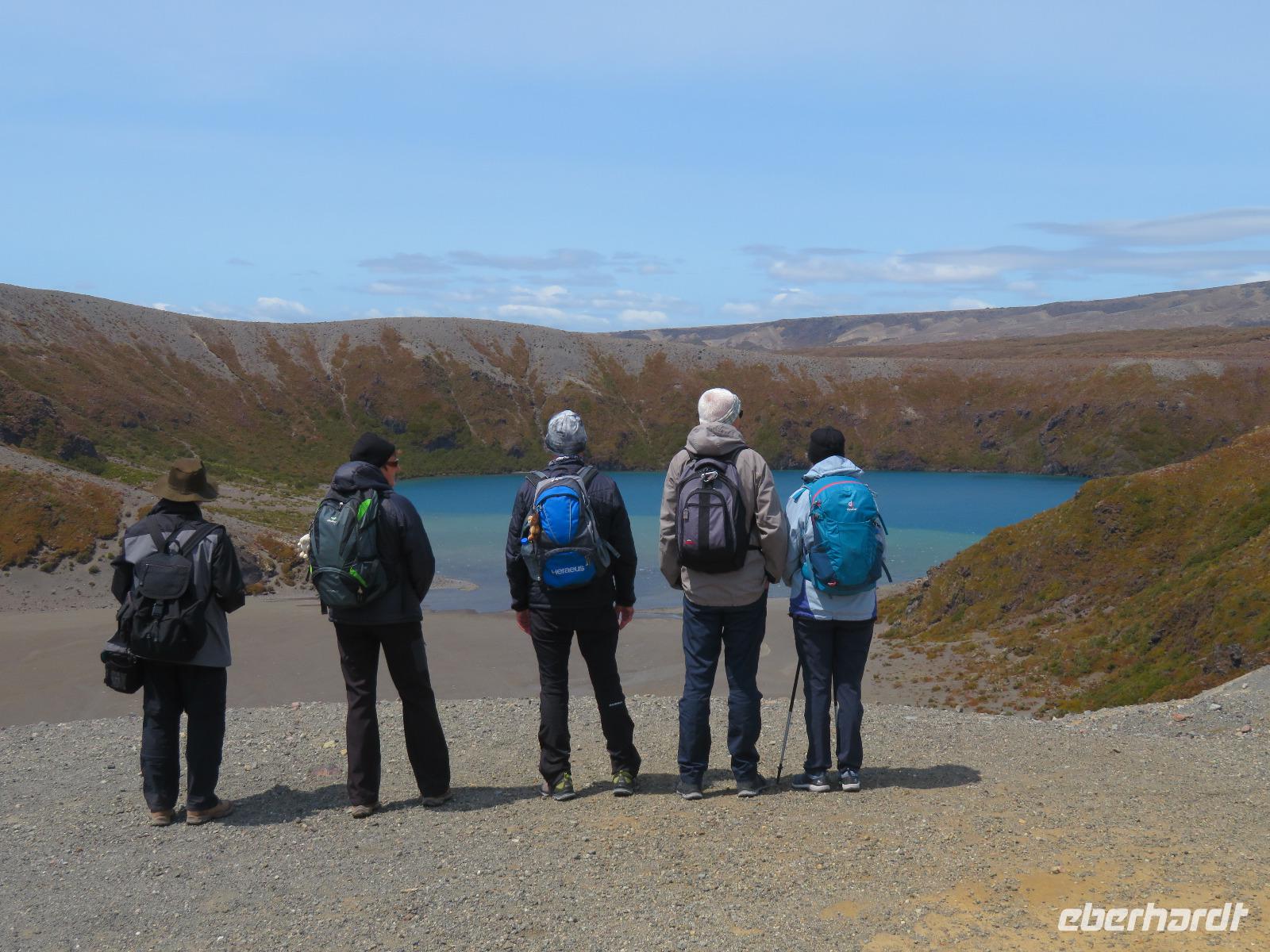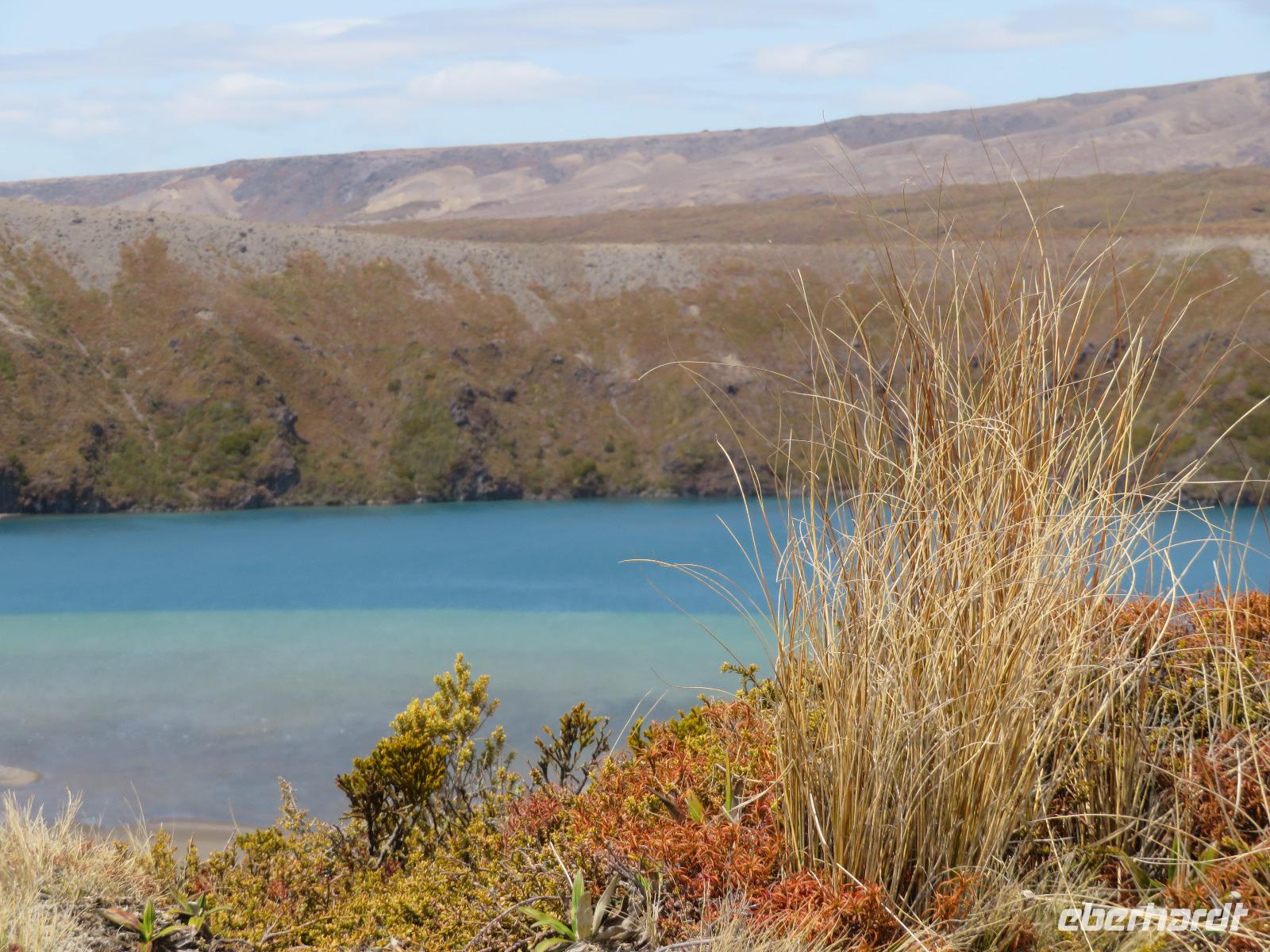 Nach dem Frühstück sind wir startklar für unsere Wanderung in den Nationalpark - die Sonne ist auch heute wieder auf unserer Seite, aber leider von einer heimtückischen kalten Brise begleitet, die sogar Caps auf dem Gewissen hat. Zu Beginn bestreiten wir noch alle gemeinsam den Weg, bis sich dann nach etwa einer Stunde die Gruppe trennt - Bernd geht den kurzen Weg, direkt zum Taranaki-Wasserfall und Hotel zurück, ich bestreite den Weg mit meinen Gefährten weiter bis zu den Tama Lakes. Eigentlich ist der gut ausgebaute Weg keine große Hürde, gemütlich schlängelt er sich durch die karge Vulkanlandschaft, immer wieder geht es Hügel hinauf und wieder hinunter. Vor uns immer gut zu erkennen der fas perfekt kegelförmige Vulkan Ngauruhoe und in unserem Rücken der Ruhapehu. Wir haben sogar das Glück heute den weißen Gipfel des einsamen Taranaki an der Westküste zu erkennen. Wisst ihr noch, weshalb der Taranaki ganz allein am Rande der Westküste liegt? Wir laufen noch etwa eineinhalb Stunden bis zum unteren Tama Lake. Den Aufstieg zum oberen Tama Lake über die Geröllhänge lassen wir heute einmal ausfallen, es ist zu windig und macht so keinen Spaß weiter zu gehen. Lieber nehmen wir uns etwas mehr Zeit für die Pause und genießen den Blick - umgeben von majestätischen Vulkanen, vor uns der türkisblau leuchtende See - spektakulär!