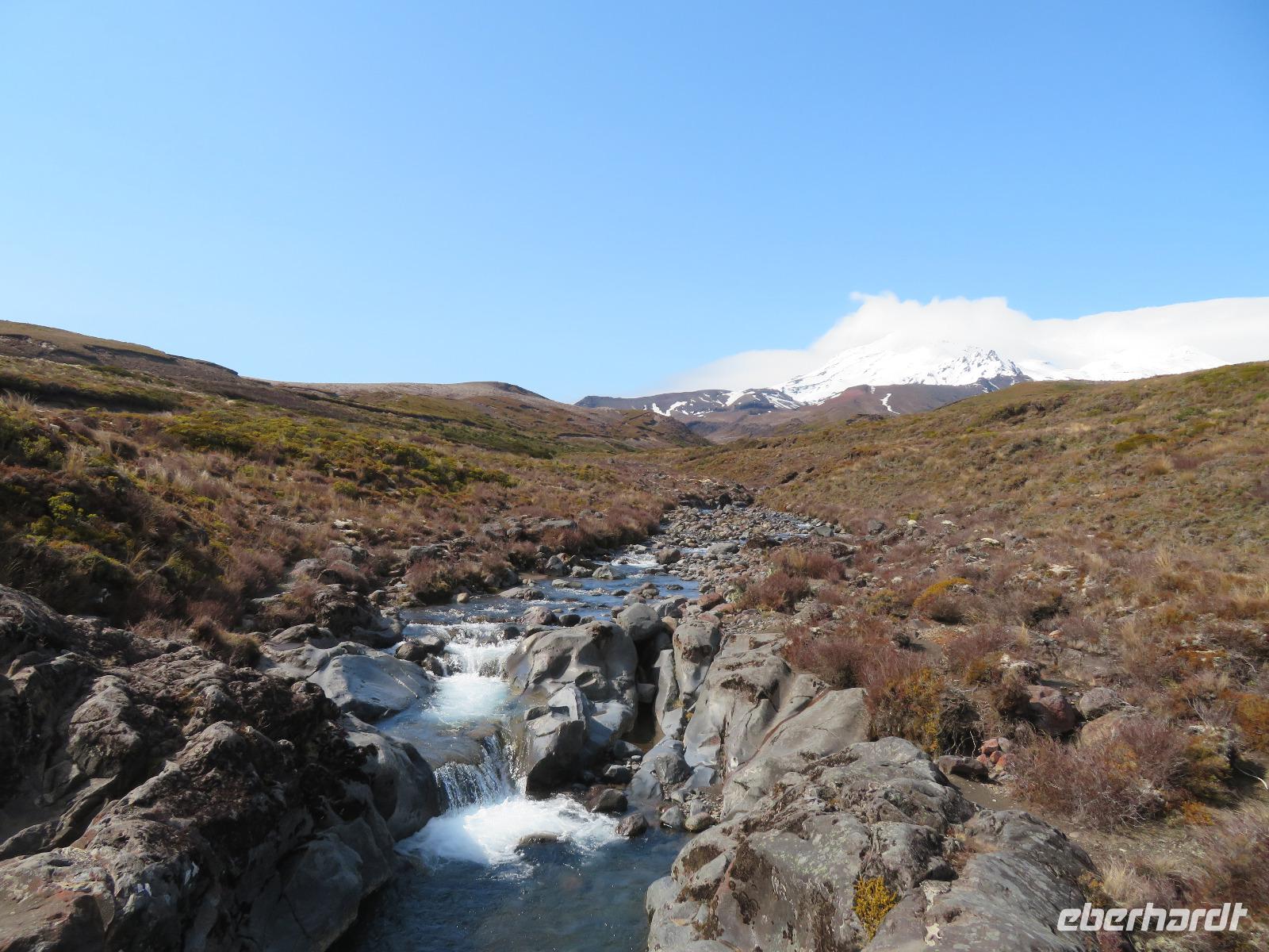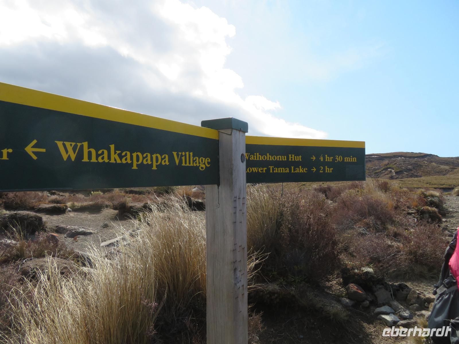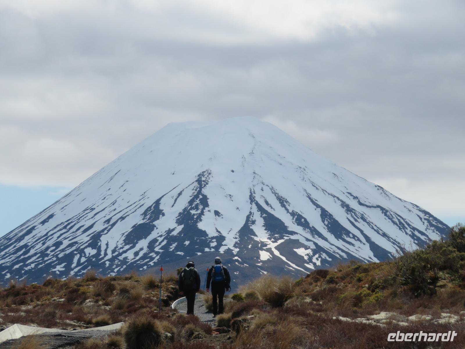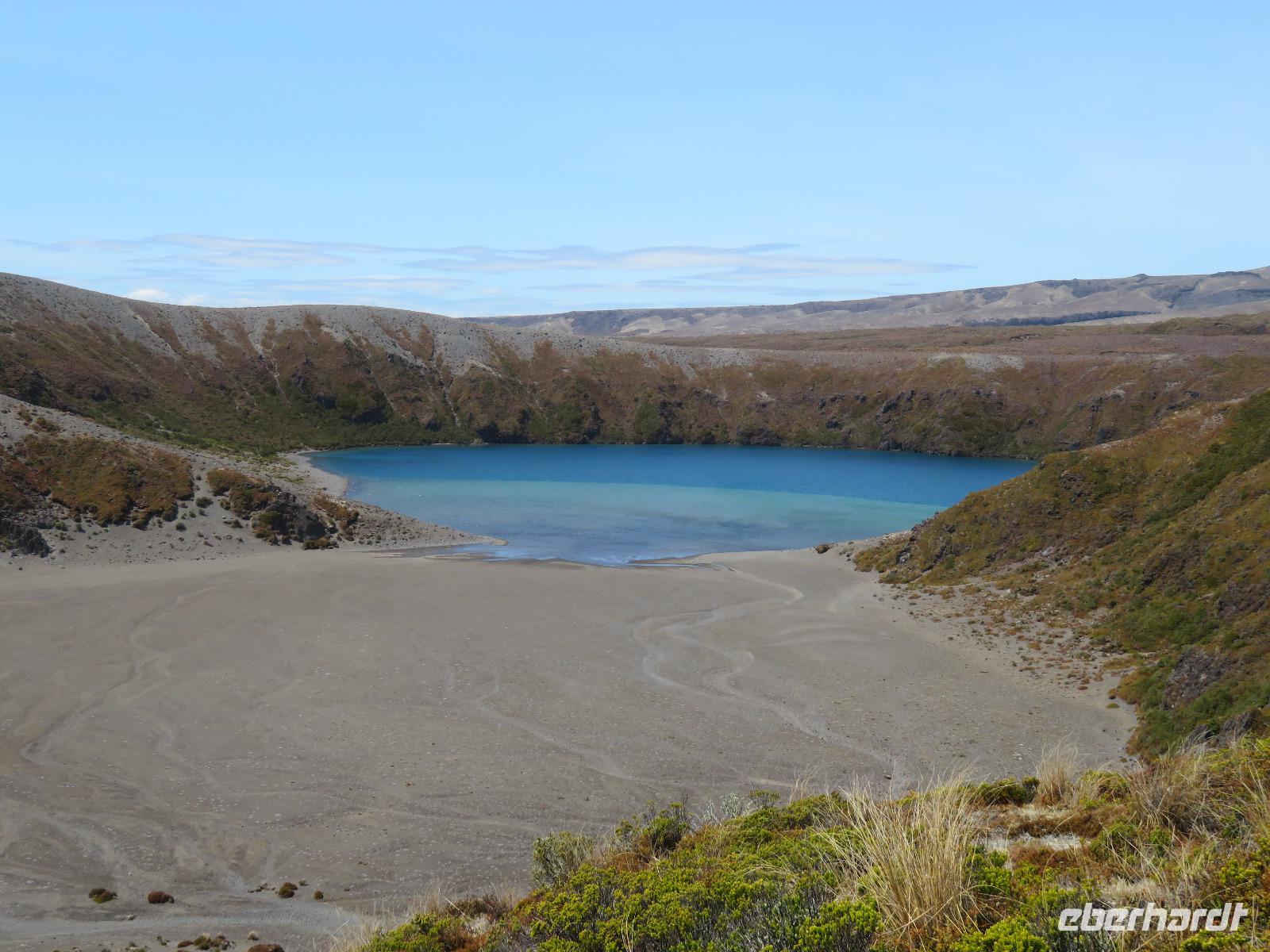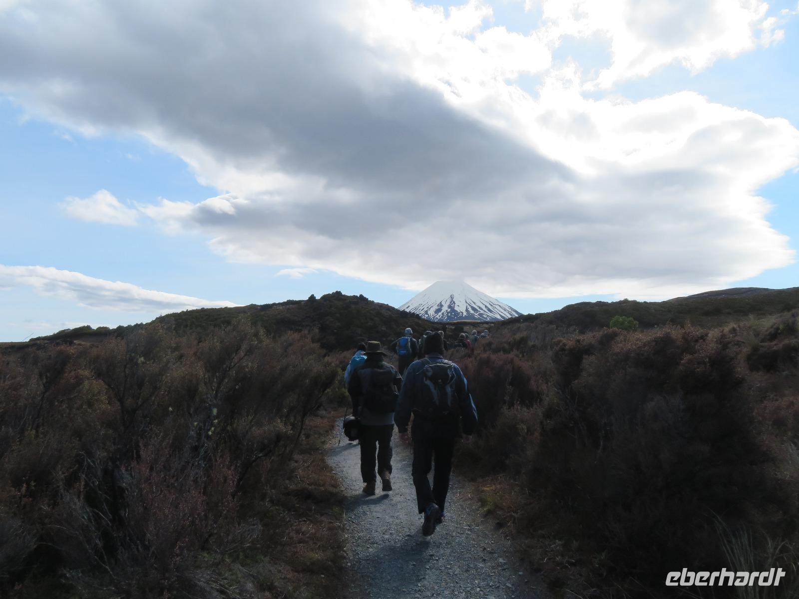 Nach dem Frühstück sind wir startklar für unsere Wanderung in den Nationalpark - die Sonne ist auch heute wieder auf unserer Seite, aber leider von einer heimtückischen kalten Brise begleitet, die sogar Caps auf dem Gewissen hat. Zu Beginn bestreiten wir noch alle gemeinsam den Weg, bis sich dann nach etwa einer Stunde die Gruppe trennt - Bernd geht den kurzen Weg, direkt zum Taranaki-Wasserfall und Hotel zurück, ich bestreite den Weg mit meinen Gefährten weiter bis zu den Tama Lakes. Eigentlich ist der gut ausgebaute Weg keine große Hürde, gemütlich schlängelt er sich durch die karge Vulkanlandschaft, immer wieder geht es Hügel hinauf und wieder hinunter. Vor uns immer gut zu erkennen der fas perfekt kegelförmige Vulkan Ngauruhoe und in unserem Rücken der Ruhapehu. Wir haben sogar das Glück heute den weißen Gipfel des einsamen Taranaki an der Westküste zu erkennen. Wisst ihr noch, weshalb der Taranaki ganz allein am Rande der Westküste liegt? Wir laufen noch etwa eineinhalb Stunden bis zum unteren Tama Lake. Den Aufstieg zum oberen Tama Lake über die Geröllhänge lassen wir heute einmal ausfallen, es ist zu windig und macht so keinen Spaß weiter zu gehen. Lieber nehmen wir uns etwas mehr Zeit für die Pause und genießen den Blick - umgeben von majestätischen Vulkanen, vor uns der türkisblau leuchtende See - spektakulär!