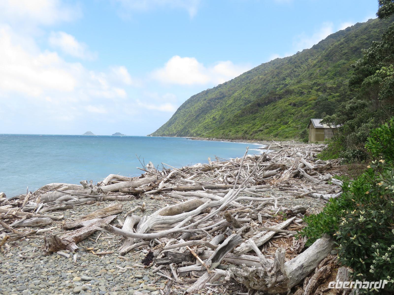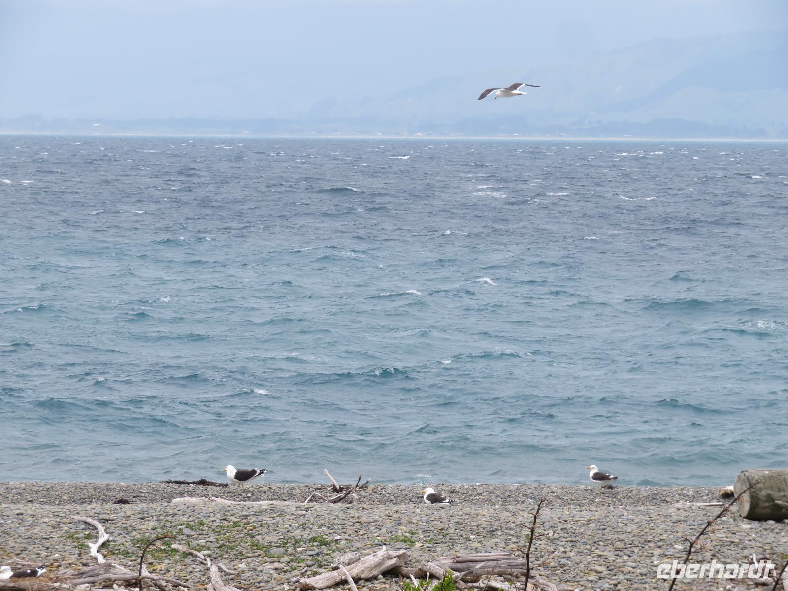 Die Reise führt uns heute wieder weiter und wir verlassen das vulkanische Plateau der Nordinsel in Richtung Süd-Westen. Am südlichen Ende des Nationalparks liegt das kleine verschlafene Örtchen Ohakune. Im Winter sehr beliebt und belebt durch die Skigebiete. Hier finden wir plötzlich wieder richtig hohe Bäume, wie den Rimu und Farne, bei einem kleinen Spaziergang durch den Wald weist uns Bernd auf die Besonderheiten der Vegetation hin. Über Bulls, Levin und Otaki erreichen wir am Nachmittag dann auch schon Paraparaumo an der Kapiti Küste. Bis zum Abendessen haben wir noch etwas Zeit für einen Spaziergang am Strand - zwar etwas ungemütlicher als auf der Coromandelhalbinsel vom Wetter her, aber mindestens genau so schön leer und lang.