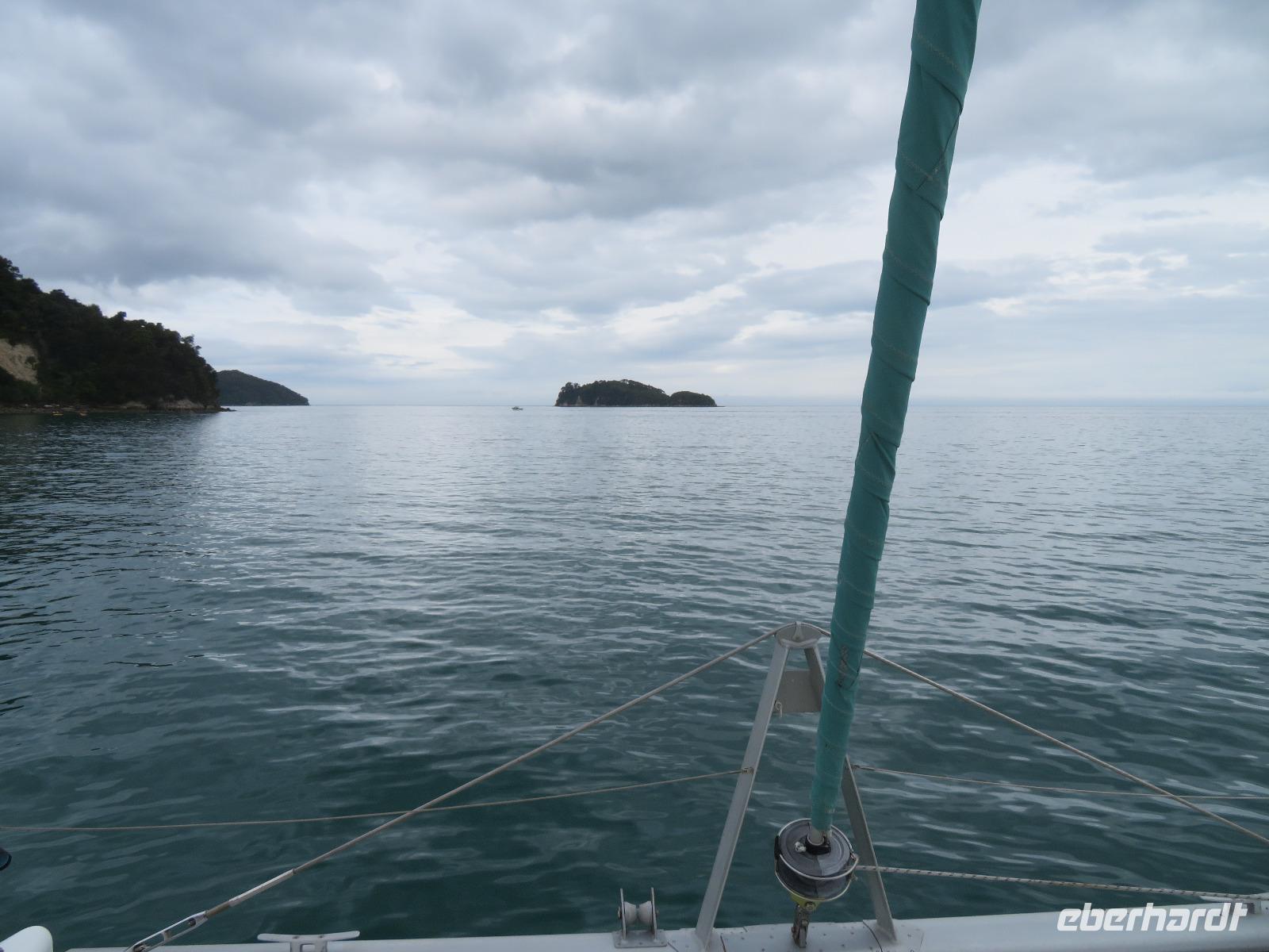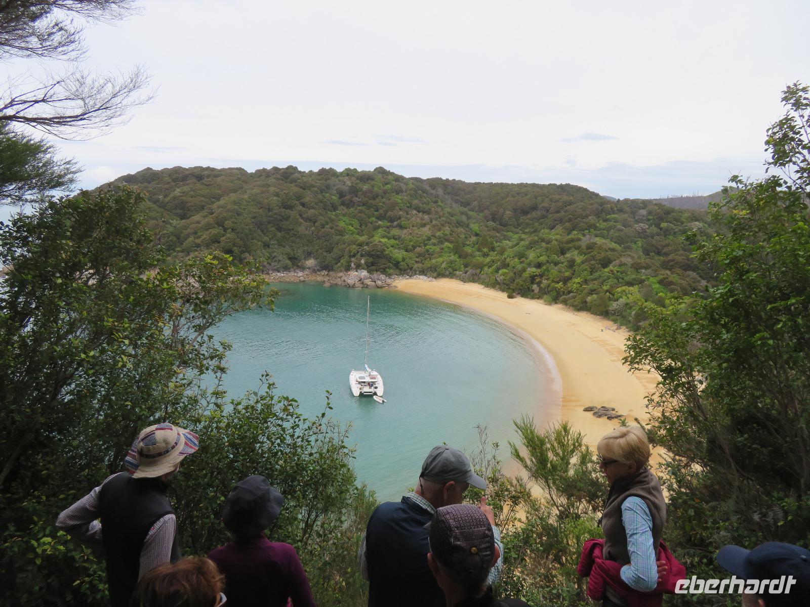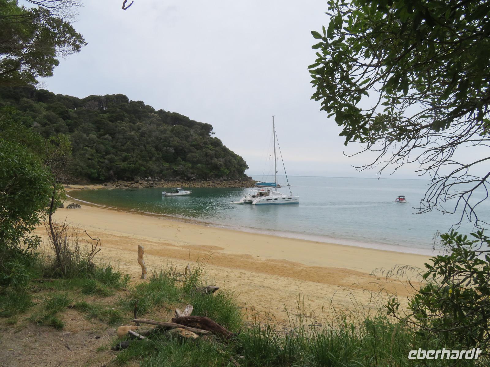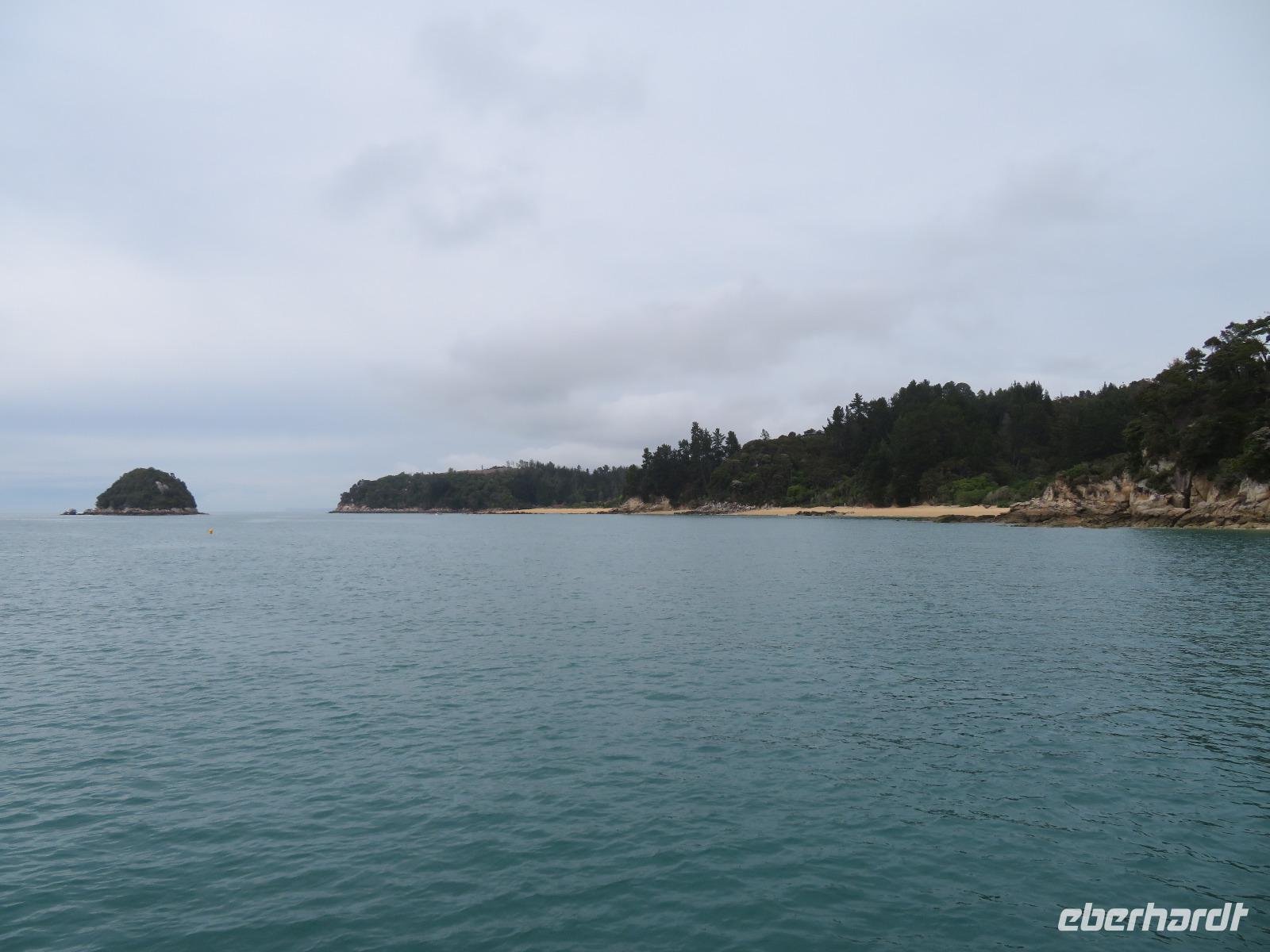 Leider soll es das Wetter heute nicht besonders gut mit uns meinen. Obwohl der Vormittag noch recht freundlich beginnt, bleibt es leider bewölkt und etwas frisch. Packen wir also besser noch eine zusätzliche Jacke ein, man weiß ja nie. Mit dem Bus fahren wir eine gute Stunde bis nach Kaiterteri, schon hier sehen wir die tolle goldene Farbe des Sandes an den Stränden. Martin, unser Skipper wartet bereits auf uns in der Nähe und in kleinen Gruppen setzen wir mit dem Beiboot zum großen Katamaran über. Bevor wir starten, richten wir uns häuslich ein, machen es uns gemütlich und lauschen den Sicherheitsregel, die an Bord gelten. Und dann geht's los - Martin wirft den Motor an und unsere Entspannungsphase an Bord kann beginnen. Unsere Route folgt zunächst entlang der Küste zum Split Apple Rock, dem Felsen der wie ein aufgeschnittener Apfel aussieht. Von dort steuern wir die Naturschutzinsel Adele Island an und werden vom Konzert der Vögel begrüßt. Zeit für einen Tee bzw. Kaffee und ein paar Kekse - weiter zur Seebären-Kolonie, ein paar wenige haben sich heute sogar dazu bereit erklärt für unsere Kameras anwesend zu sein. Weiter nördlich in der Te Pukatea Bucht werfen wir den Anker aus. Wir gehen an Land und unternehmen einen Spaziergang zu einem Aussichtspunkt über die Bucht. Sogar die Sonne lässt sich jetzt mal kurz sehen und so wird der anschließende Aufenthalt unten am Strand zu einem echten Highlight. Ob nun Wassertreten, Muscheln sammeln oder Motive für die Kamera suchen, eigentlich würden wir gern hierbleiben - oder?