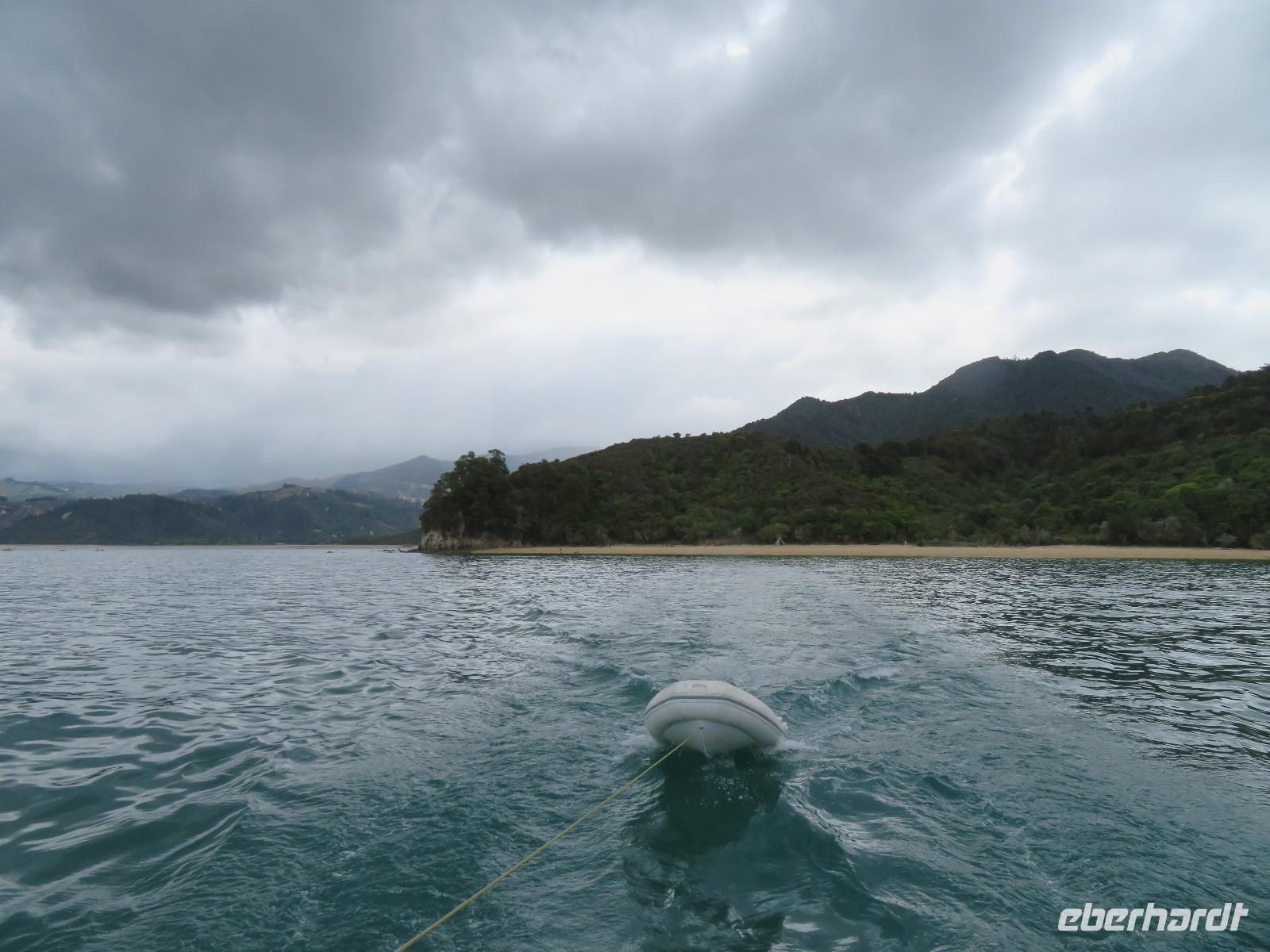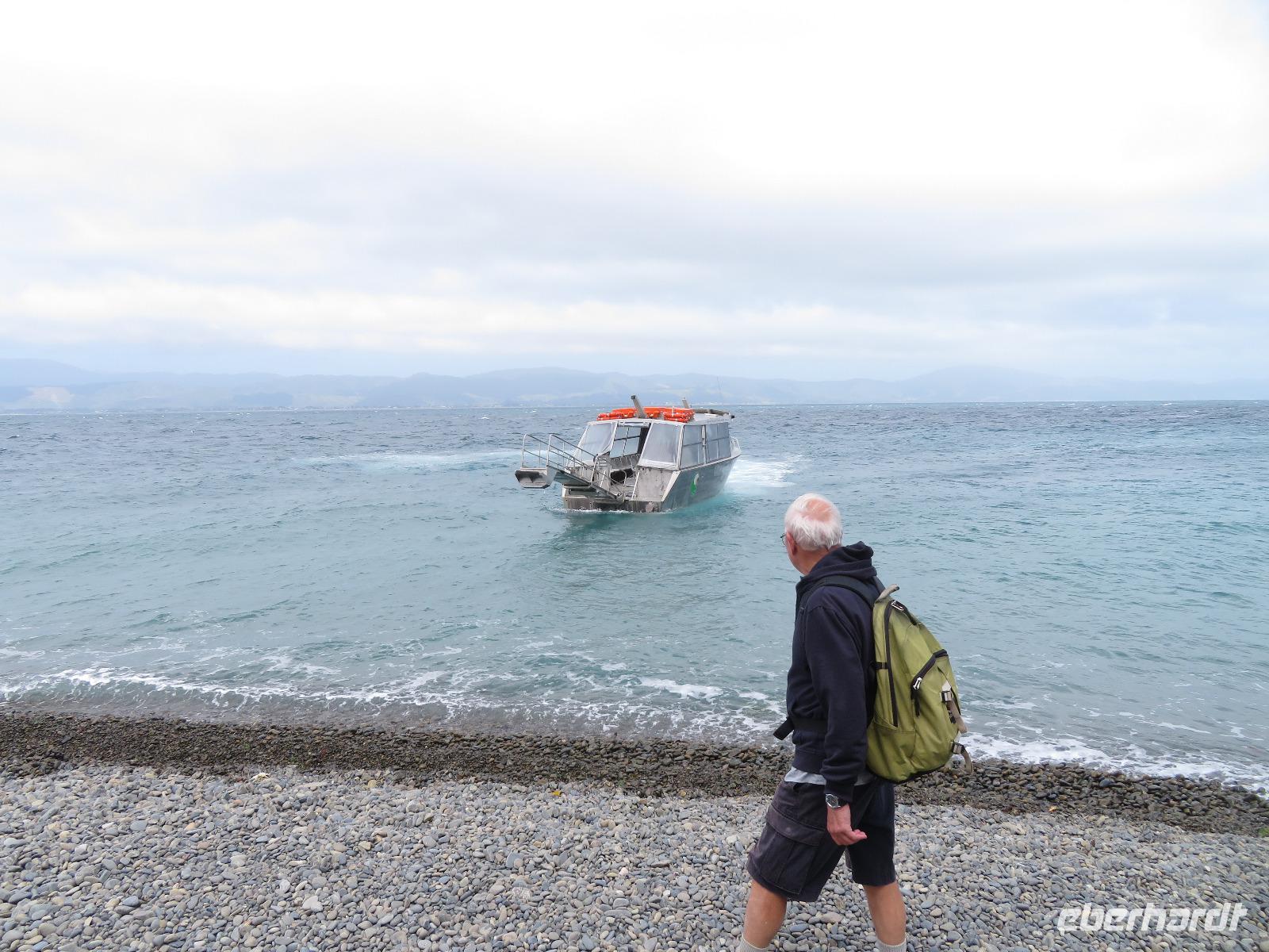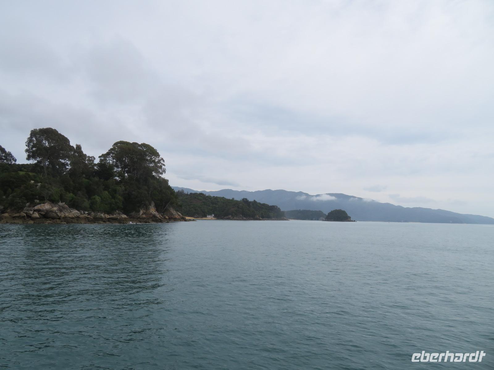 Leider soll es das Wetter heute nicht besonders gut mit uns meinen. Obwohl der Vormittag noch recht freundlich beginnt, bleibt es leider bewölkt und etwas frisch. Packen wir also besser noch eine zusätzliche Jacke ein, man weiß ja nie. Mit dem Bus fahren wir eine gute Stunde bis nach Kaiterteri, schon hier sehen wir die tolle goldene Farbe des Sandes an den Stränden. Martin, unser Skipper wartet bereits auf uns in der Nähe und in kleinen Gruppen setzen wir mit dem Beiboot zum großen Katamaran über. Bevor wir starten, richten wir uns häuslich ein, machen es uns gemütlich und lauschen den Sicherheitsregel, die an Bord gelten. Und dann geht's los - Martin wirft den Motor an und unsere Entspannungsphase an Bord kann beginnen. Unsere Route folgt zunächst entlang der Küste zum Split Apple Rock, dem Felsen der wie ein aufgeschnittener Apfel aussieht. Von dort steuern wir die Naturschutzinsel Adele Island an und werden vom Konzert der Vögel begrüßt. Zeit für einen Tee bzw. Kaffee und ein paar Kekse - weiter zur Seebären-Kolonie, ein paar wenige haben sich heute sogar dazu bereit erklärt für unsere Kameras anwesend zu sein. Weiter nördlich in der Te Pukatea Bucht werfen wir den Anker aus. Wir gehen an Land und unternehmen einen Spaziergang zu einem Aussichtspunkt über die Bucht. Sogar die Sonne lässt sich jetzt mal kurz sehen und so wird der anschließende Aufenthalt unten am Strand zu einem echten Highlight. Ob nun Wassertreten, Muscheln sammeln oder Motive für die Kamera suchen, eigentlich würden wir gern hierbleiben - oder?