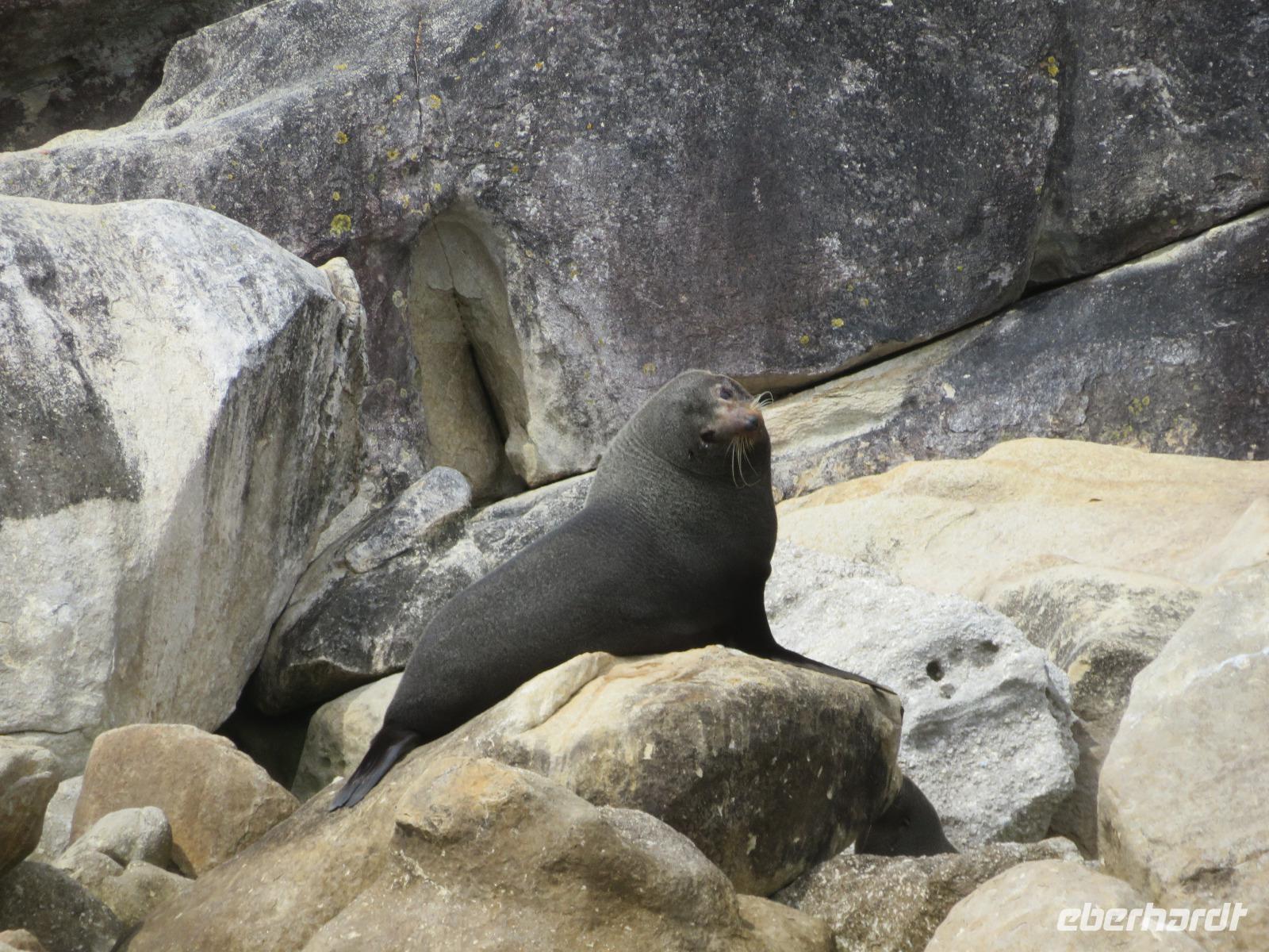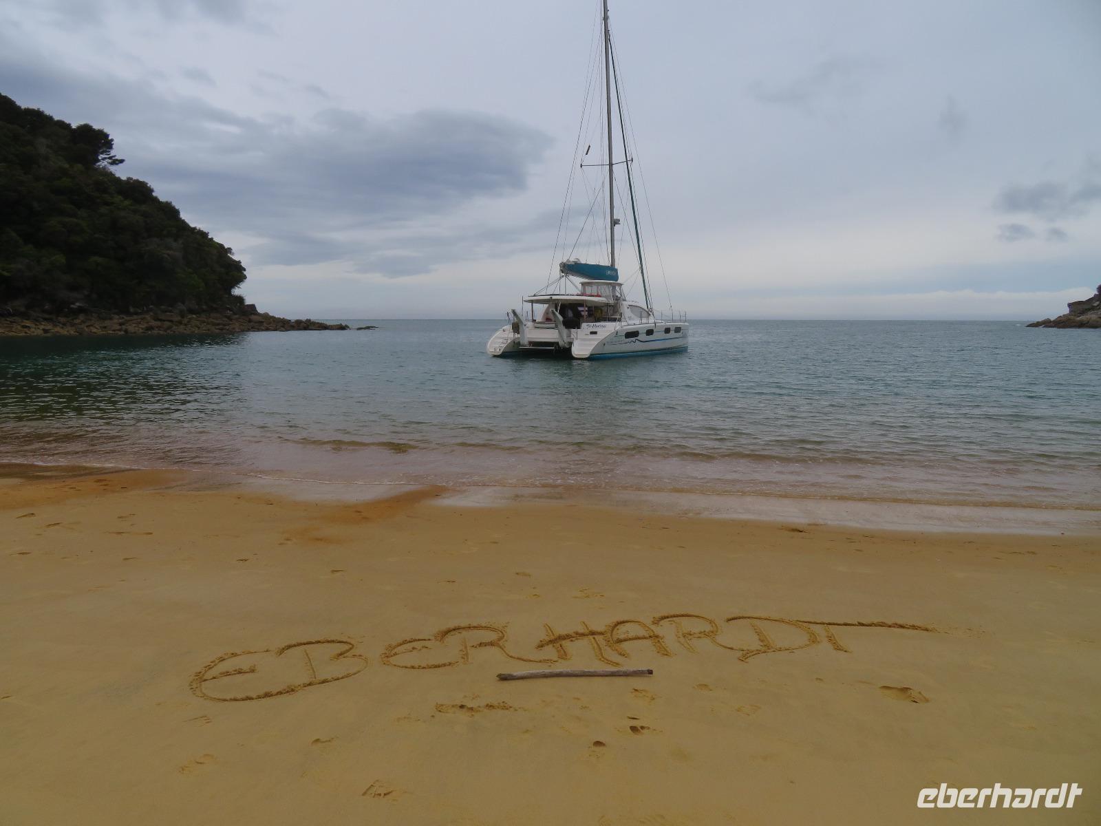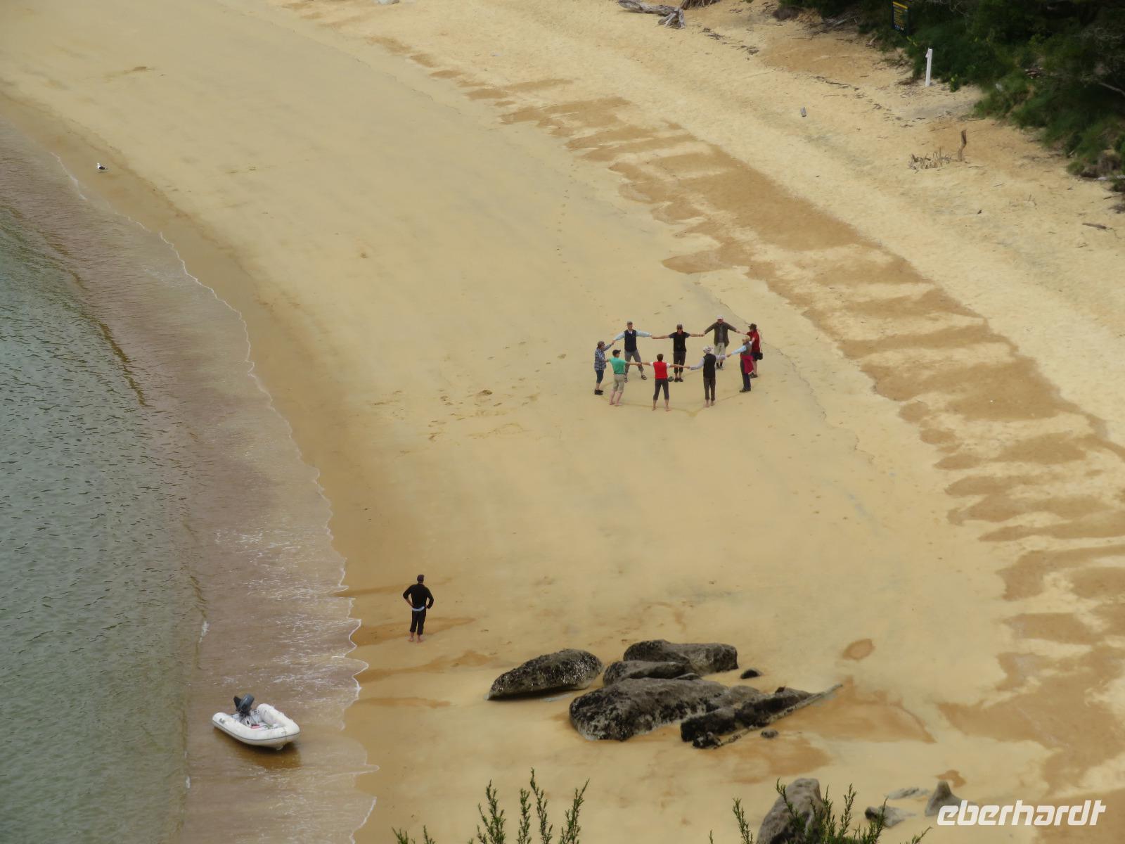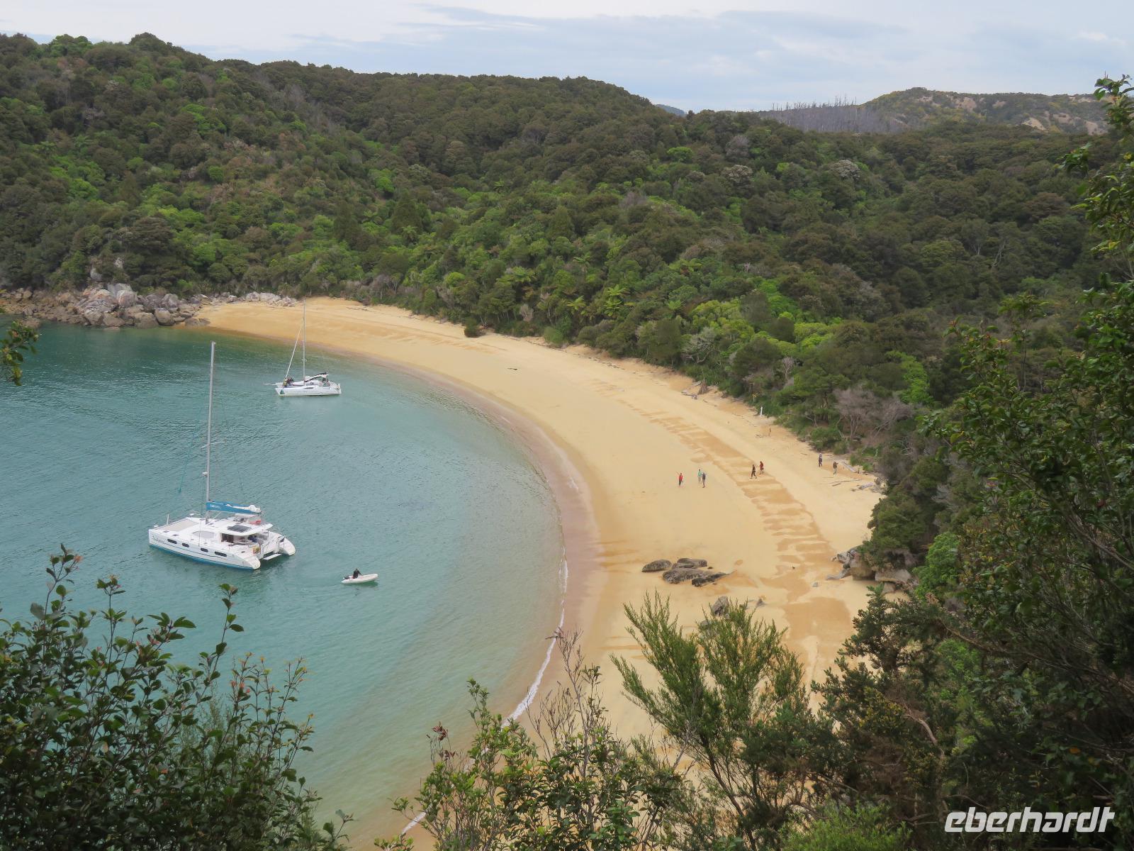 Leider soll es das Wetter heute nicht besonders gut mit uns meinen. Obwohl der Vormittag noch recht freundlich beginnt, bleibt es leider bewölkt und etwas frisch. Packen wir also besser noch eine zusätzliche Jacke ein, man weiß ja nie. Mit dem Bus fahren wir eine gute Stunde bis nach Kaiterteri, schon hier sehen wir die tolle goldene Farbe des Sandes an den Stränden. Martin, unser Skipper wartet bereits auf uns in der Nähe und in kleinen Gruppen setzen wir mit dem Beiboot zum großen Katamaran über. Bevor wir starten, richten wir uns häuslich ein, machen es uns gemütlich und lauschen den Sicherheitsregel, die an Bord gelten. Und dann geht's los - Martin wirft den Motor an und unsere Entspannungsphase an Bord kann beginnen. Unsere Route folgt zunächst entlang der Küste zum Split Apple Rock, dem Felsen der wie ein aufgeschnittener Apfel aussieht. Von dort steuern wir die Naturschutzinsel Adele Island an und werden vom Konzert der Vögel begrüßt. Zeit für einen Tee bzw. Kaffee und ein paar Kekse - weiter zur Seebären-Kolonie, ein paar wenige haben sich heute sogar dazu bereit erklärt für unsere Kameras anwesend zu sein. Weiter nördlich in der Te Pukatea Bucht werfen wir den Anker aus. Wir gehen an Land und unternehmen einen Spaziergang zu einem Aussichtspunkt über die Bucht. Sogar die Sonne lässt sich jetzt mal kurz sehen und so wird der anschließende Aufenthalt unten am Strand zu einem echten Highlight. Ob nun Wassertreten, Muscheln sammeln oder Motive für die Kamera suchen, eigentlich würden wir gern hierbleiben - oder?
