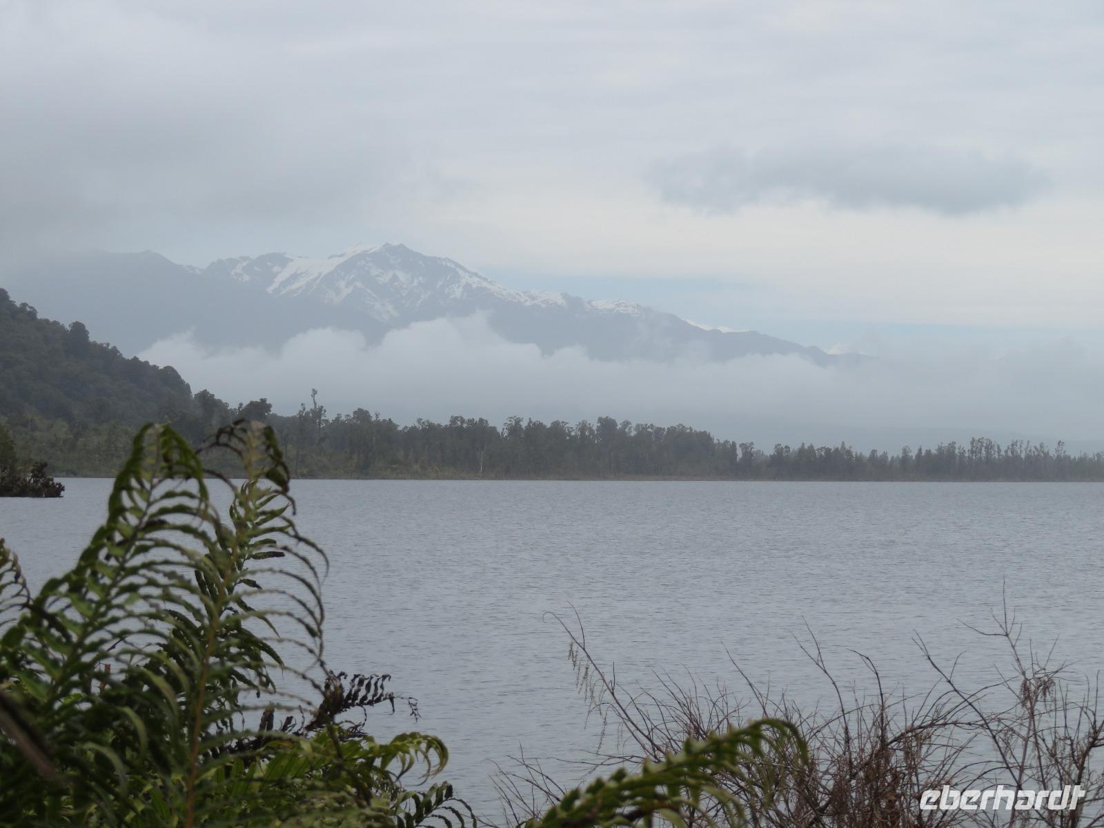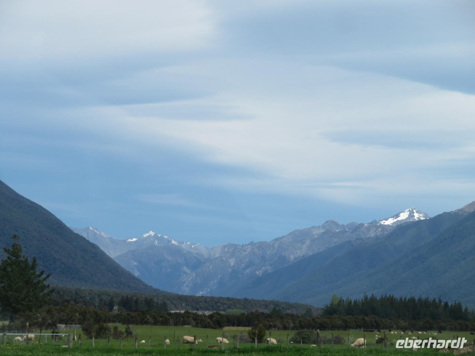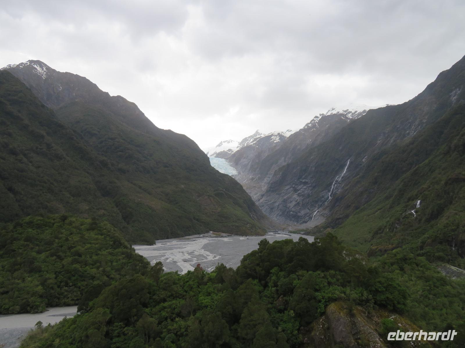 Zurück auf dem Boden, jedoch noch leicht wankend vor Freude, fahren wir gemeinsam weiter um einen Blick auf den Franz Josef Gletscher zu werfen. Auf dem Weg passieren wir eine Brücke, die über den Gletscher Fluss führt, das Wasser ist verdächtig hoch. Wir sehen dann auch etwas weiter eine neue Straßenaufschüttung - scheinbar hat es hier in den letzten Tagen ordentlich geregnet. Ein kurzes Stück durch den Busch und schon sind wir auf einer Aussichtsplattform, die uns einen Blick übers Tal bis hin zum Gletscher ermöglicht. Bernd erzählt uns hier, wie dieser Teil Neuseelands wirklich entstanden ist, denn natürlich gibt es auch für diese Gletscher eine Legende... eine wundervolle aber auch traurige Liebesgeschichte, deren Tränen am Ende den Franz Josef und den Fox Gletscher hervorgebracht hat. Bevor nun auch der Himmel wieder anfängt Tränen zu verlieren nehmen wir die letzten kurvenreichen Kilometer in Angriff und erreichen schließlich die Ortschaft Fox und unsere Unterkunft am Fuße der Berge. Zum Abendessen führt uns Bernd wieder einmal in ein tolles Café-Restaurant am Lake Matheson aus.