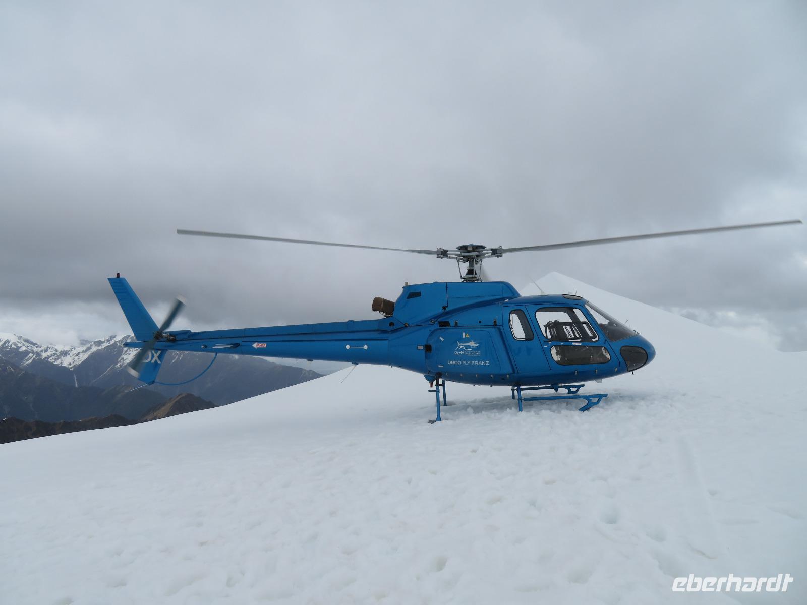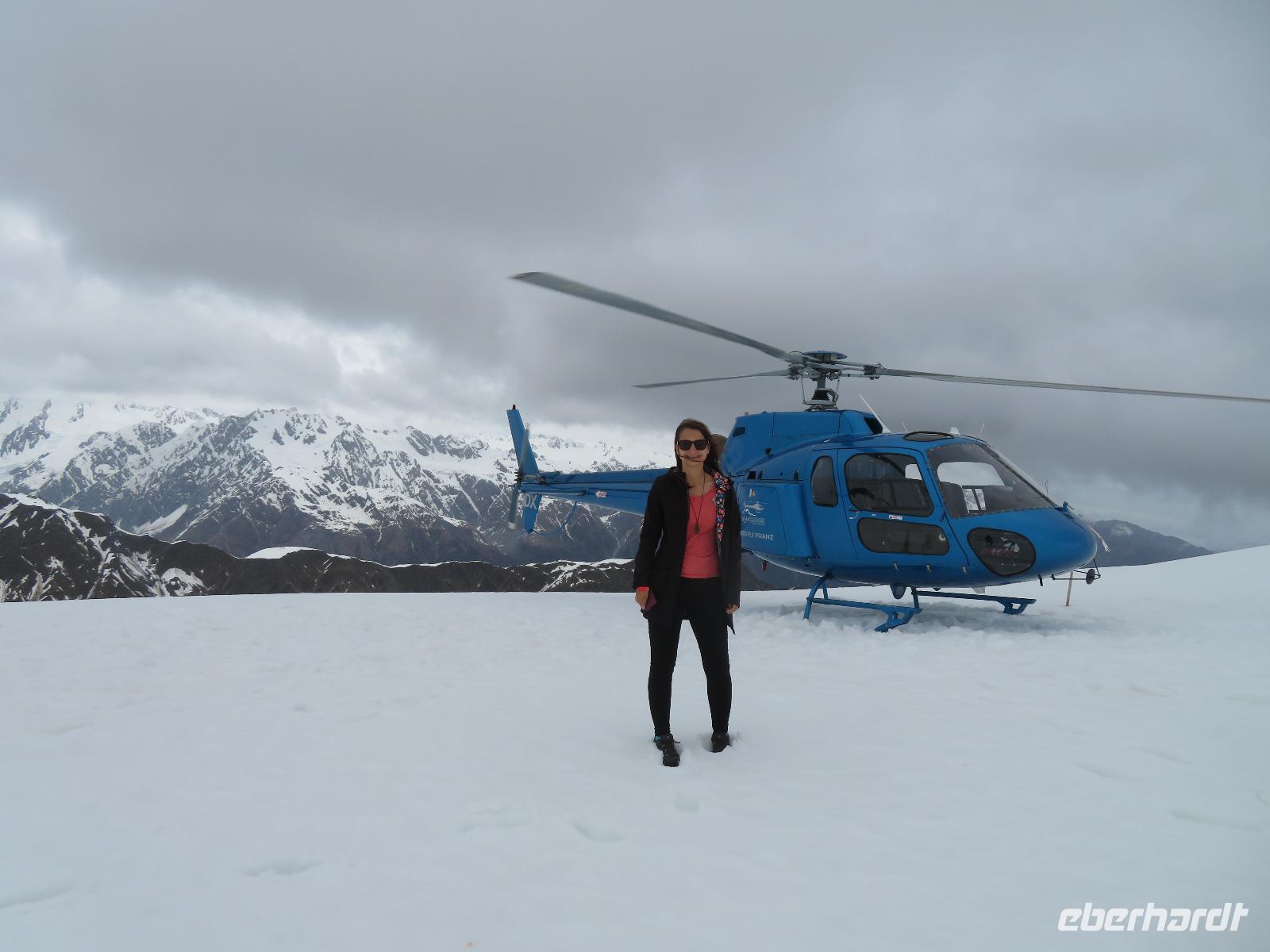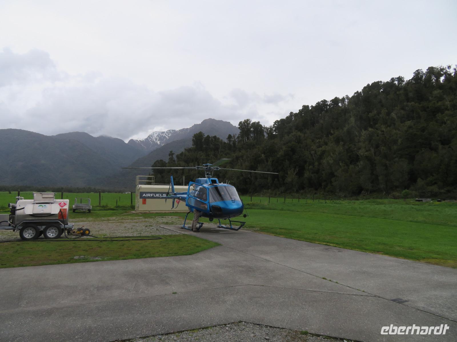 Wer hätte es gedacht, es regnet immer noch etwas - na bloß gut, dass unser Bus kein Loch im Dach hat... Erstes Ziel heute: Hokitika - das Zentrum der Jade. Der wertvolle grüne Stein - Pounamu, kommt in vielen verschiedenen Farbvarianten vor. In einer Jadefabrik erklärt uns Bernd zunächst alles Wichtige rund ums Thema. Wir sehen sogar den Künstlern bei der Arbeit zu und haben eine große Auswahl um uns ein eigenes kleines Schmuckstück auszusuchen. Zurück im Bus fahren wir weiter den Südalpen entgegen. Sie sollten bei gutem Wetter sogar sichtbar auf unserer linken Seite sein, doch im Moment ist alles einheitlich grau. Wir durchfahren die Städtchen Ross, eine alte Goldgräberstadt und bekannt durch den Fund des größten Goldnuggets der südlichen Hemisphere und Hari Hari, eine Kleinstadt am Rande des Nationalparks. Am Lake Ianthe sehen wir endlich etwas Südalpenformation, der graue Schleier lichtet sich so langsam. Gegen Mittag erreichen wir dann die Ortschaft Franz Josef. Wir haben auch noch Glück heute - die Helikopter fliegen - das lassen wir uns natürlich auch nicht entgehen. In zwei Gruppen geht's hinauf - über den dichten Regenwald mit Blick zur Tasmanischen See auf der einen Seite und die raue Berg- und Gletscherwelt auf der anderen Seite. Die Sicht ist hervorragend und beim zweiten Flug sogar optimal um auf einem Schneefeld zu landen. Wahnsinn. Spektakulär!