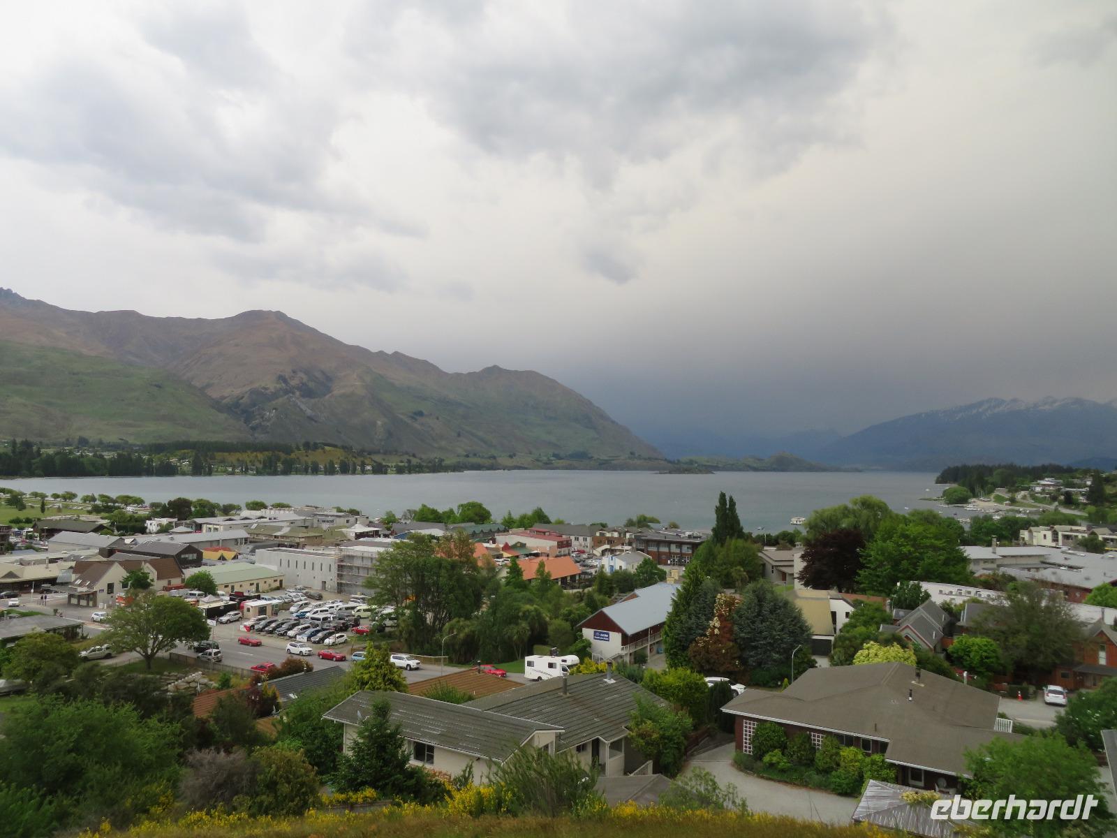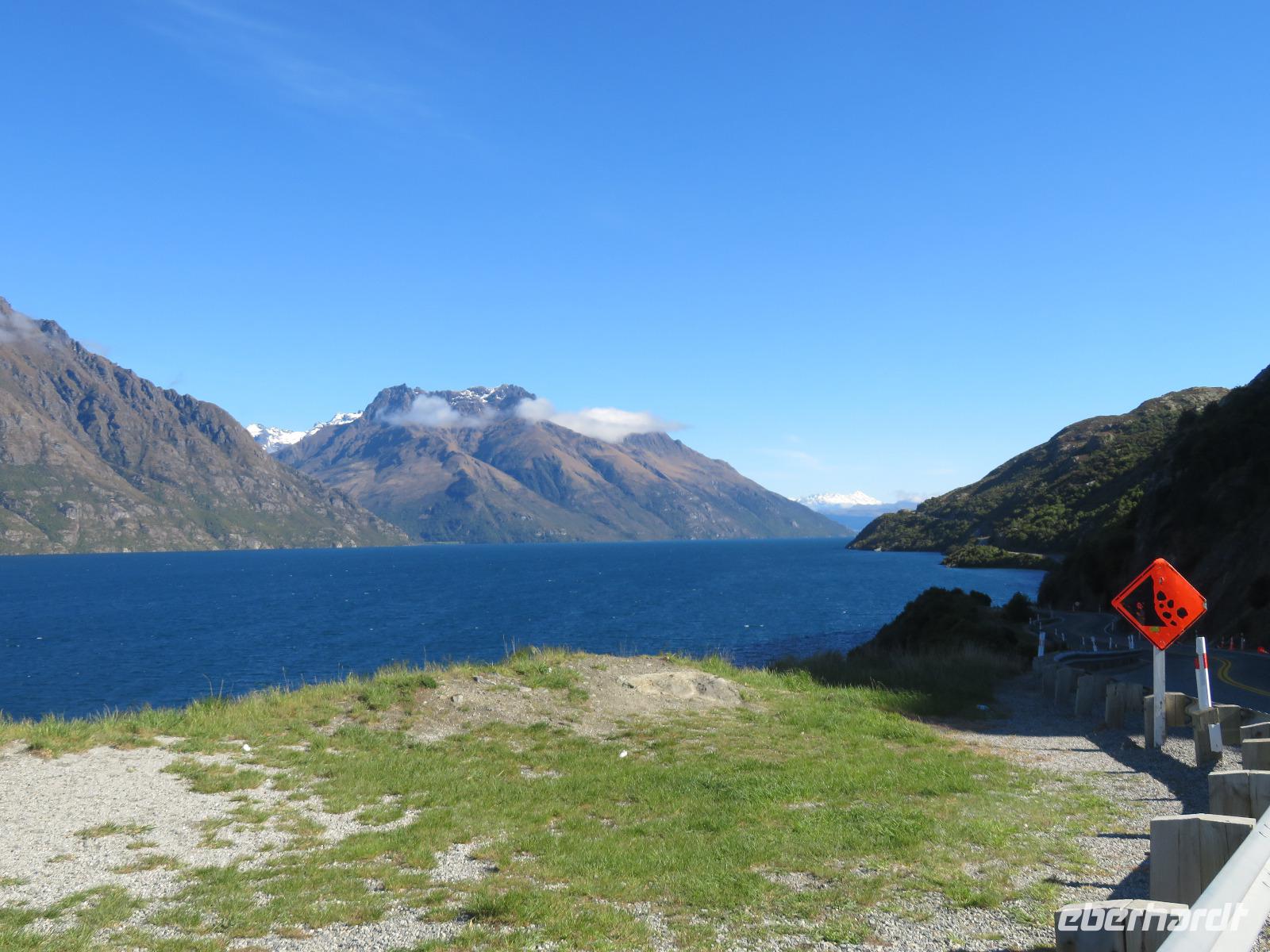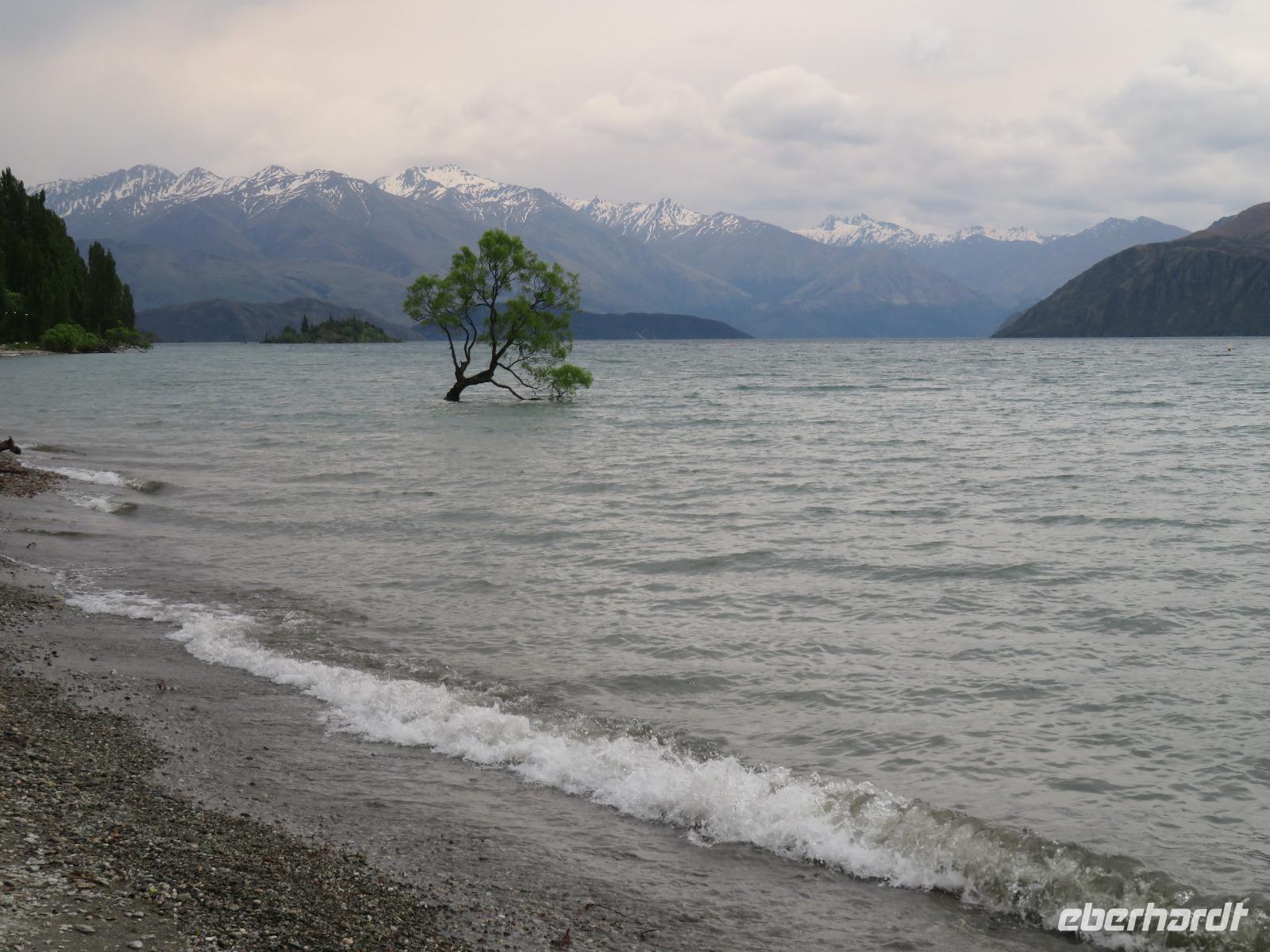 Keine Sonne - okay, wir glauben ja nun mittlerweile, dass die Westküste die regenreichste Region Neuseelands ist... Wir setzten unsere Reise also wieder einmal fort, laut Bernd uns unseren Wetterbrichten der Handys, wird's Wetter besser... Wir folgen, wie einst die Maori, dem Haast River vorbei an den Thunder Creek Falls und über den Haast-Pass auf die andere Seite der Südalpen. Mit nur 562 Metern Höhe ist der Alpenpass nicht unbedingt hoch, gilt aber als Wetterscheide und beschert von jetzt auf gleich einen Vegetationswechsel vom Regenwald zum Südbuchenwald. Wir verlassen das Gebiet der Westküste und gelangen nach Otago. Hier ist es eigentlich eher trocken, doch selbst hier haben die Bachläufe Hochwasser und von den Berghängen rennen die Wasserfälle hinunter. In Makarora halten wir für unsere Mittagspause an einem kleinen Straßencafé. Schließlich erreichen wir den See Wanaka, entlang seines Ufers schlängelt sich die Straße noch ein paar Kilometer. Wir halten noch ein paar Mal an geeigneten Aussichtspunkten, bevor wir den Ort Wanaka erreichen. Hier steht der wohl zweitberühmteste Baum Neuseelands, neben Tane Mahuta auf der Nordinsel. Der Wanaka-Tree steht mitten im See und gilt als eines der beliebtesten Fotomotive. Am Abend verwöhnt uns Bernd auf die einzig-wahre Kiwiart - es gibt ein BBQ. In lustiger Runde und guter Stimmung schmeckt es doch immer besonders gut, nicht wahr? Danke, Bernd!