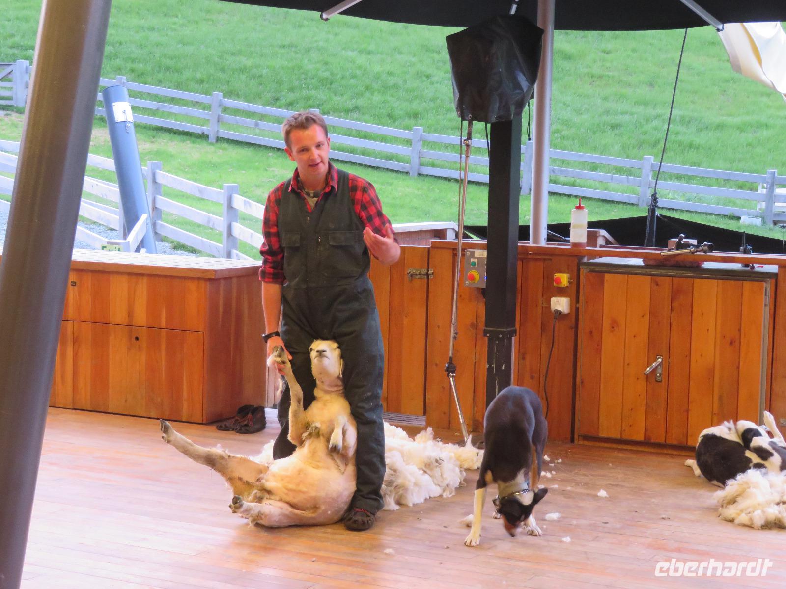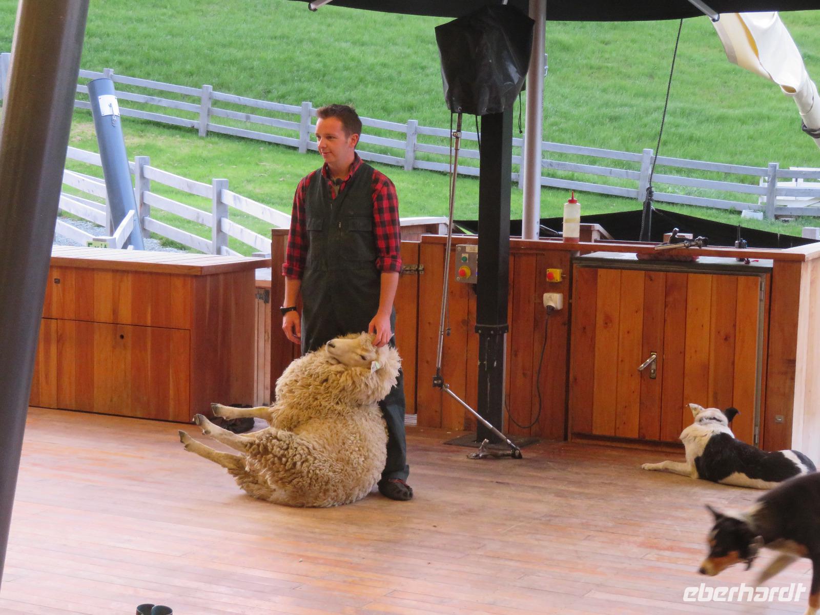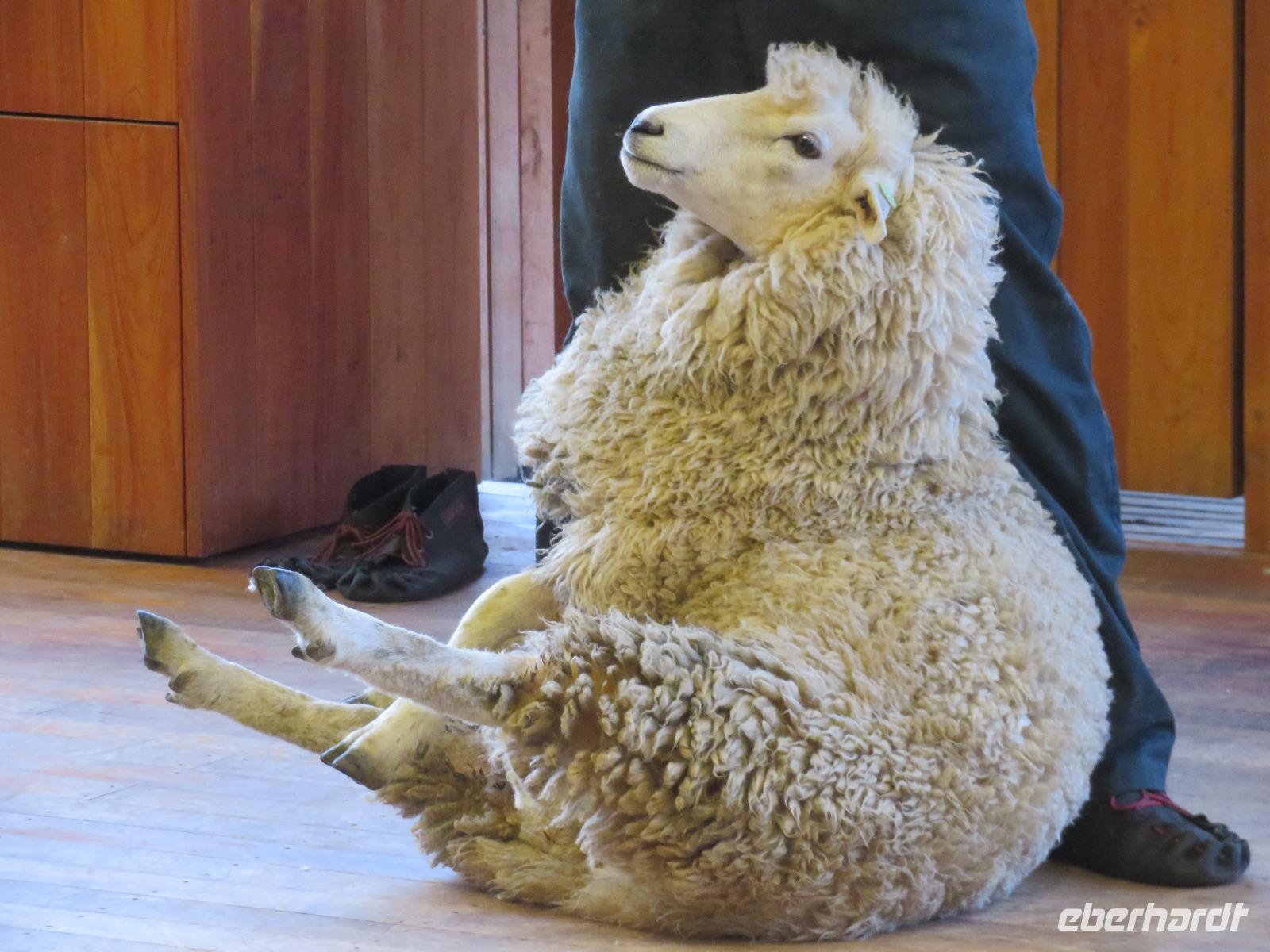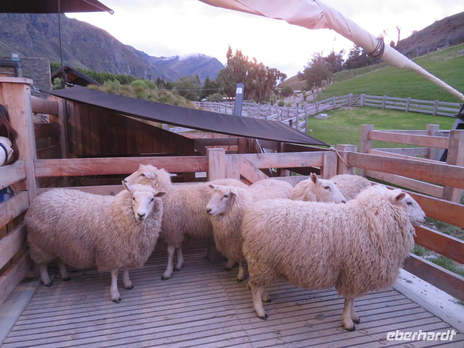 Es ist heute überhaupt nicht weit bis zu unserem Tagesziel. Leider regnet es schon wieder, oder immer noch? Jedenfalls richten wir einen zusätzlichen Stopp auf dem Weg ein. Über die sogenannte Cardrona Range erreichen wir bald die dortige Boutique Destillerie. Bei einem Tasting dürfen wir uns die edlen Tropfen einmal genauer anschauen und genießen die entspannte uns warme Atmosphäre im Familienbetrieb. Nun aber weiter - wir brauchen ja schließlich noch mehr - Wolle zum Beispiel ;-) und welcher Ort wäre dafür nicht besser geeignet als Arrowtown? Die kleine Goldgräberstadt hat heute noch einen tollen Charme und lädt in seinen zahlreichen Cafés und Restaurants zum Verweilen ein. Wir sind rechtzeitig in Queenstown - das Wetter wird besser und sogar der blaue Himmel lässt sich sehen. Nach dem Check-In im Hotel bringt uns Bernd bis zur Gondelstation. Wir fahren zusammen auf den Bobs Peak, von hier haben wir eine tolle Sicht über die Stadt und den See Wakatipu. Anschließend spazieren wir noch eine Runde durch die Fußgängerzone um schließlich am Abend an Bord der TSS Earnslaw zu gehen. Im Jahr 1912 hatte das Dampfschiff seine Jungfernfahrt und gilt damit als ältestes, dampfbetriebenes Binnenschiff der südlichen Hemisphäre. Ziel der Fahrt ist die Walter Peak Station auf der gegenüberliegenden Seeseite, sie ist eine der ältesten und größten Schaffarmen Neuseelands. Hier schlemmen wir nach Herzenslust vom Gourmet-BBQ-Buffet und lassen uns anschließend zeigen, wie ein Schaf geschoren und wie mit Hilfe der Hütehunde die Herde kontrolliert wird.