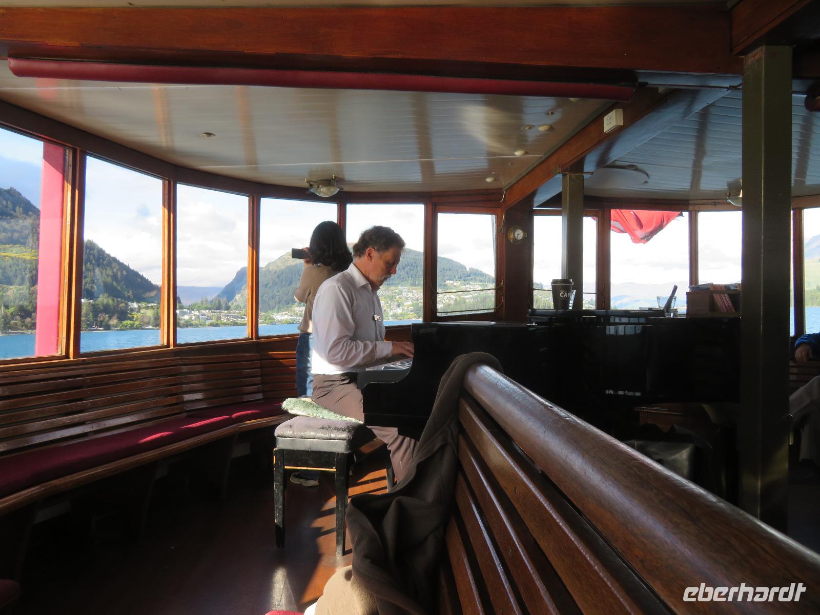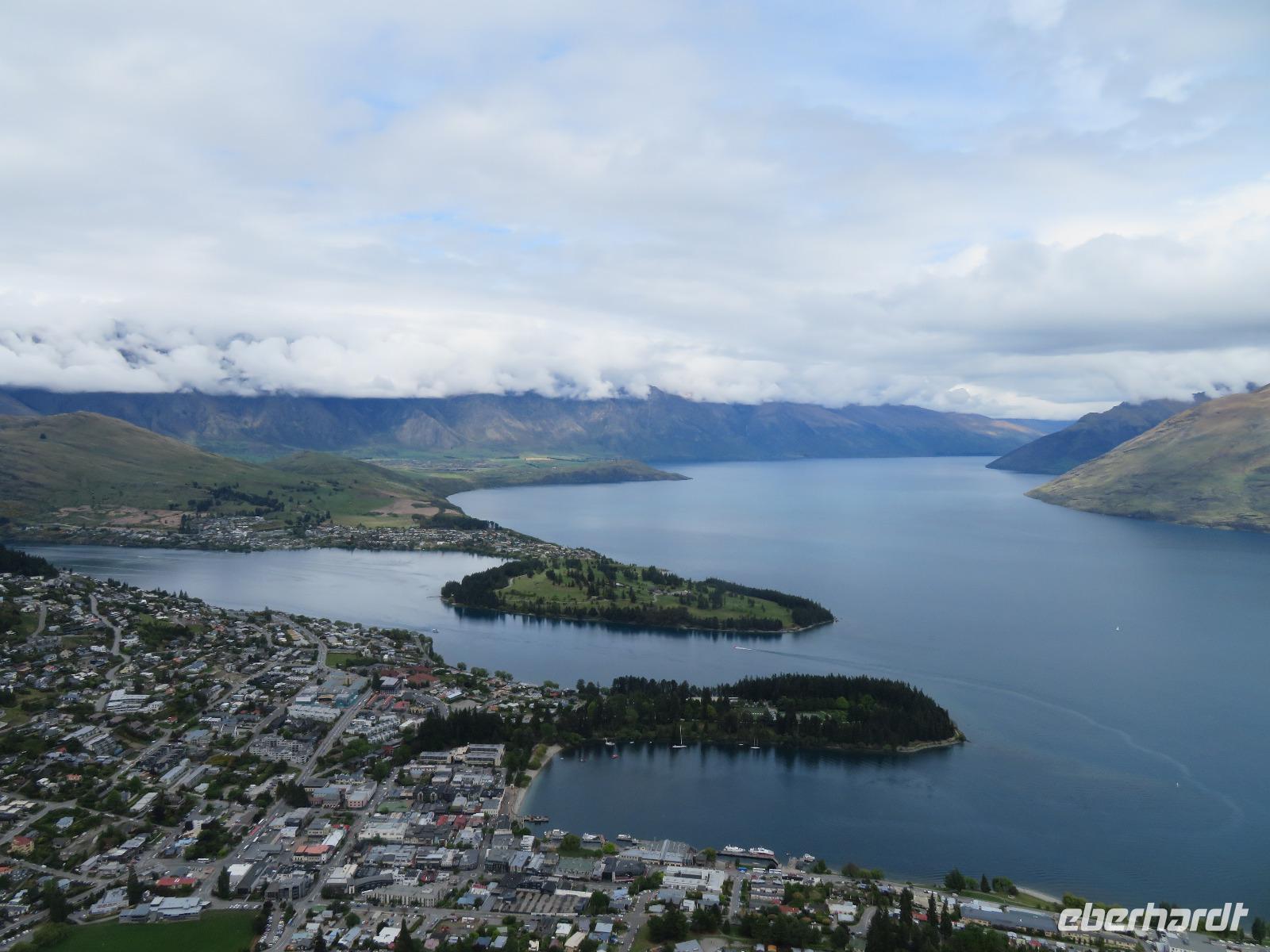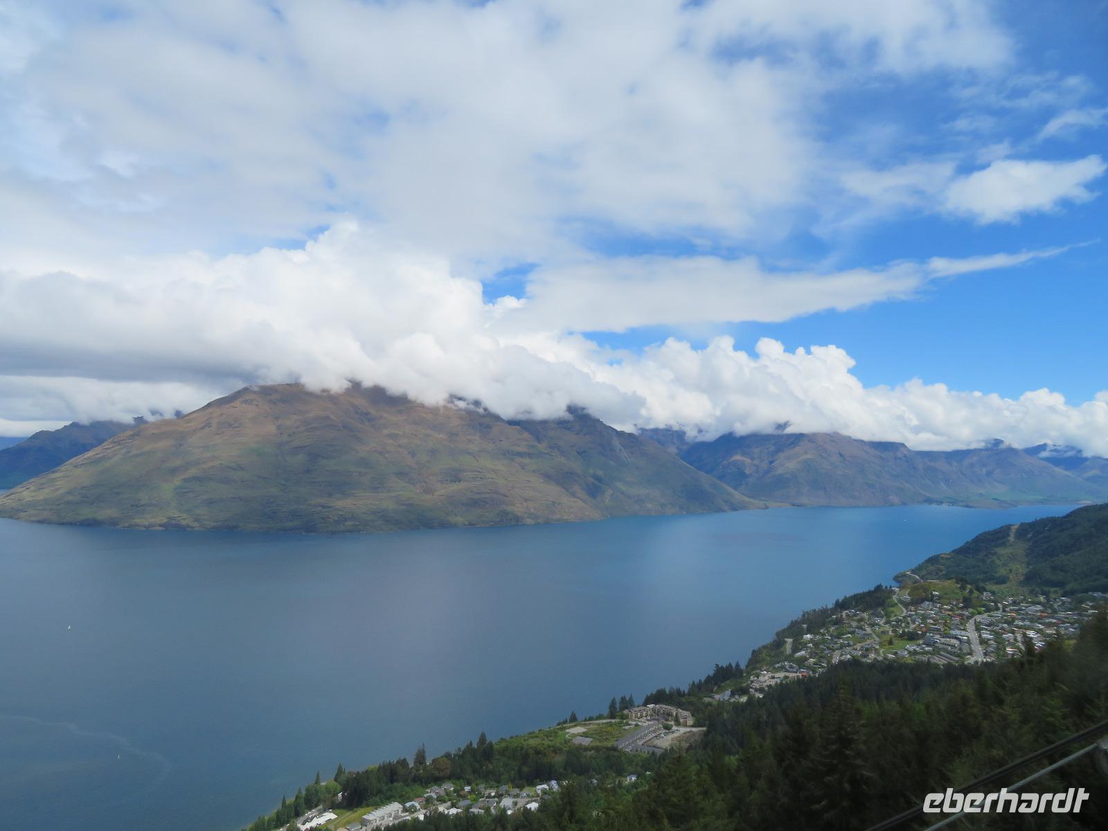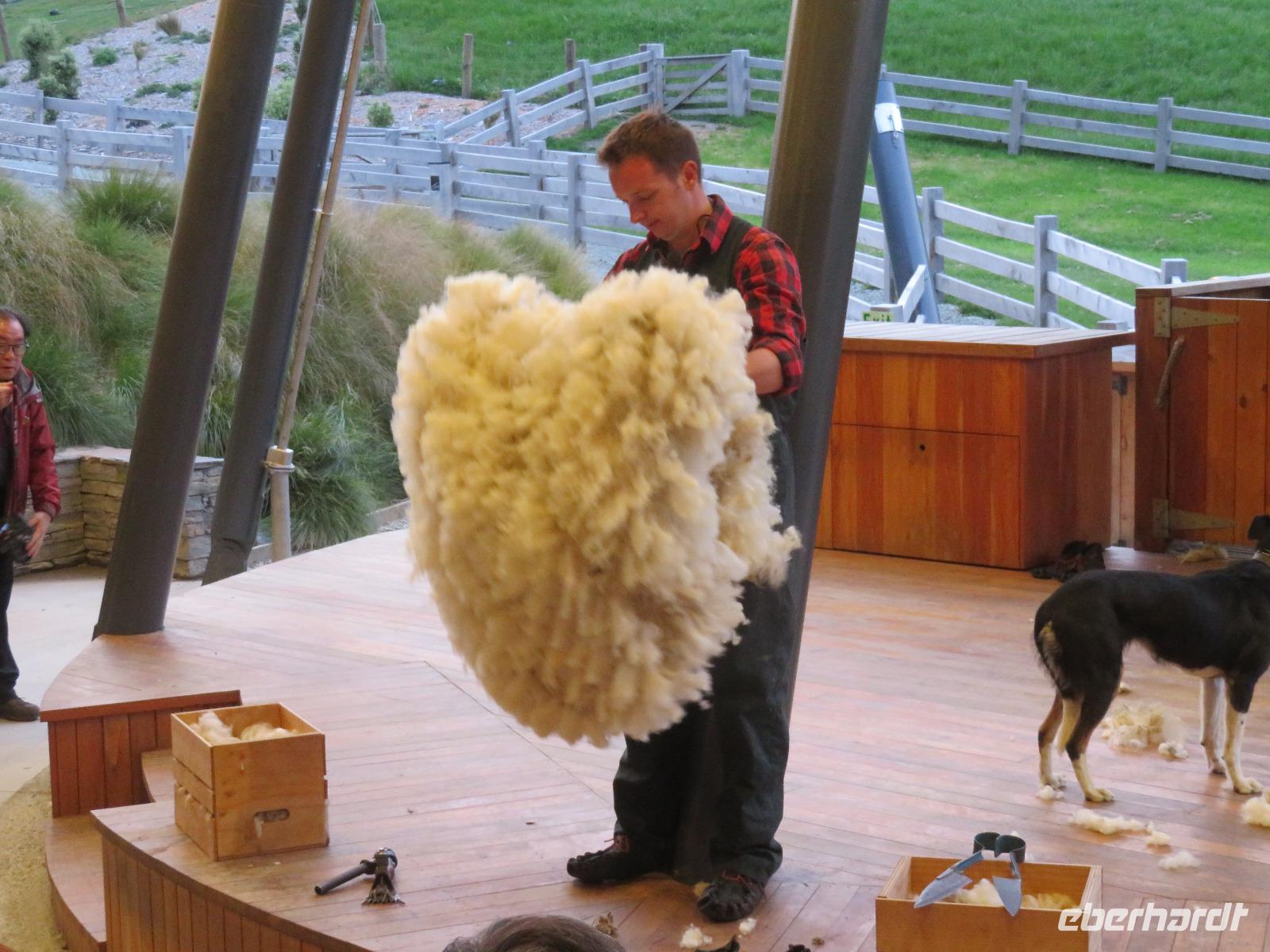 Es ist heute überhaupt nicht weit bis zu unserem Tagesziel. Leider regnet es schon wieder, oder immer noch? Jedenfalls richten wir einen zusätzlichen Stopp auf dem Weg ein. Über die sogenannte Cardrona Range erreichen wir bald die dortige Boutique Destillerie. Bei einem Tasting dürfen wir uns die edlen Tropfen einmal genauer anschauen und genießen die entspannte uns warme Atmosphäre im Familienbetrieb. Nun aber weiter - wir brauchen ja schließlich noch mehr - Wolle zum Beispiel ;-) und welcher Ort wäre dafür nicht besser geeignet als Arrowtown? Die kleine Goldgräberstadt hat heute noch einen tollen Charme und lädt in seinen zahlreichen Cafés und Restaurants zum Verweilen ein. Wir sind rechtzeitig in Queenstown - das Wetter wird besser und sogar der blaue Himmel lässt sich sehen. Nach dem Check-In im Hotel bringt uns Bernd bis zur Gondelstation. Wir fahren zusammen auf den Bobs Peak, von hier haben wir eine tolle Sicht über die Stadt und den See Wakatipu. Anschließend spazieren wir noch eine Runde durch die Fußgängerzone um schließlich am Abend an Bord der TSS Earnslaw zu gehen. Im Jahr 1912 hatte das Dampfschiff seine Jungfernfahrt und gilt damit als ältestes, dampfbetriebenes Binnenschiff der südlichen Hemisphäre. Ziel der Fahrt ist die Walter Peak Station auf der gegenüberliegenden Seeseite, sie ist eine der ältesten und größten Schaffarmen Neuseelands. Hier schlemmen wir nach Herzenslust vom Gourmet-BBQ-Buffet und lassen uns anschließend zeigen, wie ein Schaf geschoren und wie mit Hilfe der Hütehunde die Herde kontrolliert wird.