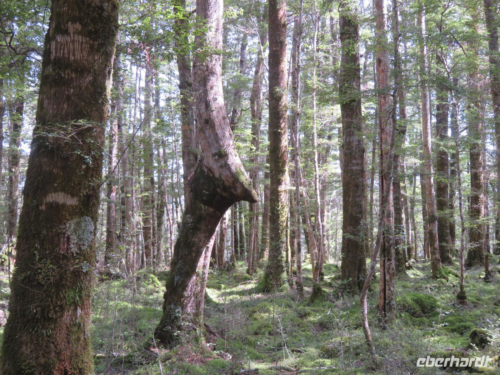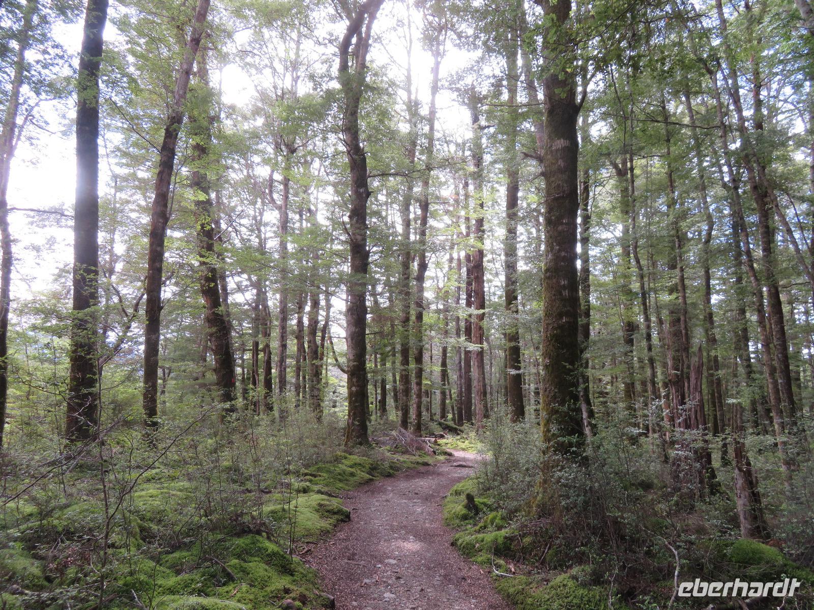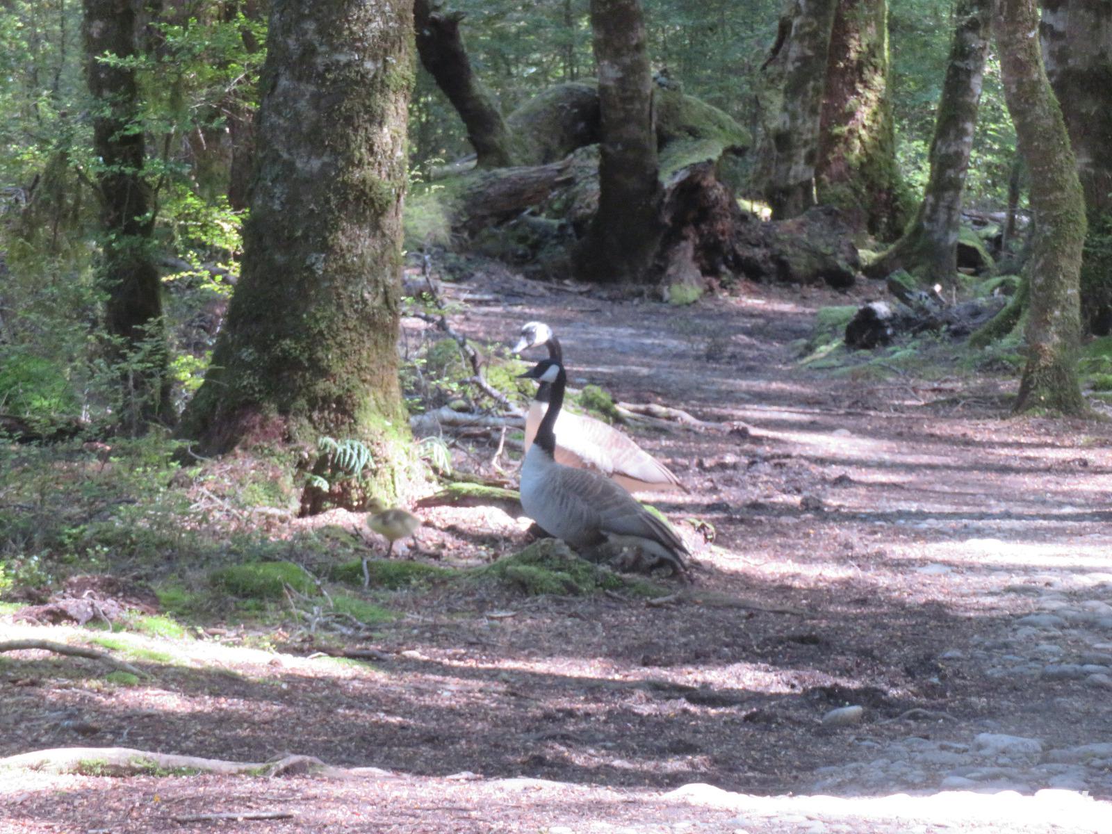 Nach mehreren Stopps, bei Kingston und Mossburn erreichen wir um die Mittagszeit Te Anau. Wir organisieren uns einen Snack, ob im Supermarkt oder im Café und sind gestärkt für unsere kleine Wanderung entlang des Kepler Tracks. Der Track selbst ist eine drei- bis vier-tägige Rundwanderung. Unser Startpunkt ist Rainbow Reach und als erste Hürde steht die Überquerung einer Hängebrücke auf dem Plan. Erfolgreich geschafft folgen wir dem Waiau Fluss ein ganzes Stück in den Wald hinein. Nichtsahnend kommt uns eine kleine Familie Wildgänse entgegen, ordentlich im Gänsemarsch, das Küken immer im Blick. Der Wald ist sehr lichtdurchflutet und „aufgeräumt", im Vergleich zu den anderen Spaziergängen. Während der Wanderung verändert sich die Vegetation immer wieder, von Farnen soweit das Auge sehen kann, bis zu mit Moosen überwachsenen Stämmen der Südbuchen. Nach einer kleinen Stärkung in Form von Schokolade und Blubberwasser ist der Rückweg gar nicht mehr so weit. Zurück in Te Anau beziehen wir schließlich unser Motel und treffen uns wenig später zum Abendessen und anschließendem Ausflug zu den Glühwürmchen. Mit einem modernen und schnellen Katamaran fahren wir über den Lake Te Anau. Am Steg gehen wir dann zu einem uns zugewiesenen Guide. Er bringt uns in die Höhlen, eine tolle unterirdische Welt mit unterirdischem Fluss und vielen Wasserfällen. Mit einem kleinen Boot fahren dann in die Grotte, es ist so dunkel, man kann seinen Nachbarn gar nicht mehr erkennen. Und dann sehen wir nach und nach immer mehr leuchtende Pünktchen an den Felswänden. Am Ende der Tour gibt es noch ein lehrreiches Video über die kleinen besonderen und leuchtenden Würmchen.