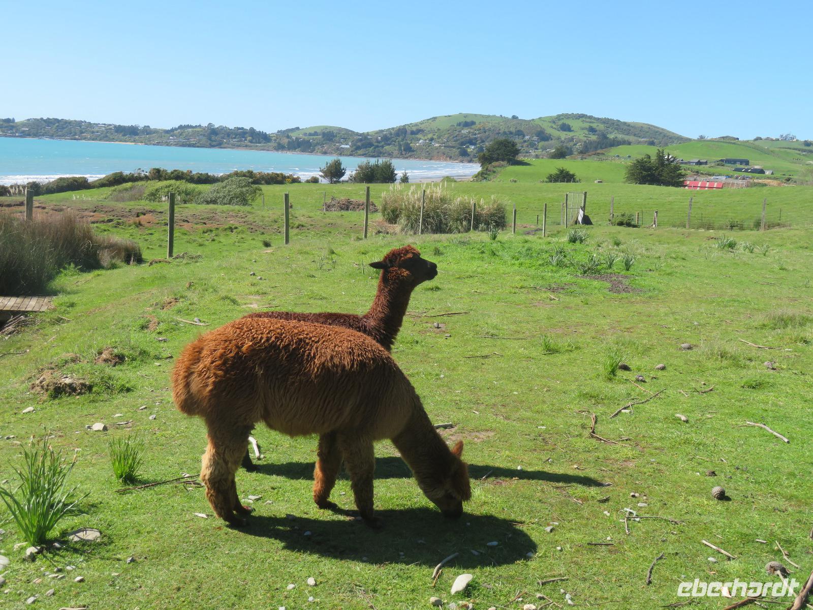 Die Sonne bleibt uns heute Morgen auch noch treu, na endlich! Wir fahren allerdings auch einmal quer durchs Land, bis an die Ostküste nach Dunedin. Besonders auffällig ist heute wieder der Vegetationswechsel und aus den hohen Bergen der Südalpen, werden wieder sanfte grüne rollende Hügel, perfekt für die Schafe. Über die Ortschaften Gore und Milton erreichen wir dann im Laufe des Nachmittages Dunedin. Und mit dem Erreichen der Küste, erreicht uns auch wieder der Regen...