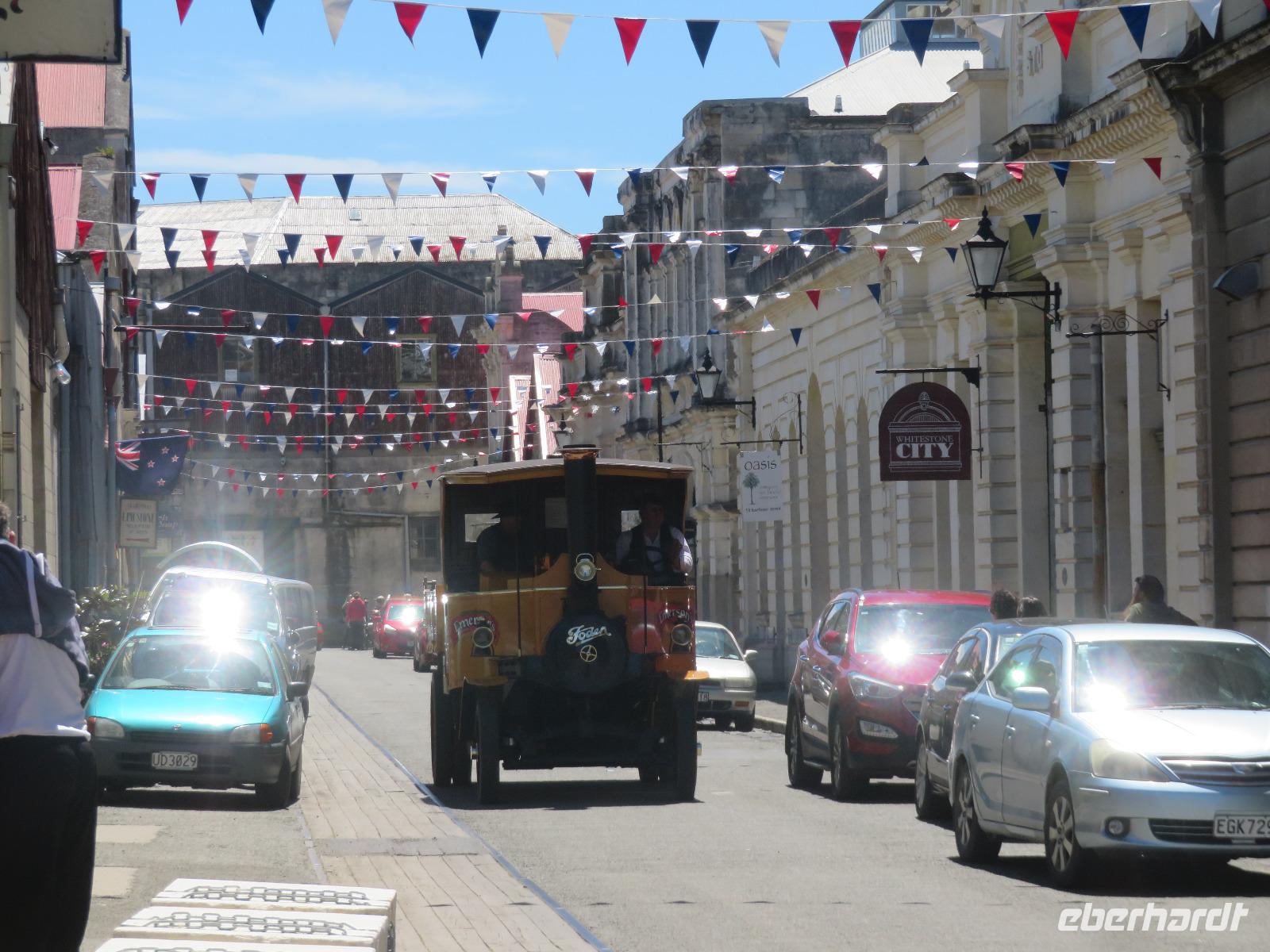 Leider scheint das Wetter über Nacht auch noch schlechte Laune bekommen zu haben, es gewittert. Super schnell und quasi im Fahren laden wir die Koffer in den Bus und springen ins Trockene. Am Ende der Sackgasse wirkt es etwas freundlicher, gut, dass wir heute wieder gen Küste fahren und das ungemütliche Bergwetter hinter uns lassen. Einen Stopp am Lake Tekapo legen wir noch ein, bevor wir die Mackenzie Ebene verlassen. Hier am Lake Tekapo ist im letzten halben Jahr ein neues Planetarium entstanden, ein riesiges Teleskop soll hier demnächst den Blick in die Sterne ermöglichen. Wir halten noch am „Hotspot", der Kirche des guten Hirten, suchen uns noch ein stilles Örtchen um das perfekte Bild mit blühenden Lupinen und türkisblauen See zu knipsen und dann geht es auch schon wieder weiter. In Geraldine, unserem Ort für die Mittagspause, werden wir festlich empfangen. Auf ins Getummel und mal sehen wie die Kiwis so ihre Feste feiern. Am Nachmittag erreichen wir dann endlich die Banks Peninsula. Die vorher ewige lange gerade Strecke wird durch eine Hügellandschaft ersetzt, über Serpentinen schlängeln wir uns durch die Hügel der Halbinsel und haben wenig später einen tollen Blick in die Bucht von Akaroa. Bernd zeigt uns hier und da noch ein paar tolle Ecken. Überall sieht man hier noch den französischen Einfluss, mittlerweile sind aber außer den Straßen- und vereinzelten Gebäudenamen nicht mehr viel vom Französisch übrig. Am kleinen Leuchtturm gibt's dann noch einen kleinen Umtrunk - auf die Reise, auf die Menschen, die sie zu einem unvergesslichen Erlebnis gemacht haben. Zum Abendessen versammeln wir uns im Bully Hayes zum Abendessen - nur noch ein Tag.