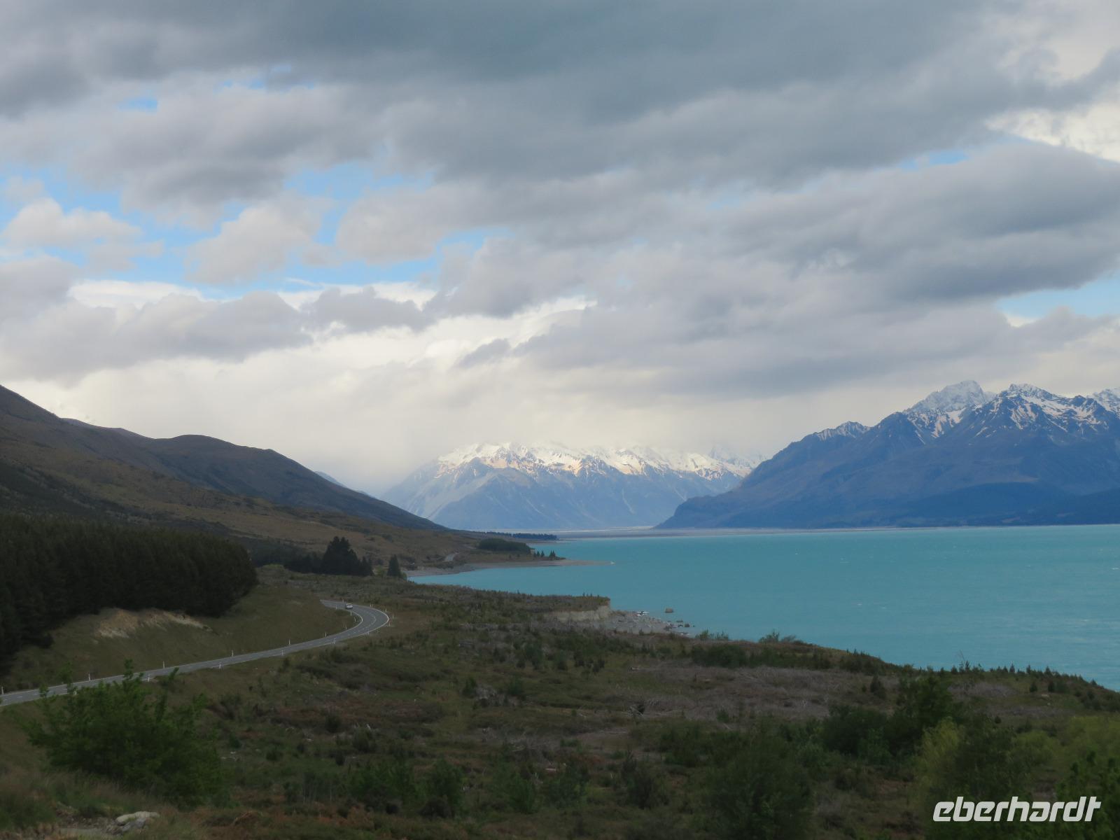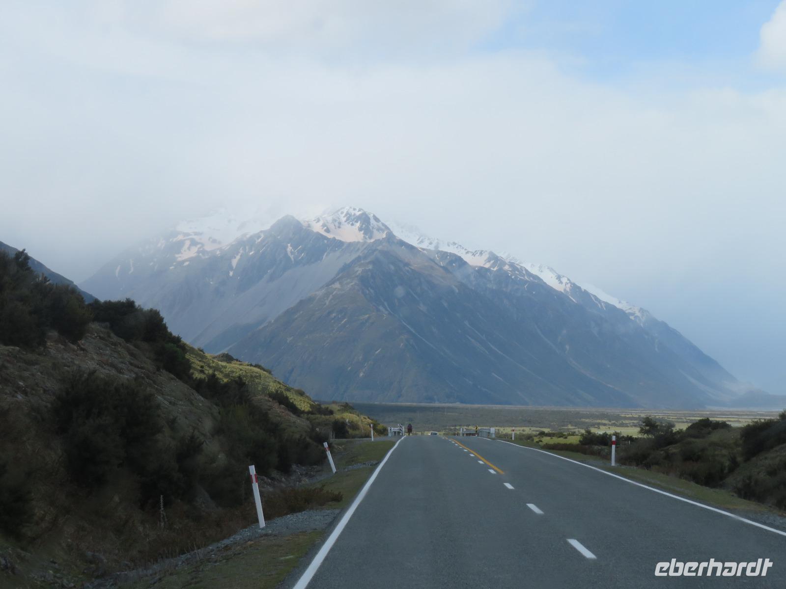 Wir können es kaum glauben, aber die Sonne ist wieder da... Die dicken dunklen Wolken von gestern haben sich verzogen und wir nutzen die Gelegenheit um der Baldwin Street einen Besuch abzustatten. Sie ist die steilste Straße der Welt. Auf dem Weg zu den Moeraki Boulders entdecken wir noch einen eher ungewöhnlichen Besucher aus der Antarktis am Strand, einen Seeleoparden. Bei den Boulders ist allerdings alles sicher, neben den Touristen gibt's mittlerweile niedliche und ungefährliche Alpakas. Da wir auch heute wieder einiges an Kilometern zurücklegen müssen, ziehen wir bald weiter. Nächster Stopp ist die Steampunk-Hochburg Oamaru. Aber nicht nur die verrückten Skulpturen aus „Schrott" sind bemerkenswert, auch die alten viktorianischen Gebäude aus Kalkstein sind einige Fotos wert. Weiter geht es über die Orte Kurow und Omarama, vorbei an den Stauseen des Waitaki Rivers, immer weiter landeinwärts. Die Straße zum Mt. Cook Village ist ebenfalls eine Sackgasse und führt am Ufer des Lake Pukaki entlang. Wir halten an einem Aussichtspunkt, von dem man eigentlich den Mt.Cook bei guter Sicht mit See im Panorama aufnehmen könnte... doch leider hat der Berg heute seinen Kopf mal wieder in den Wolken. Dafür sehen wir immer mal wieder die umliegenden Berge durch die Wolkendecke durchblitzen und erkennen sogar etwas orange auf den Schneehängen - später stellt sich heraus, dass das durch die Buschbrände in Australien kommt. Wir erreichen dann auch bald das Mt. Cook Village und beziehen unsere kleinen Hütten. Am Abend erwartet uns ein mehr als vielseitiges Buffet im Hotel nebenan - schlemmen mit Bergpanorama - zumindest ein bisschen.