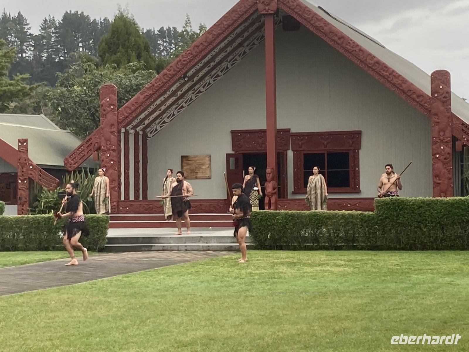 An diesem Tag ging die Fahrt von Tairua weiter nach Rotorua, einem der dichtesten und zugänglichsten Geothermalgebiete der Welt. Die Schulen in Neuseeland haben Schuluniform. Die Kinder werden mit 5 eingeschult und da gibt es eine große Party. Stopp in Waihi, bekannt für Schwarzkohle, Gold und Silber. Aktuell befinden sich noch Arbeiter in der Mine. Hauptsächlich leben Engländer in Waihi. Die neuseeländische Milchwirtschaft ist sehr groß und wichtig. Die Mittagspause legten wir dann in Hobbiton oder auch Matamata ein, ganz in der Nähe wurde der Herr der Ringe gedreht. Wir erreichten Rotorua gegen späten Mittag und übersetzt heißt es großer See. Der Geruch von Schwefel liegt überall in der Luft. Man konnte eine große Statue von der Krone der Queen sehen. Weiter ging es zum Badehaus und an den Lake Rotorua. Am Abend genossen wir das Hangi-Essen. Ein traditionelles Essen der Maori wurde uns dabei vorgesetzt. Das Essen wird dabei in einem Erdofen auf glühenden Steinen gegart. Im Anschluss fragten die Maori ob wir in friedlichen oder bösen Absichten kommen. Dabei musste einer aus einer anderen Gruppe einen Ast mit Blättern aufheben. Wir entschieden uns demzufolge in friedlichen Absichten zu kommen. Danach führten die Maori Tänze auf und sangen traditionelle Lieder. Abschließend betrachteten wir die Geysire, bei der untergehenden Sonne ein tolles Farbenspiel. Die Statuen der Maori haben drei Finger, diese stehen für Geburt, Leben und Tod, manche haben 4 Finger, dieser steht dann für das Leben nach dem Tod.