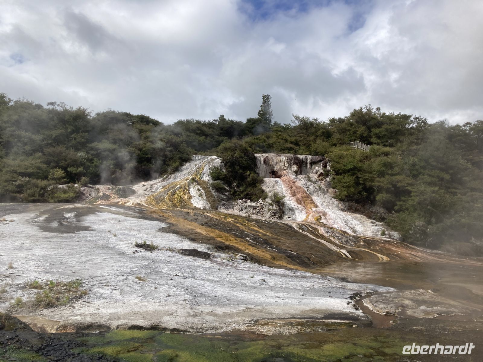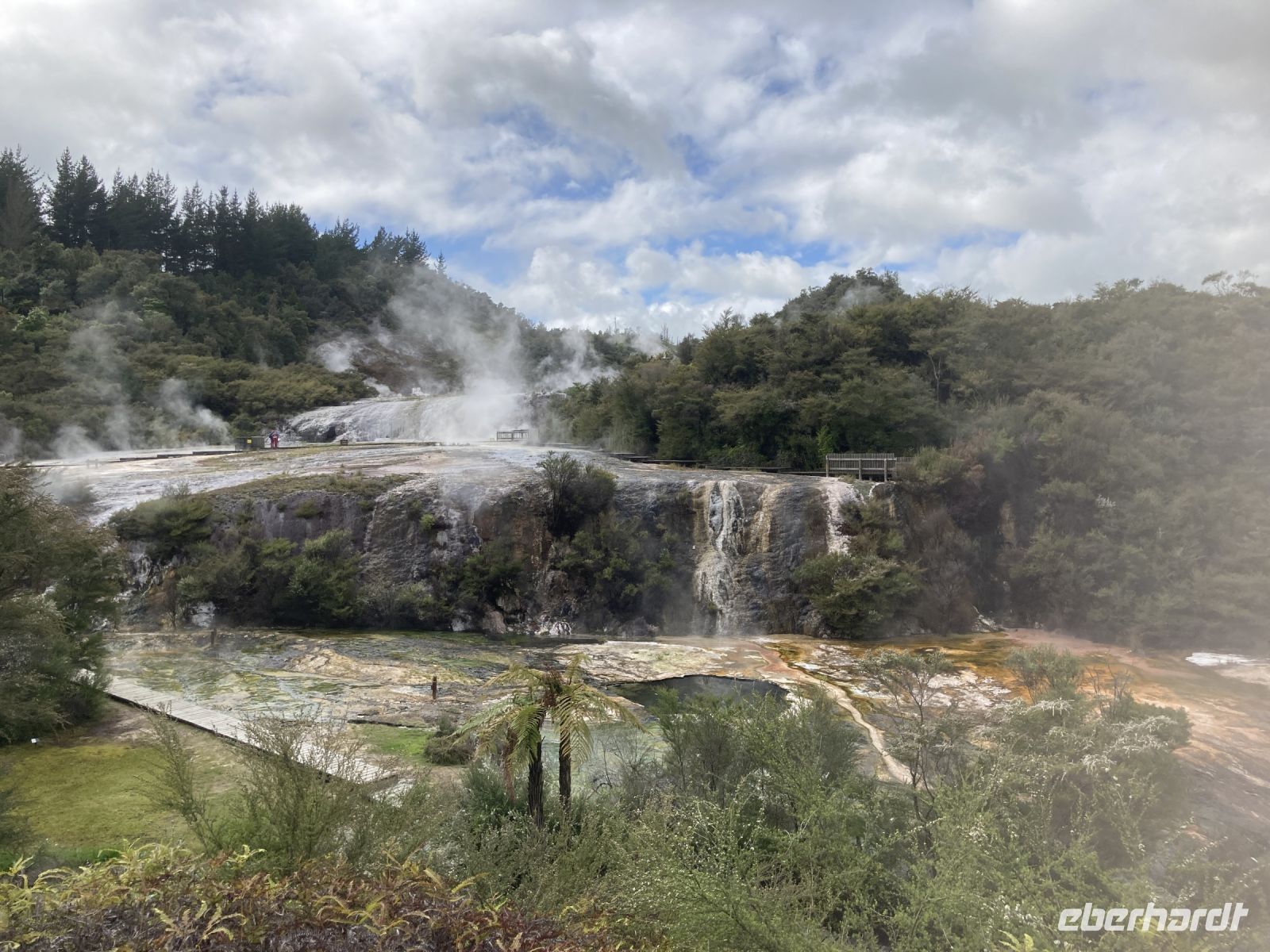 Am heutigen Tag führt die Fahrt uns in den Tongario Nationalpark. Das Hotel ist eines der höchstgelegenen in Neuseeland, es liegt auf 1.442 Metern. Wir stoppten in einem Thermalgebiet Oraki, dort konnten wir viele heiße Quellen, Schlammpools und Geysire beobachten. Nach einer einstündigen Wanderung fuhren wir weiter Richtung Taupo. Die Menschen in Rotorua leben im Vulkankrater und wissen nie, wann der Vulkan wieder explodieren könnte. 1886 war der letzte Vulkanausbruch. Dann kamen wir noch zu den Hukka Falls. 200.000 Liter Wasser strömen hierbei pro Sekunde 9 Meter herunter. Nächster Stopp folgte dann am Lake Taupo und später in Turangi. Dann sahen wir den Tongariro. Im Zentrum des Tongariro-Nationalparks, Neuseelands ältesten Nationalpark, befinden sich drei eindrucksvolle Vulkane: Ruapehu, Ngauruhoe und Tongariro. Gegen späten Nachmittag dann Ankunft im Hotel. Wir übernachteten im Skotel in Whakapapa vor der Kulisse der Feuerberge inmitten herrlicher Natur. In diesem fand im Anschluss auch das Abendessen statt.