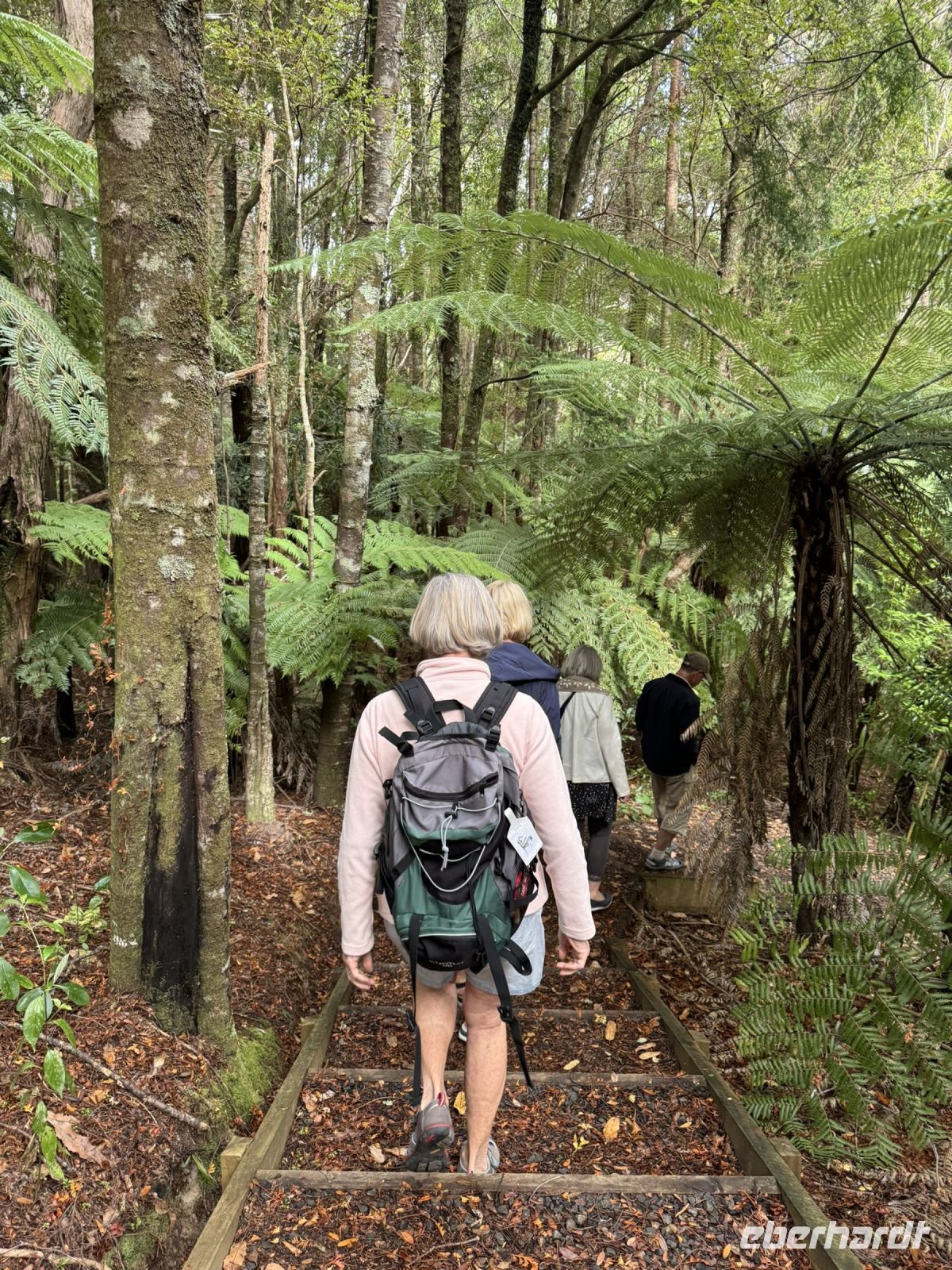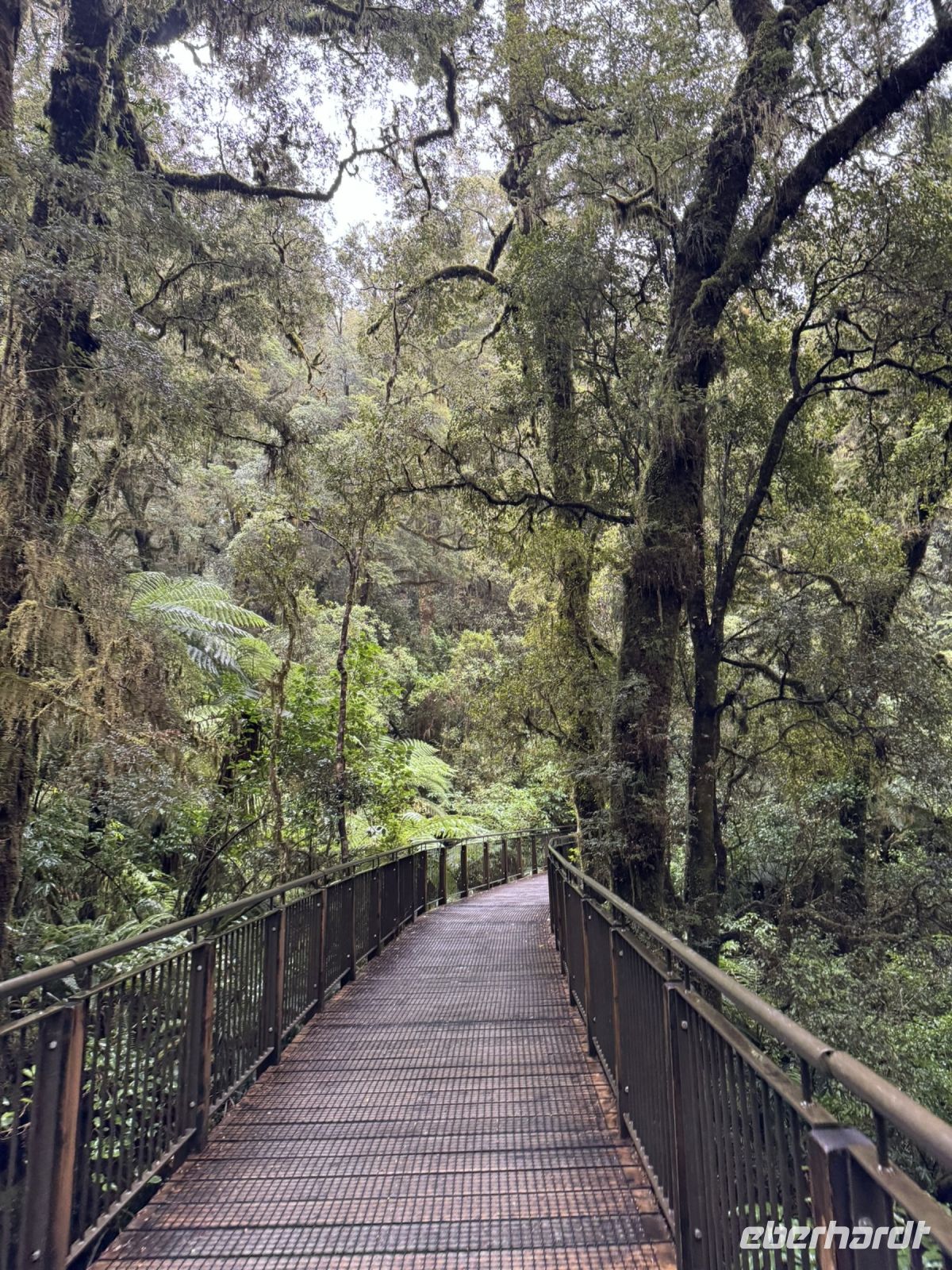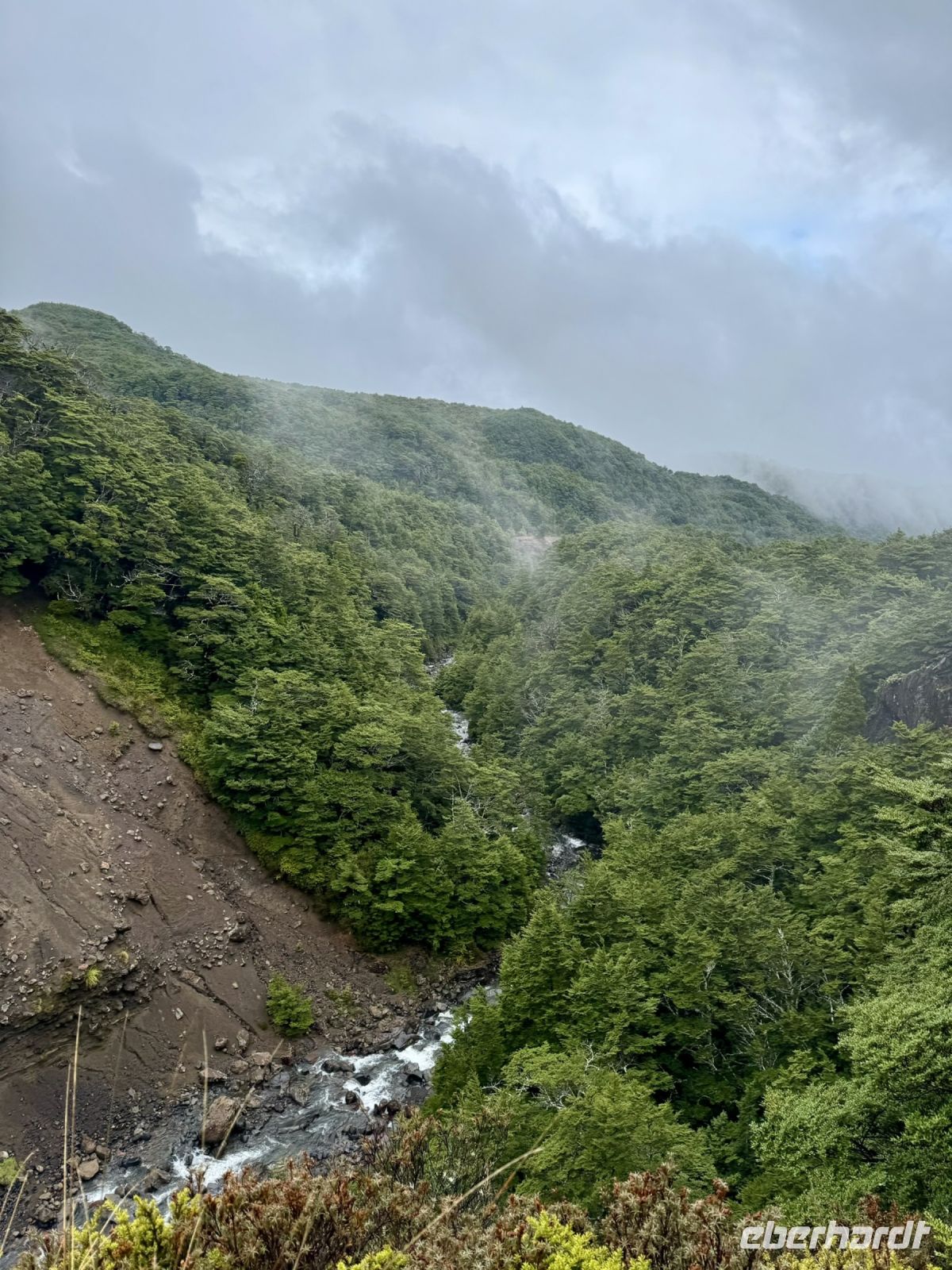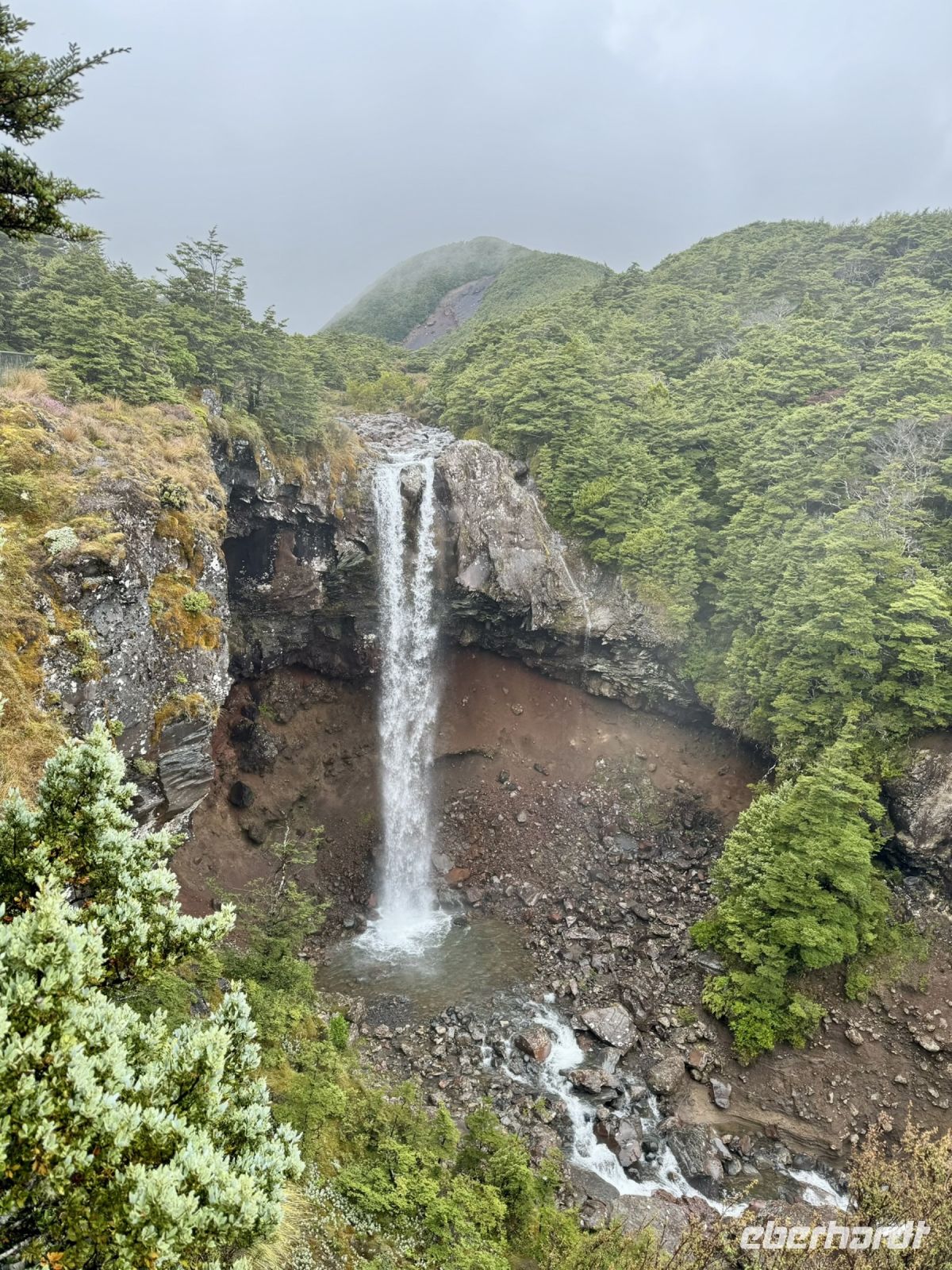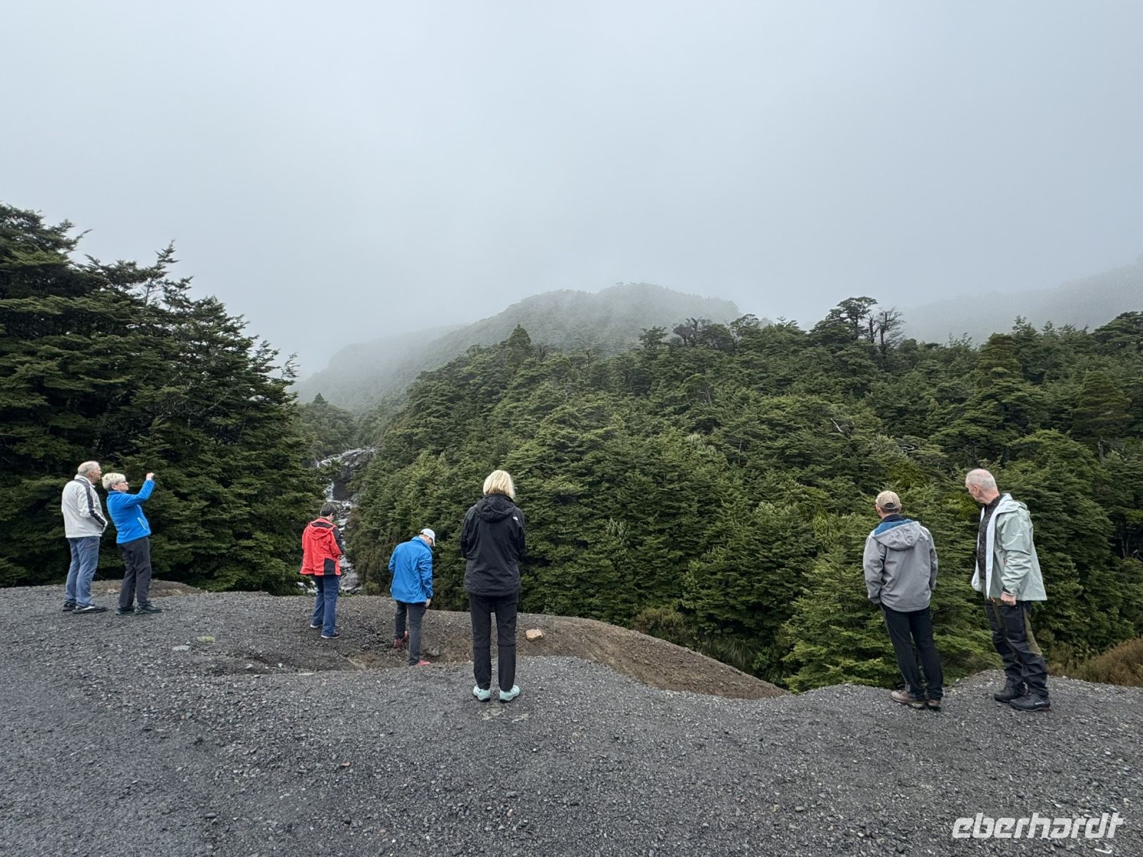 Nach einer Nacht mit viel Wind und Regen fuhren wir auf 1610 Meter Höhe direkt in das Skigebiet Turoa. Als wir ankamen, waren wir von Wolken umgeben und sahen, dass alles geschlossen war. Nach ein paar Minuten besuchten wir den Mangawhero Wasserfall, der weltberühmt ist, weil er auch als Gollum's Pool bekannt ist. An diesem Wasserfall wurde eine Szene aus "Der Herr der Ringe" gedreht, in der Gollum ein Bad nimmt. Anschließend machten wir eine zweite Wanderung zum Waitonga Wasserfall. Zuerst war es etwas steil, aber gut mit Stufen ausgebaut. Wir hatten Spaß im Wald, wo langsam der Nebel verschwand, und die ersten Sonnenstrahlen des Tages durchkamen. Oben angekommen genossen wir einen schönen Blick auf die Sümpfe mit Blick auf den Ruapehu Berg und die Gletscherzunge. Auf dem Weg hinunter zum Wasserfall konnten wir entspannen und die beeindruckende Aussicht genießen. Am Nachmittag gingen wir vom Hotel über die Brücke und durch die Wiese zum Ausgangspunkt für unsere Wanderung. Wir wanderten durch den Mangawhero Wald bei angenehmen Klima und entdeckten viele neue Arten von Pflanzen und Bäumen.
