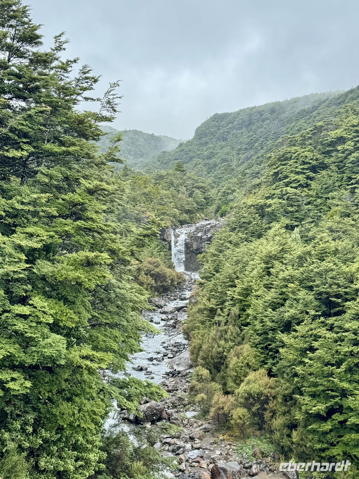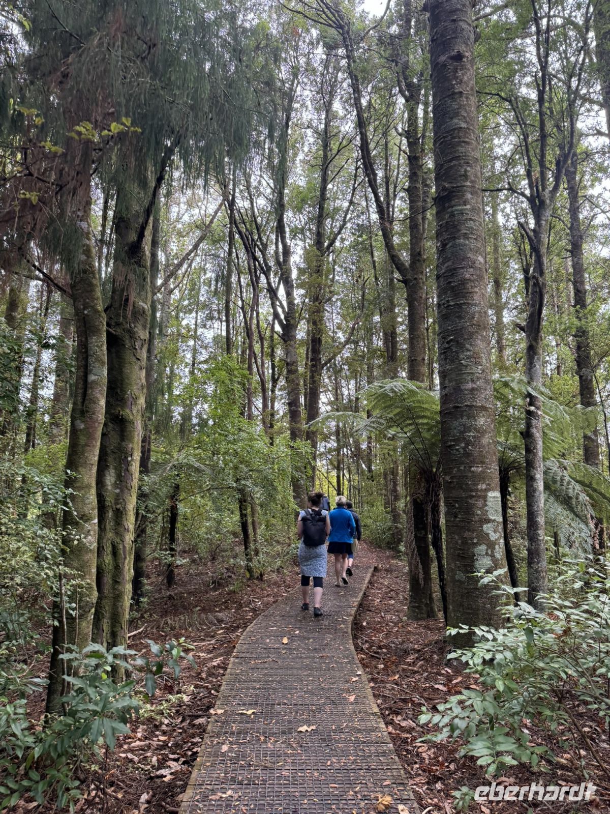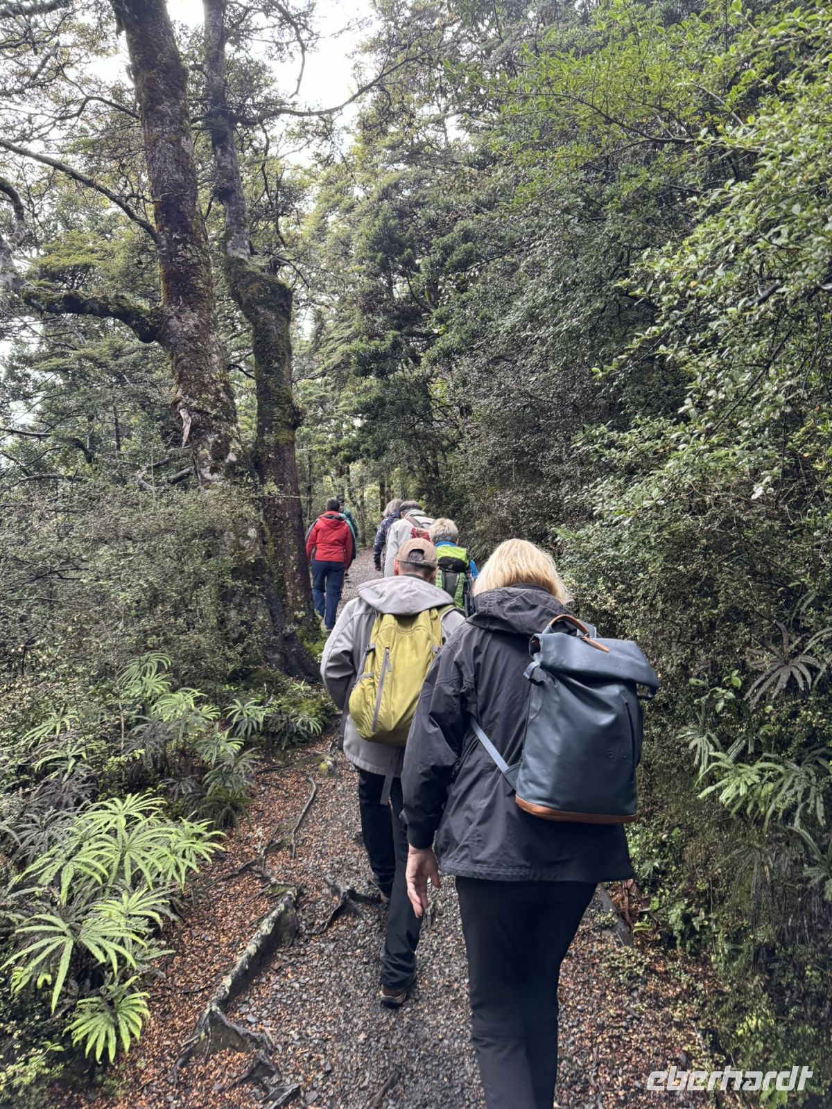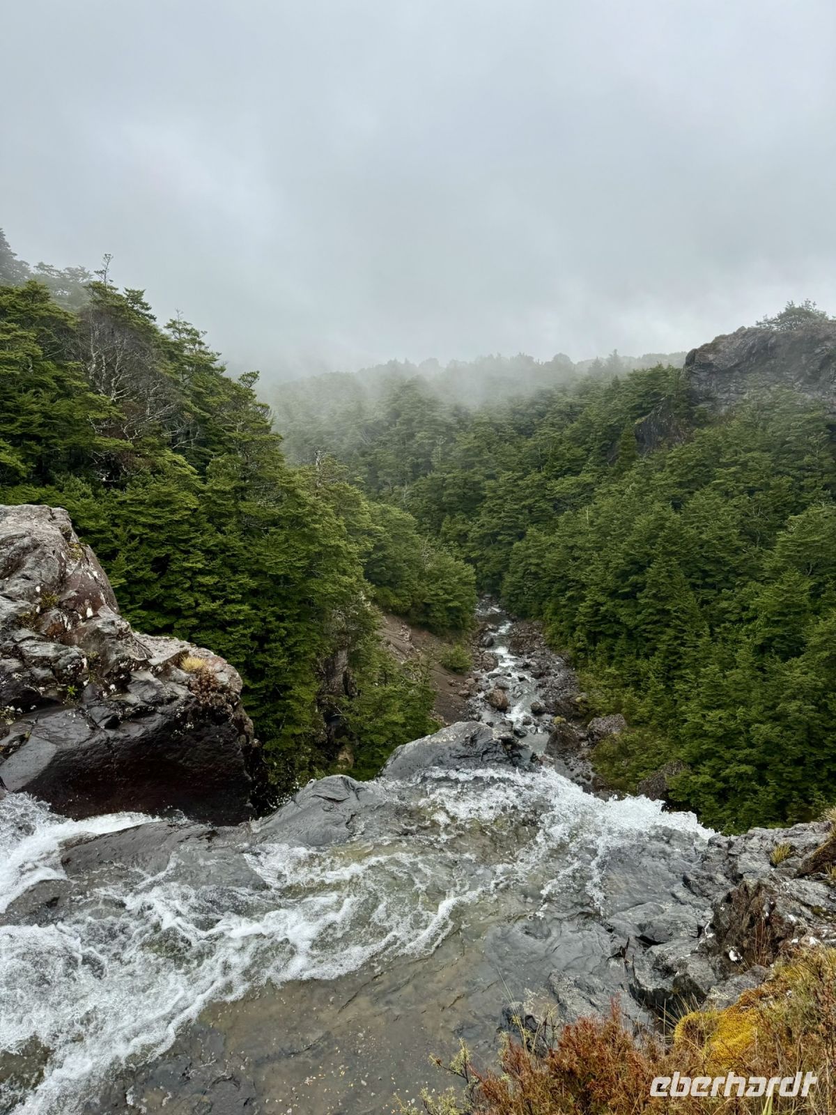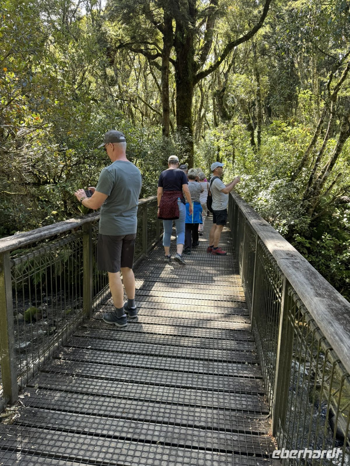Nach einer Nacht mit viel Wind und Regen fuhren wir auf 1610 Meter Höhe direkt in das Skigebiet Turoa. Als wir ankamen, waren wir von Wolken umgeben und sahen, dass alles geschlossen war. Nach ein paar Minuten besuchten wir den Mangawhero Wasserfall, der weltberühmt ist, weil er auch als Gollum's Pool bekannt ist. An diesem Wasserfall wurde eine Szene aus "Der Herr der Ringe" gedreht, in der Gollum ein Bad nimmt. Anschließend machten wir eine zweite Wanderung zum Waitonga Wasserfall. Zuerst war es etwas steil, aber gut mit Stufen ausgebaut. Wir hatten Spaß im Wald, wo langsam der Nebel verschwand, und die ersten Sonnenstrahlen des Tages durchkamen. Oben angekommen genossen wir einen schönen Blick auf die Sümpfe mit Blick auf den Ruapehu Berg und die Gletscherzunge. Auf dem Weg hinunter zum Wasserfall konnten wir entspannen und die beeindruckende Aussicht genießen. Am Nachmittag gingen wir vom Hotel über die Brücke und durch die Wiese zum Ausgangspunkt für unsere Wanderung. Wir wanderten durch den Mangawhero Wald bei angenehmen Klima und entdeckten viele neue Arten von Pflanzen und Bäumen.