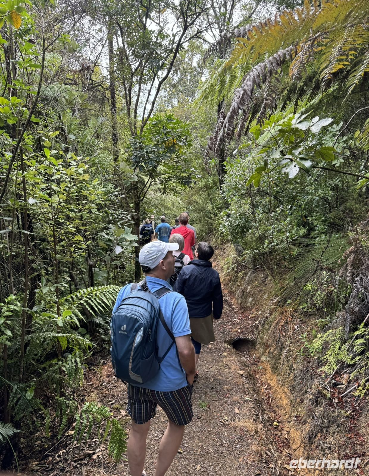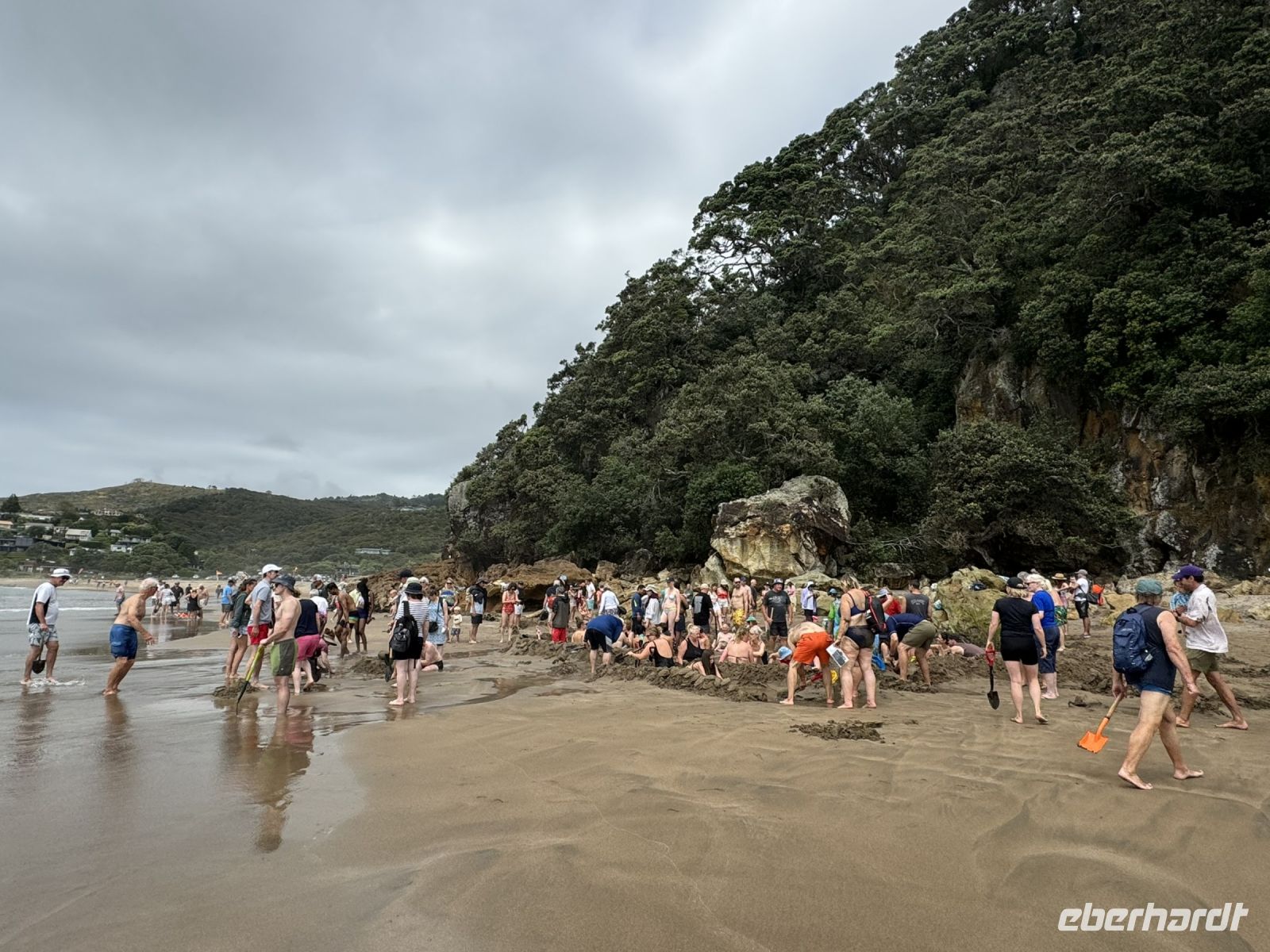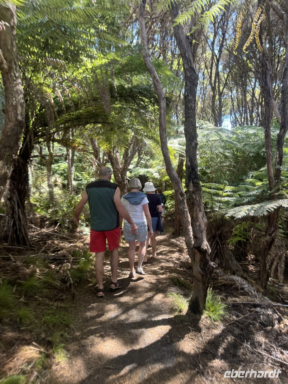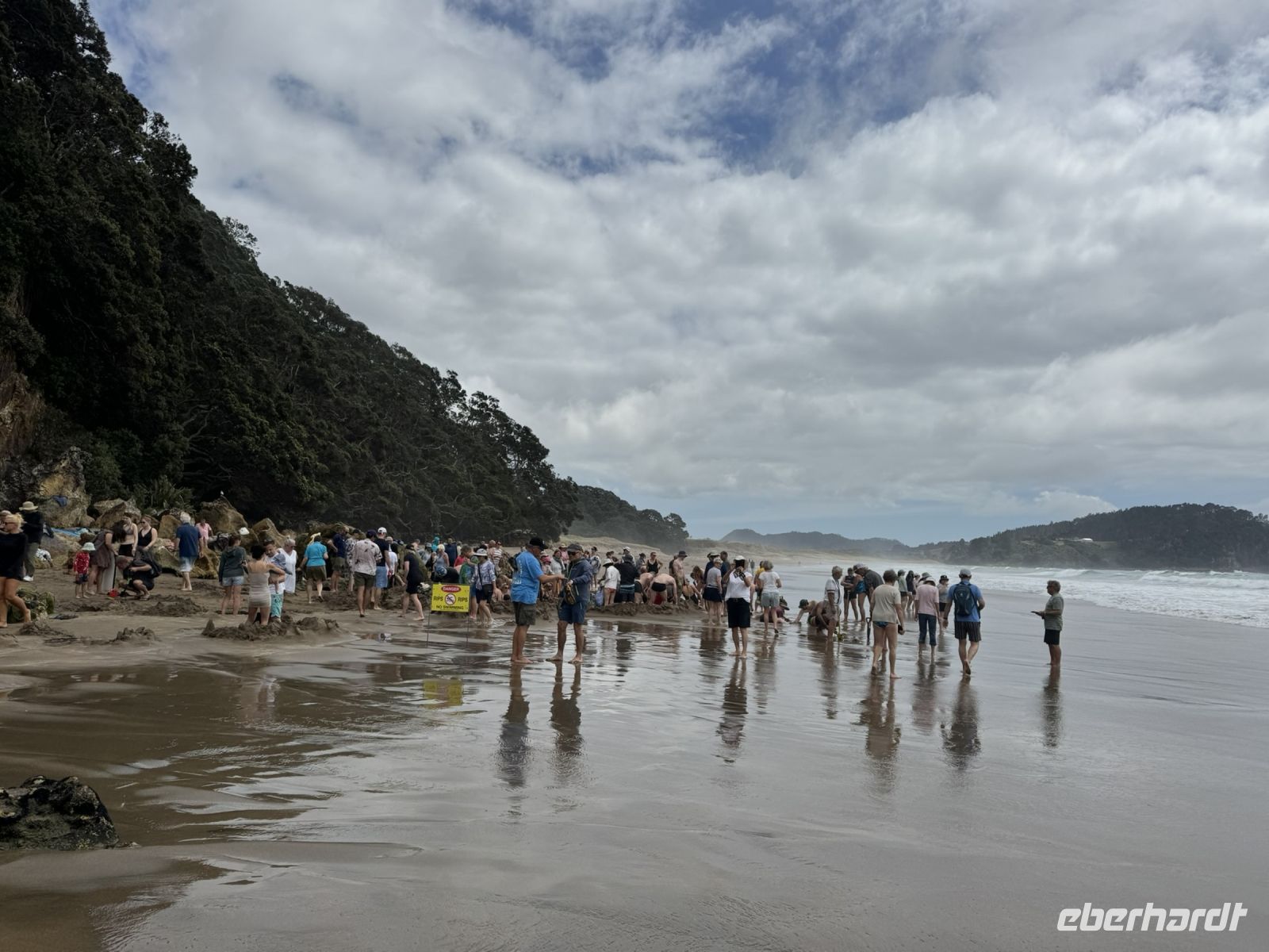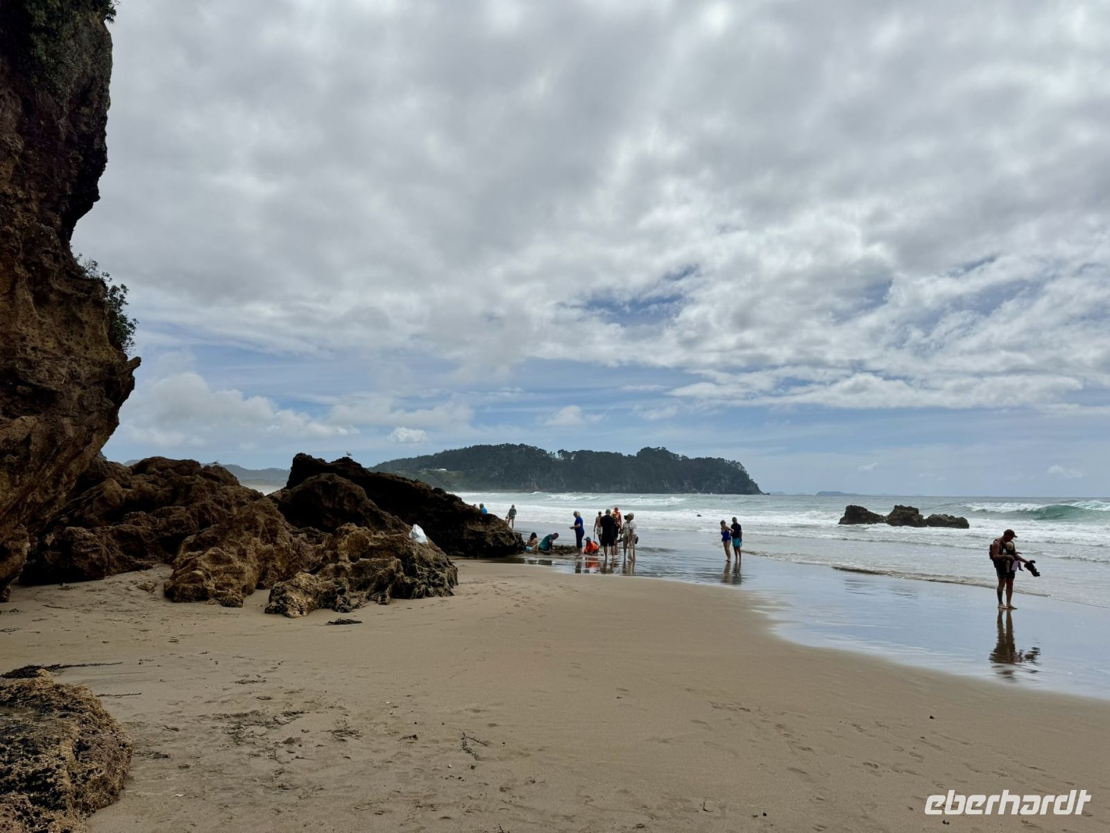 Der Tag begann mit ein paar Wolken am Himmel, aber dennoch herrschte eine angenehme Temperatur von 20 Grad zum Wandern. Im Kiwi-Gebiet Whenuakite fanden wir einen fantastischen Wald mit vielen einheimischen Pflanzen und Bäumen, darunter auch die Kauri-Bäume. Unter anderem entdeckten wir zum Beispiel den Silberfarn, der als nationales Symbol gilt und mit seiner silbernen Farbe auf der Rückseite beeindruckt. Er wird auch unter anderem als Symbol für den Tourismus oder Rugby verwendet. Eine weitere kuriose Pflanze ist die Nikaupalme (ohne Kokosnuss), sie produziert zwar keine essbaren Früchte, aber kleine Beeren, die von Vögeln gegessen werden können. Es war eine tolle Wanderung in dieser harmonischen Umgebung, in der wir allein dem Lied der Natur lauschten. Anschließend fuhren wir zum Hot Water Beach! Dort steckten wir unsere Füße tief in den Sand und spürten die heißen Temperaturen. Natürlich mussten wir viel lachen, als einige Besucher aufgrund der Wassertemperatur ganz rot wurden. Der blaue Himmel kehrte zurück und bot uns einen herrlichen Blick auf Cove Beach. Schon fast sommerlich fühlte es sich an, als wir in Hahei Beach anhielten, um zu baden und unsere Mittagspause am Strand zu genießen sowie unser Eis „Hockey Pokey“ zu essen. Am Nachmittag hatten wir Freizeit zum Baden oder Ausruhen, bevor wir unser gemeinsames Grillabendessen im Haus des Reiseleiters genossen. Bei unserer Party durften natürlich nicht die neuseeländischen Vitamine und unsere gute Stimmung fehlen.