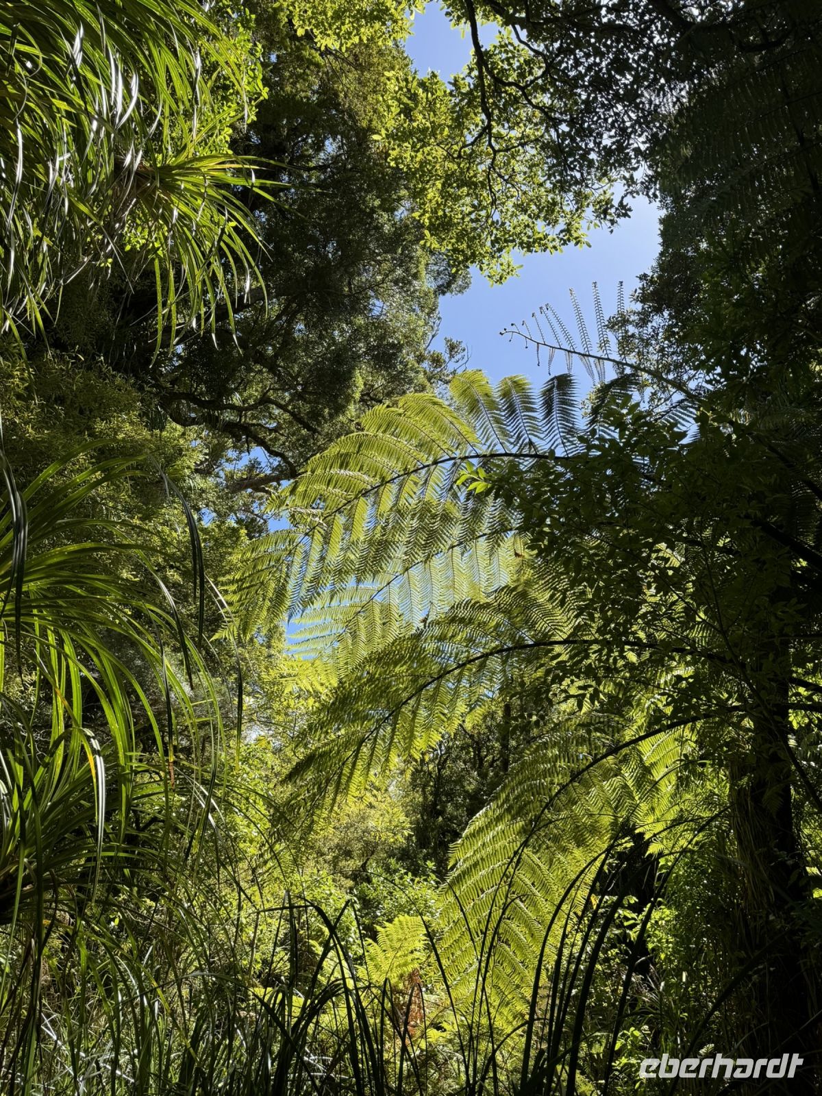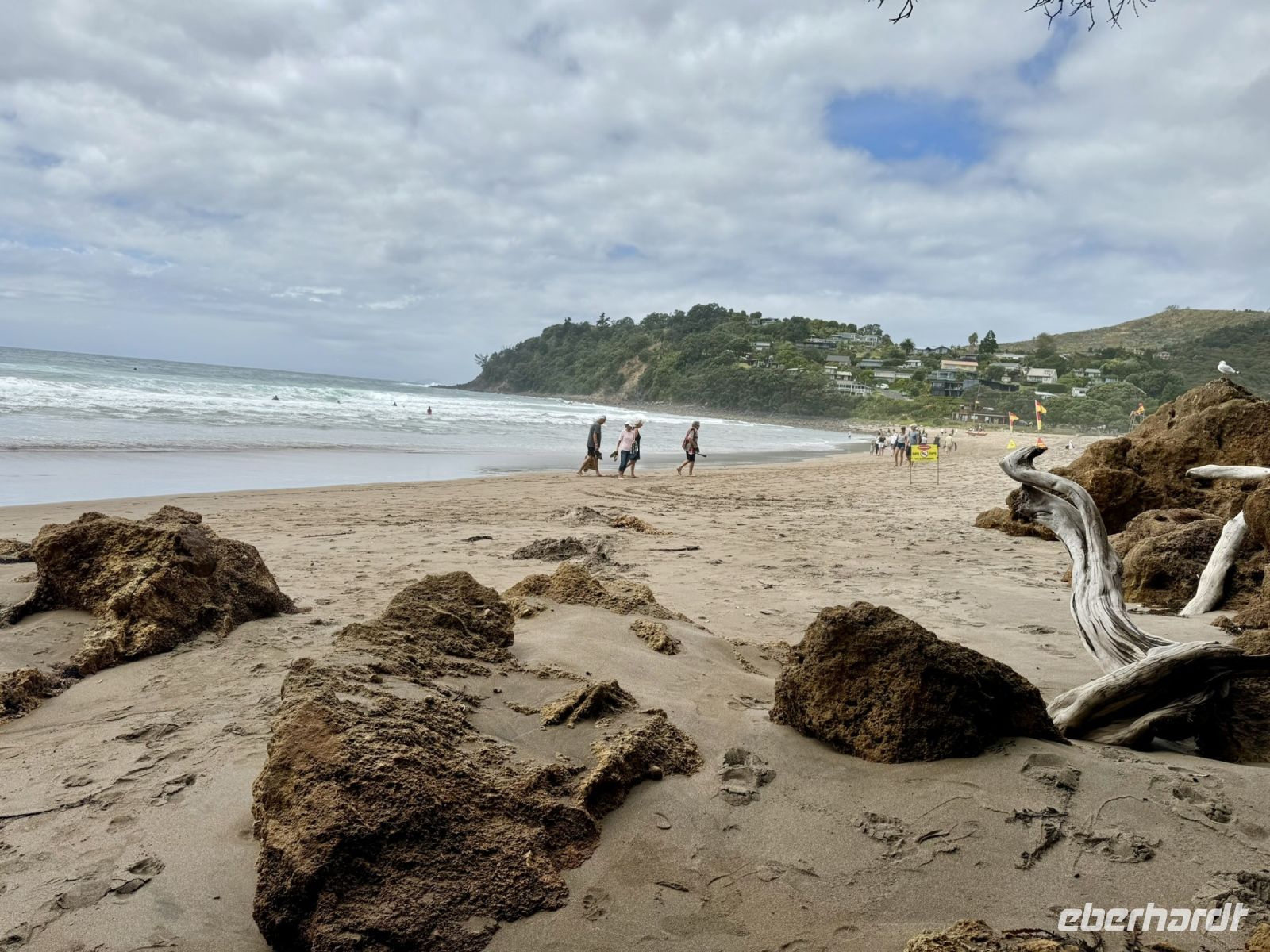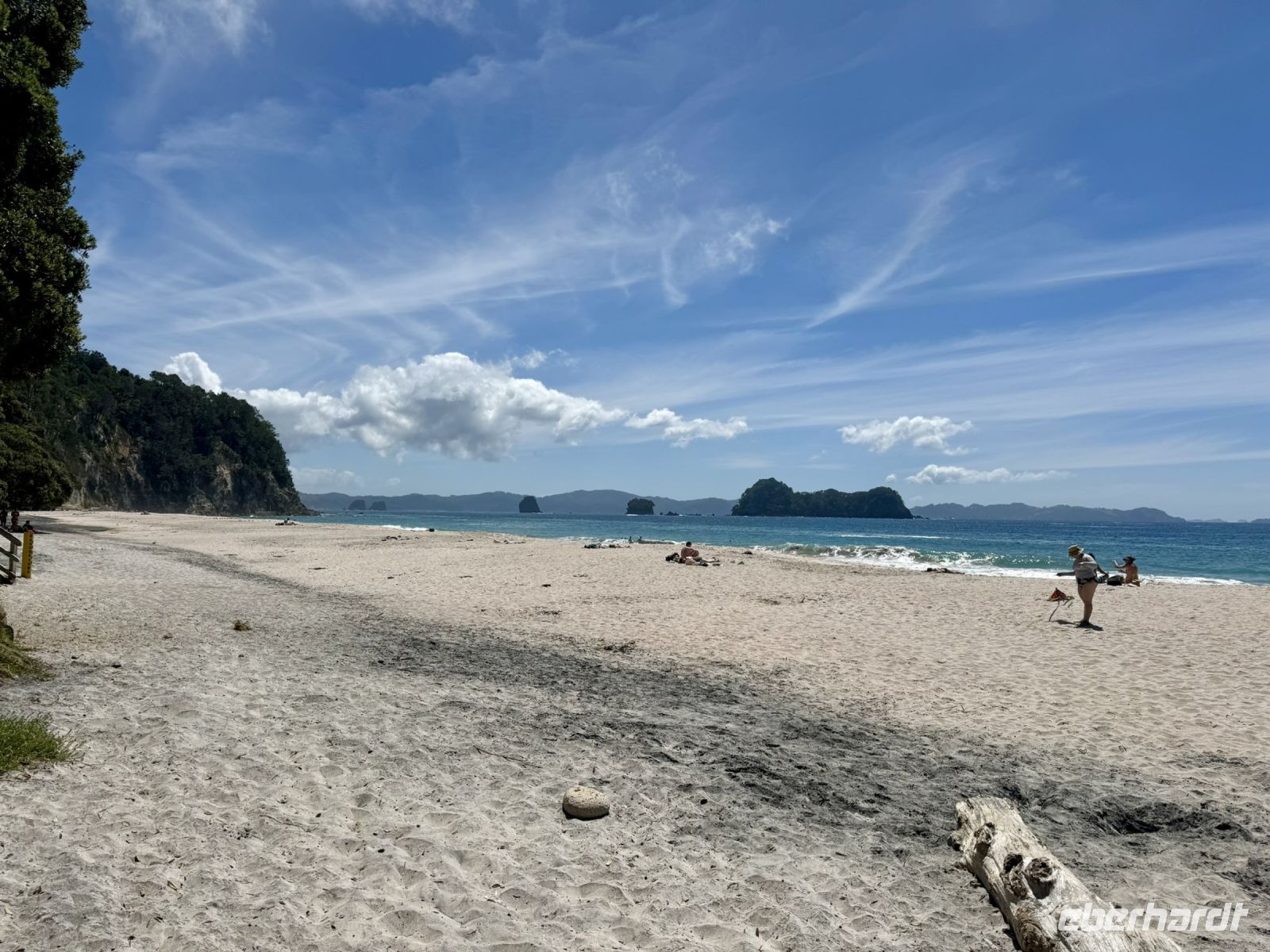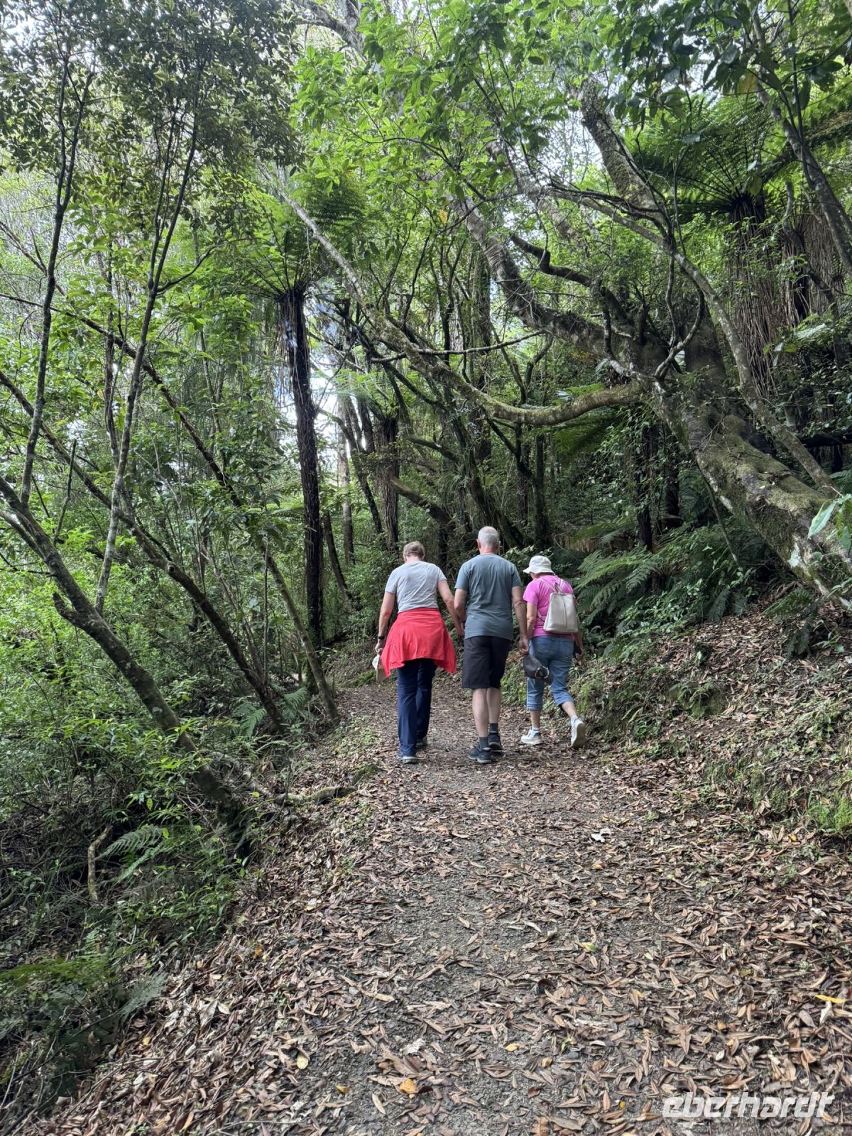 Der Tag begann mit ein paar Wolken am Himmel, aber dennoch herrschte eine angenehme Temperatur von 20 Grad zum Wandern. Im Kiwi-Gebiet Whenuakite fanden wir einen fantastischen Wald mit vielen einheimischen Pflanzen und Bäumen, darunter auch die Kauri-Bäume. Unter anderem entdeckten wir zum Beispiel den Silberfarn, der als nationales Symbol gilt und mit seiner silbernen Farbe auf der Rückseite beeindruckt. Er wird auch unter anderem als Symbol für den Tourismus oder Rugby verwendet. Eine weitere kuriose Pflanze ist die Nikaupalme (ohne Kokosnuss), sie produziert zwar keine essbaren Früchte, aber kleine Beeren, die von Vögeln gegessen werden können. Es war eine tolle Wanderung in dieser harmonischen Umgebung, in der wir allein dem Lied der Natur lauschten. Anschließend fuhren wir zum Hot Water Beach! Dort steckten wir unsere Füße tief in den Sand und spürten die heißen Temperaturen. Natürlich mussten wir viel lachen, als einige Besucher aufgrund der Wassertemperatur ganz rot wurden. Der blaue Himmel kehrte zurück und bot uns einen herrlichen Blick auf Cove Beach. Schon fast sommerlich fühlte es sich an, als wir in Hahei Beach anhielten, um zu baden und unsere Mittagspause am Strand zu genießen sowie unser Eis „Hockey Pokey“ zu essen. Am Nachmittag hatten wir Freizeit zum Baden oder Ausruhen, bevor wir unser gemeinsames Grillabendessen im Haus des Reiseleiters genossen. Bei unserer Party durften natürlich nicht die neuseeländischen Vitamine und unsere gute Stimmung fehlen.