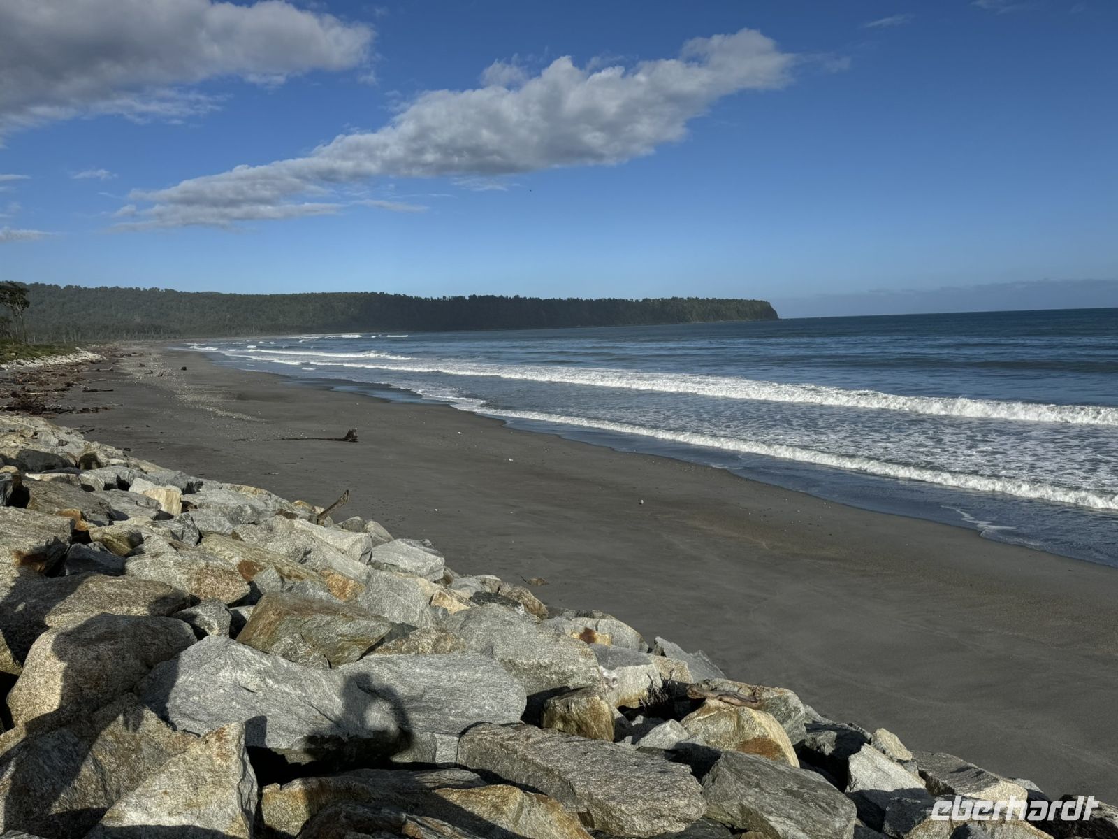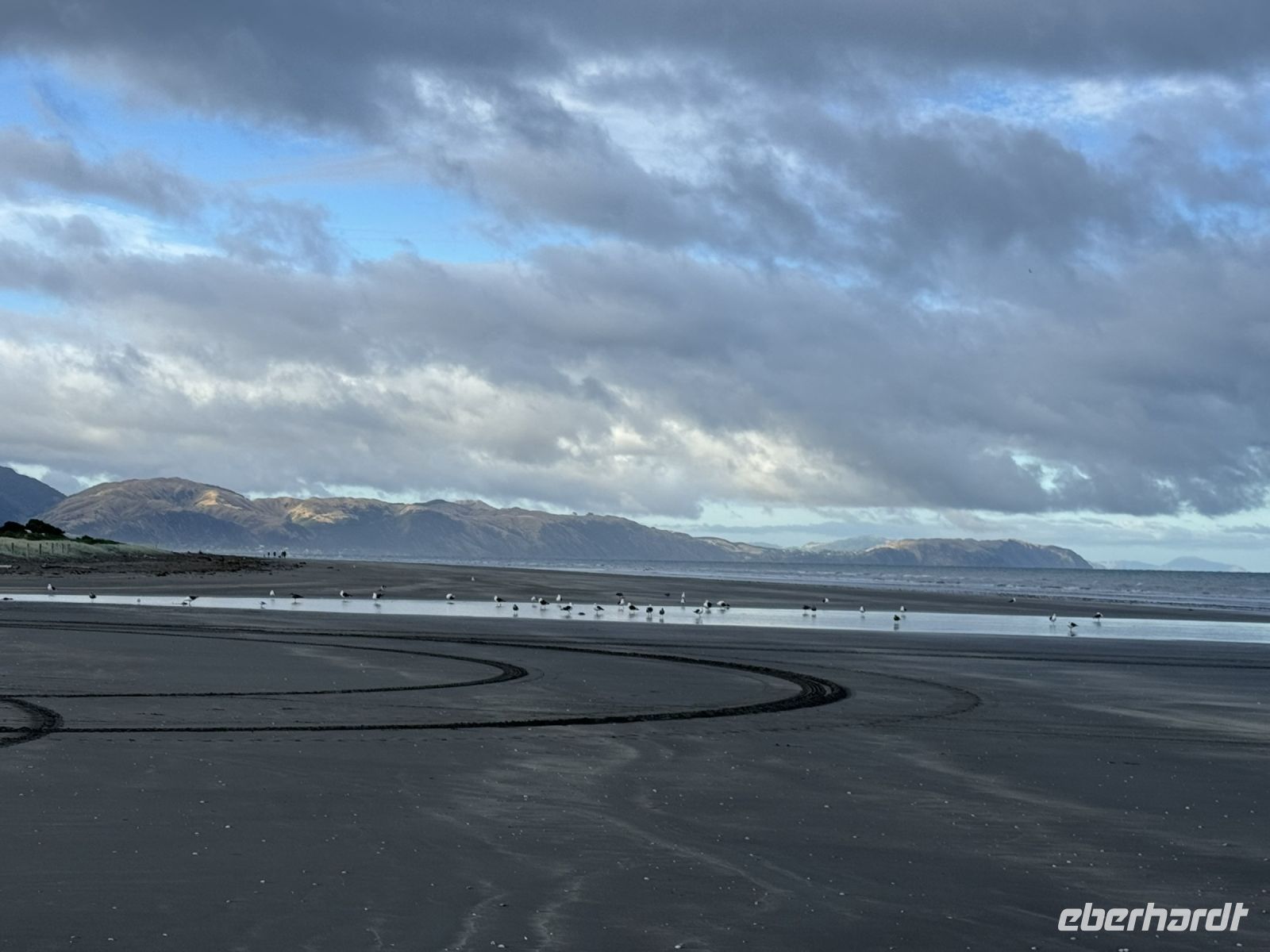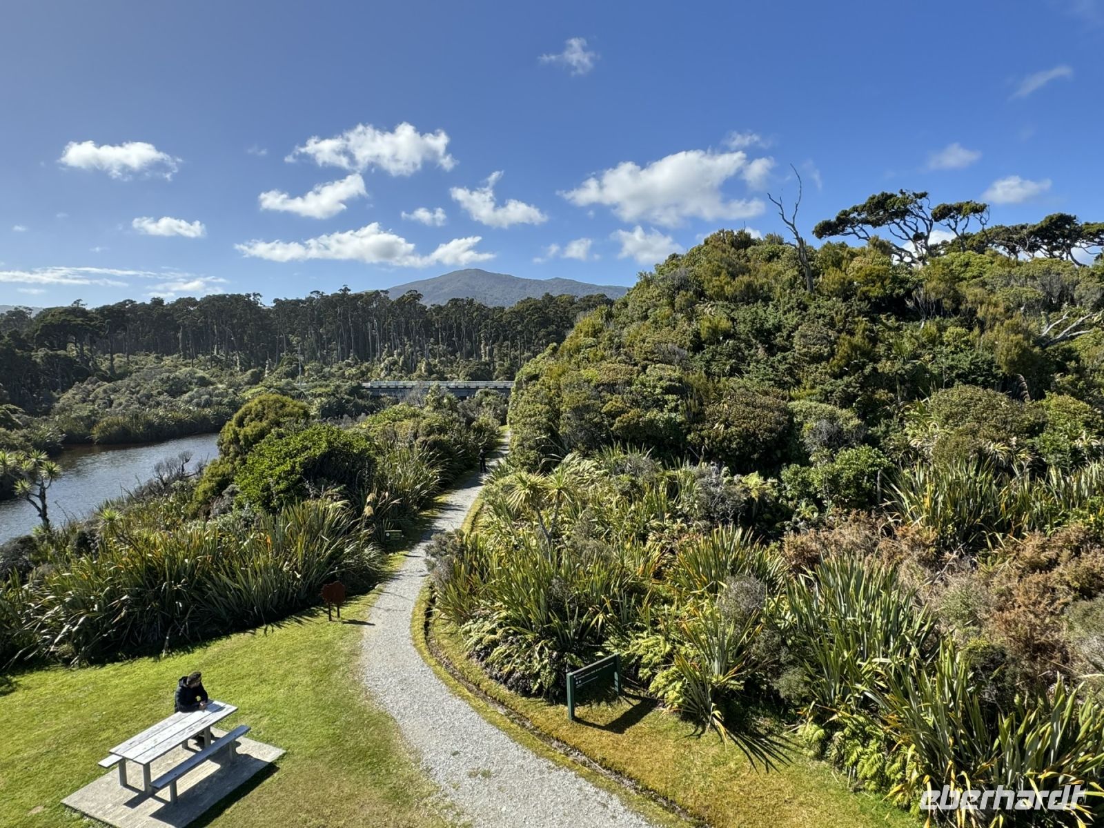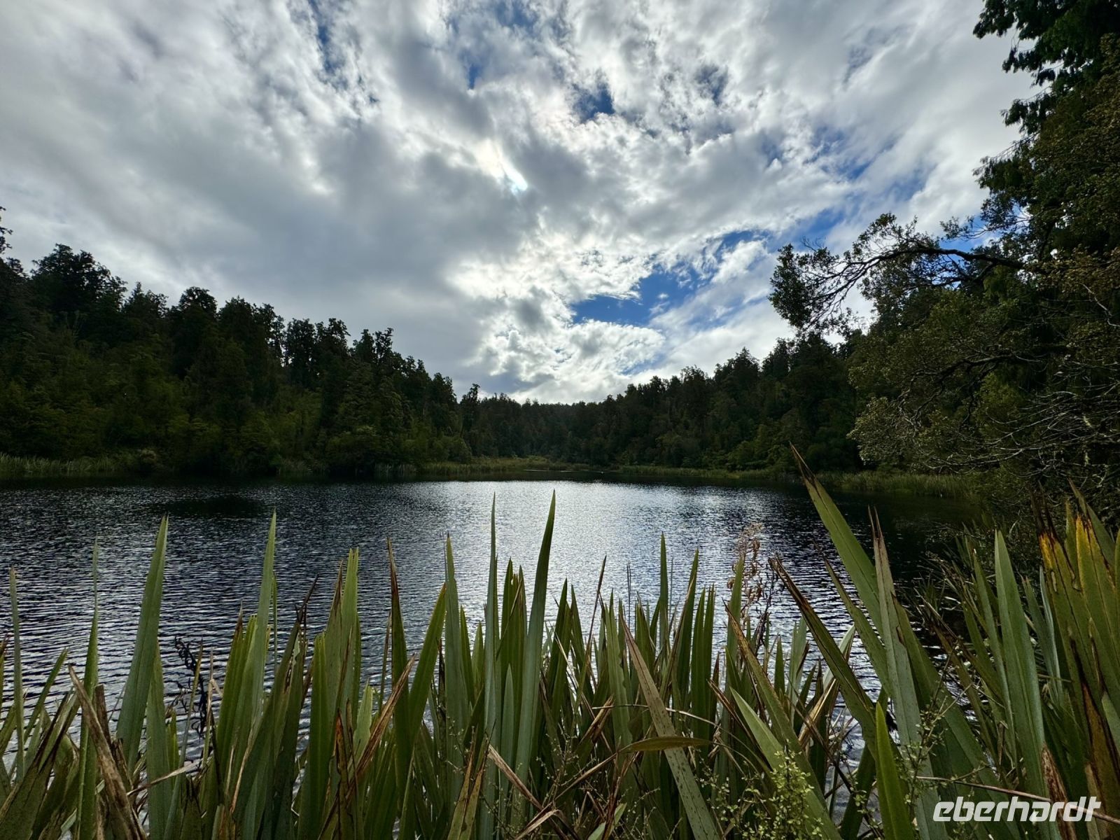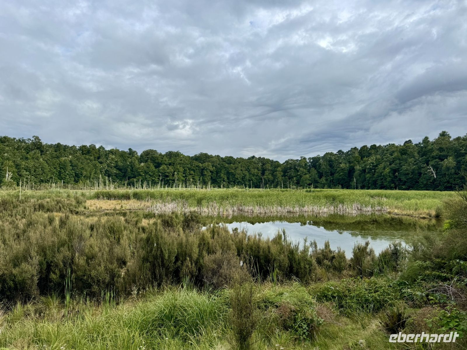 Es hatte die ganze Nacht durchgeregnet und am Anfang des Tages war der Himmel immer noch bedeckt. Deswegen konnte man leider nicht mit dem Helikopter fliegen. Trotzdem fuhren wir entlang der Westküste und machten unterschiedliche Stopps am Strand und am See. Bei Ship Creek fanden wir kleine Dünen, den Tasmal-See und wir spazierten durch den Swamp Forest.