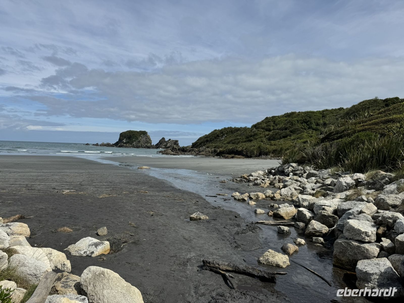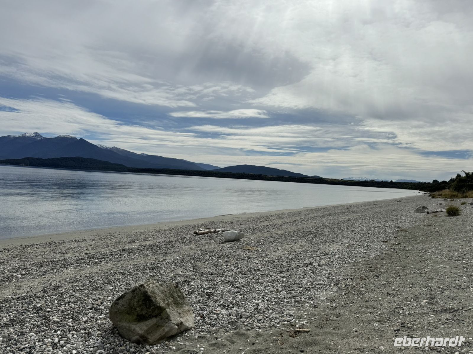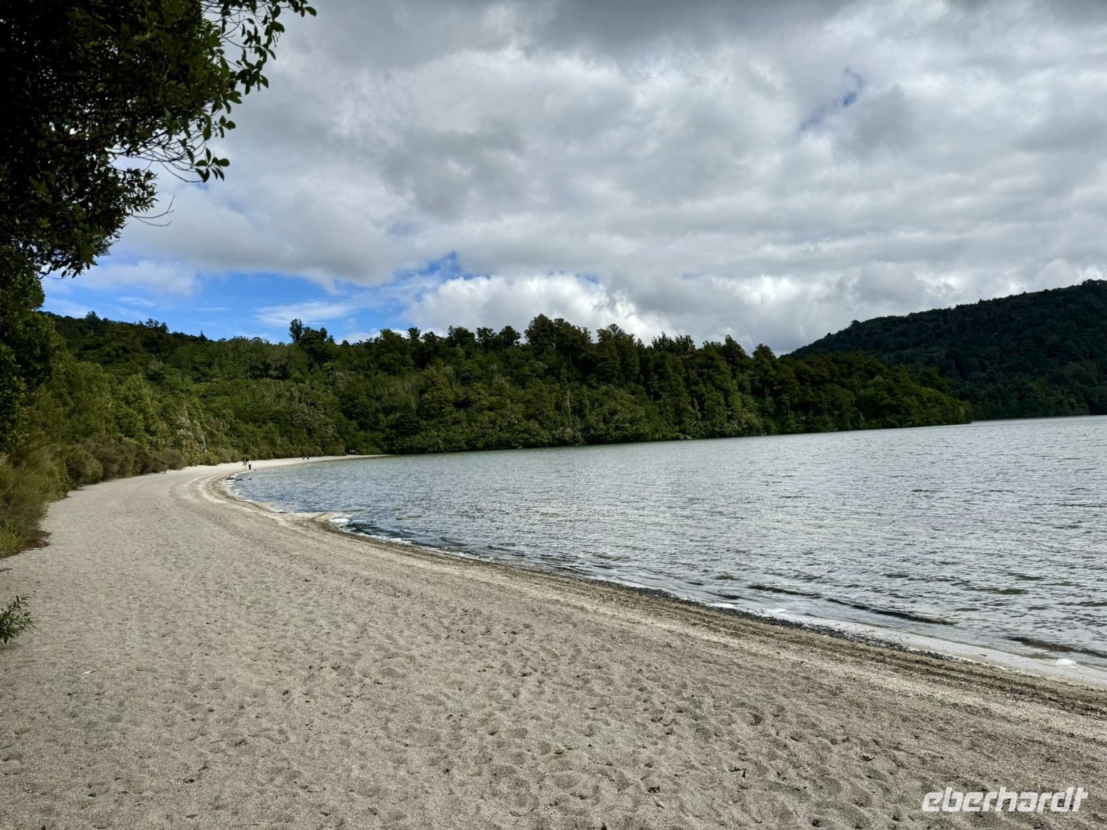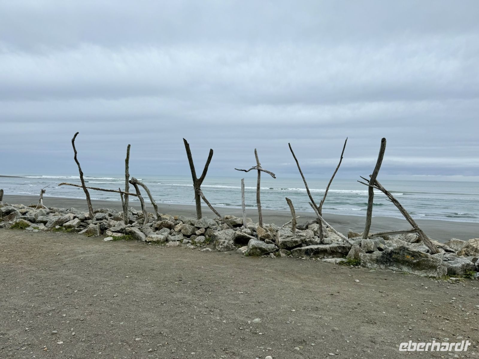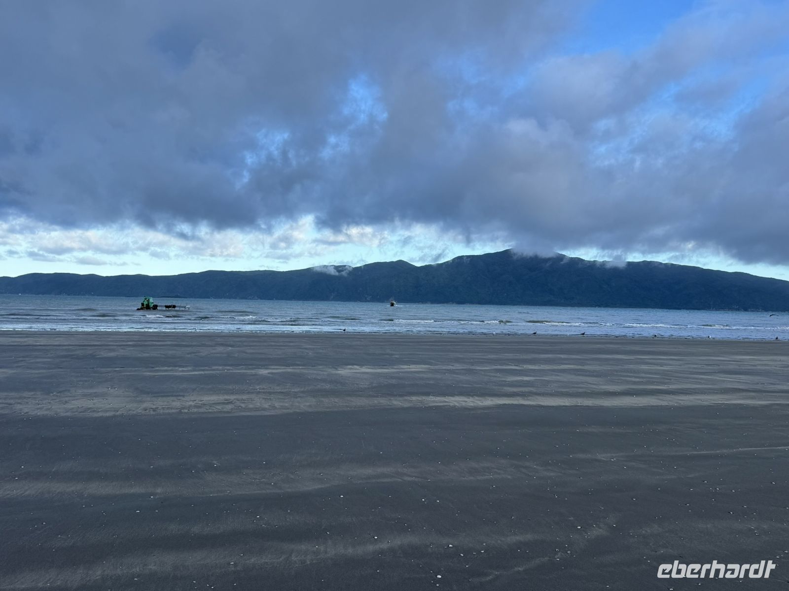 Es hatte die ganze Nacht durchgeregnet und am Anfang des Tages war der Himmel immer noch bedeckt. Deswegen konnte man leider nicht mit dem Helikopter fliegen. Trotzdem fuhren wir entlang der Westküste und machten unterschiedliche Stopps am Strand und am See. Bei Ship Creek fanden wir kleine Dünen, den Tasmal-See und wir spazierten durch den Swamp Forest.