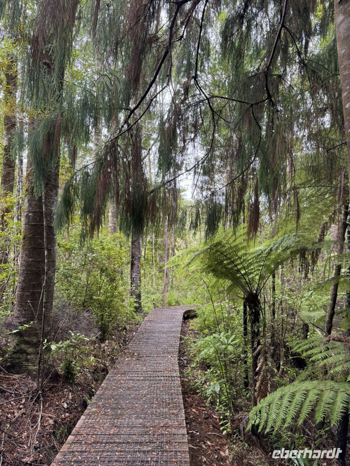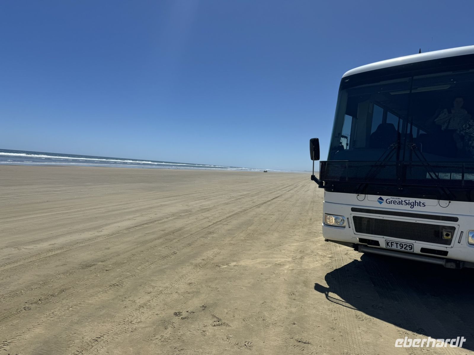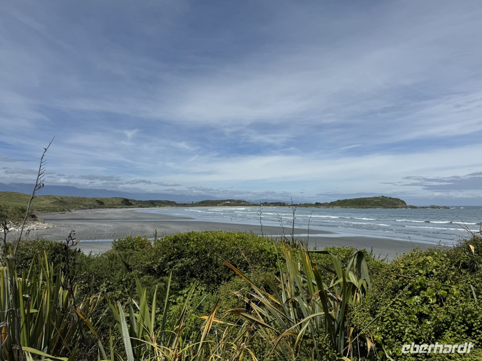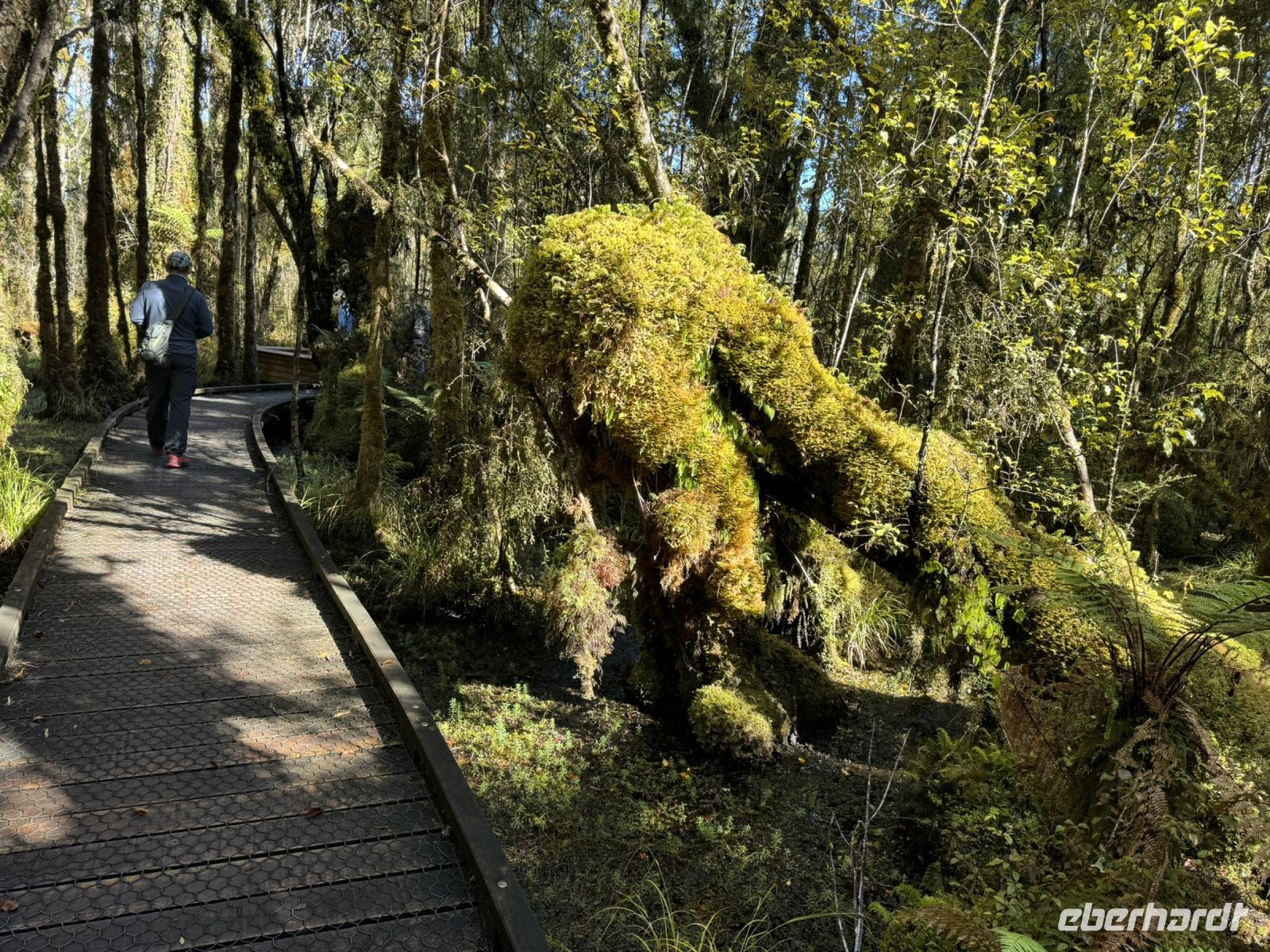 Es hatte die ganze Nacht durchgeregnet und am Anfang des Tages war der Himmel immer noch bedeckt. Deswegen konnte man leider nicht mit dem Helikopter fliegen. Trotzdem fuhren wir entlang der Westküste und machten unterschiedliche Stopps am Strand und am See. Bei Ship Creek fanden wir kleine Dünen, den Tasmal-See und wir spazierten durch den Swamp Forest.
