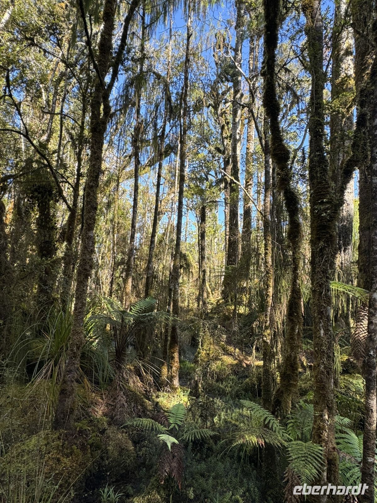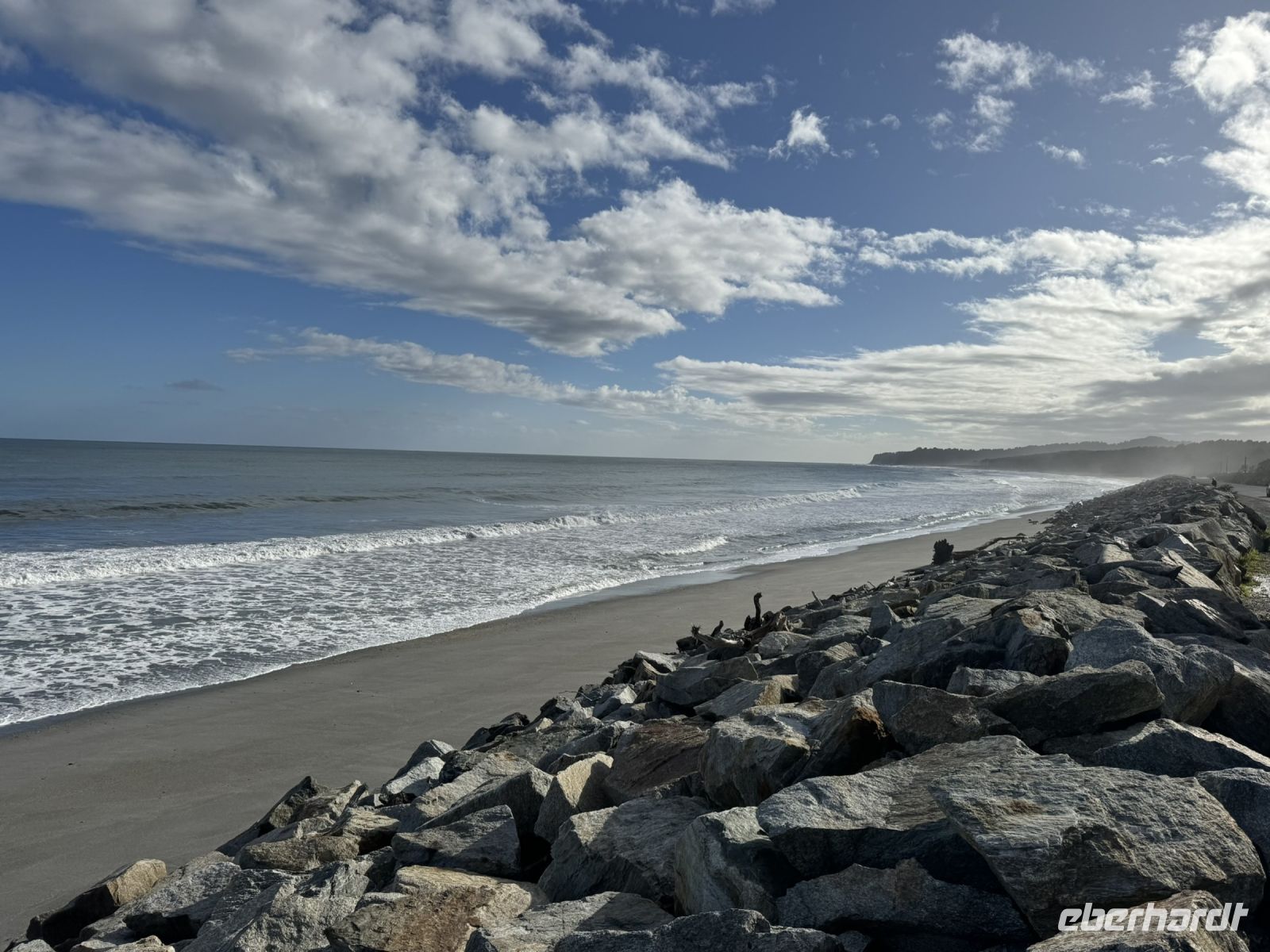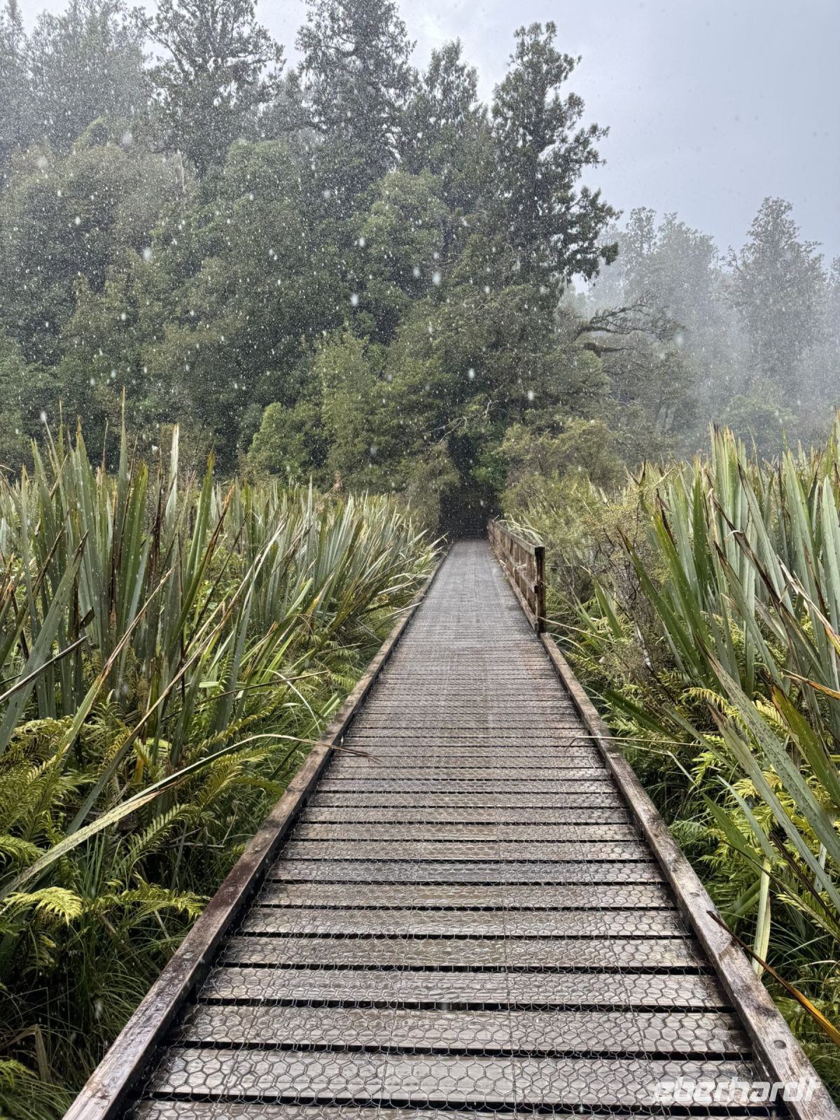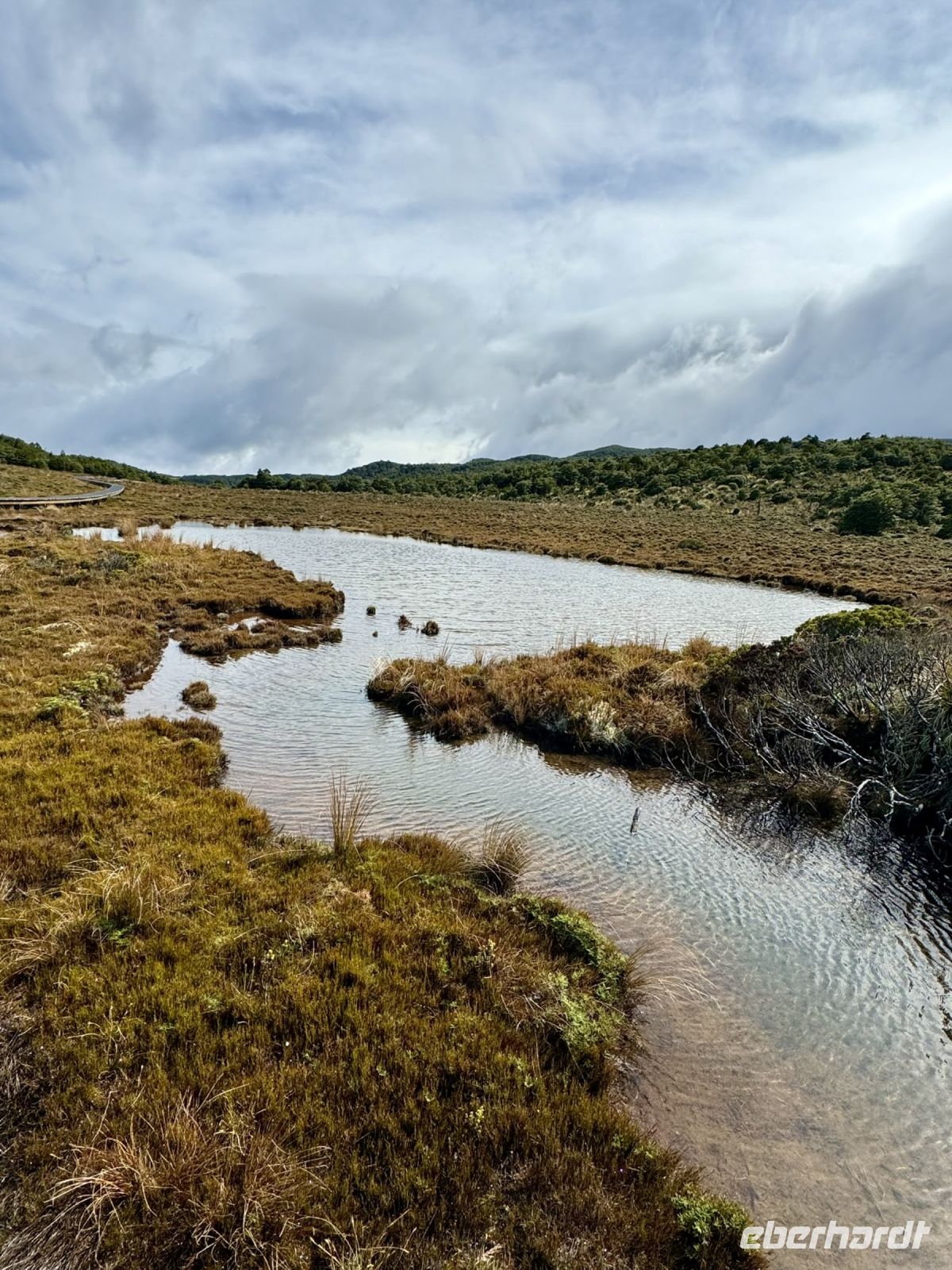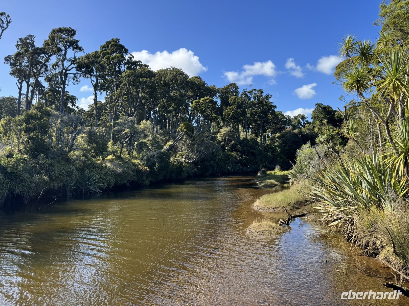 Es hatte die ganze Nacht durchgeregnet und am Anfang des Tages war der Himmel immer noch bedeckt. Deswegen konnte man leider nicht mit dem Helikopter fliegen. Trotzdem fuhren wir entlang der Westküste und machten unterschiedliche Stopps am Strand und am See. Bei Ship Creek fanden wir kleine Dünen, den Tasmal-See und wir spazierten durch den Swamp Forest.