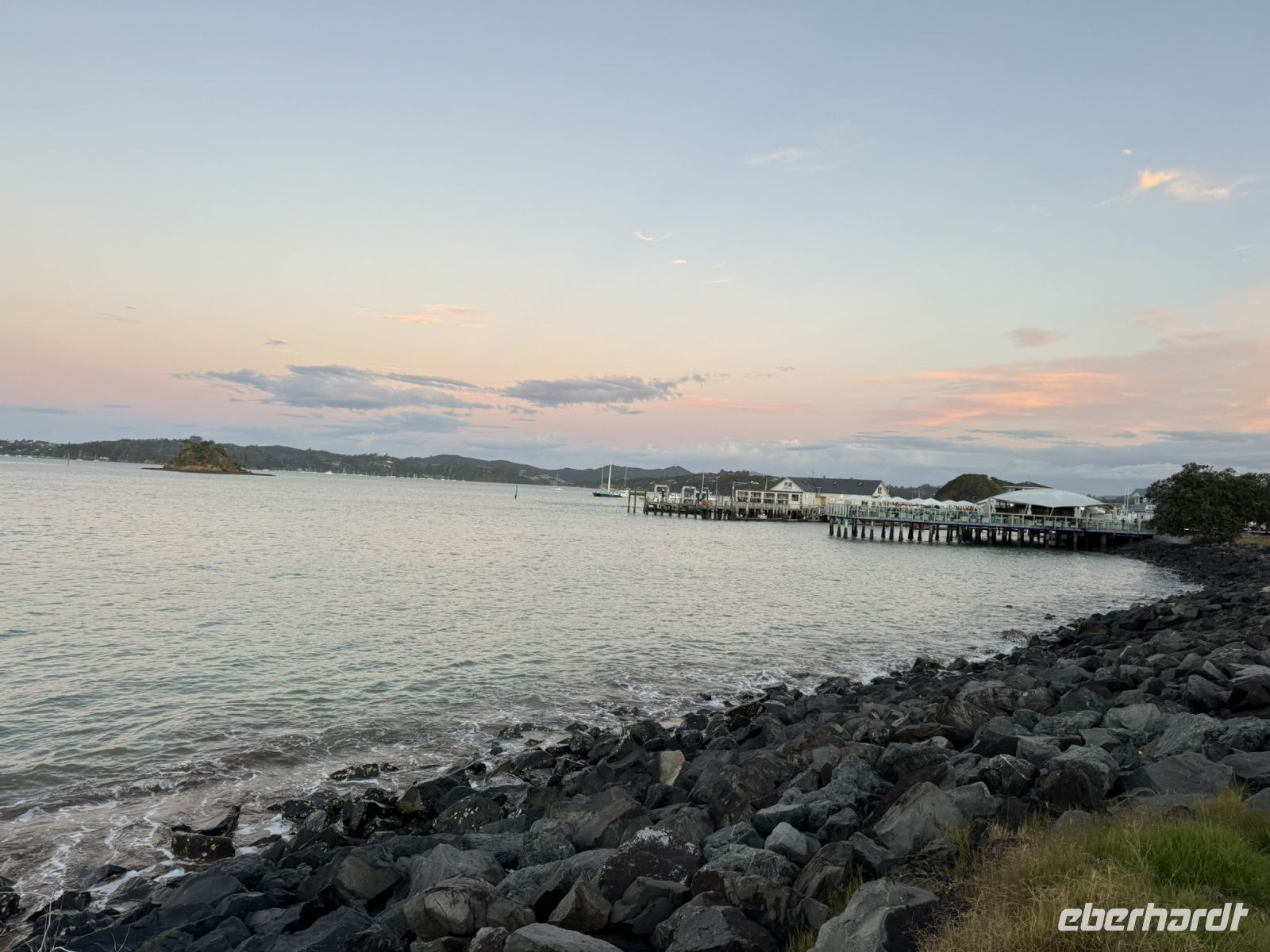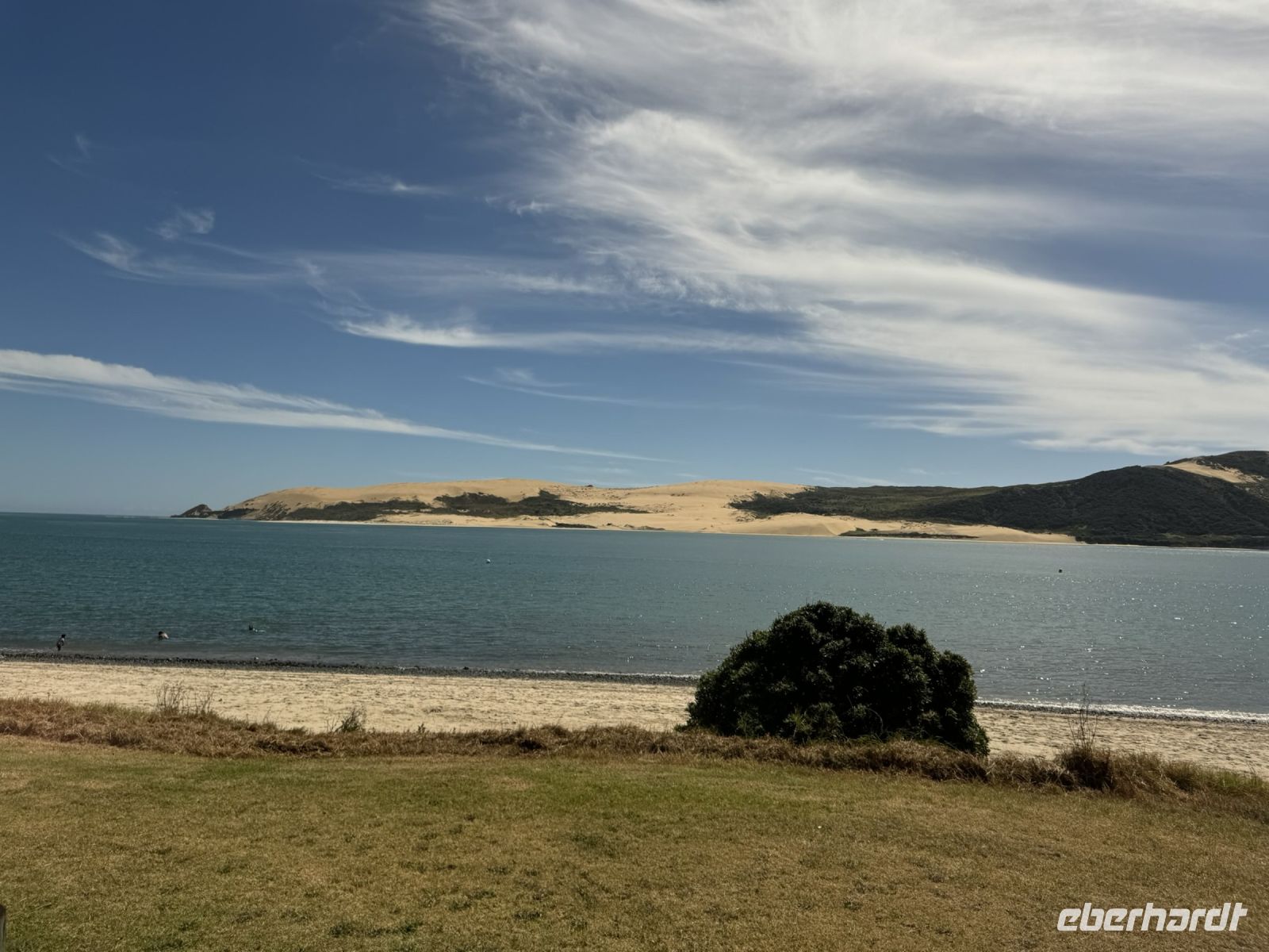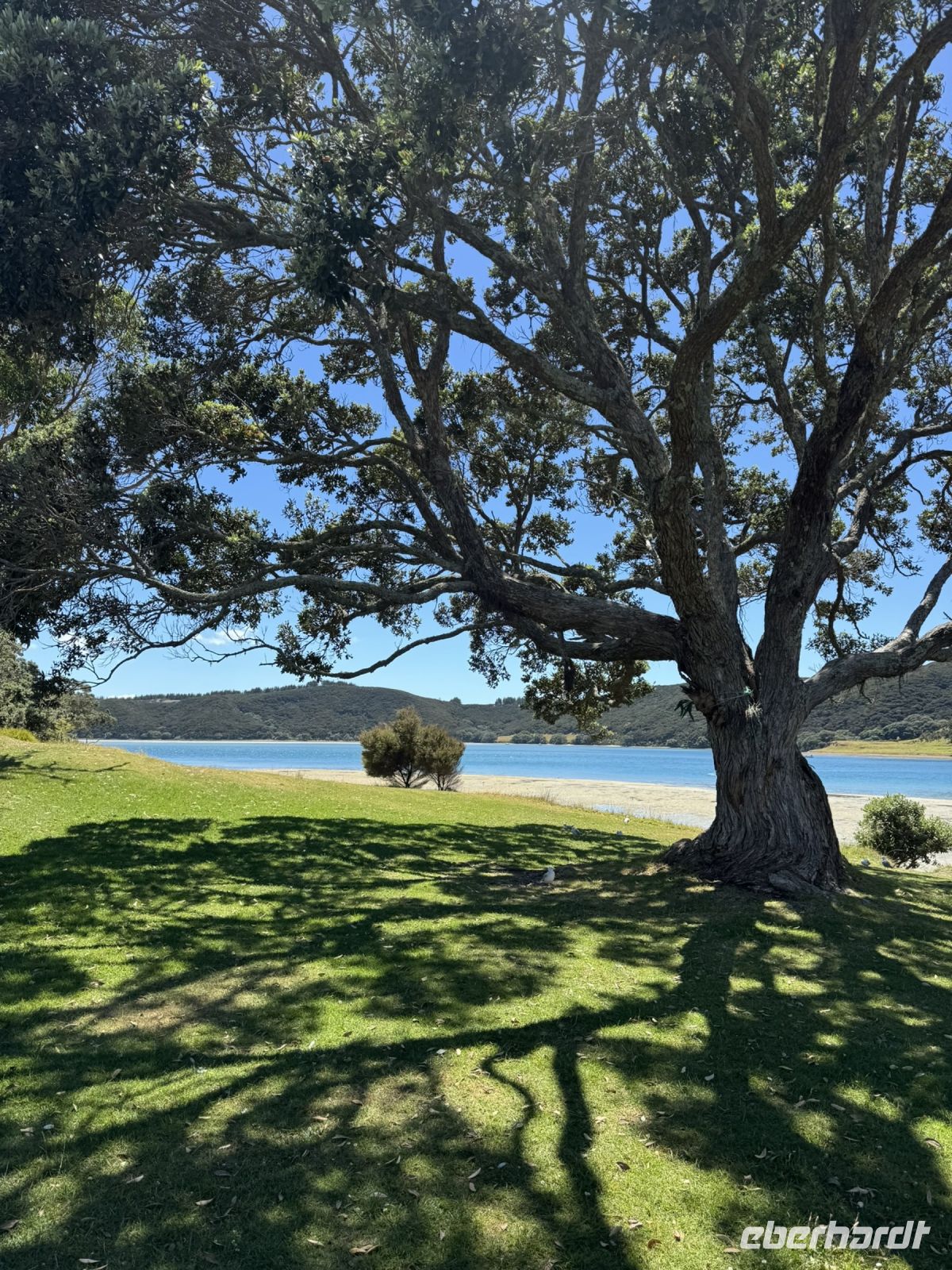 Der Tag begann mit angenehmen Temperaturen und einer abwechslungsreichen Strecke voller Kontraste: über die Kurven von der Stadt aus bis auf das Land. In Wellsford machten wir eine kurze Pause zur Akklimatisierung und genossen den Duft der Natur, bevor wir weiter nach Matakohe fuhren. Dort besuchten wir das Kauri-Museum, sahen die gigantischen Stämme und ihren Durchmesser aber lernten auch so einiges über die Geschichte der Möbelfabrik und ihre Auswirkungen auf die neuseeländische Gesellschaft kennen. Anschließend fuhren wir tief in den Waipoua Kauri-Wald, wo wir viele Exemplare von Kauris zwischen 80 verschiedenen Grüntönen bewundern konnten und dabei die Sonne genossen. Die Strecke war sehr unterhaltsam mit ihren Kurven. Natürlich mussten wir an diesem traumhaften Ort anhalten. Der Tane Mahuta, laut Maori-Mythologie der Sohn des Himmelsvaters und der Mutter Erde, brachte Licht, Luft, Raum und lebendige Flora hervor. Seit etwa 2.000 Jahren bringt Tane Leben in diese Symbiose der Natur. In Pakanae war es Zeit für ein Eis mit Blick auf die Dünen. Nach 480 gefahrenen Kilometern kamen wir schließlich in Paihia an und genossen unser gemeinsames Abendessen mit herrlichem Blick auf die Bucht Bay of Islands.