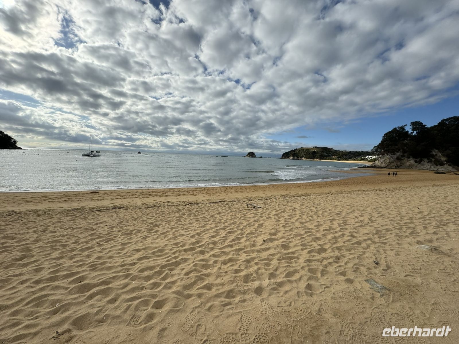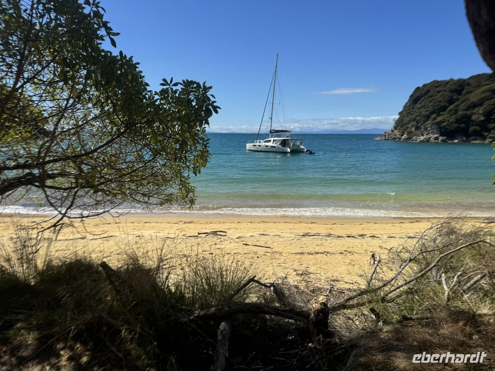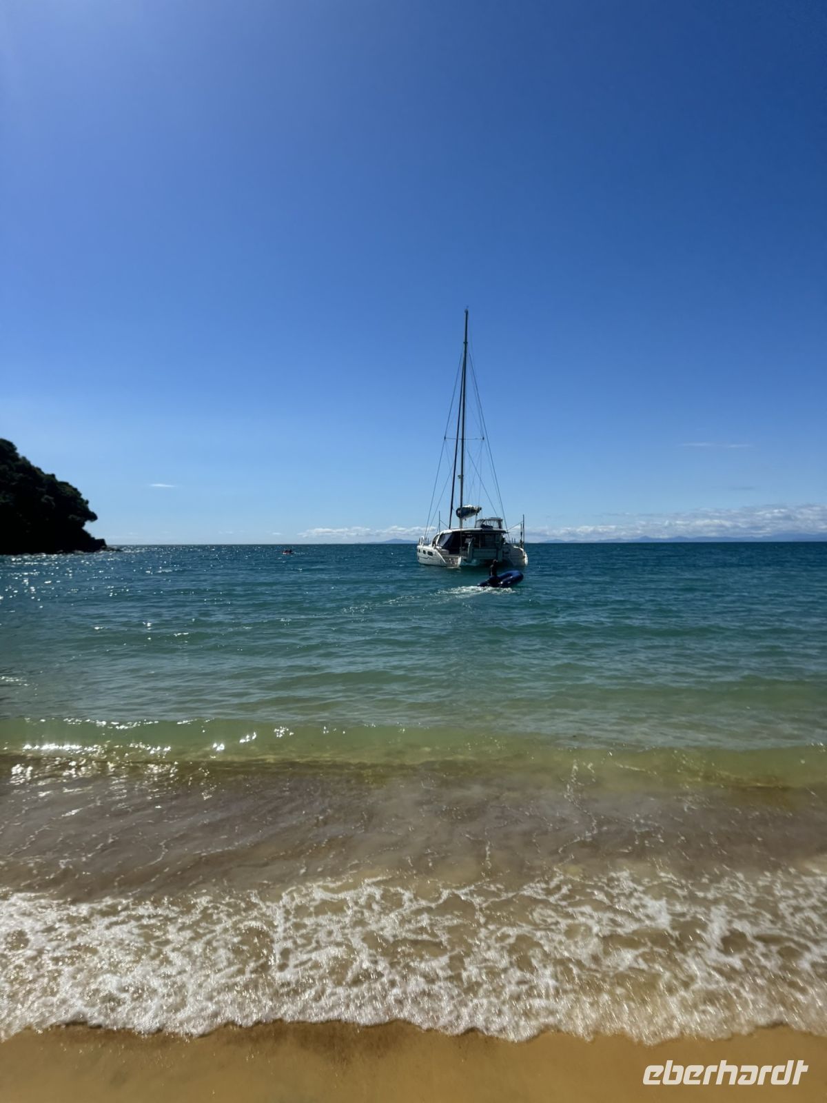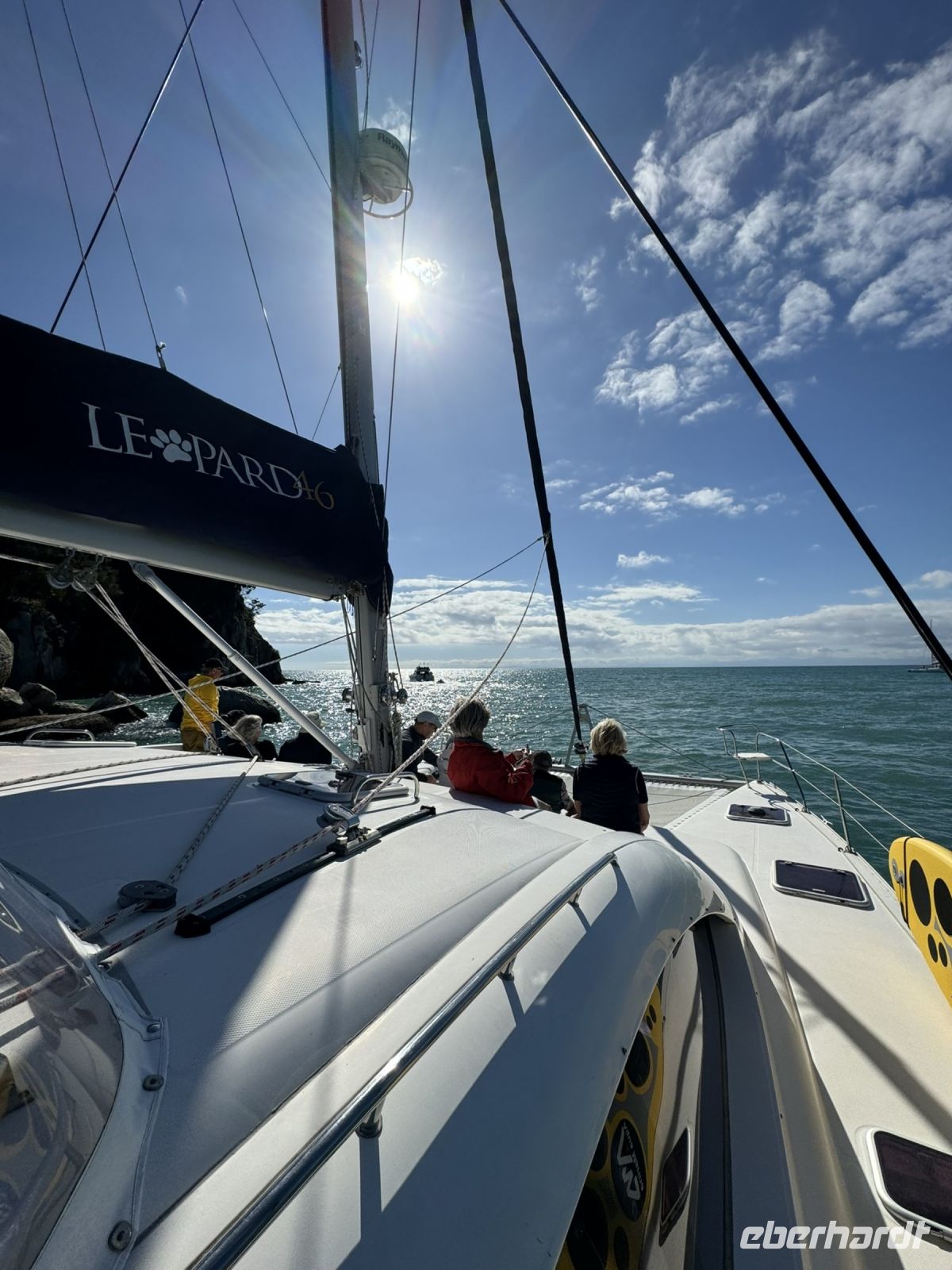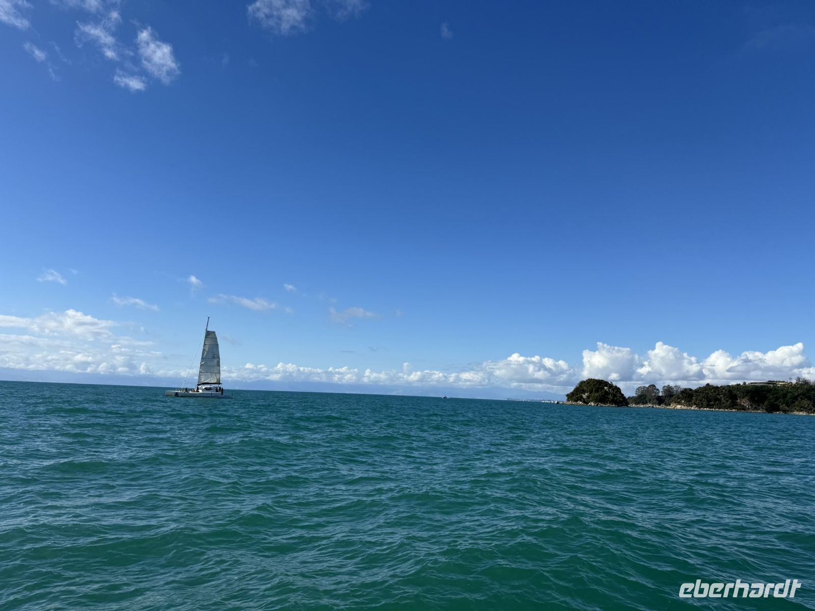 Am Anfang des Tages waren ein paar Wolken zu sehen, aber langsam kam die Sonne mit ihrer Kraft durch, um einen tollen Tag zu garantieren! Wir fuhren gemeinsam mit unserer lieben Sonja nach Kaiteriteri. Dort entdeckten wir einen wunderschönen Strand und eine Bucht und stiegen mit Hilfe eines kleinen Bootes in unseren exklusiv von Eberhardt gecharterten Katamaran ein. Während einer entspannten Fahrt im Abel Tasman Nationalpark konnten wir die Vögel hören und die Seebären beobachten. Anschließend machten wir eine kleine Wanderung. Dort sprangen wir ins Wasser für ein erfrischendes Bad, bevor wir unser Mittagessen genossen. Wir tankten Energie mit leckeren Portionen und genossen dieses kleine Paradies auf dem Rückweg.