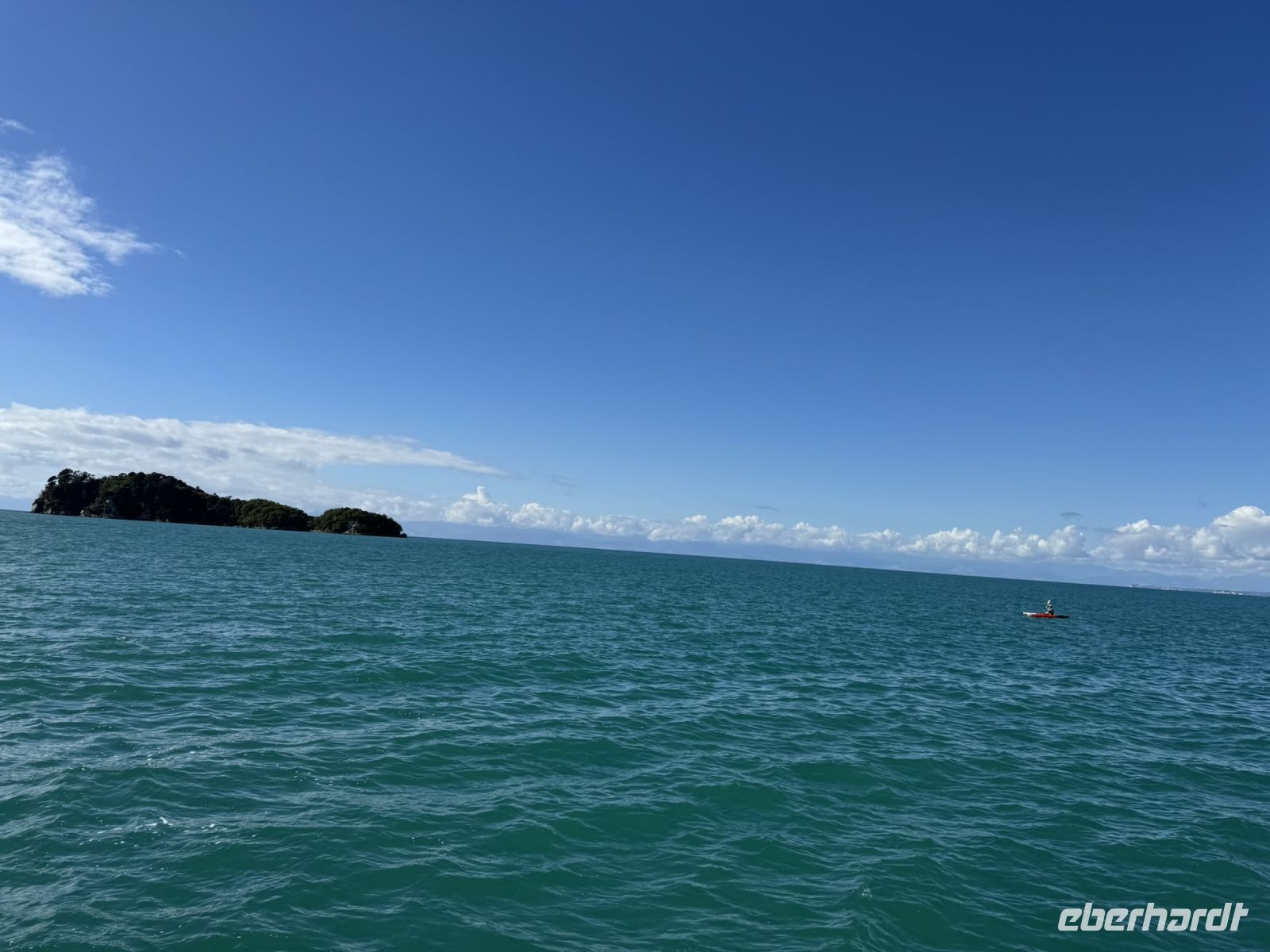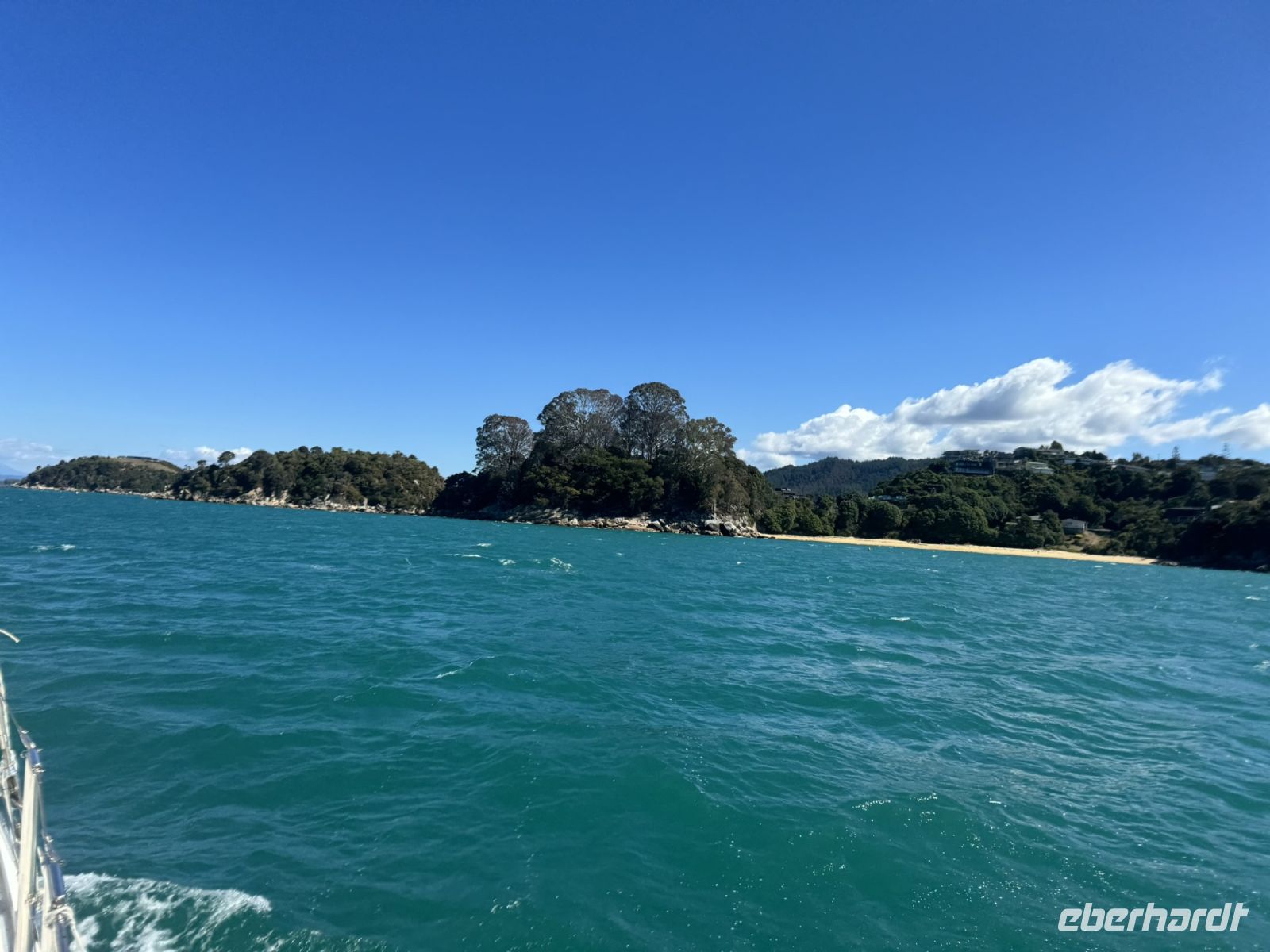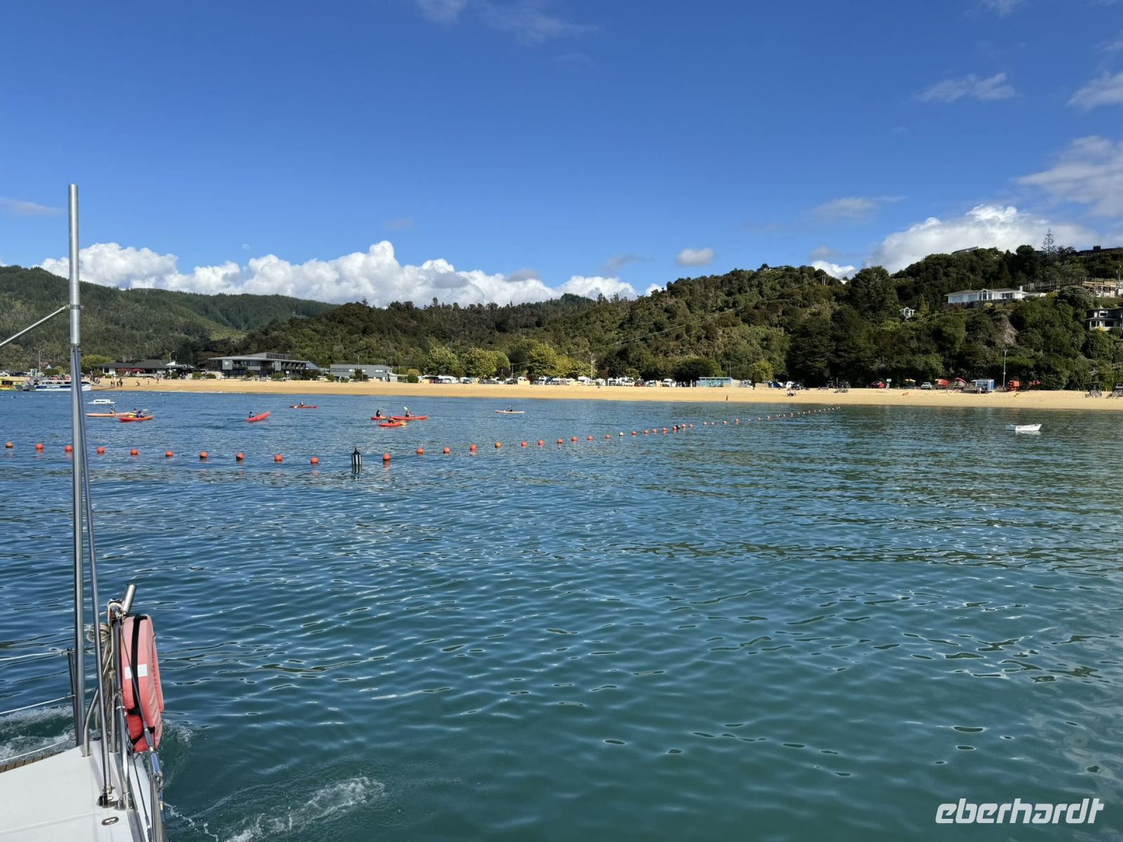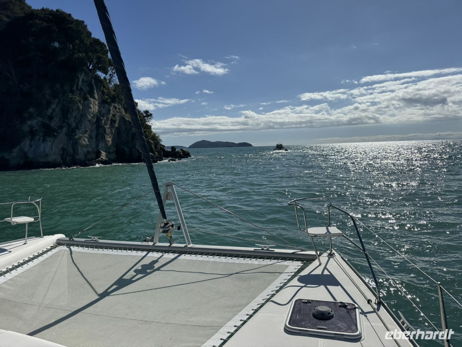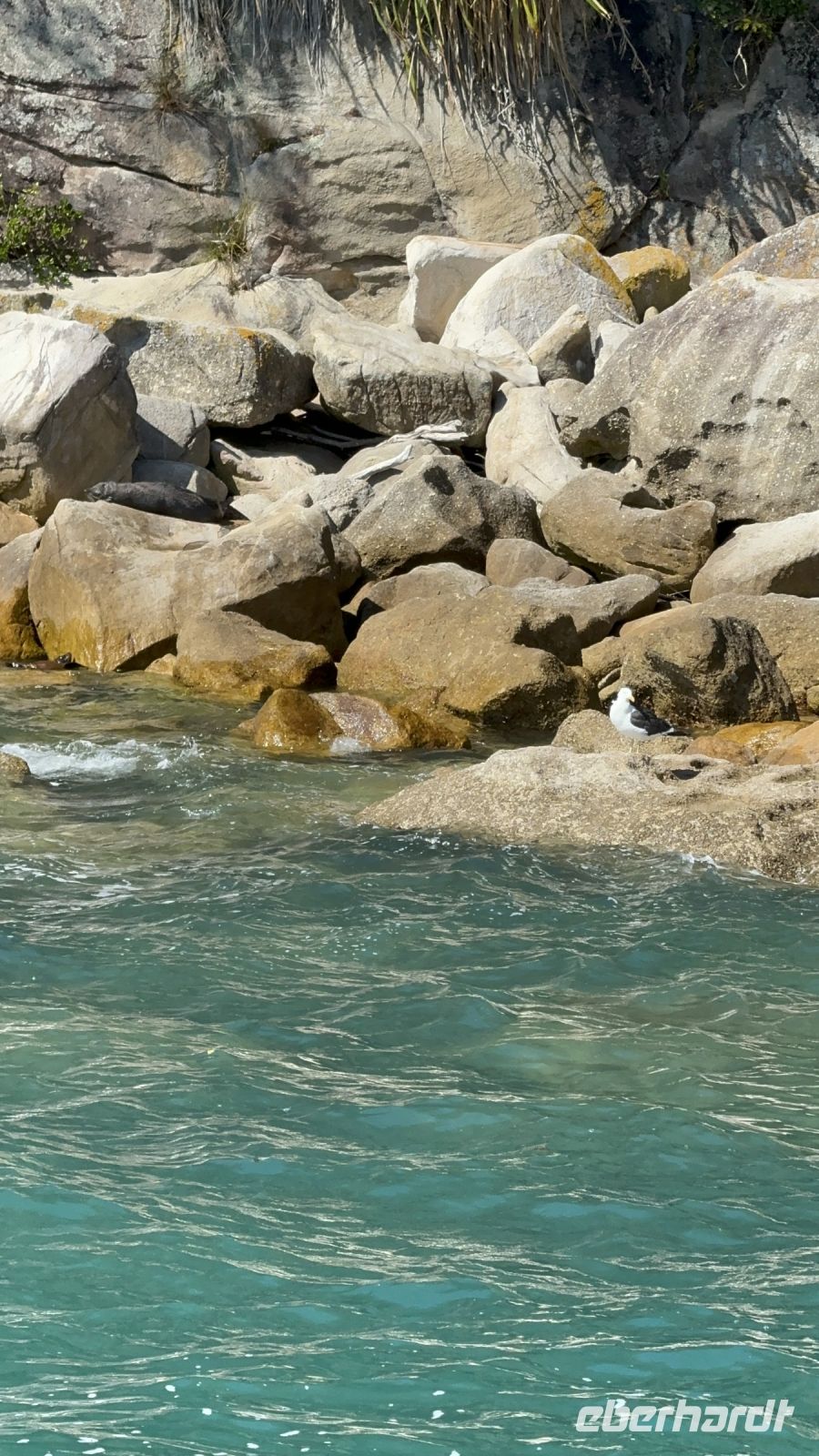 Am Anfang des Tages waren ein paar Wolken zu sehen, aber langsam kam die Sonne mit ihrer Kraft durch, um einen tollen Tag zu garantieren! Wir fuhren gemeinsam mit unserer lieben Sonja nach Kaiteriteri. Dort entdeckten wir einen wunderschönen Strand und eine Bucht und stiegen mit Hilfe eines kleinen Bootes in unseren exklusiv von Eberhardt gecharterten Katamaran ein. Während einer entspannten Fahrt im Abel Tasman Nationalpark konnten wir die Vögel hören und die Seebären beobachten. Anschließend machten wir eine kleine Wanderung. Dort sprangen wir ins Wasser für ein erfrischendes Bad, bevor wir unser Mittagessen genossen. Wir tankten Energie mit leckeren Portionen und genossen dieses kleine Paradies auf dem Rückweg.