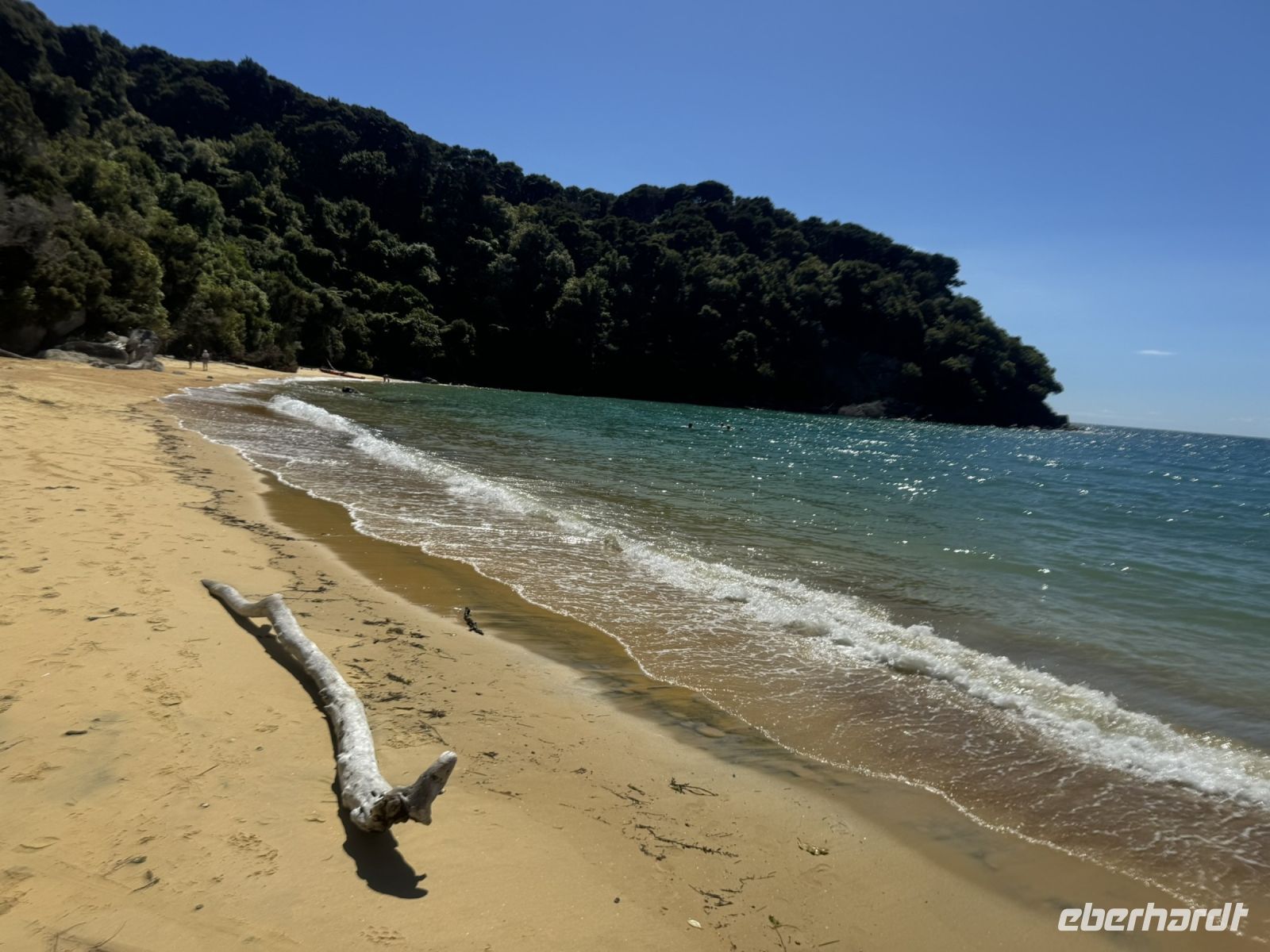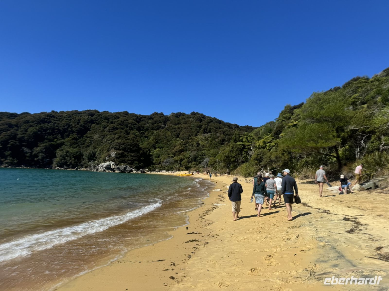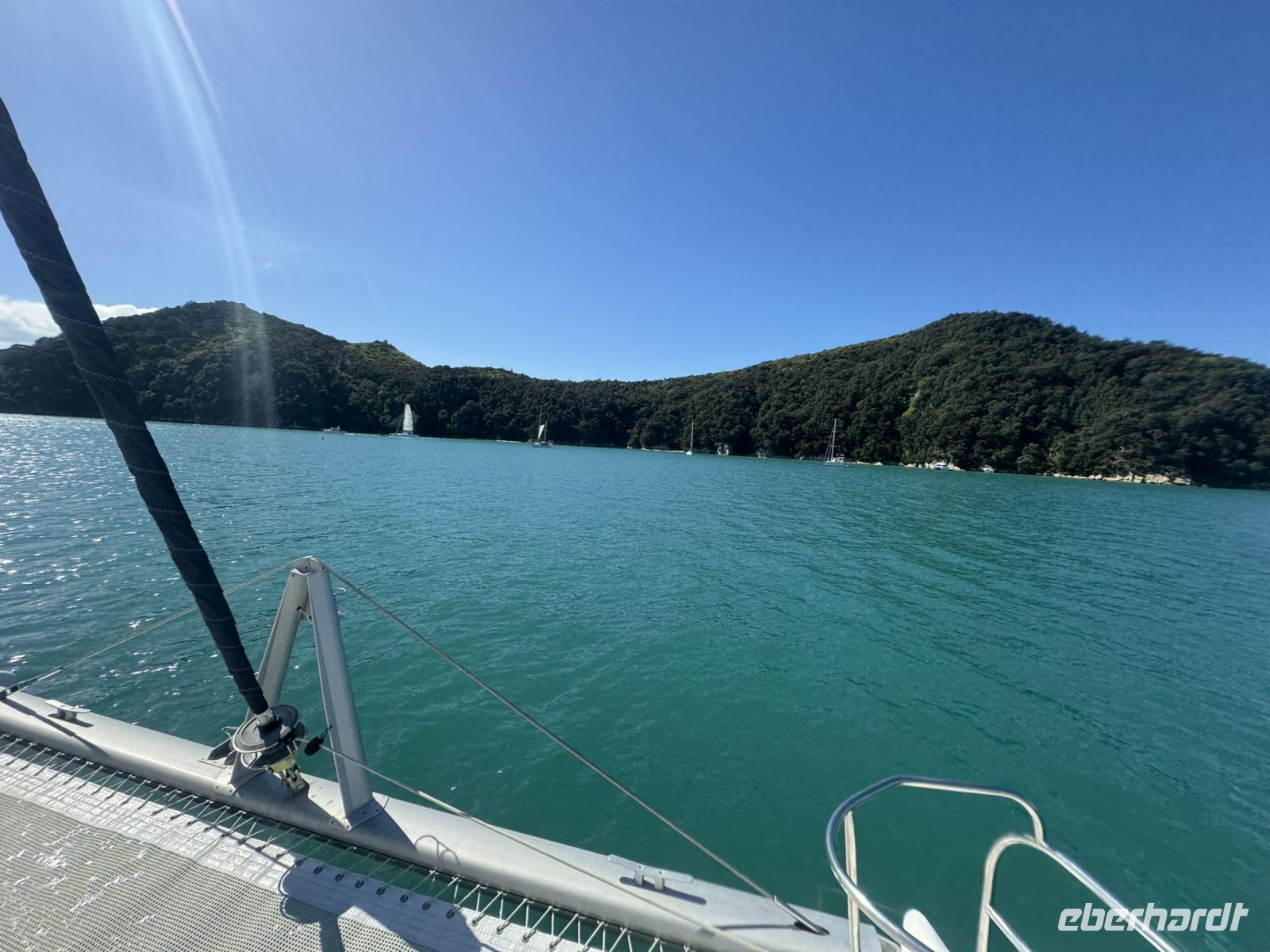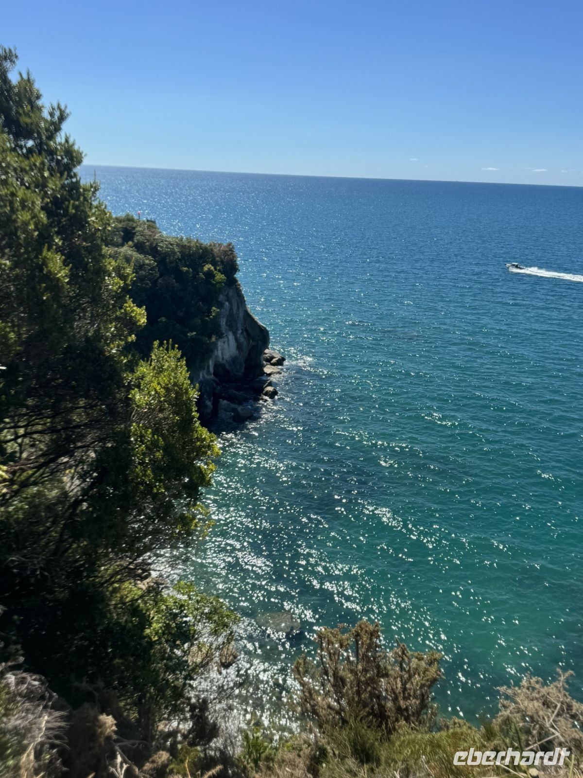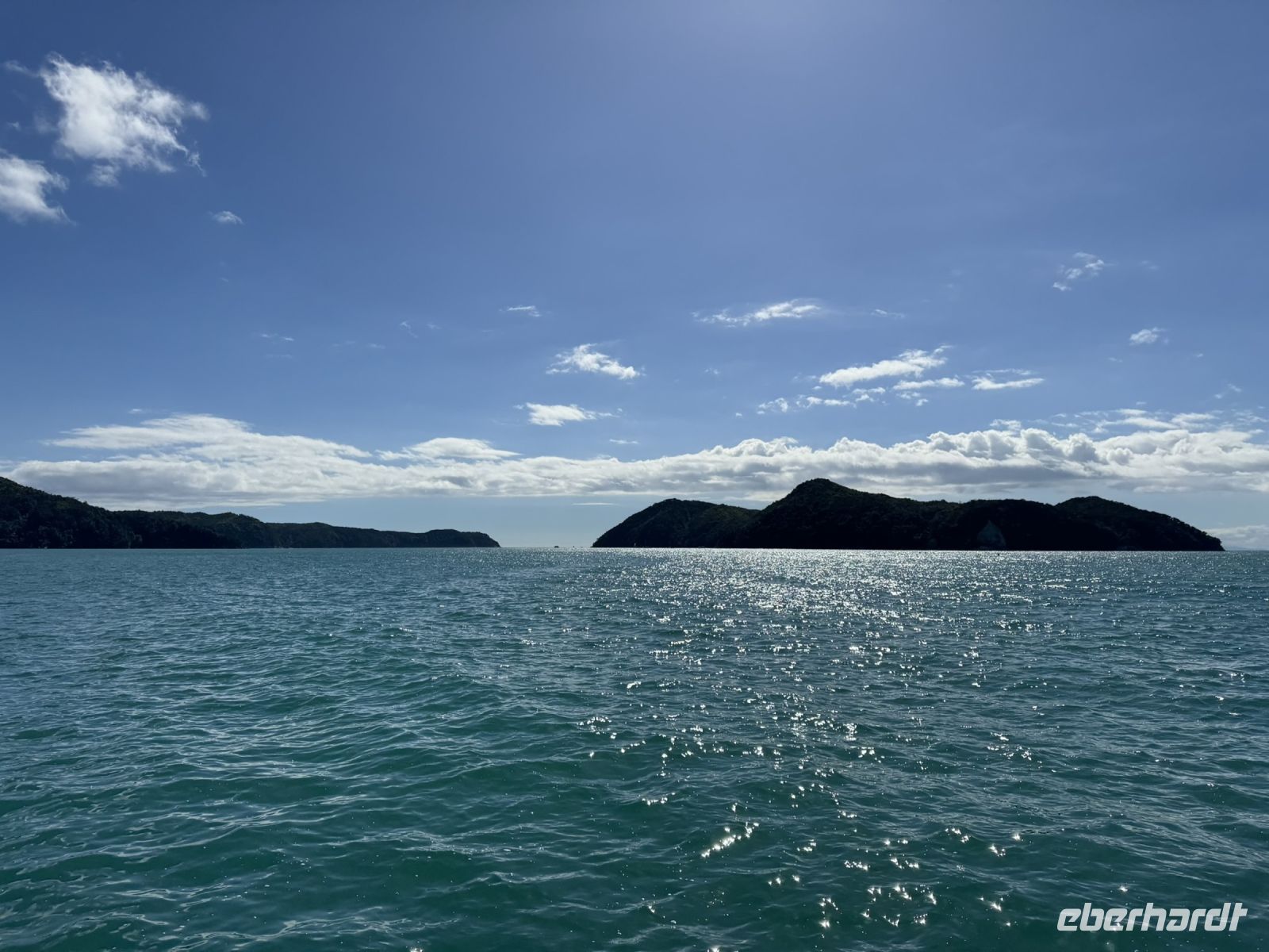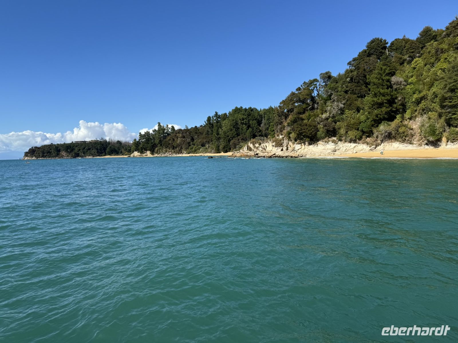 Am Anfang des Tages waren ein paar Wolken zu sehen, aber langsam kam die Sonne mit ihrer Kraft durch, um einen tollen Tag zu garantieren! Wir fuhren gemeinsam mit unserer lieben Sonja nach Kaiteriteri. Dort entdeckten wir einen wunderschönen Strand und eine Bucht und stiegen mit Hilfe eines kleinen Bootes in unseren exklusiv von Eberhardt gecharterten Katamaran ein. Während einer entspannten Fahrt im Abel Tasman Nationalpark konnten wir die Vögel hören und die Seebären beobachten. Anschließend machten wir eine kleine Wanderung. Dort sprangen wir ins Wasser für ein erfrischendes Bad, bevor wir unser Mittagessen genossen. Wir tankten Energie mit leckeren Portionen und genossen dieses kleine Paradies auf dem Rückweg.