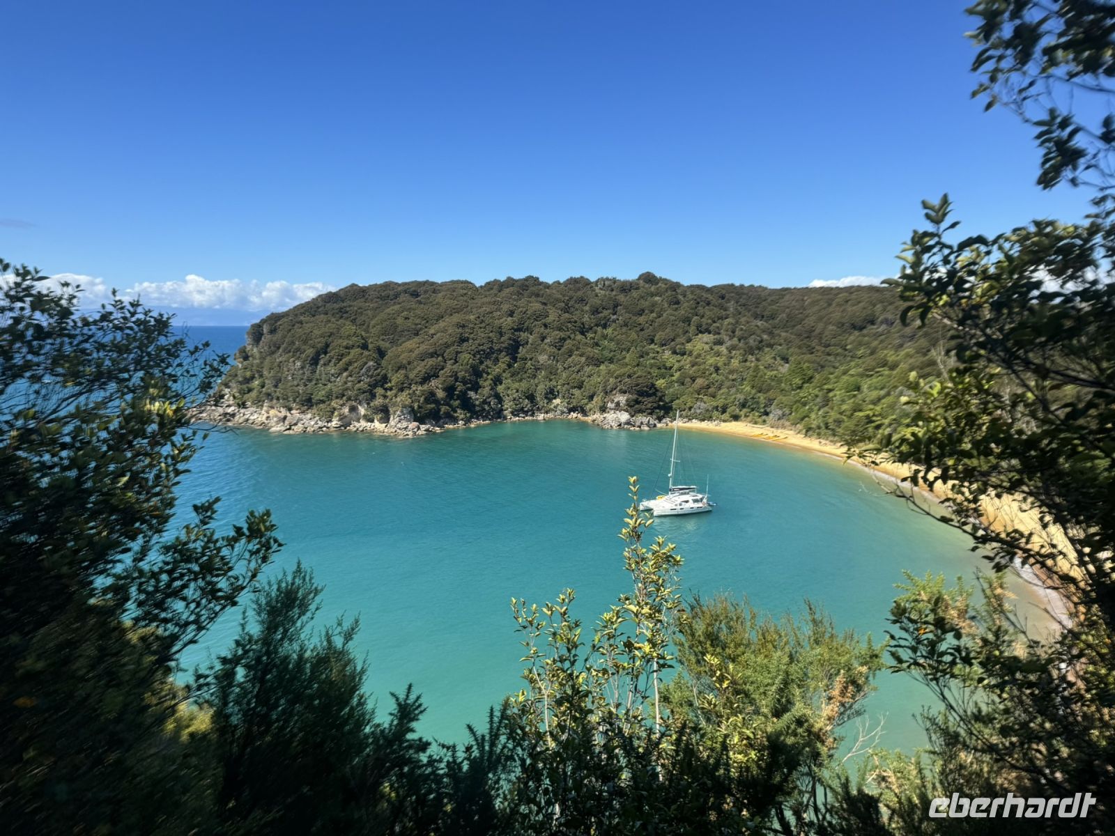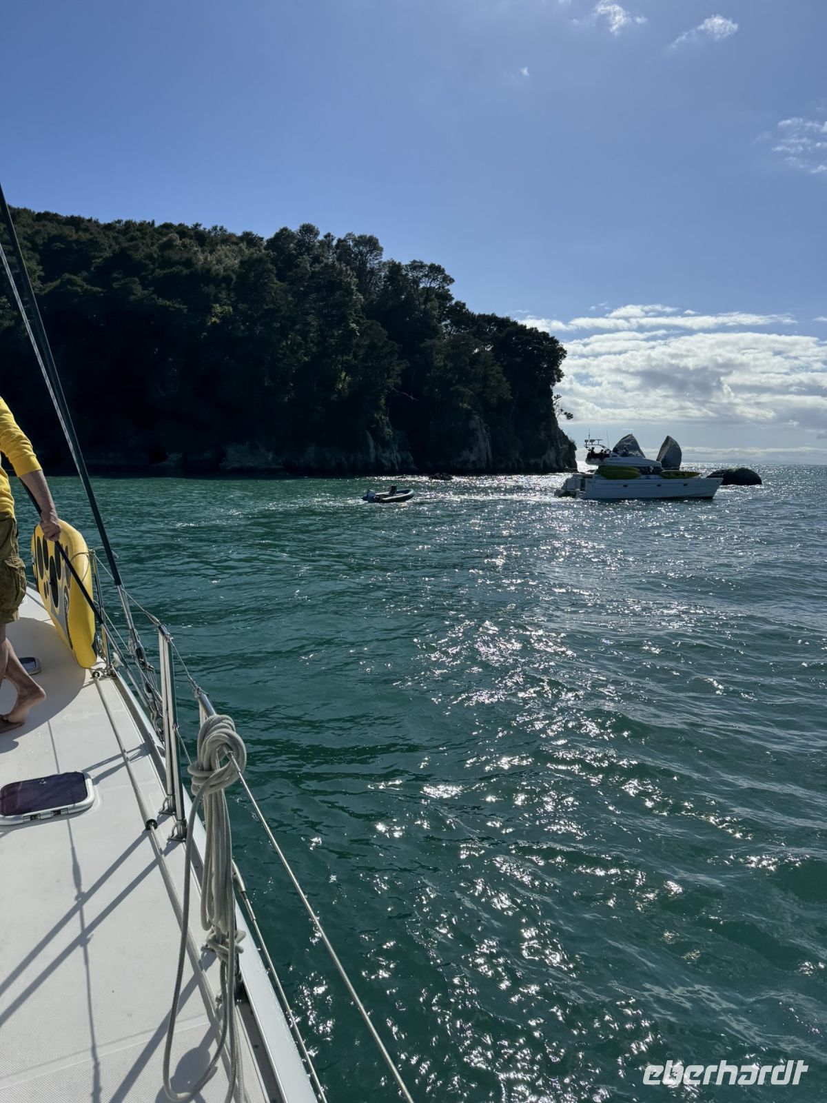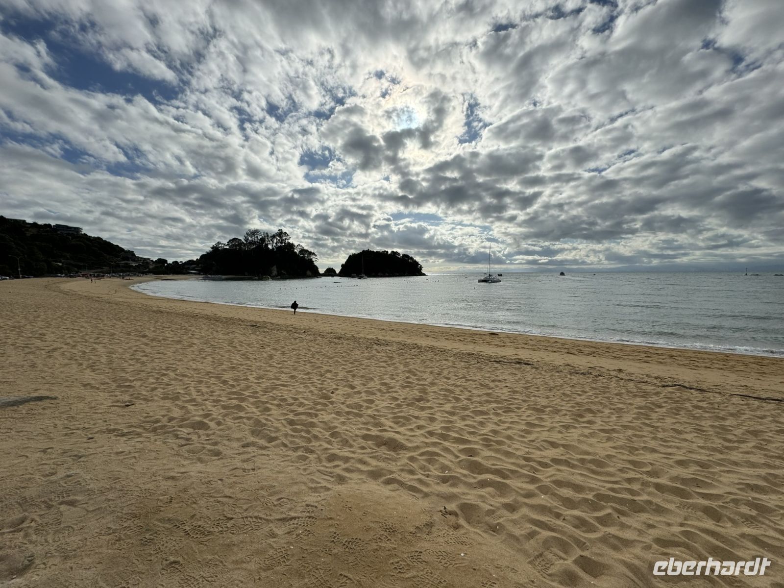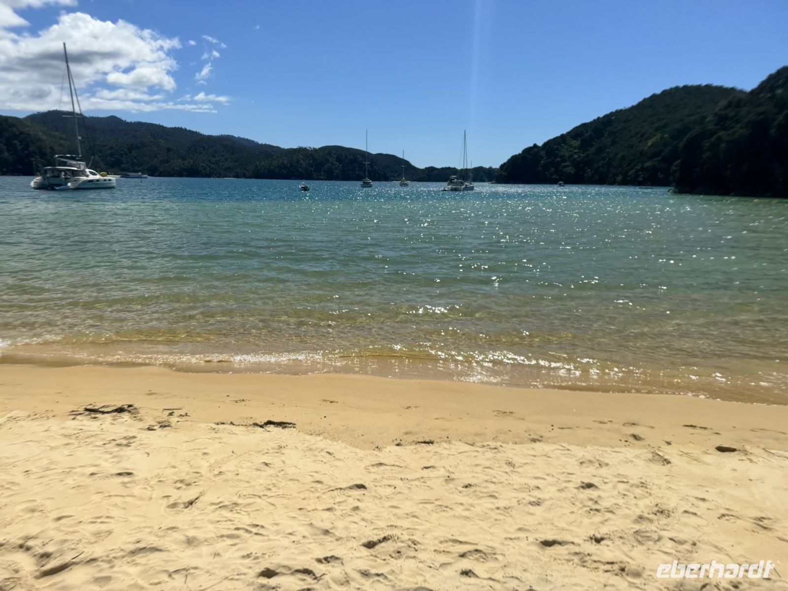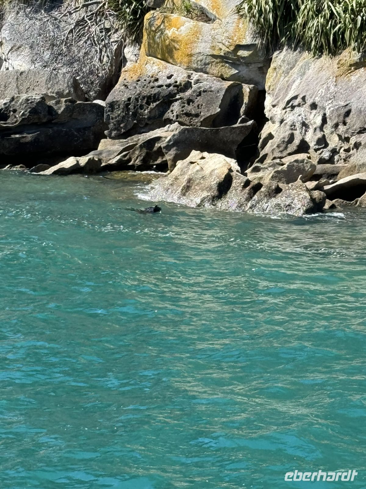 Am Anfang des Tages waren ein paar Wolken zu sehen, aber langsam kam die Sonne mit ihrer Kraft durch, um einen tollen Tag zu garantieren! Wir fuhren gemeinsam mit unserer lieben Sonja nach Kaiteriteri. Dort entdeckten wir einen wunderschönen Strand und eine Bucht und stiegen mit Hilfe eines kleinen Bootes in unseren exklusiv von Eberhardt gecharterten Katamaran ein. Während einer entspannten Fahrt im Abel Tasman Nationalpark konnten wir die Vögel hören und die Seebären beobachten. Anschließend machten wir eine kleine Wanderung. Dort sprangen wir ins Wasser für ein erfrischendes Bad, bevor wir unser Mittagessen genossen. Wir tankten Energie mit leckeren Portionen und genossen dieses kleine Paradies auf dem Rückweg.