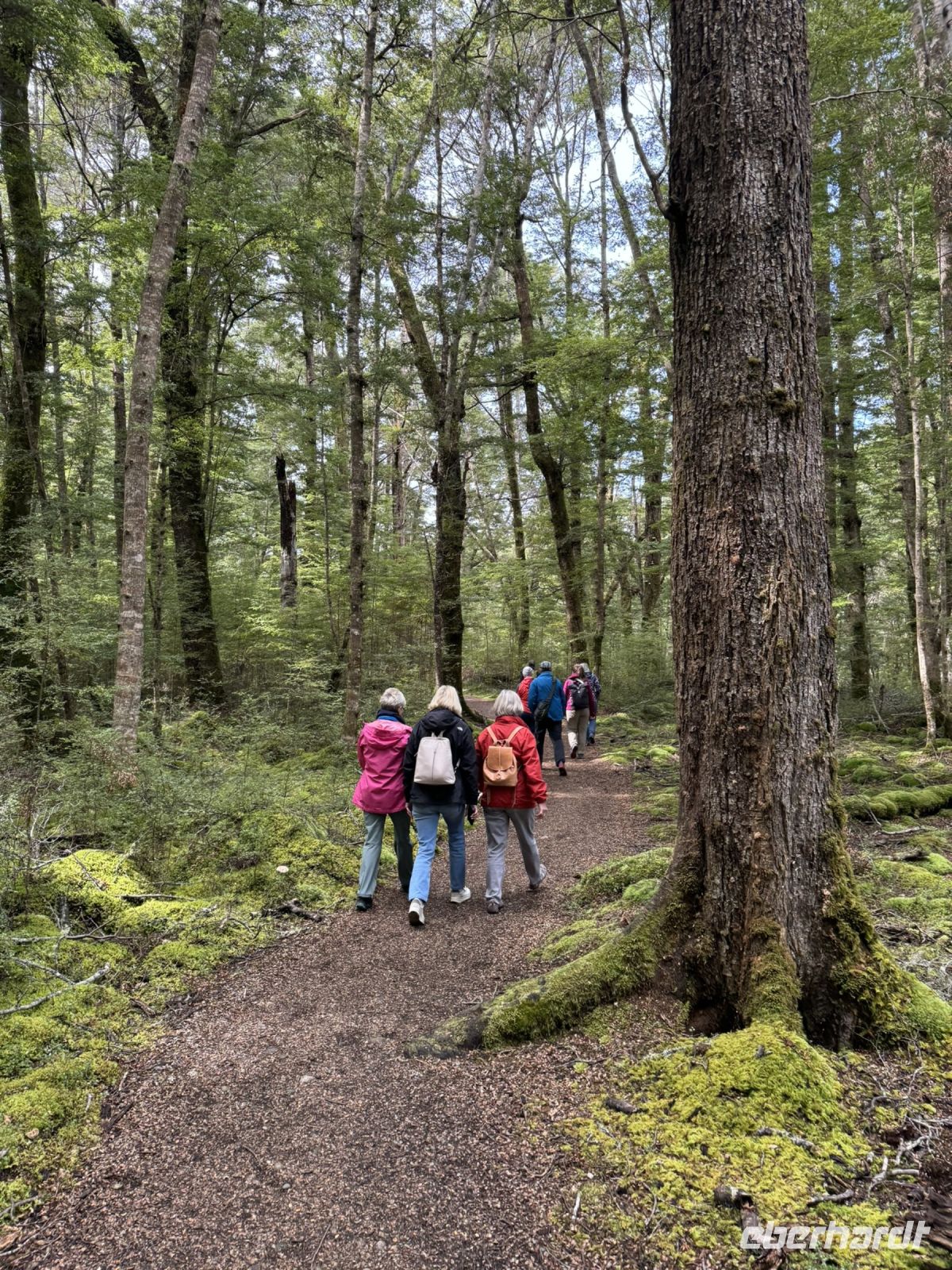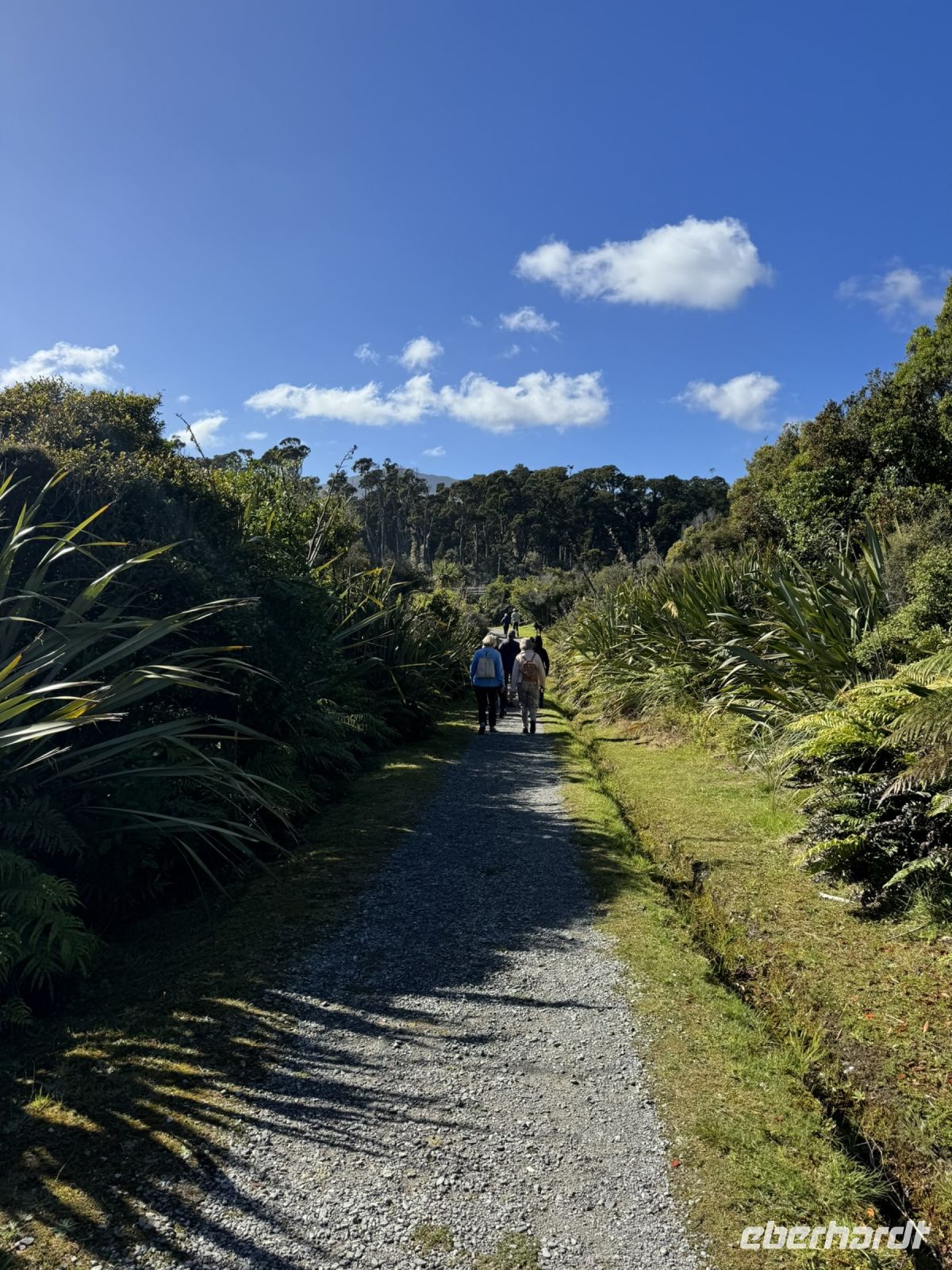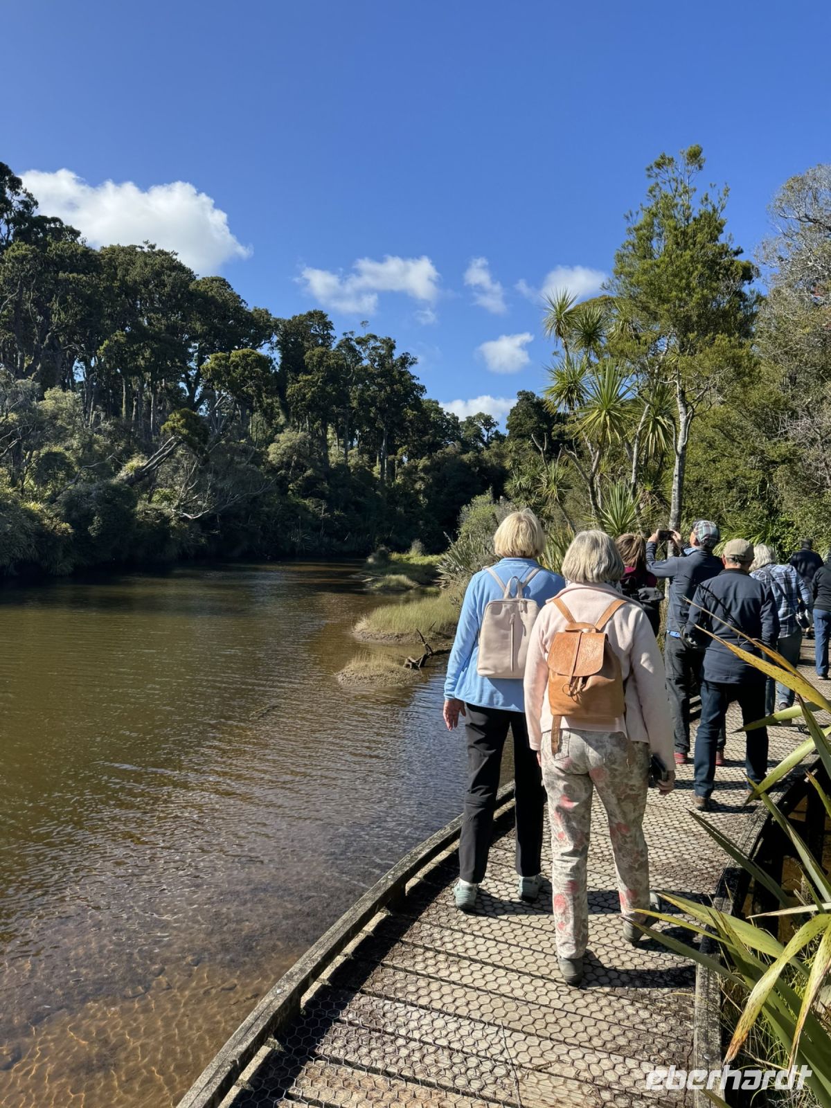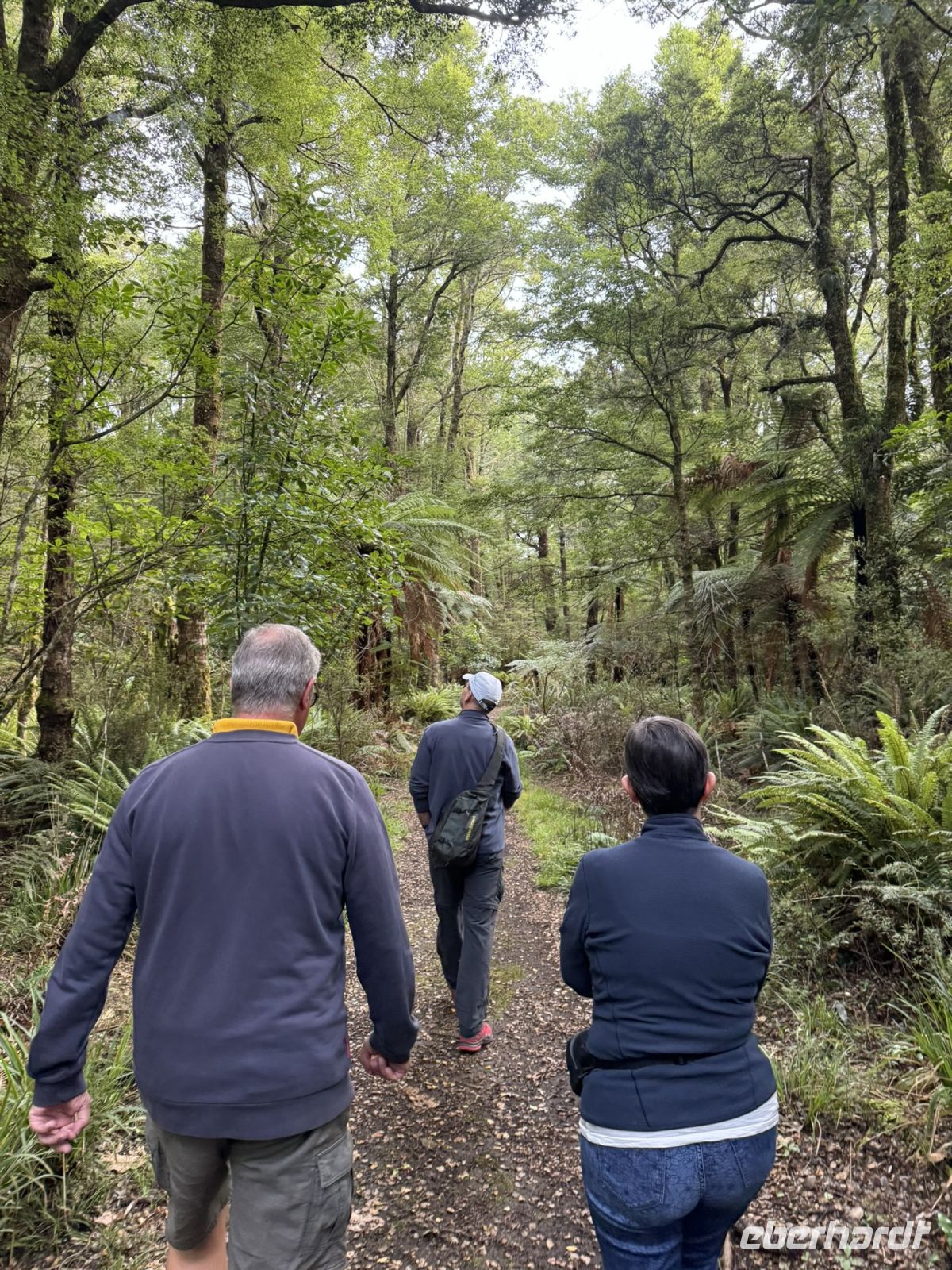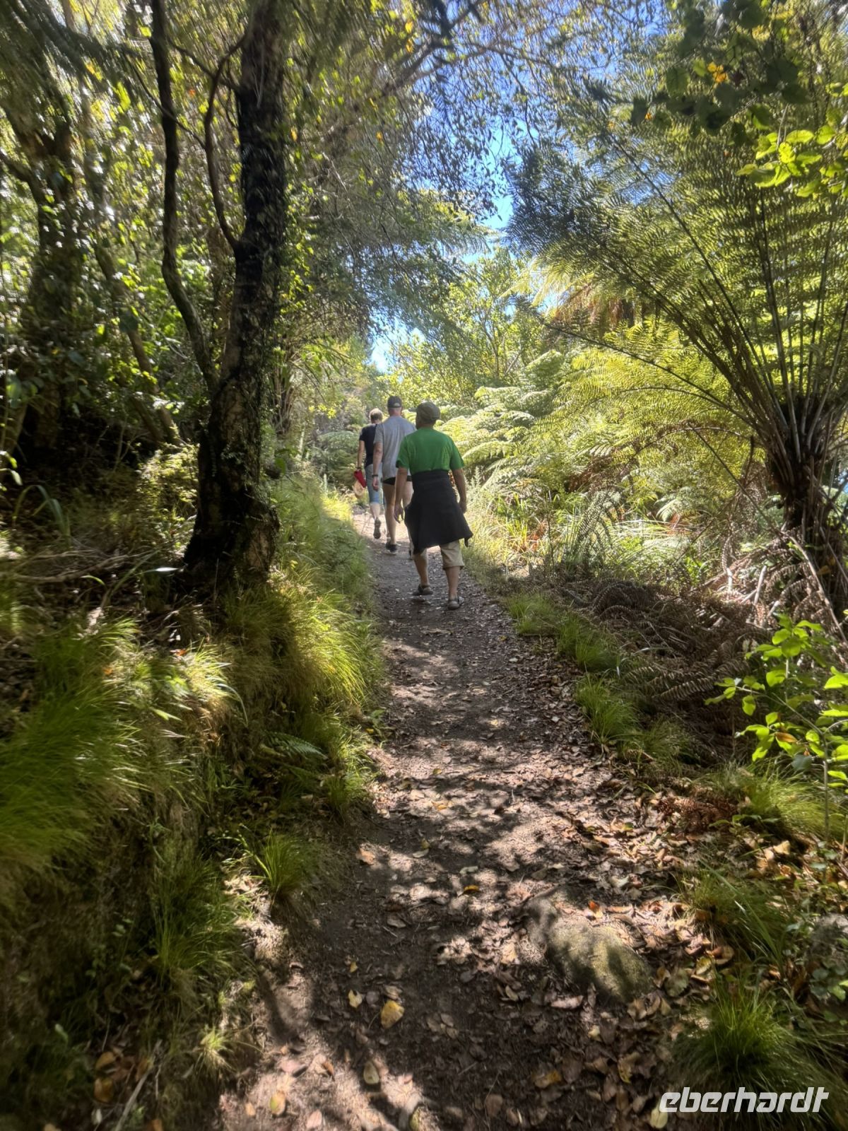 Bei unserer Wanderung am Vormittag war es zuerst etwas steil, aber dann wurde es sehr angenehm, bis wir einen umgestürzten Baum in der Mitte des Weges fanden. Das machte die Route noch schöner und langsam kamen wir am See an. Wir gingen einmal um den See herum und dann noch ein Stück weiter zum zweiten See, wo wir die beeindruckende Schönheit der Natur erlebten. Am Ende unserer Route feierten wir Jörgs Geburtstagsparty und setzten unsere Fahrt mit den Sonnenstrahlen fort. Unsere Mittagspause machten wir in Viv's Kitchen, wo wir die besten Sahnehörnchen des Landes probieren mussten! Anschließend hielten wir in Rapihi zum Einkaufen an und schauten uns die typische Marke Icebreaker an. Zum Abschluss besuchten wir das Naturreservat Nga Manu, wo wir einen echten Kiwi sowie Tuatara, Kea, Weta und andere einheimische Arten sehen konnten. Dort machten wir auch einen schönen Spaziergang durch den Wald.