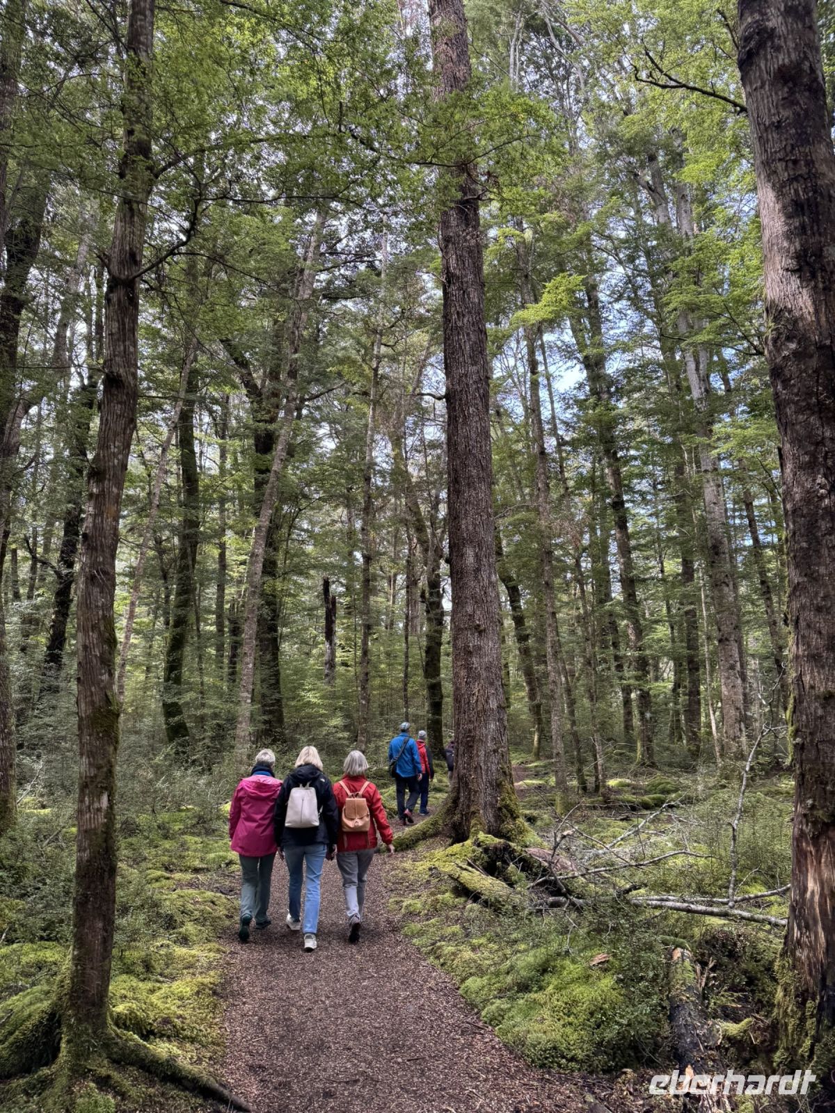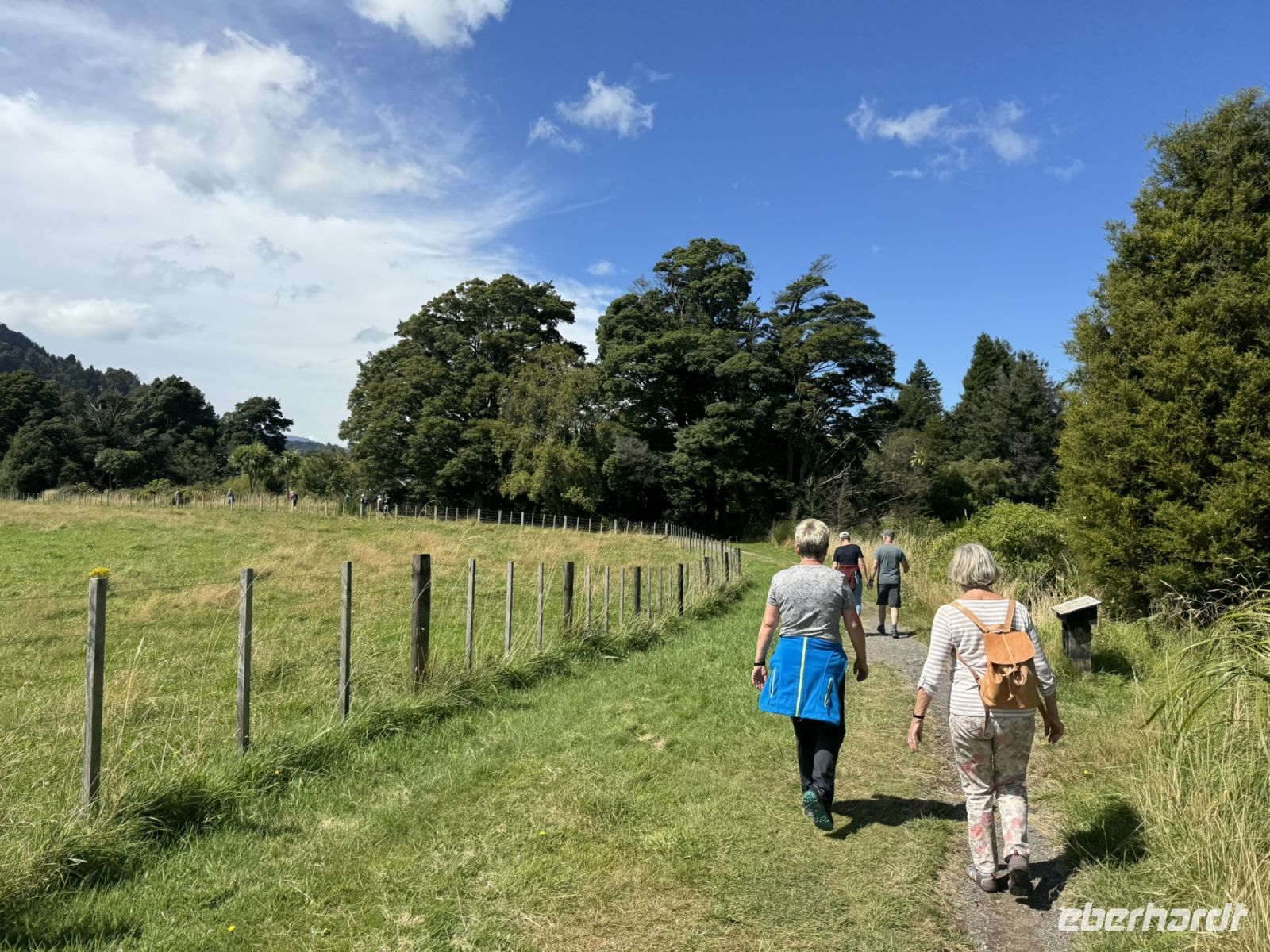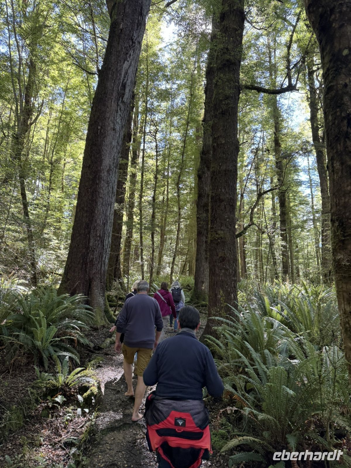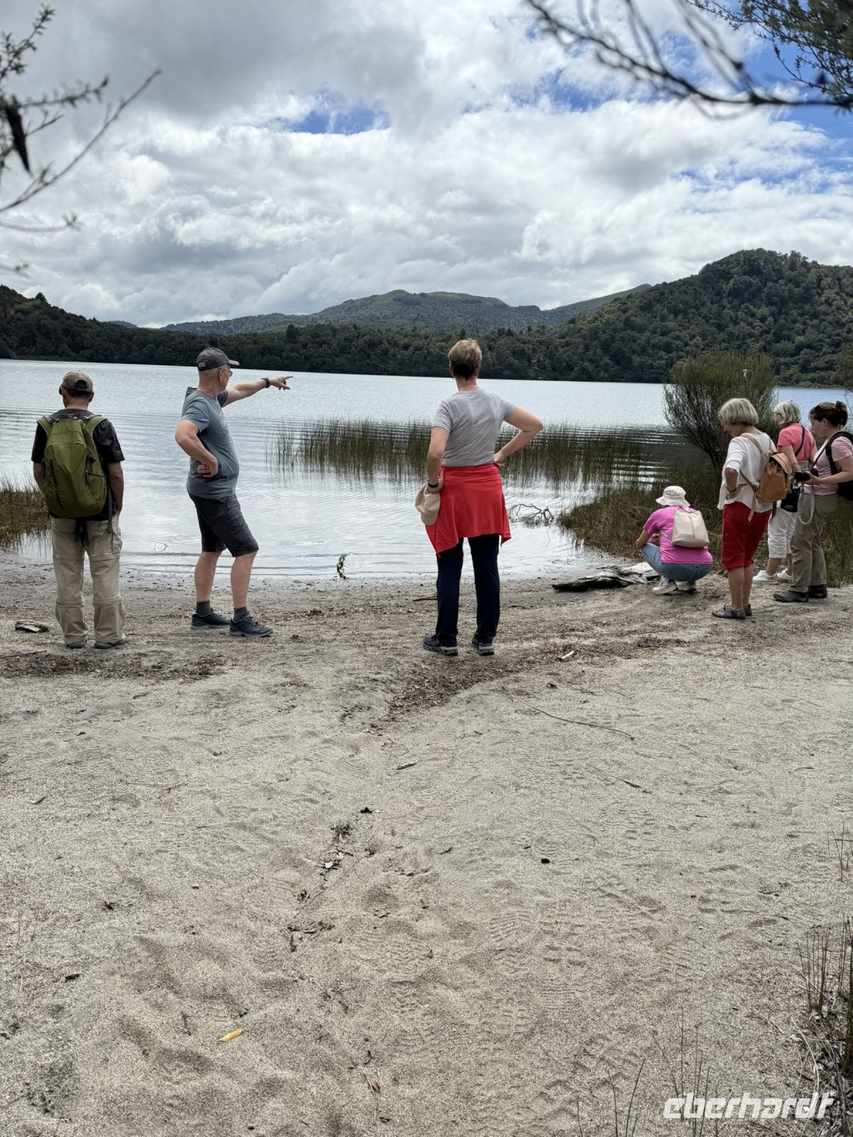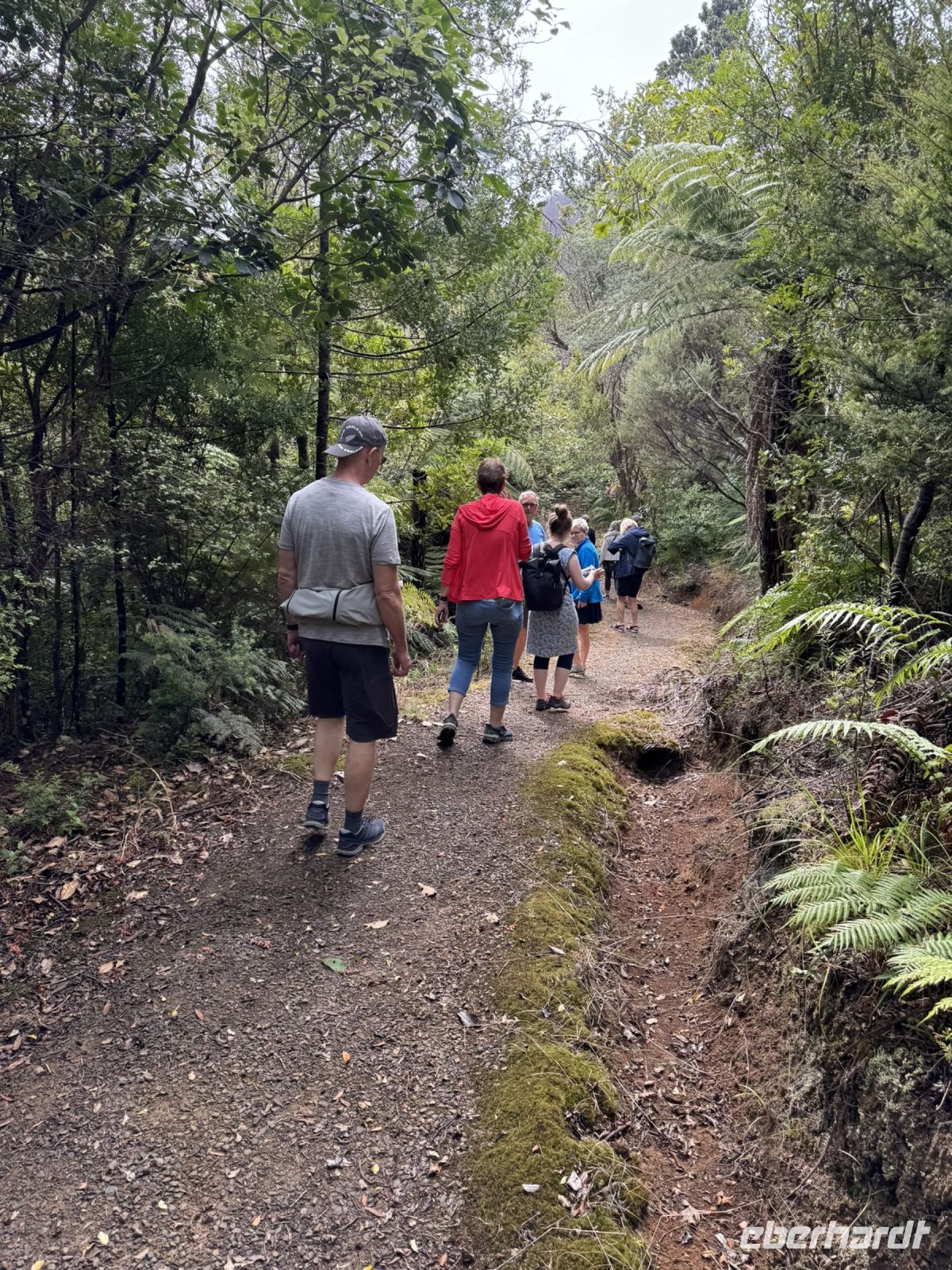 Bei unserer Wanderung am Vormittag war es zuerst etwas steil, aber dann wurde es sehr angenehm, bis wir einen umgestürzten Baum in der Mitte des Weges fanden. Das machte die Route noch schöner und langsam kamen wir am See an. Wir gingen einmal um den See herum und dann noch ein Stück weiter zum zweiten See, wo wir die beeindruckende Schönheit der Natur erlebten. Am Ende unserer Route feierten wir Jörgs Geburtstagsparty und setzten unsere Fahrt mit den Sonnenstrahlen fort. Unsere Mittagspause machten wir in Viv's Kitchen, wo wir die besten Sahnehörnchen des Landes probieren mussten! Anschließend hielten wir in Rapihi zum Einkaufen an und schauten uns die typische Marke Icebreaker an. Zum Abschluss besuchten wir das Naturreservat Nga Manu, wo wir einen echten Kiwi sowie Tuatara, Kea, Weta und andere einheimische Arten sehen konnten. Dort machten wir auch einen schönen Spaziergang durch den Wald.