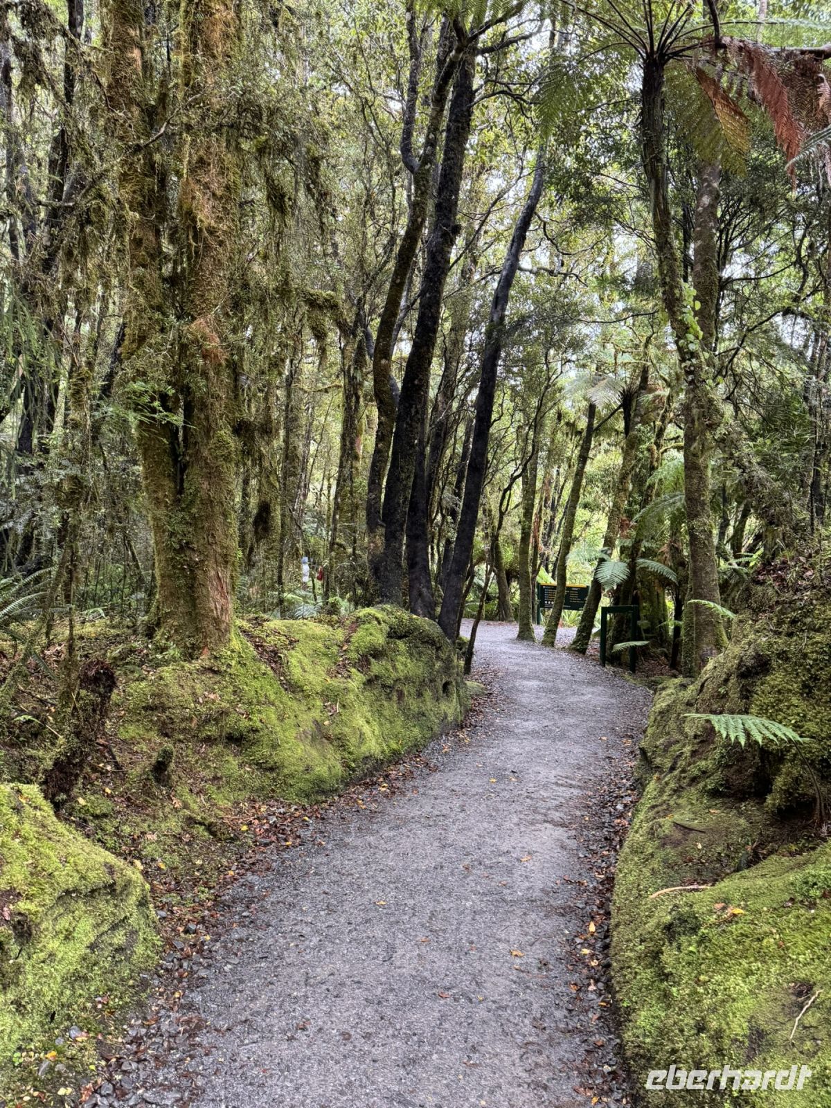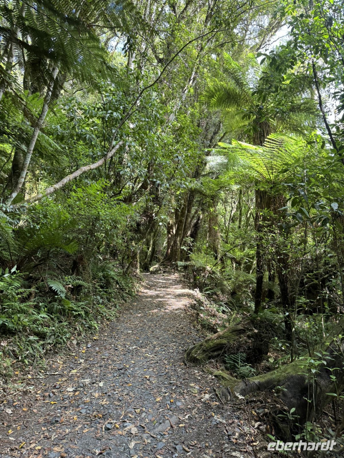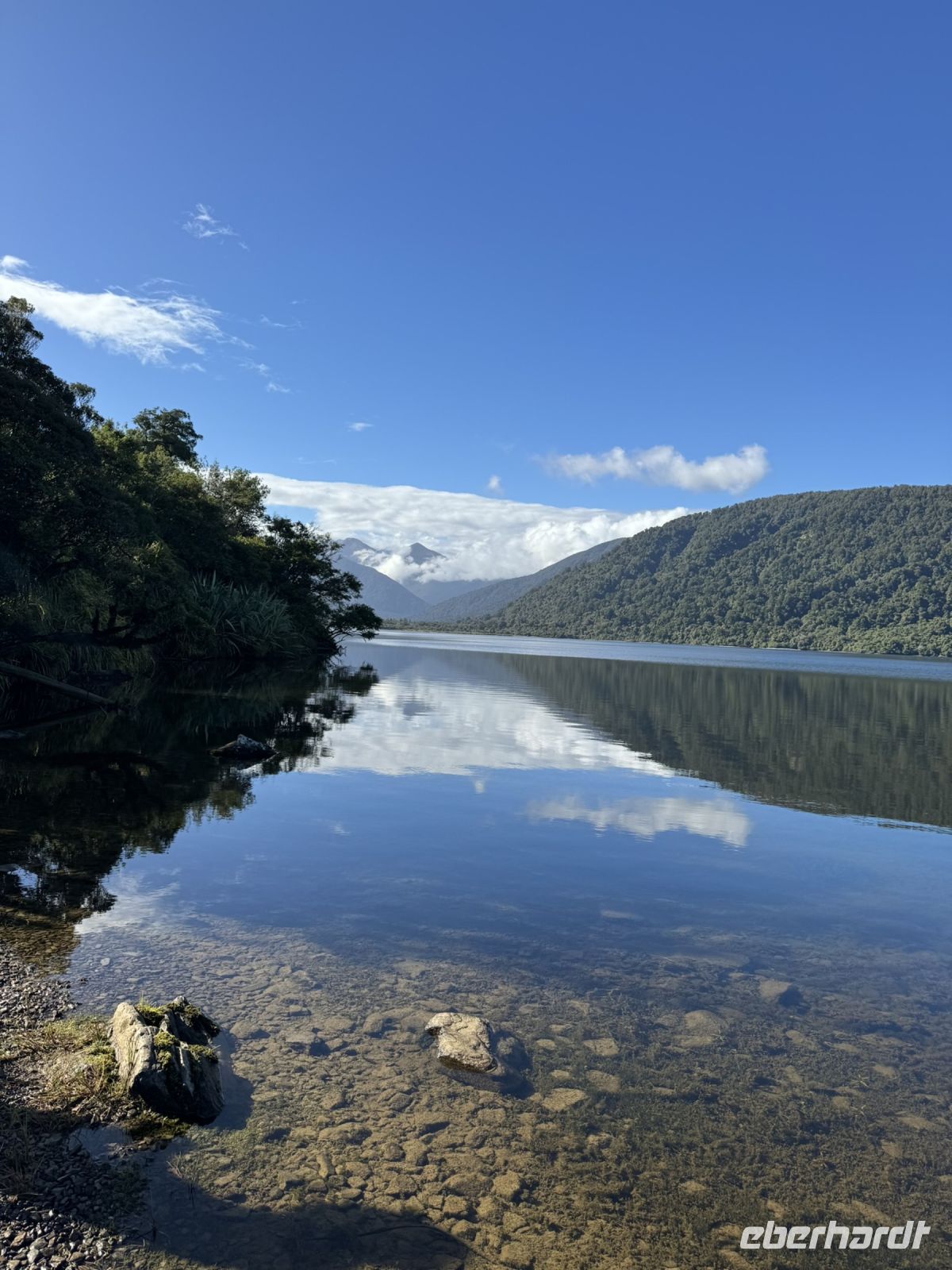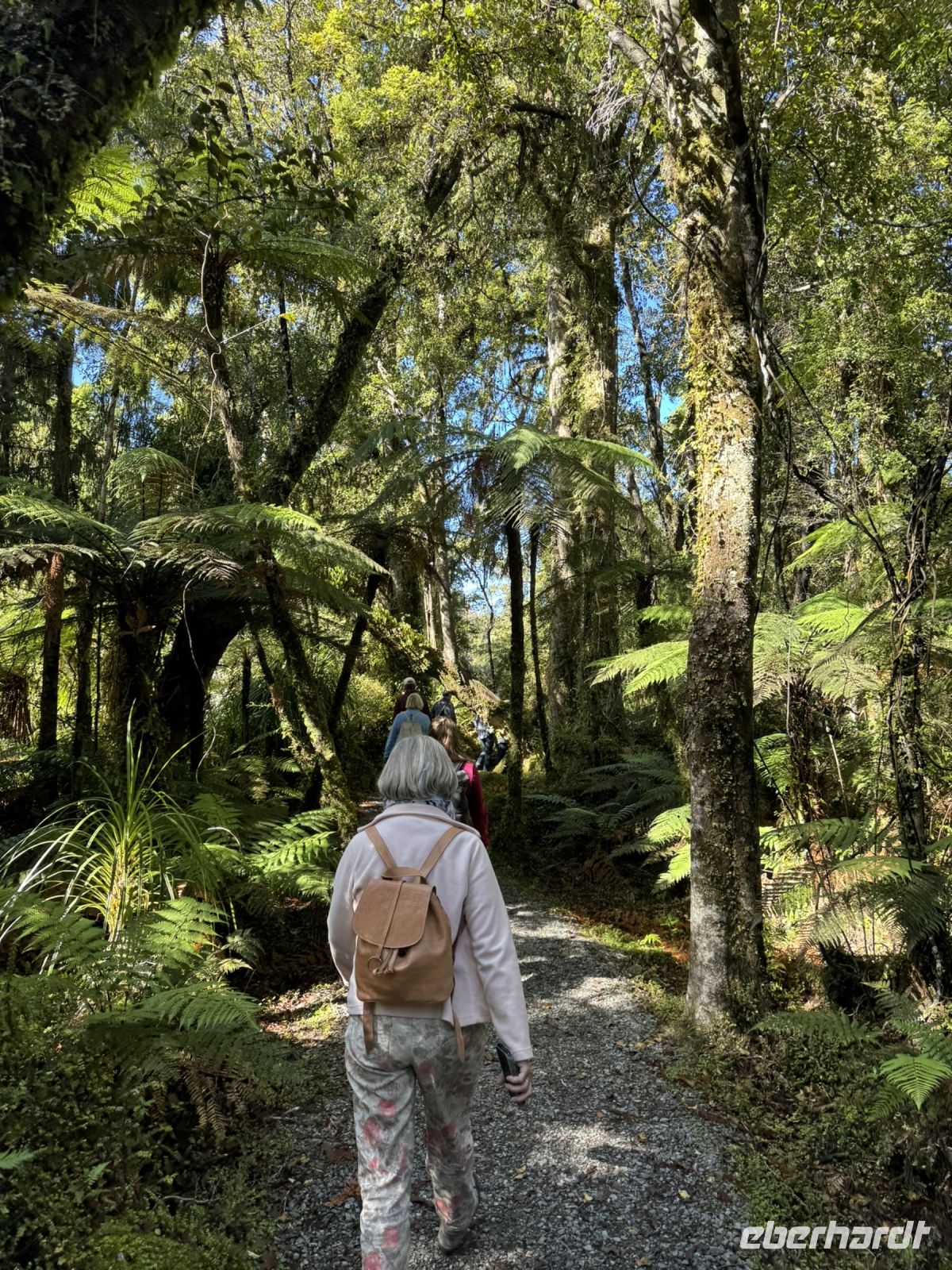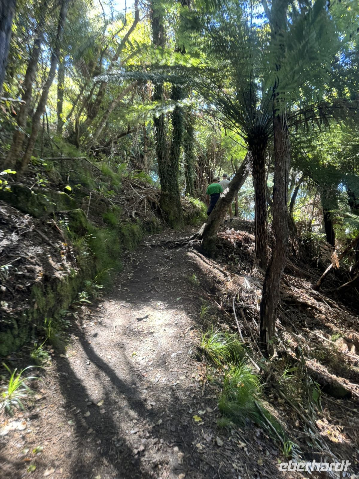 Bei unserer Wanderung am Vormittag war es zuerst etwas steil, aber dann wurde es sehr angenehm, bis wir einen umgestürzten Baum in der Mitte des Weges fanden. Das machte die Route noch schöner und langsam kamen wir am See an. Wir gingen einmal um den See herum und dann noch ein Stück weiter zum zweiten See, wo wir die beeindruckende Schönheit der Natur erlebten. Am Ende unserer Route feierten wir Jörgs Geburtstagsparty und setzten unsere Fahrt mit den Sonnenstrahlen fort. Unsere Mittagspause machten wir in Viv's Kitchen, wo wir die besten Sahnehörnchen des Landes probieren mussten! Anschließend hielten wir in Rapihi zum Einkaufen an und schauten uns die typische Marke Icebreaker an. Zum Abschluss besuchten wir das Naturreservat Nga Manu, wo wir einen echten Kiwi sowie Tuatara, Kea, Weta und andere einheimische Arten sehen konnten. Dort machten wir auch einen schönen Spaziergang durch den Wald.