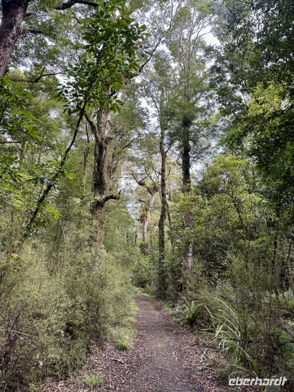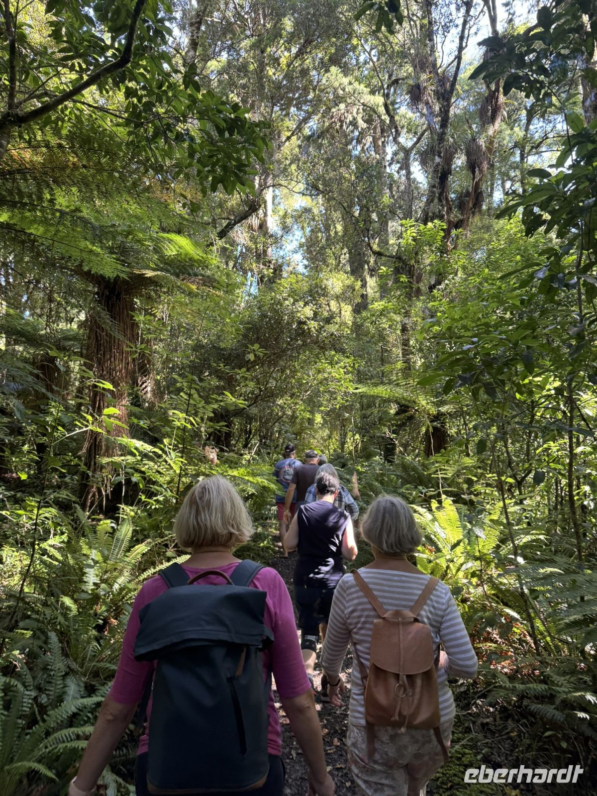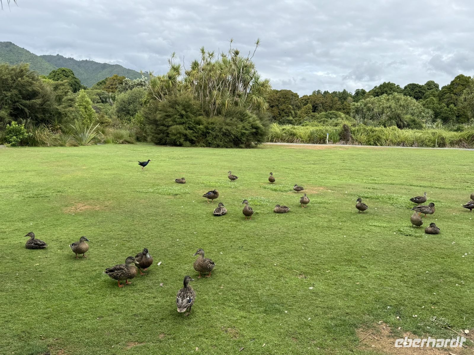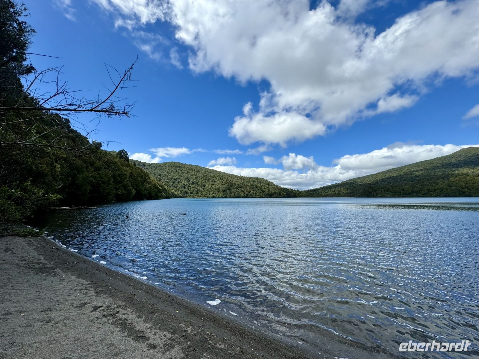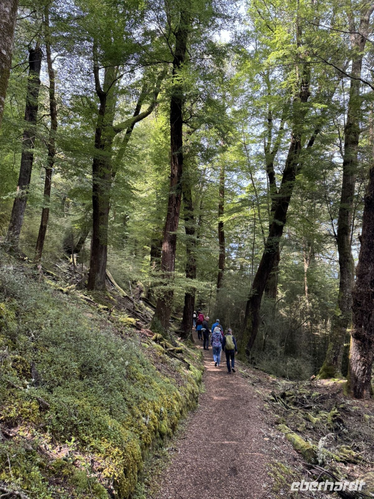 Bei unserer Wanderung am Vormittag war es zuerst etwas steil, aber dann wurde es sehr angenehm, bis wir einen umgestürzten Baum in der Mitte des Weges fanden. Das machte die Route noch schöner und langsam kamen wir am See an. Wir gingen einmal um den See herum und dann noch ein Stück weiter zum zweiten See, wo wir die beeindruckende Schönheit der Natur erlebten. Am Ende unserer Route feierten wir Jörgs Geburtstagsparty und setzten unsere Fahrt mit den Sonnenstrahlen fort. Unsere Mittagspause machten wir in Viv's Kitchen, wo wir die besten Sahnehörnchen des Landes probieren mussten! Anschließend hielten wir in Rapihi zum Einkaufen an und schauten uns die typische Marke Icebreaker an. Zum Abschluss besuchten wir das Naturreservat Nga Manu, wo wir einen echten Kiwi sowie Tuatara, Kea, Weta und andere einheimische Arten sehen konnten. Dort machten wir auch einen schönen Spaziergang durch den Wald.