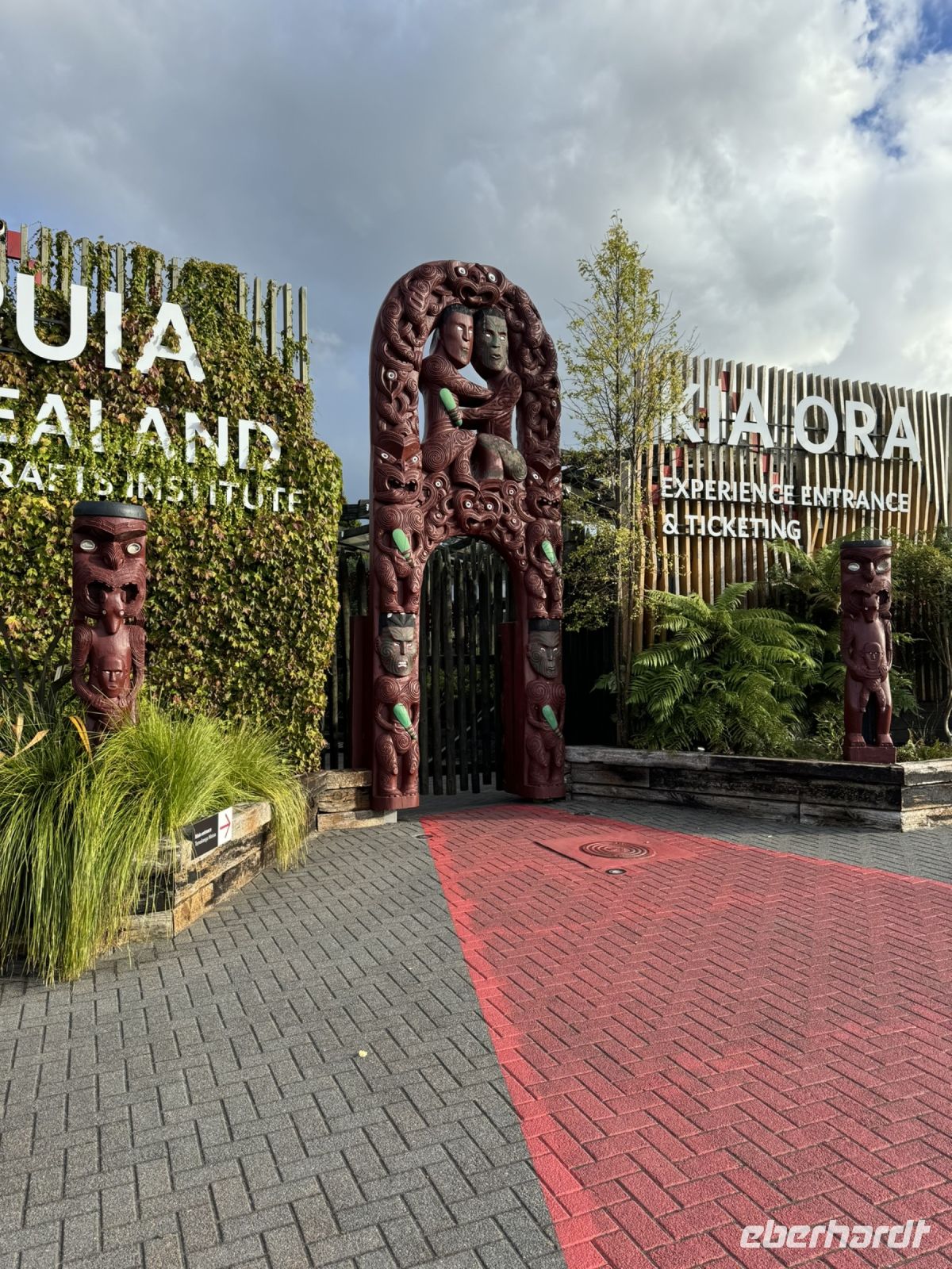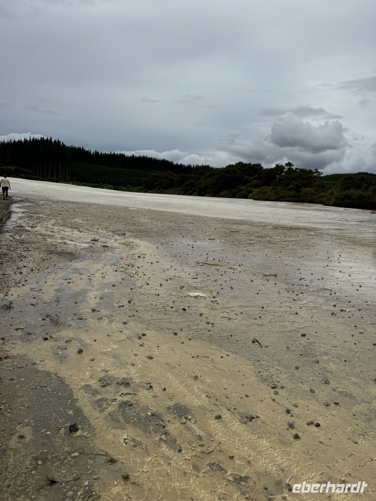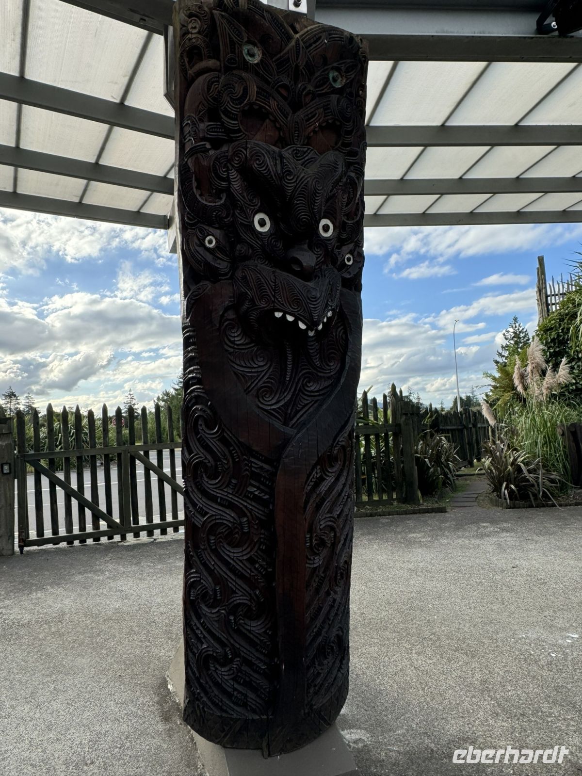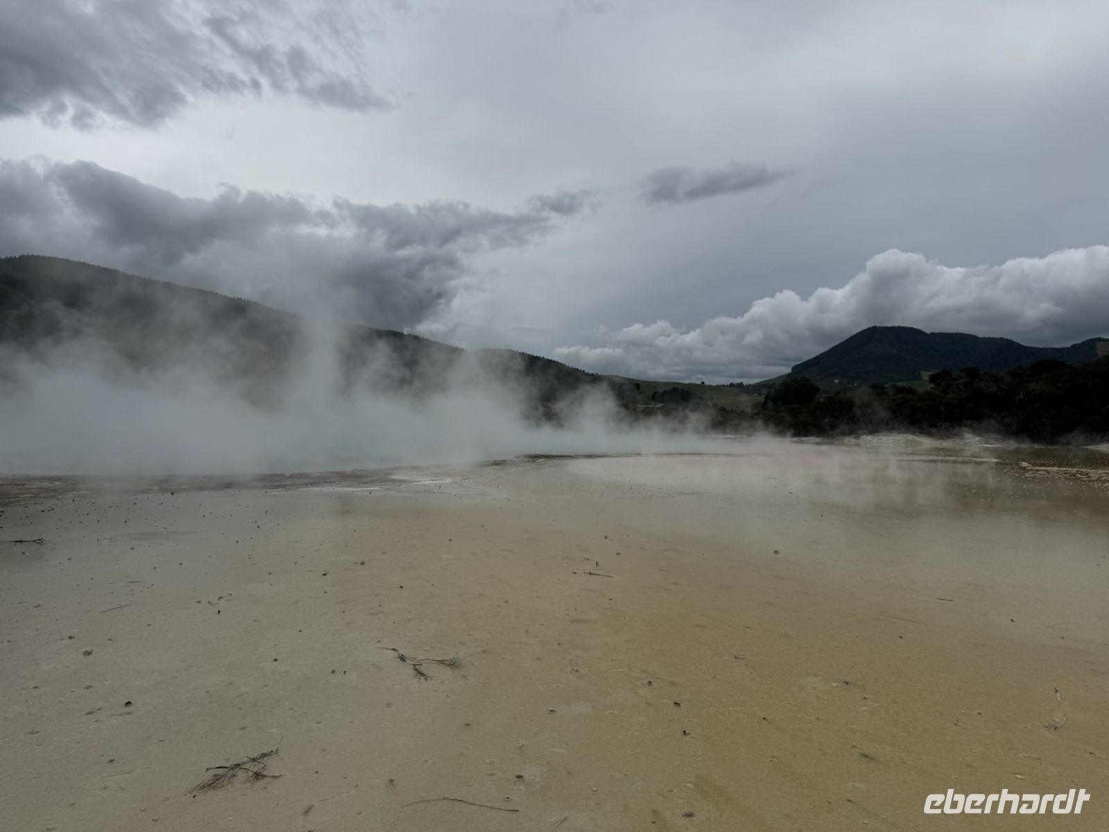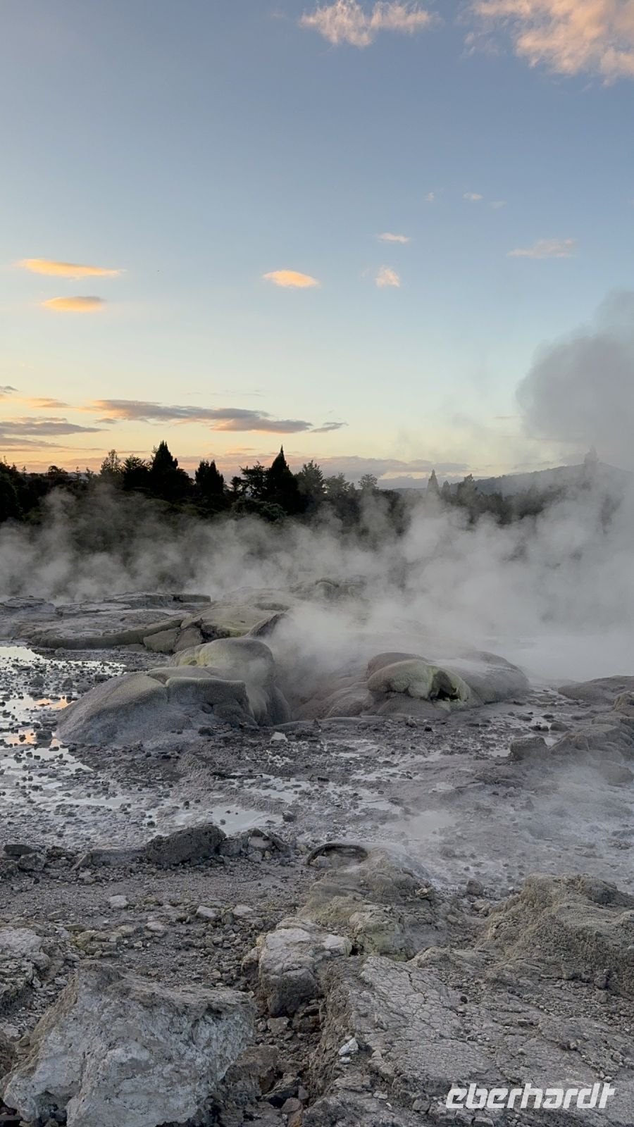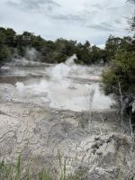 Wir verließen langsam die Coromandel-Halbinsel und hielten in Waihi. Bei einem kleinen Spaziergang entdeckten wir die alte Gold- und Silbermine mit einem Erdschacht von 240 Metern Tiefe, der sich sogar bis auf 400 Meter Tiefe erstreckt. Anschließend erlebten wir ein Hobbit-Gefühl in Matamata, wo wir das Hobbiton Tourismuszentrum besuchten. Unsere Reise führte uns weiter nach Tairua, wo wir eine gigantische Hundestatue, Schafe und Ziegen entdeckten und unsere Mittagspause einlegten. Auf dem Weg nach Rotorua kamen wir an einem vulkanischen Gebiet vorbei und man konnte einige vulkanische Steine an den Hütten erkennen. Am Kratersee in Rotorua sahen wir die alte Caldera. Unser nächster Halt war das Thermal Wonderland Wai-O-Tapi, wo wir auf Wanderwegen die verschiedenen Krater erkundeten. Die Farben spielten in diesem aktiven vulkanischen Gebiet eine wichtige Rolle. Besonders beeindruckend war das schwefelige Aroma und der Rauch beim Champagner Pool, was ein schönes Bild in der Natur ergab. Die Route endete neben einem riesigen hellgelben Pool. Bevor wir die Anlage verließen, machten wir einen Zwischenstopp beim Mud Pool, um die Aktivität zu beobachten. In Rotorua fuhren wir direkt zum Hotel und hatten genügend Zeit, um uns zu erfrischen, bevor wir zu unserem Abendessen gingen. In Te Puia genossen wir unser leckeres Abendessen sowie eine typische Maori-Show. Zuerst nahmen wir an einem Ritual teil, bei dem man zwischen Frieden oder Krieg wählen musste. Anschließend betraten wir eine große Halle und erlebten eine wunderschöne Show mit verschiedenen Instrumenten. Zum Abschluss besuchten wir die Geysire und genossen den Moment mit einer heißen Schokolade.